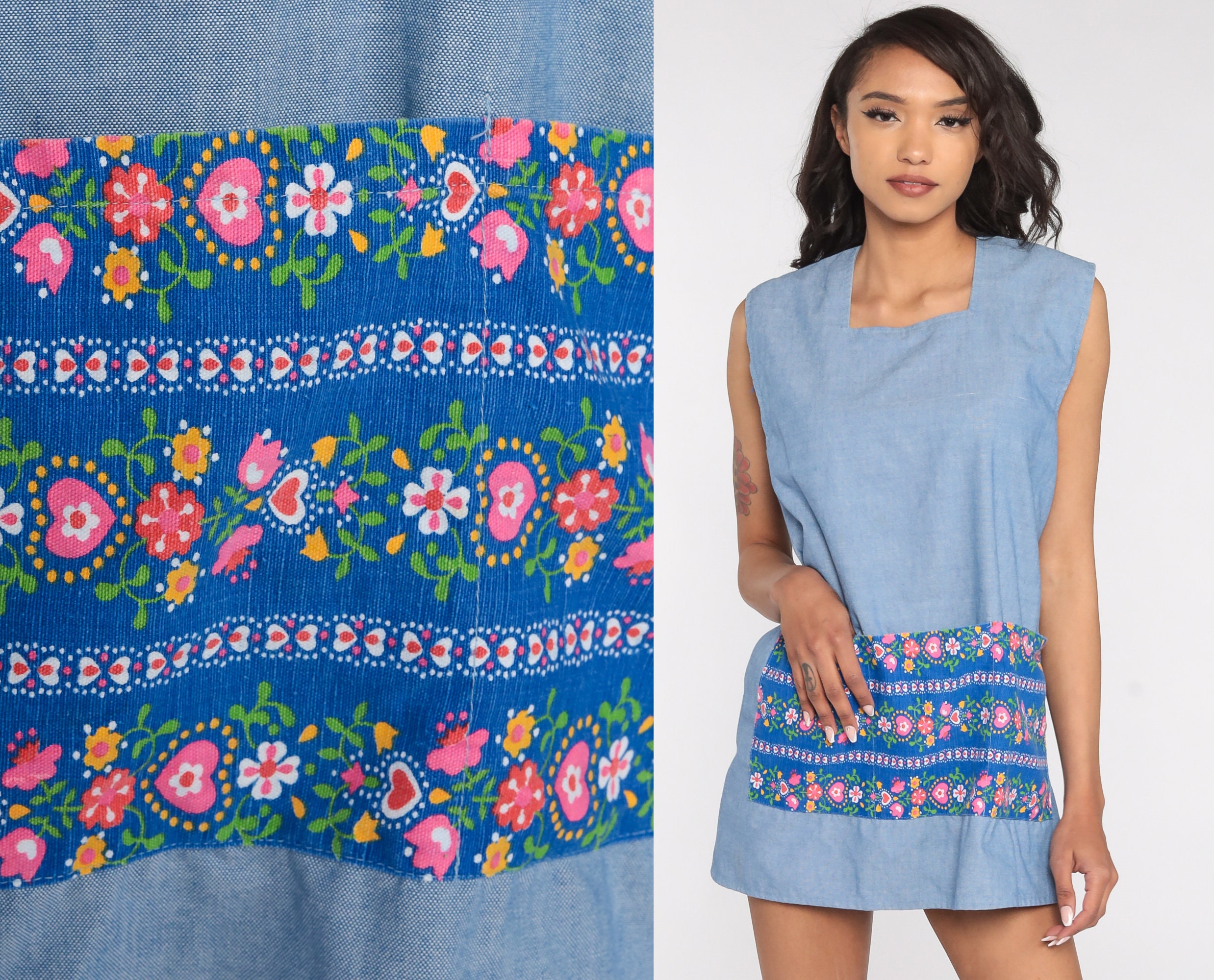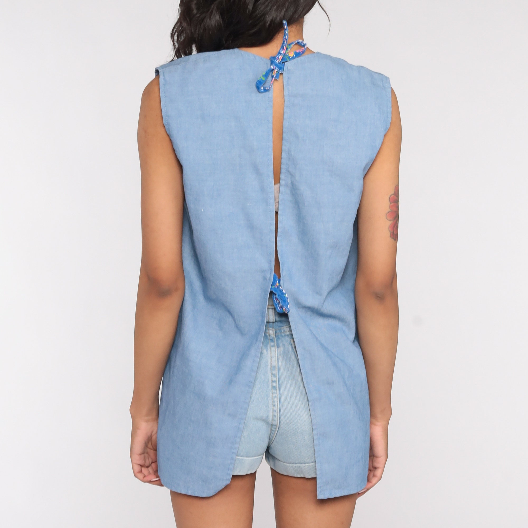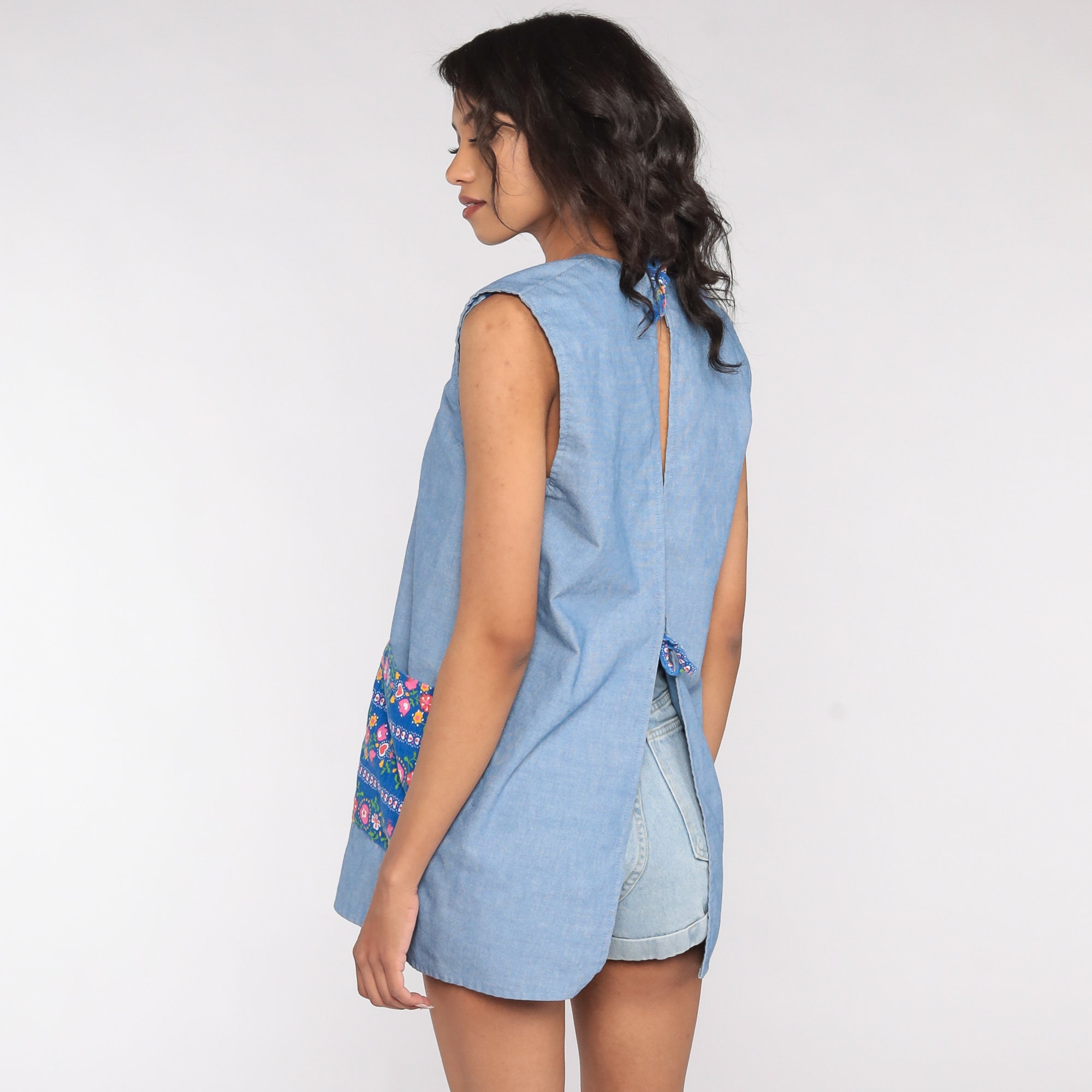 Vintage 70s blouse in blue with a floral print. Open with ties in the back.
