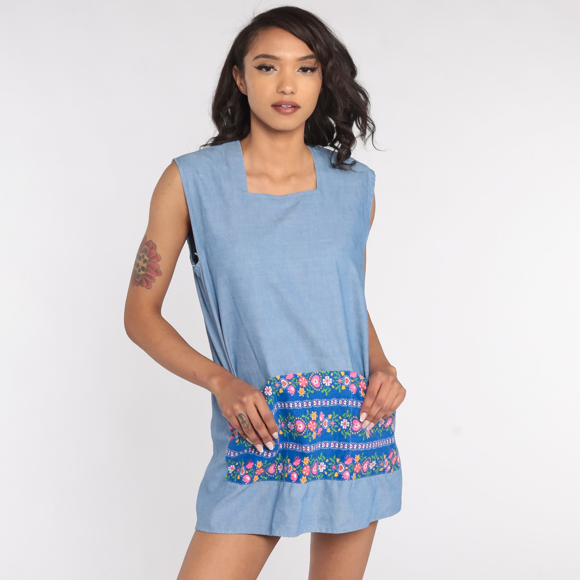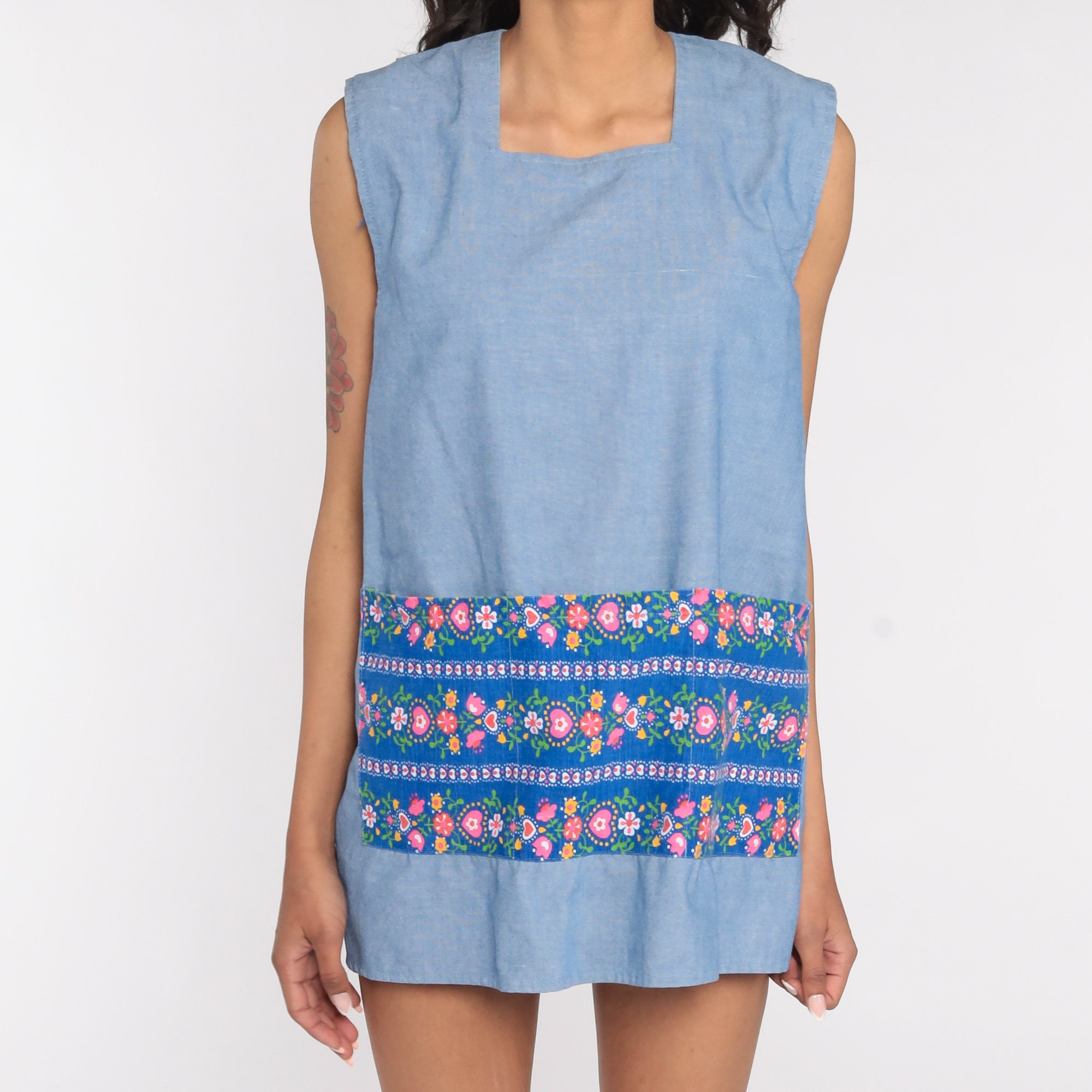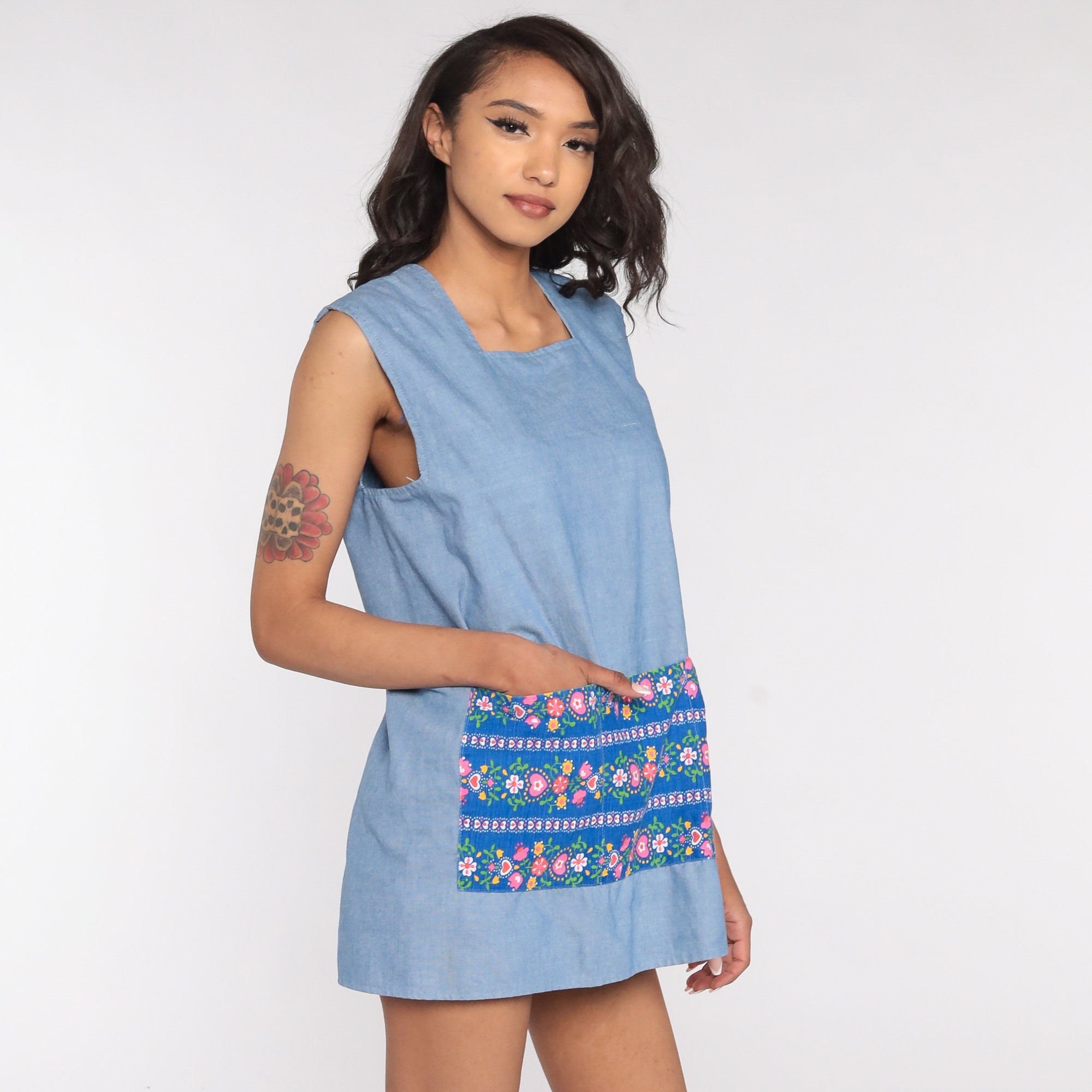 Vintage 70s blouse in blue with a floral print. Open with ties in the back.