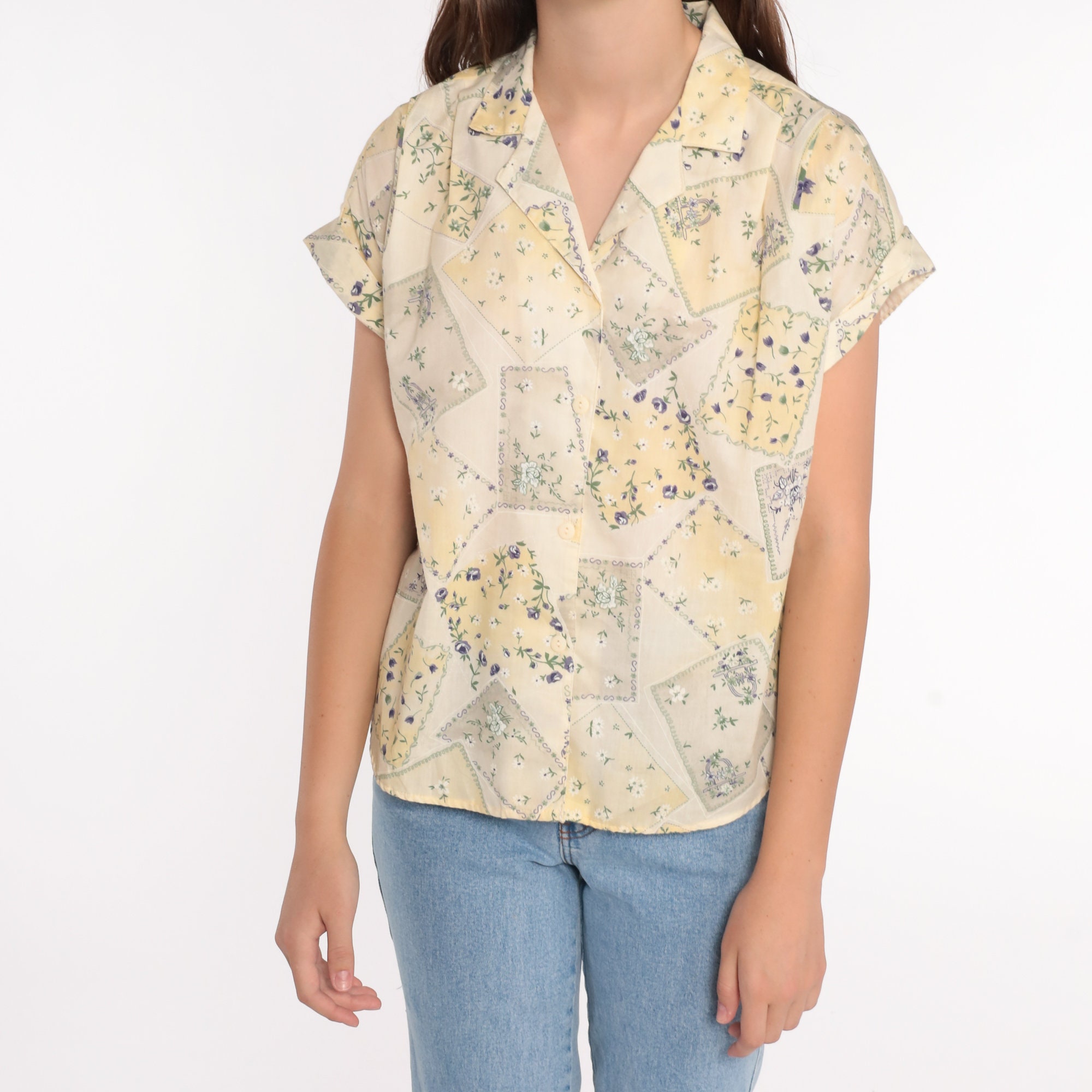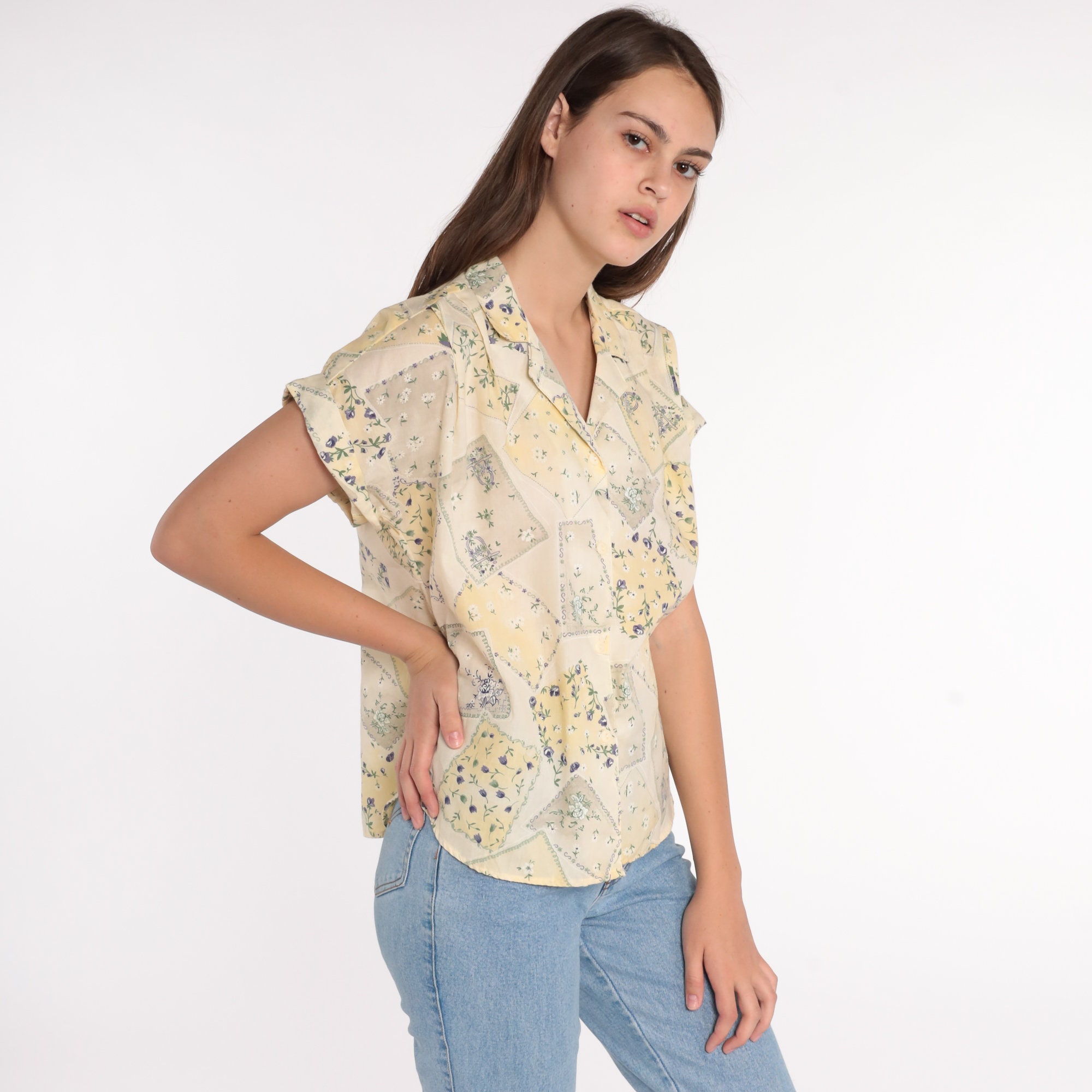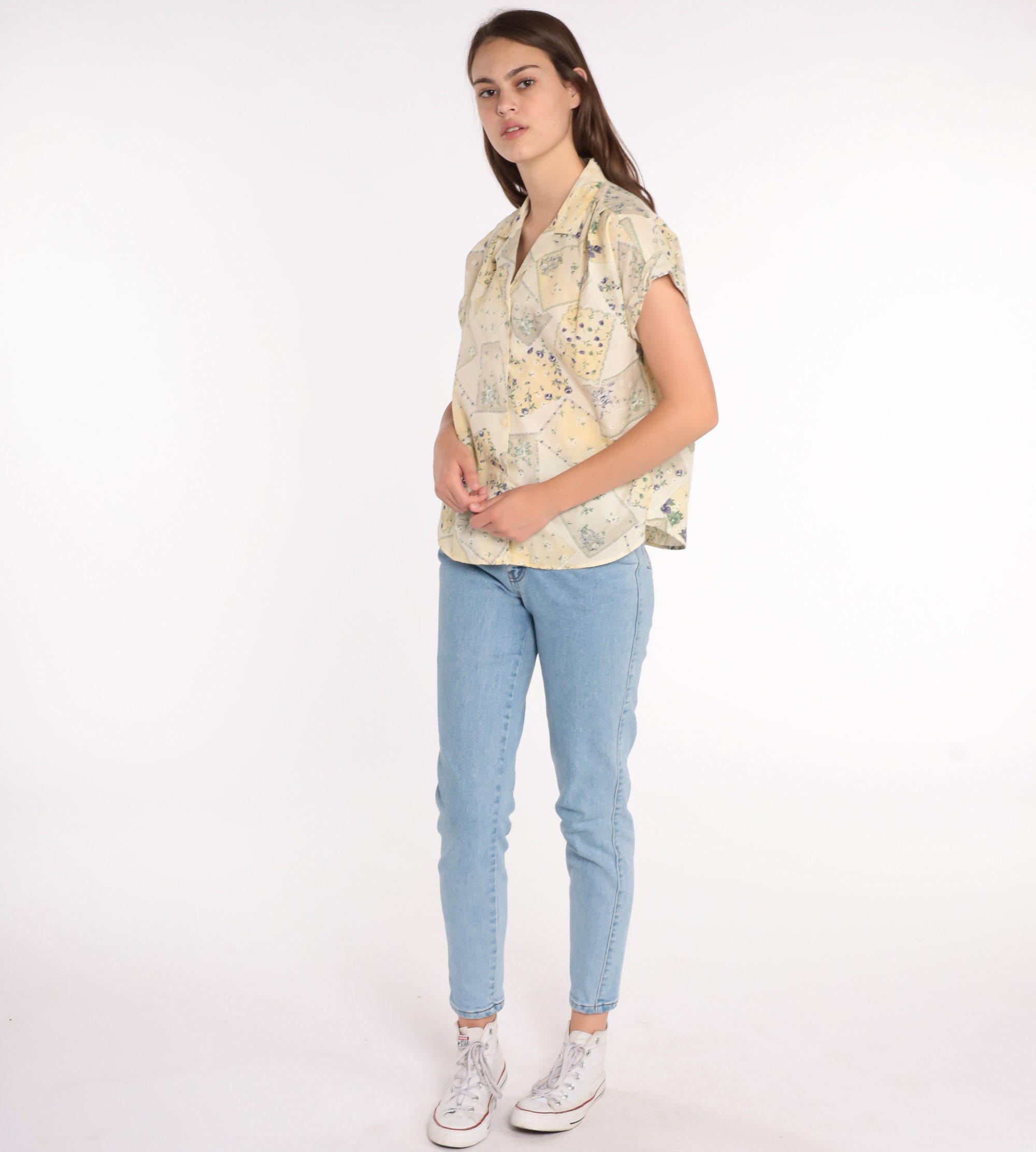 Vintage 80s shirt in a floral print. It has cap sleeves and buttons up the front.