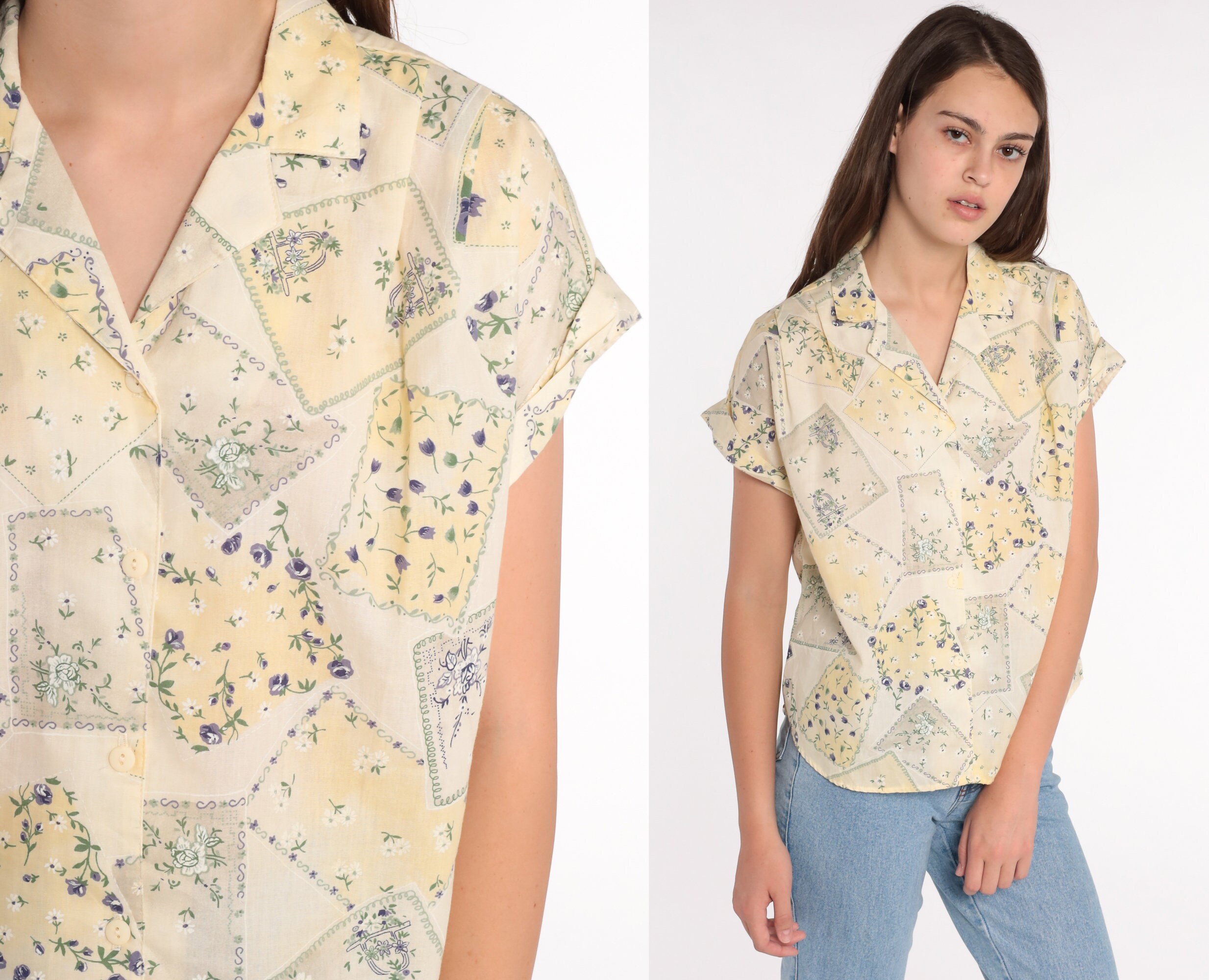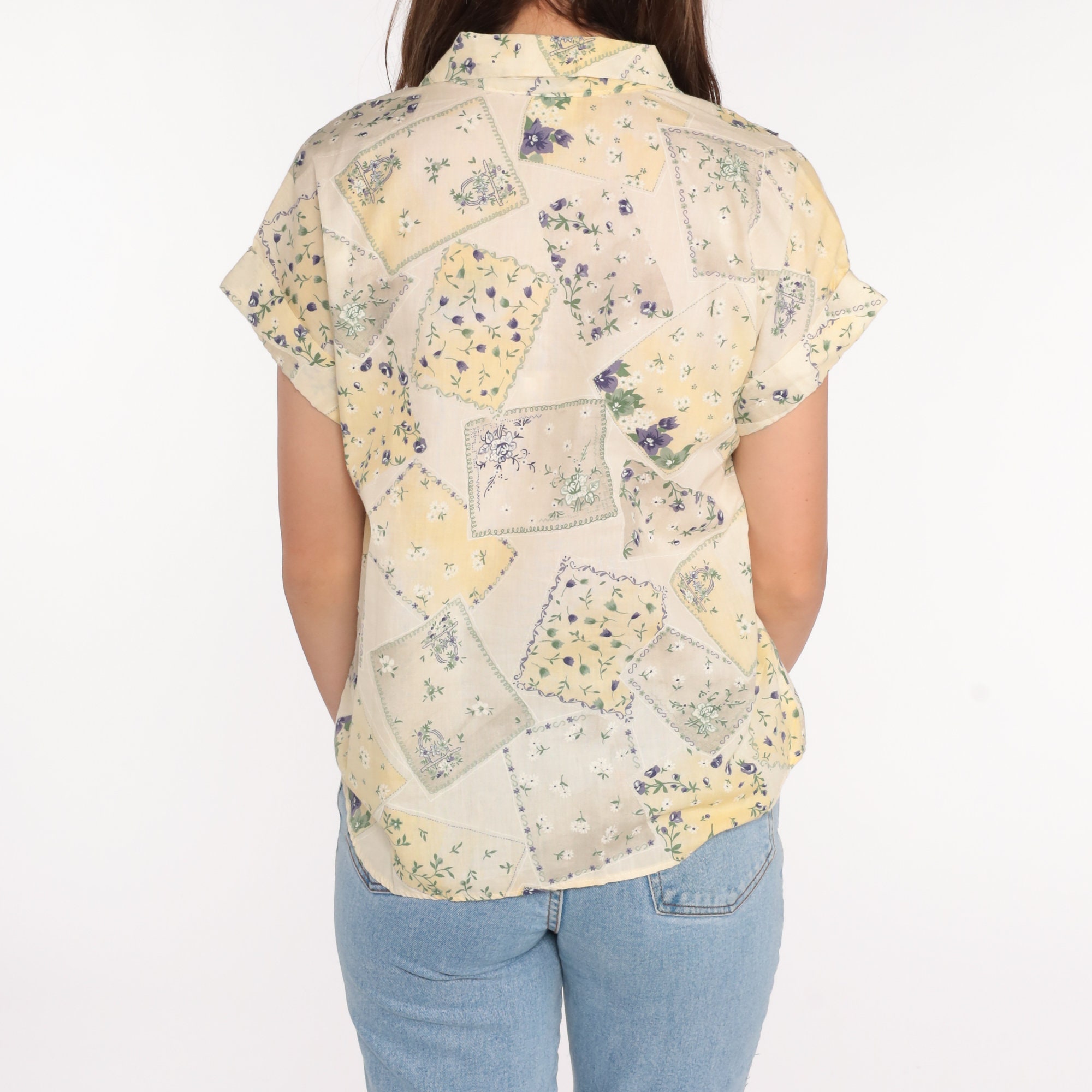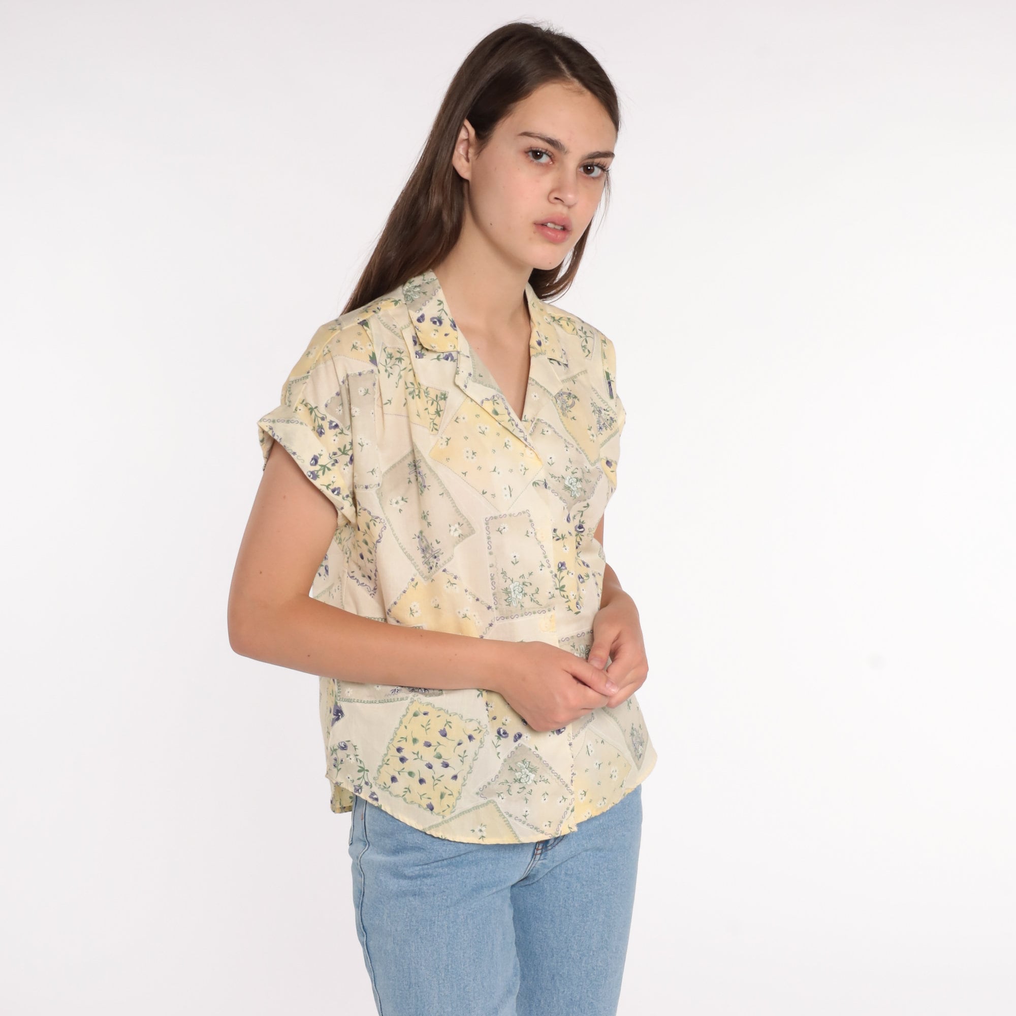 Vintage 80s shirt in a floral print. It has cap sleeves and buttons up the front.