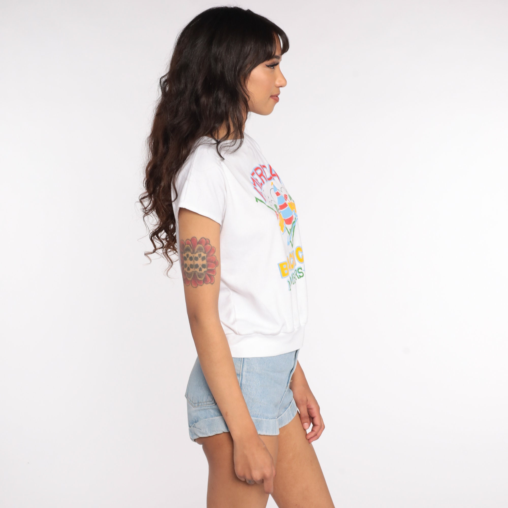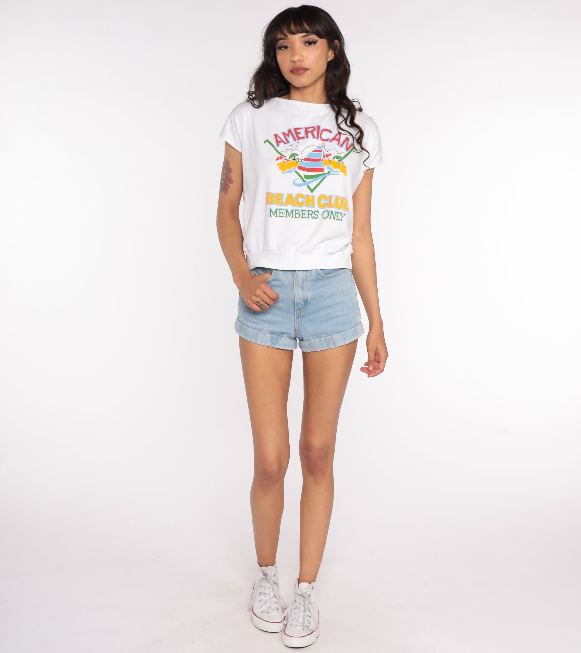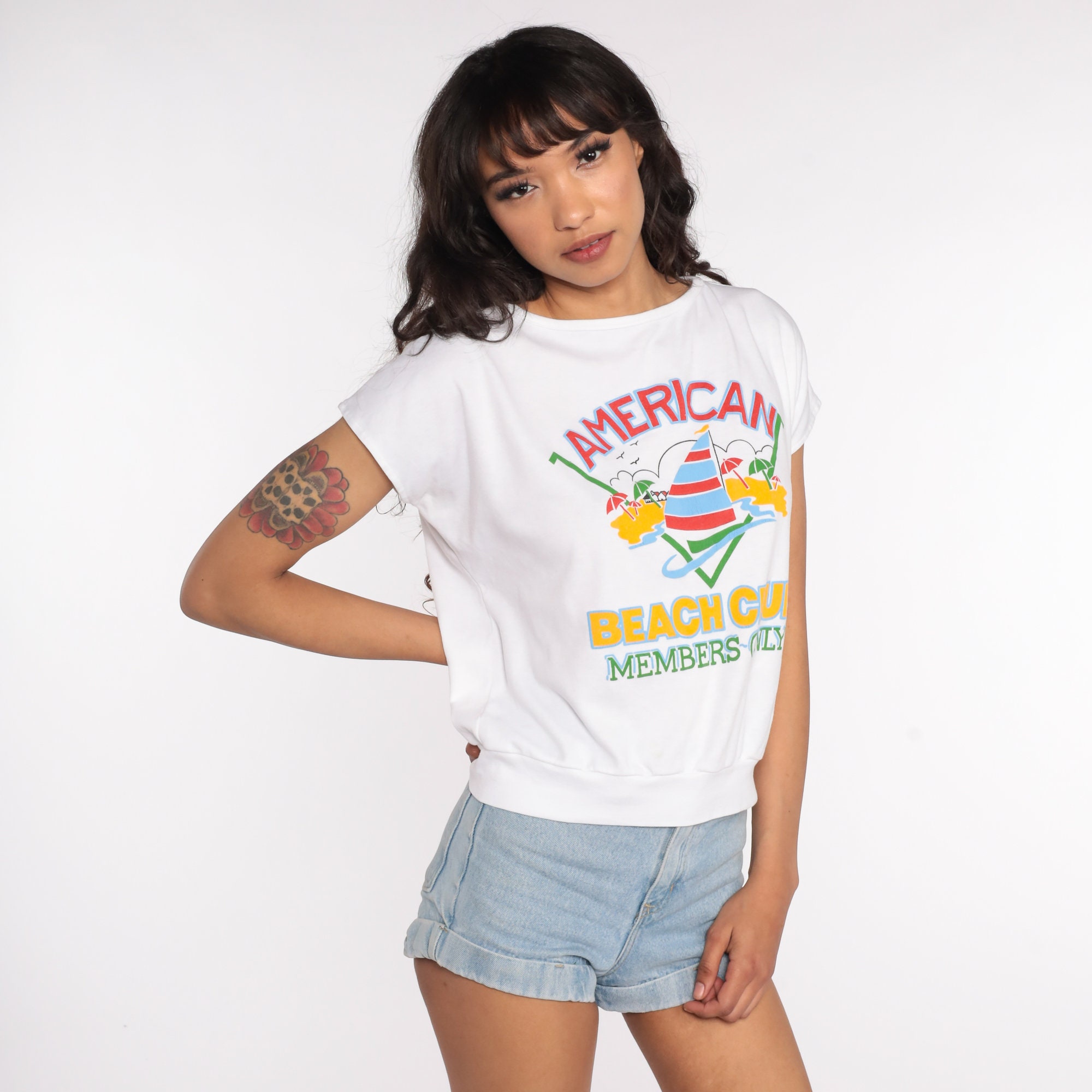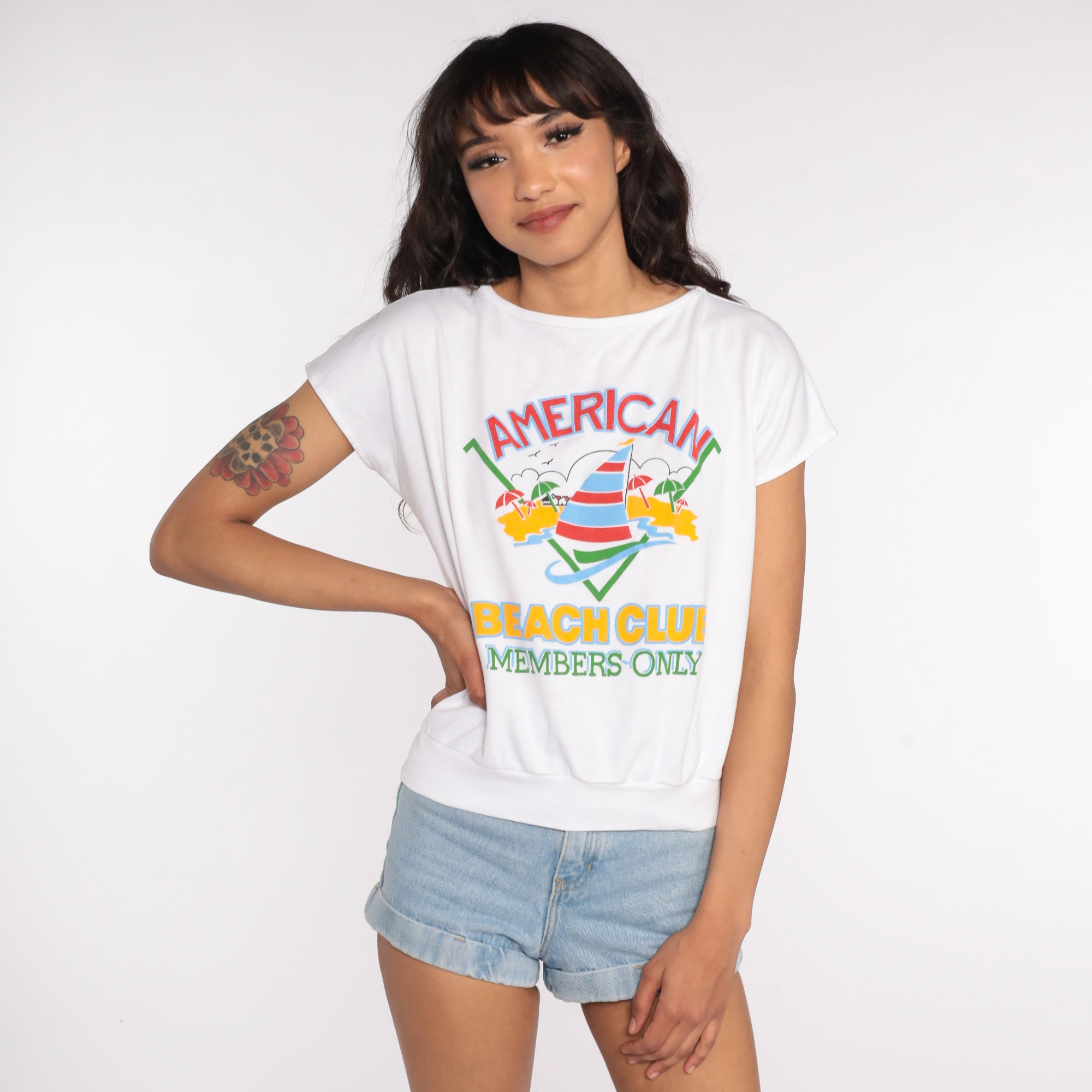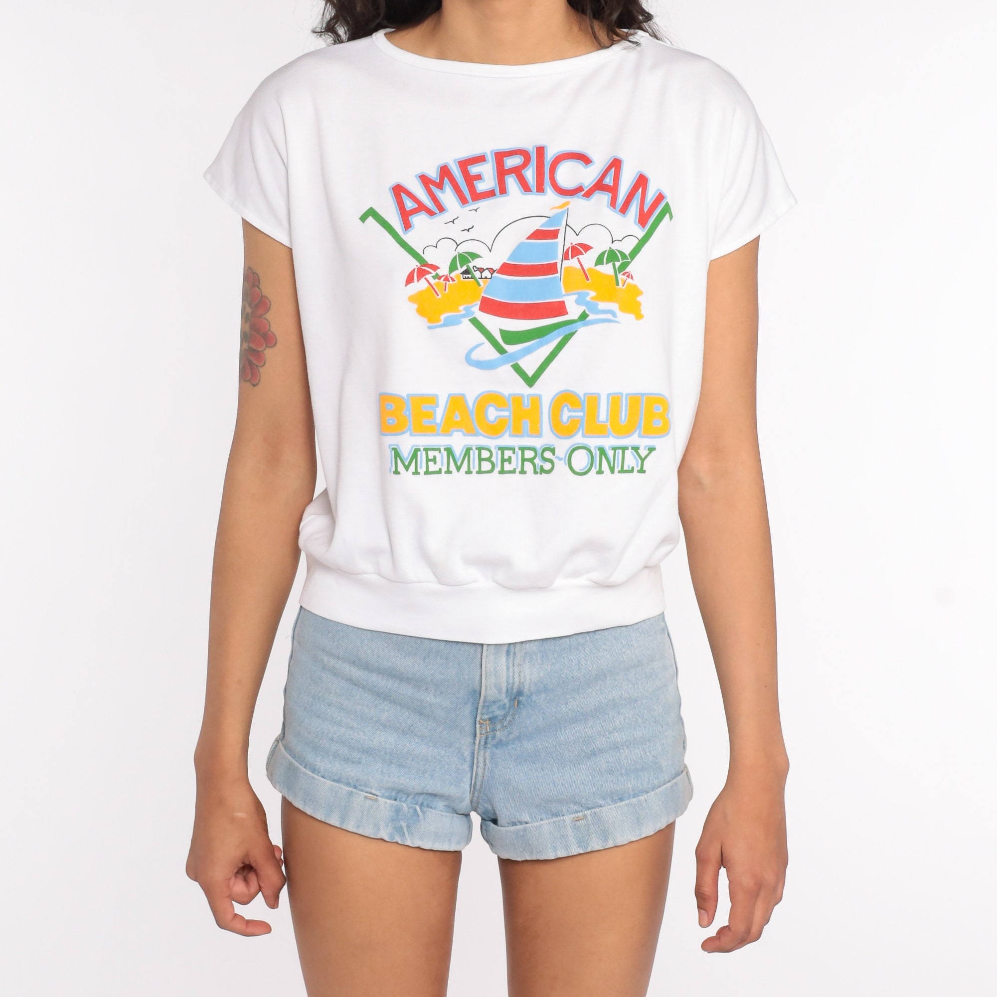 Vintage 80s shirt in white with a sailboat print and 'American Beach Club Members Only' on front. Cap sleeves, loose fit.