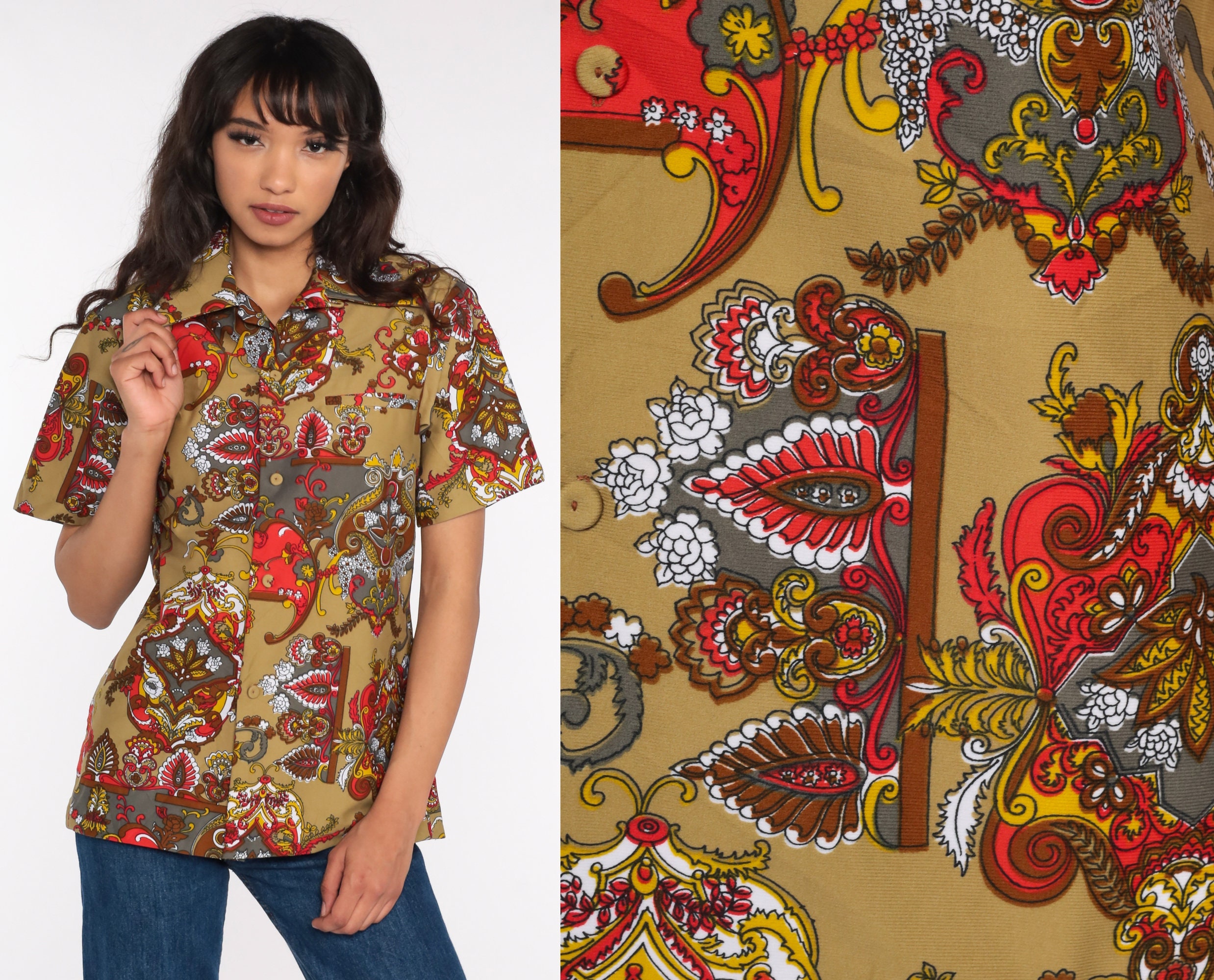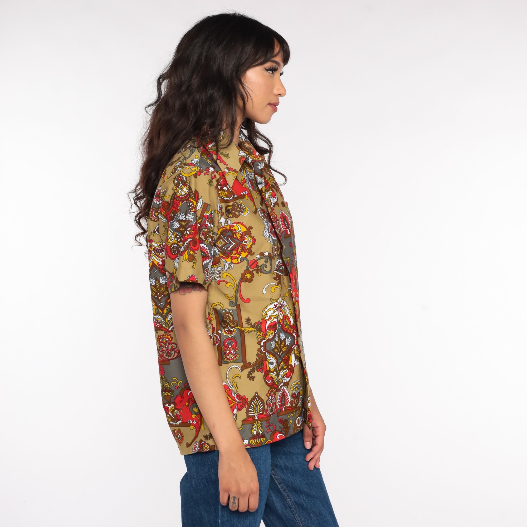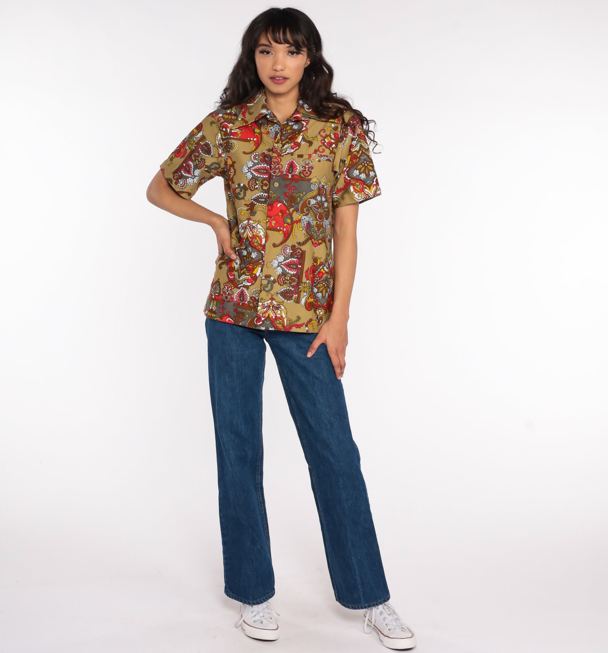 Vintage 70s shirt with a psychedelic acid print. Buttons up the chest with short sleeves.