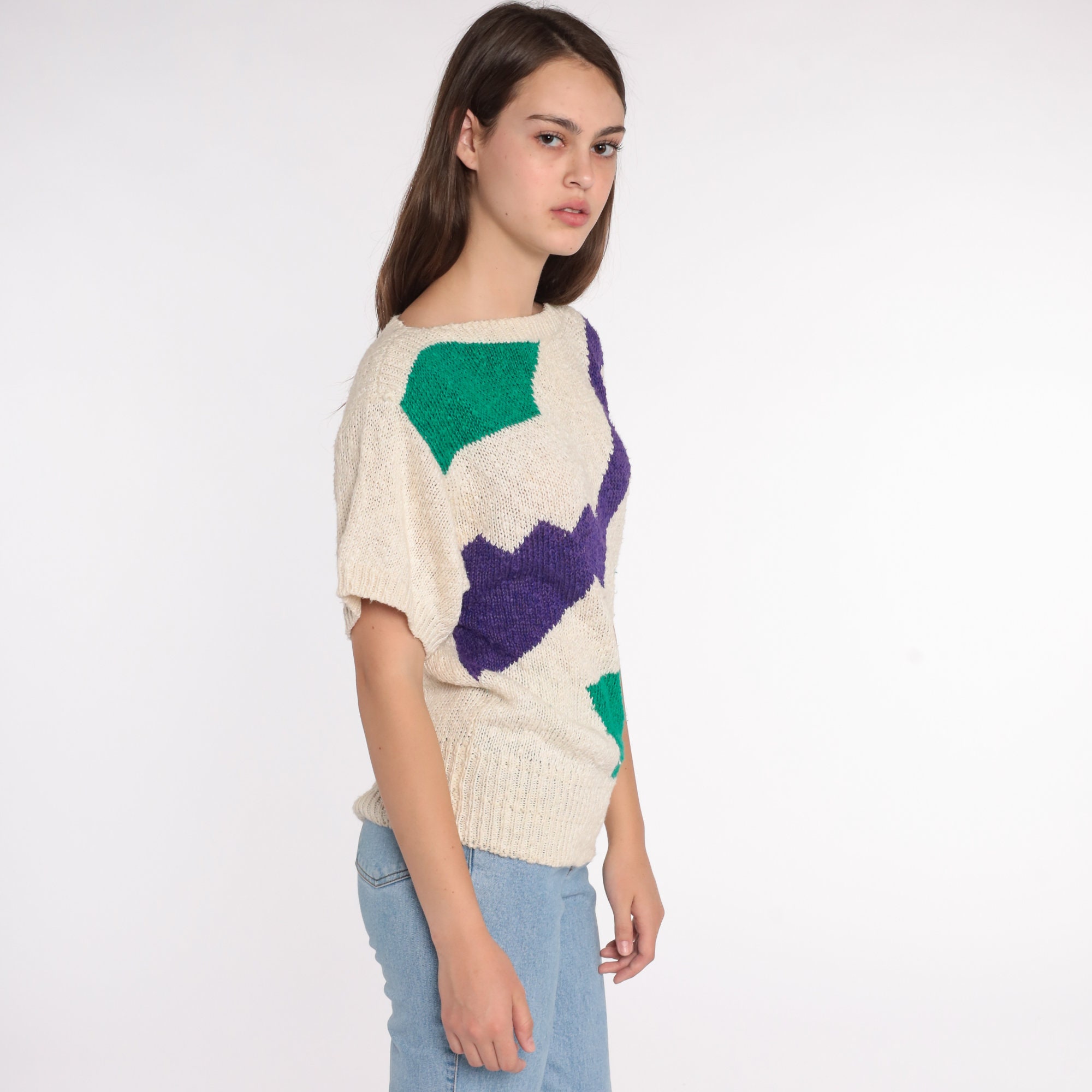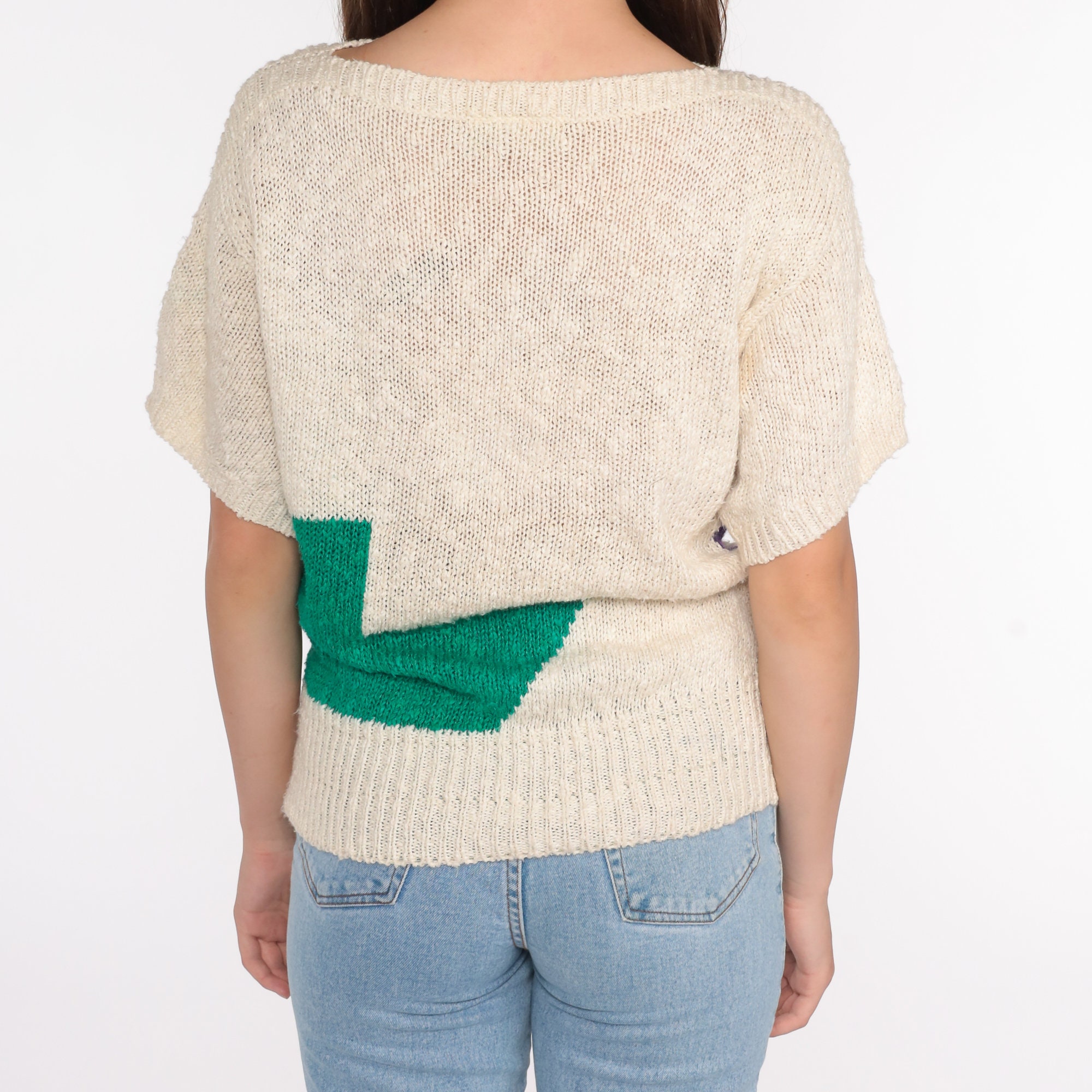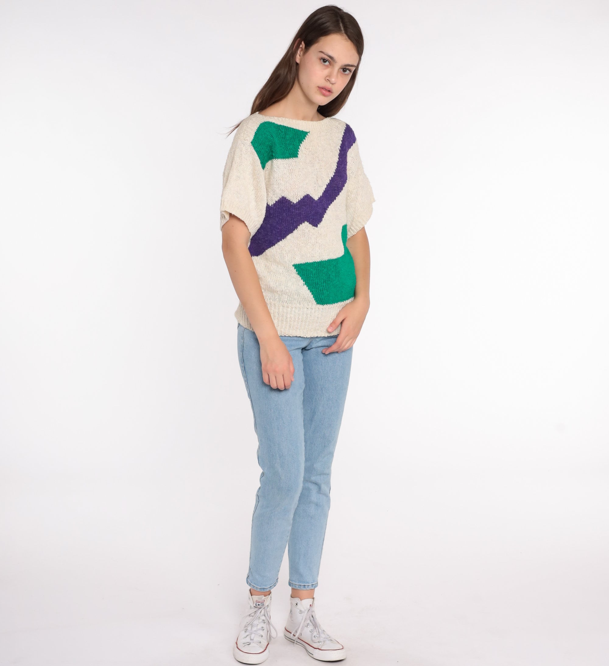 Vintage 80s 90s sweater top in beige with a colour block print and short sleeves.
