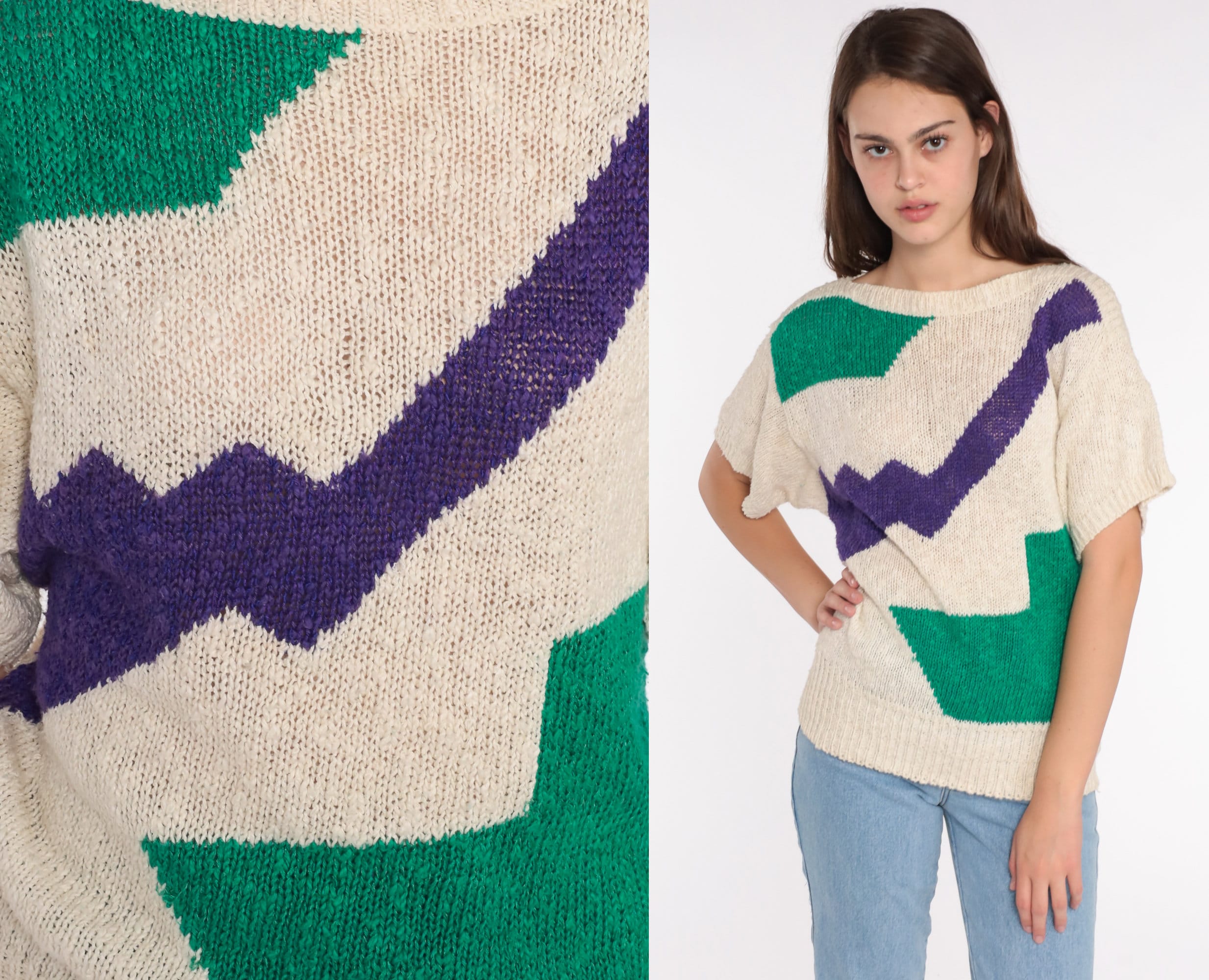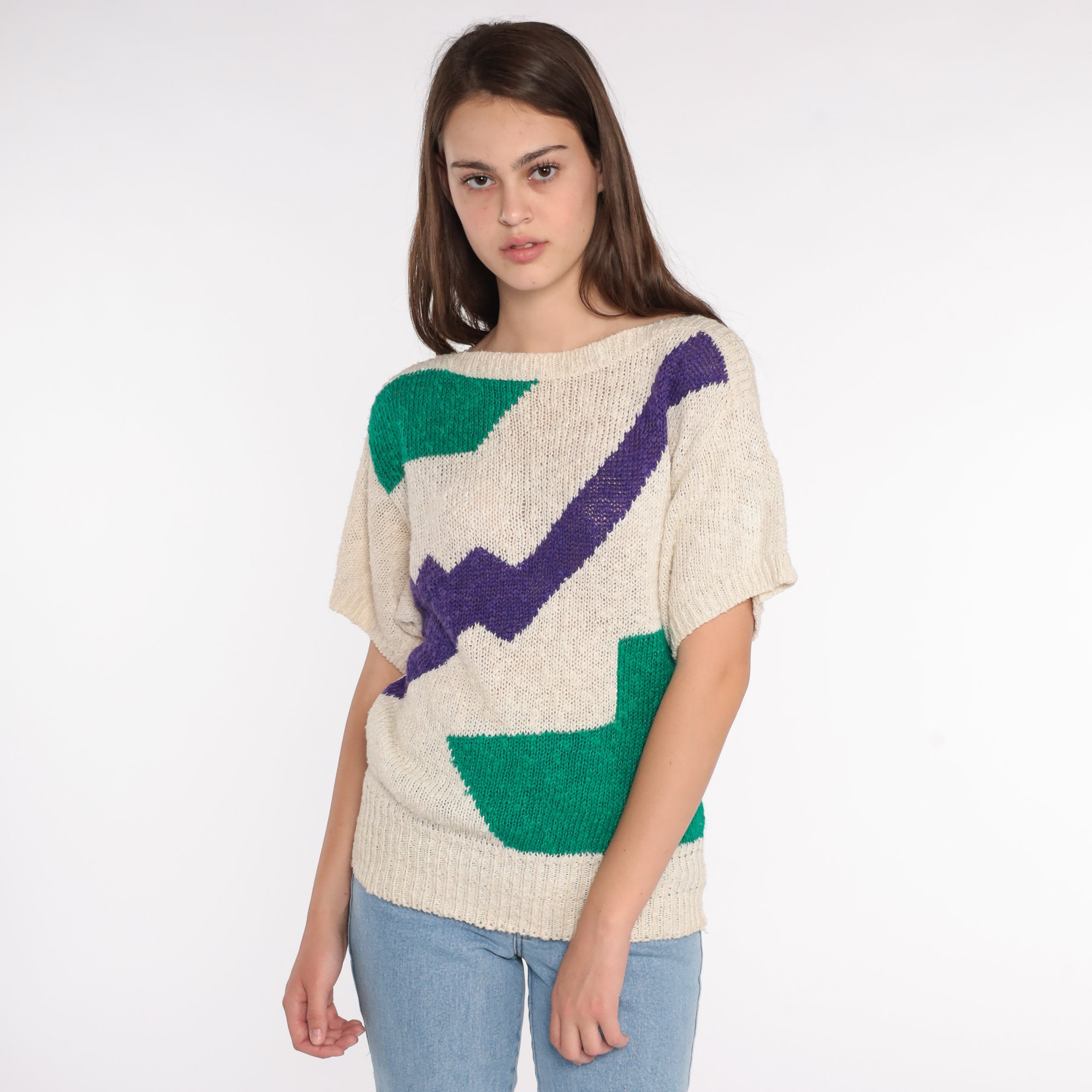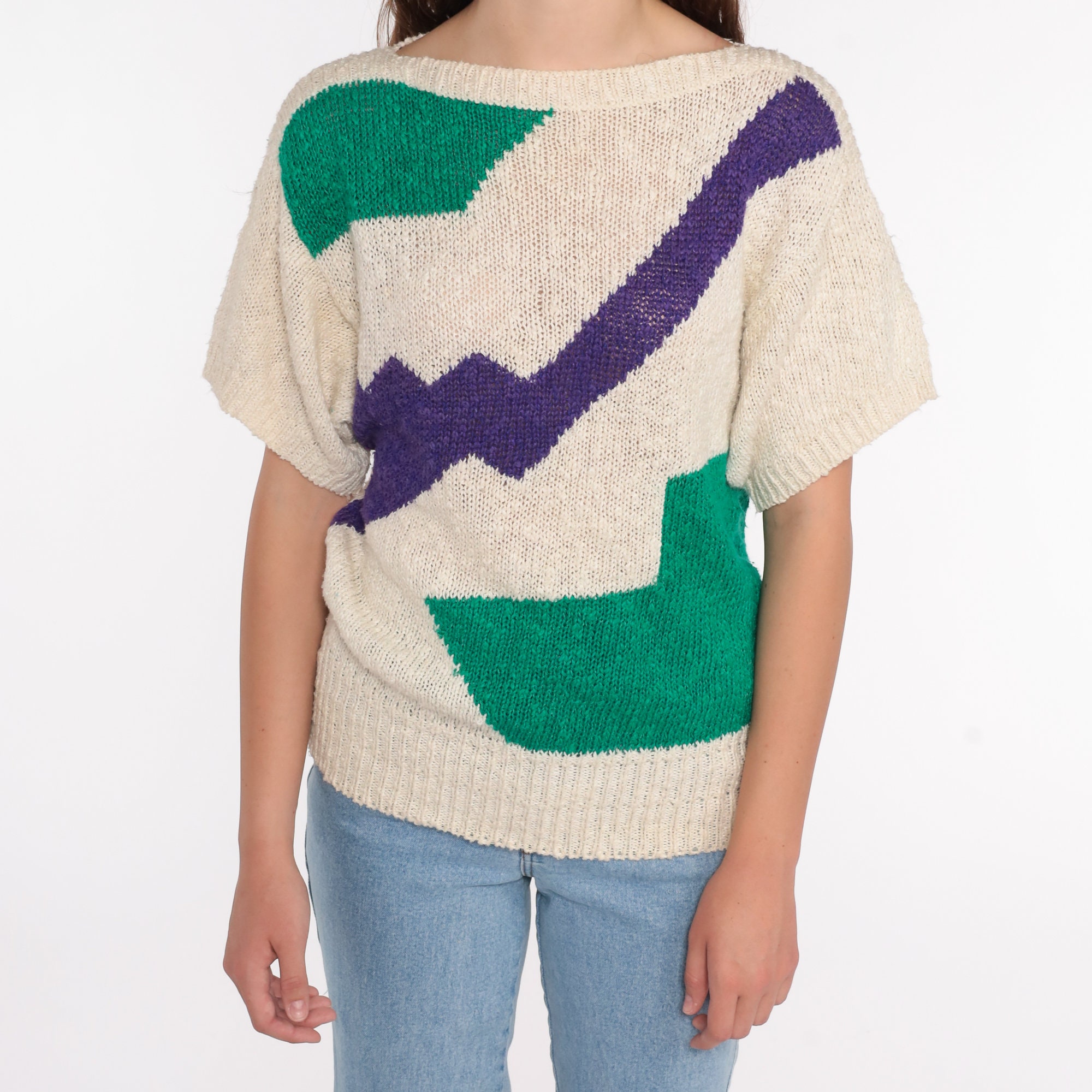 Vintage 80s 90s sweater top in beige with a colour block print and short sleeves.