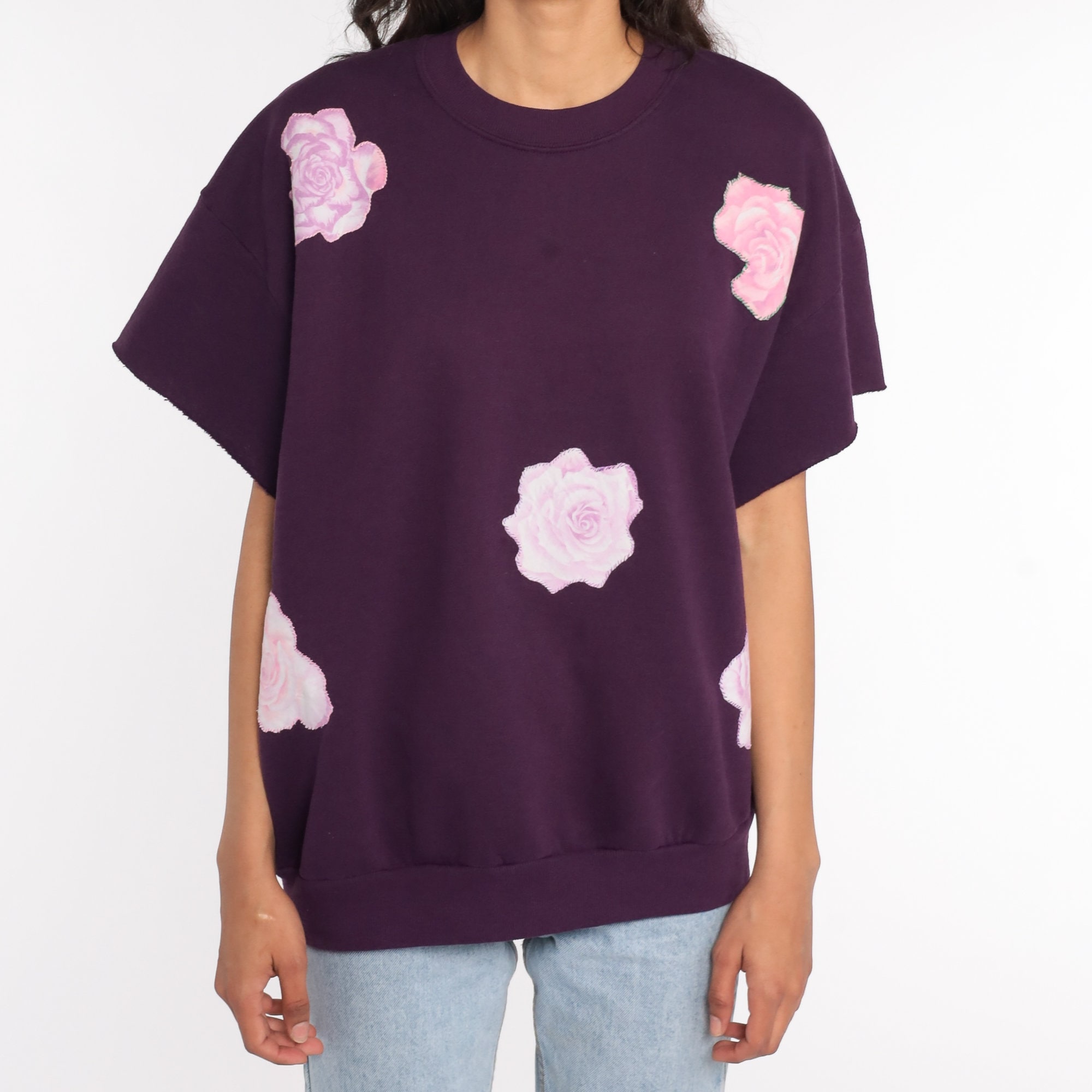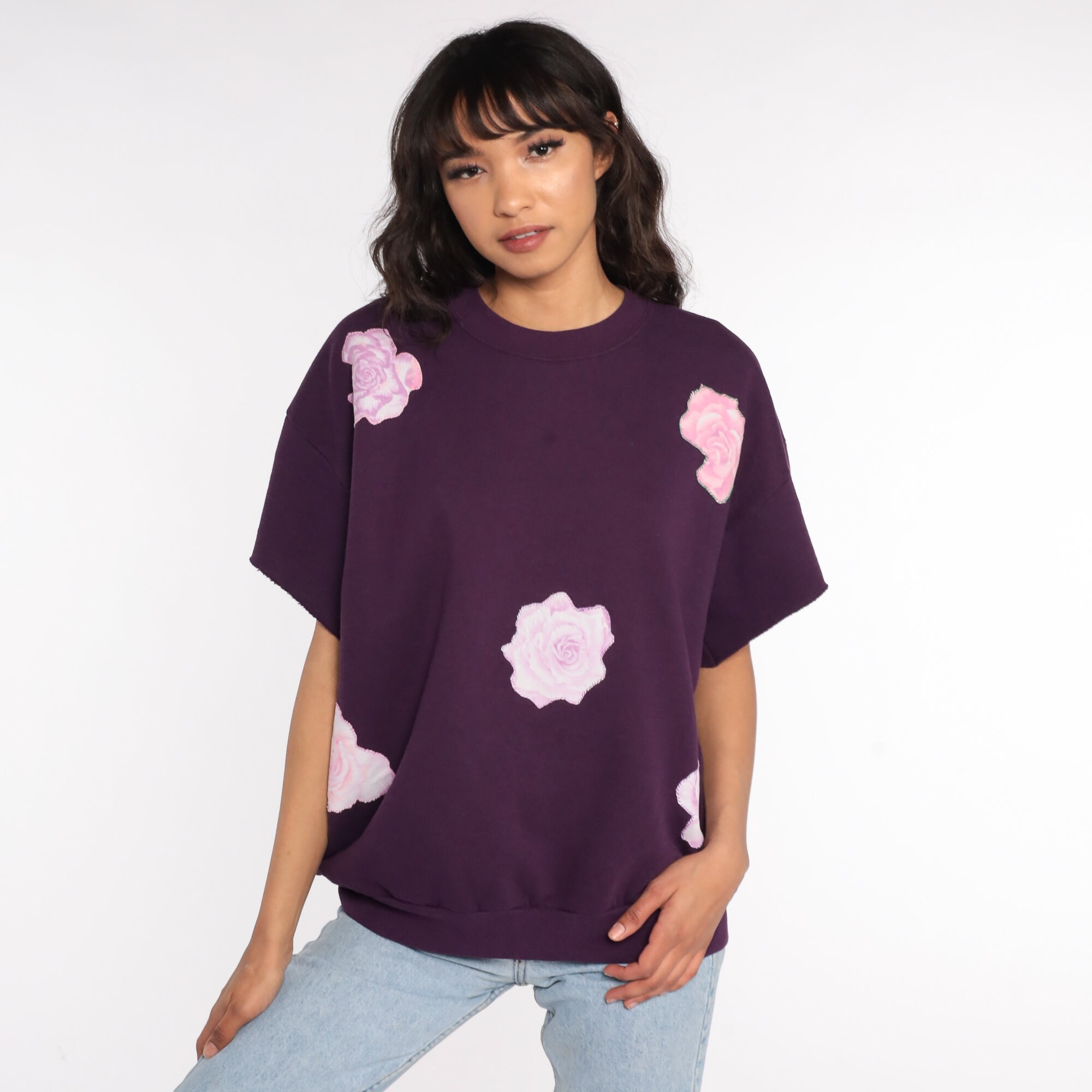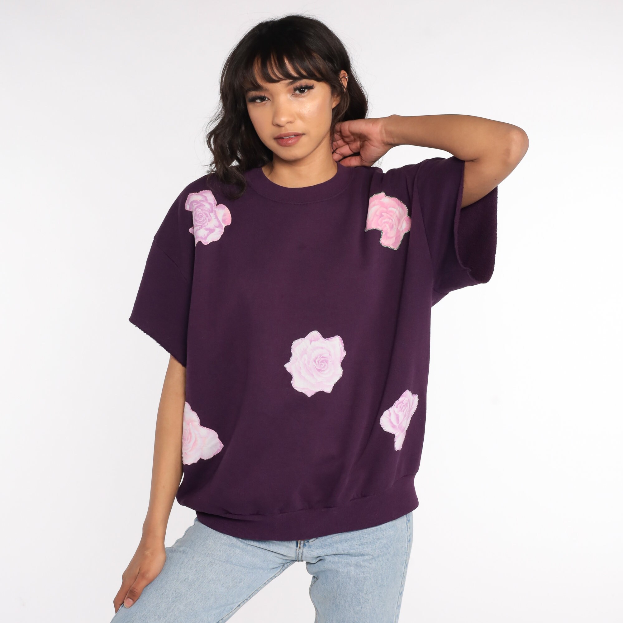 Vintage 80s short sleeve sweatshirt in purple with a floral design. Slouchy fit.