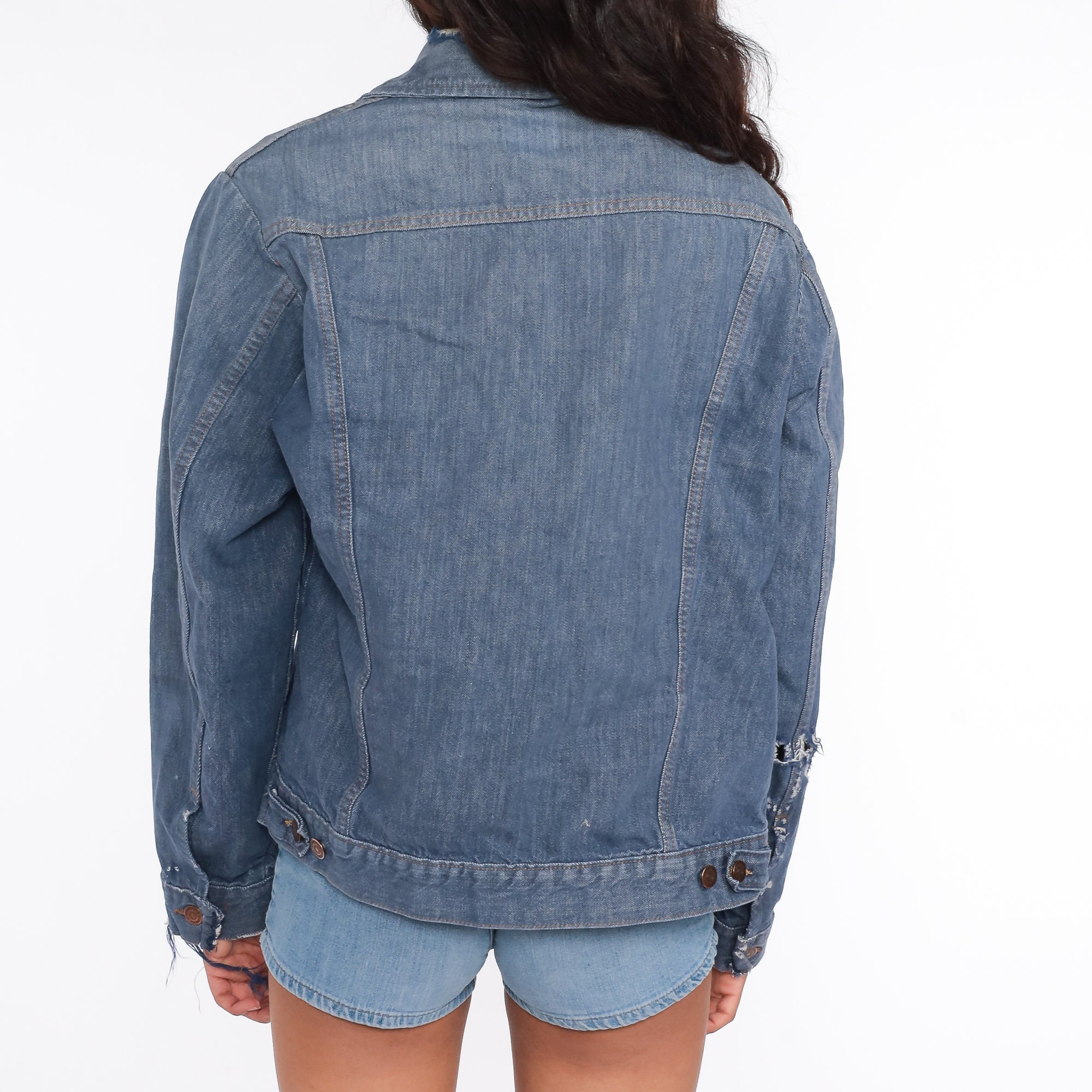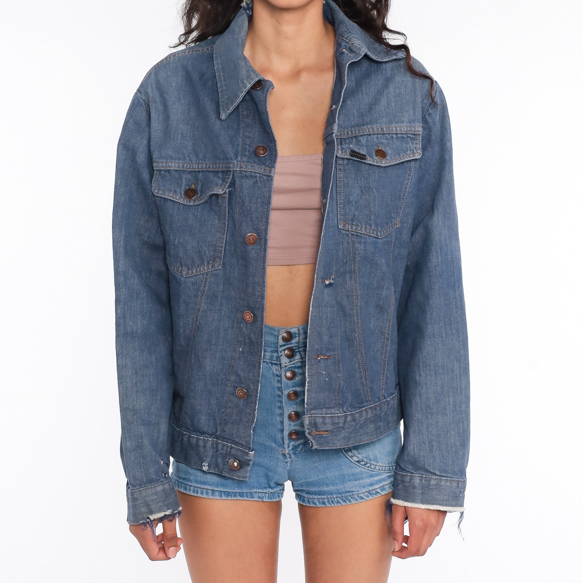 Vintage 70s jean jacket in blue denim. Buttons up with a pointed collar.