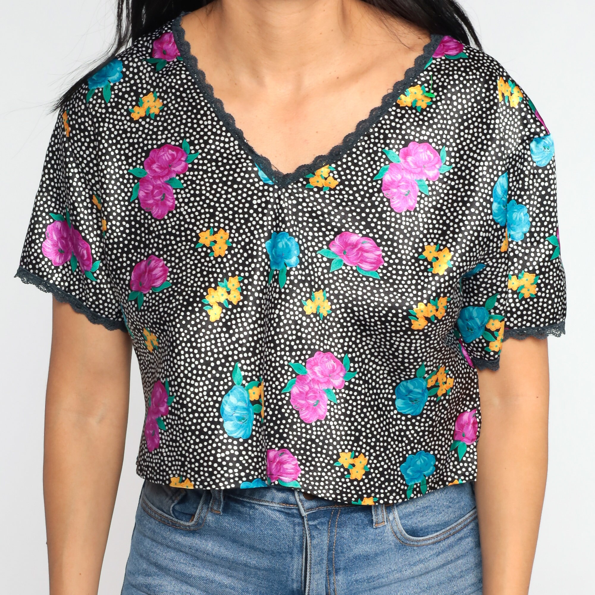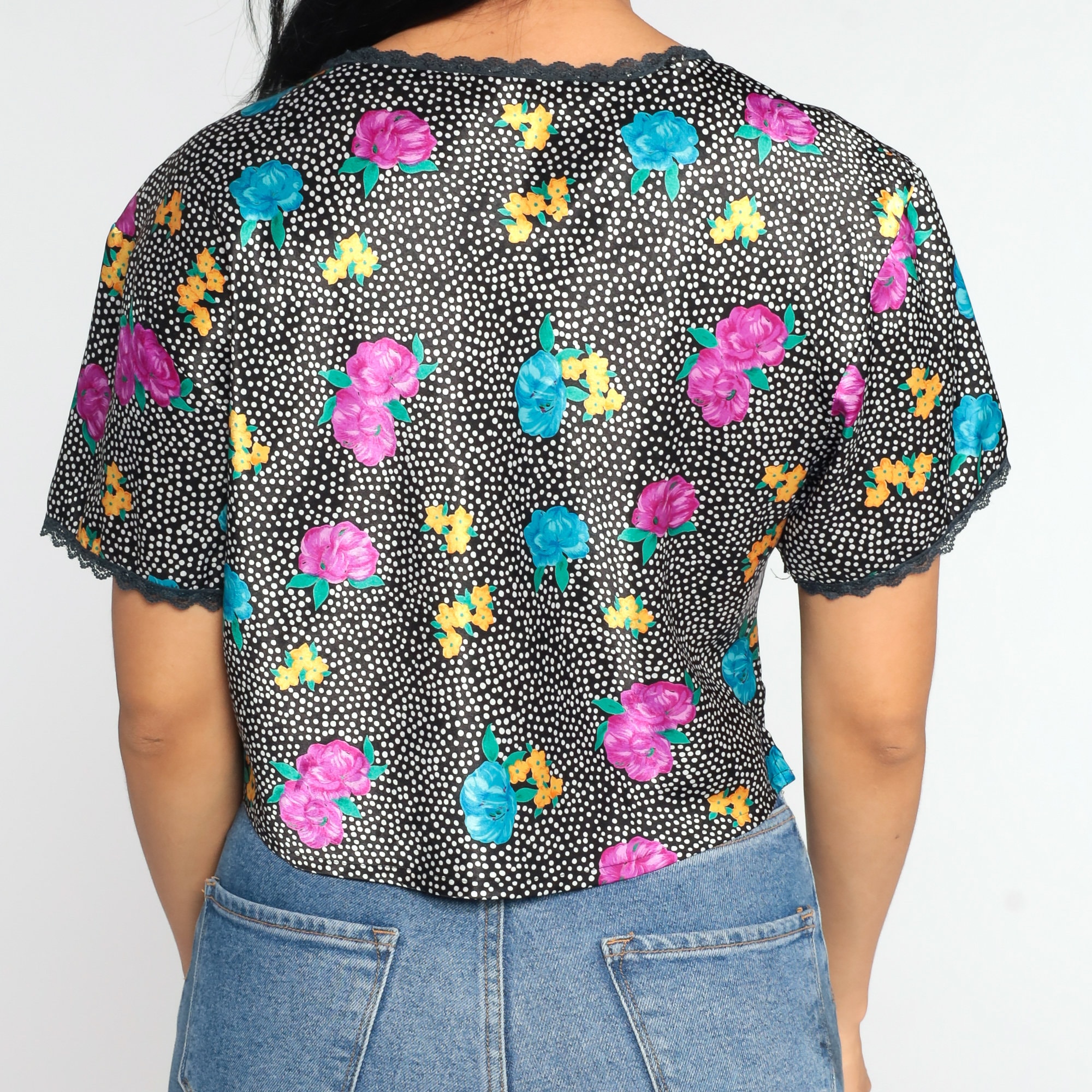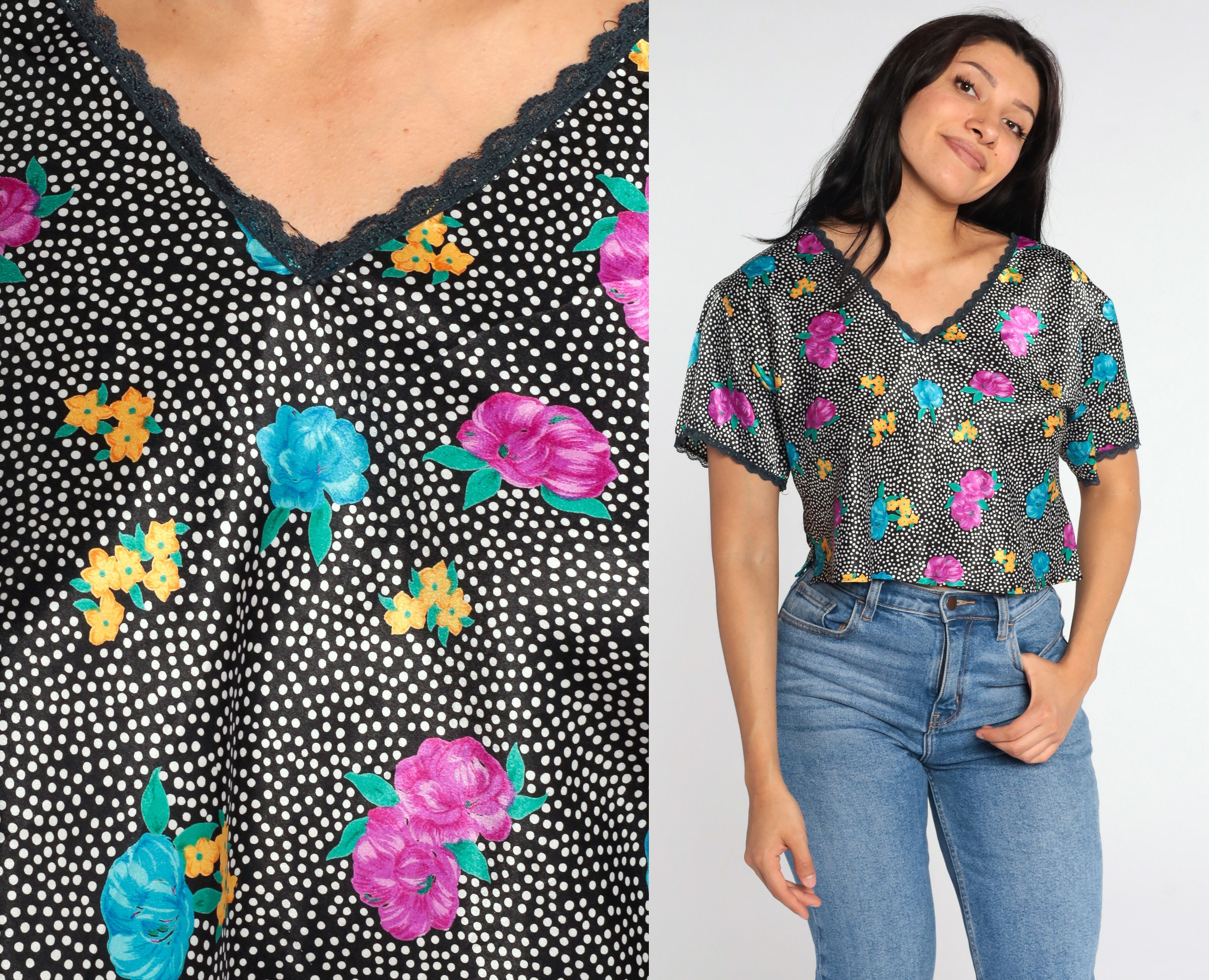 Vintage 90s shirt in black with a floral print, polka dots and lace trim.