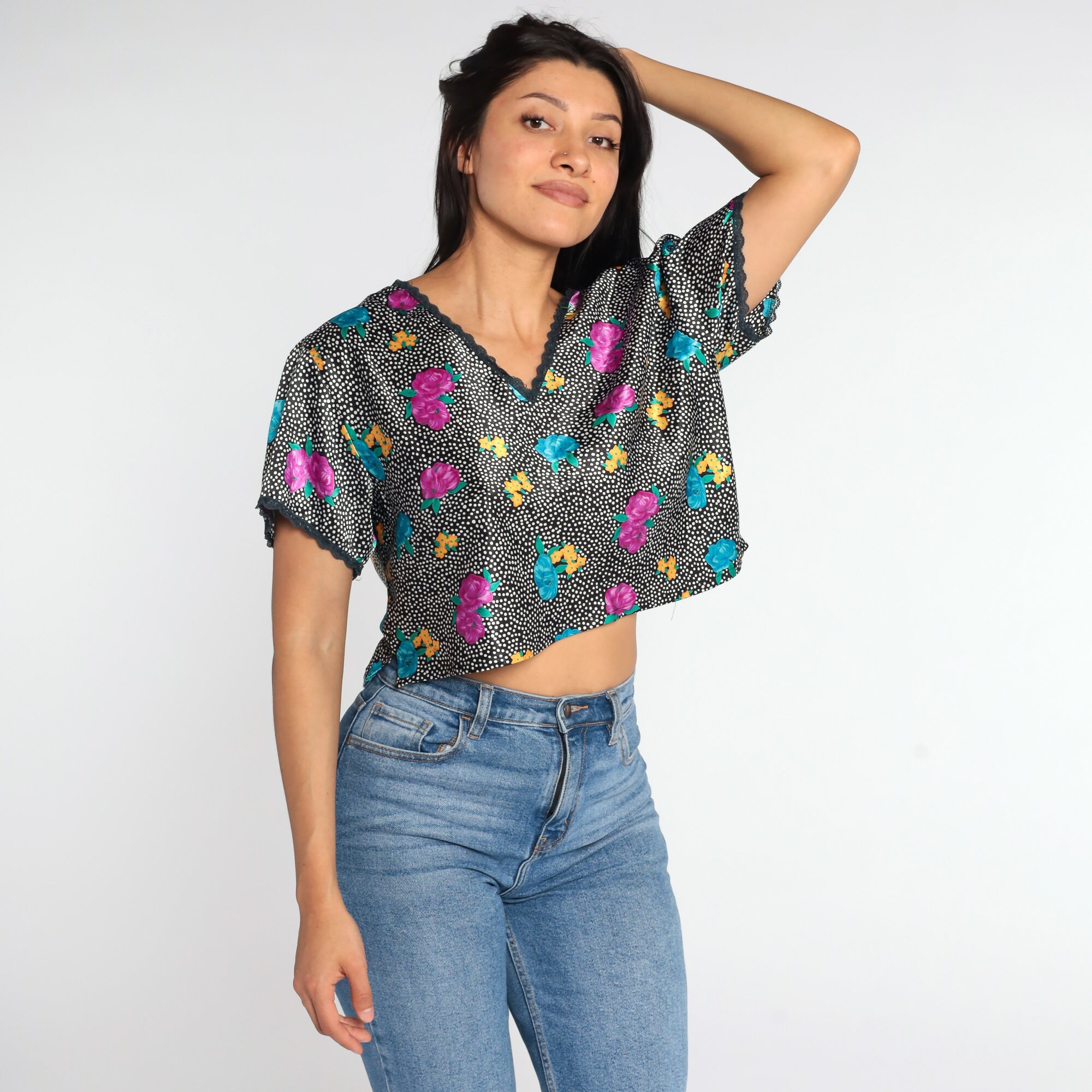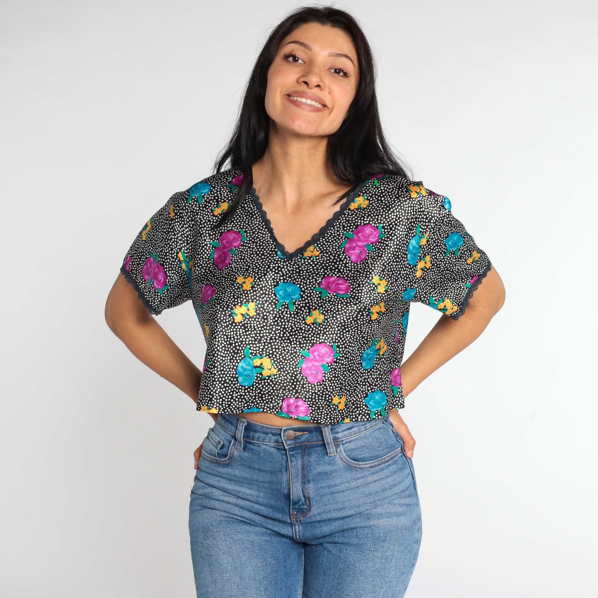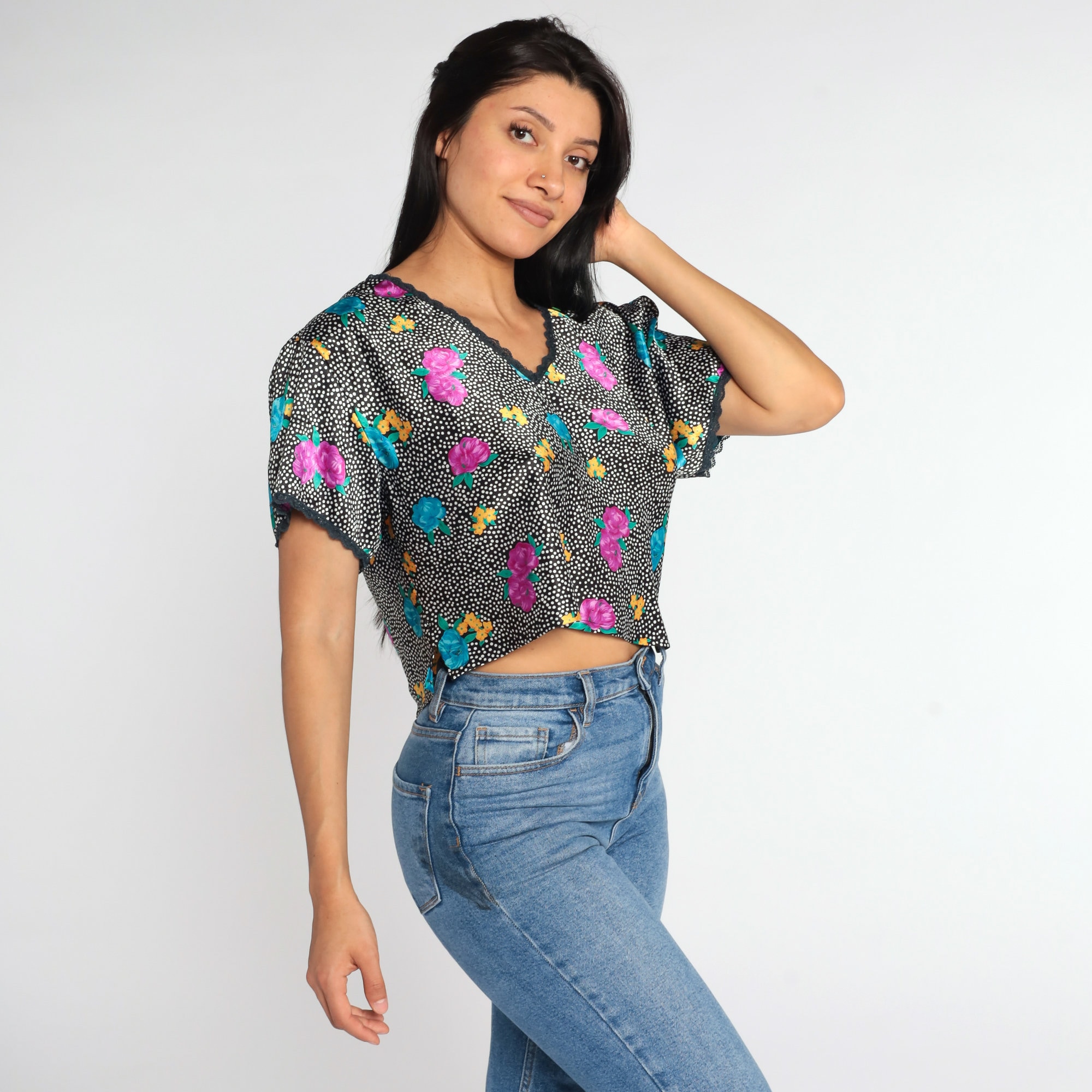 Vintage 90s shirt in black with a floral print, polka dots and lace trim.
