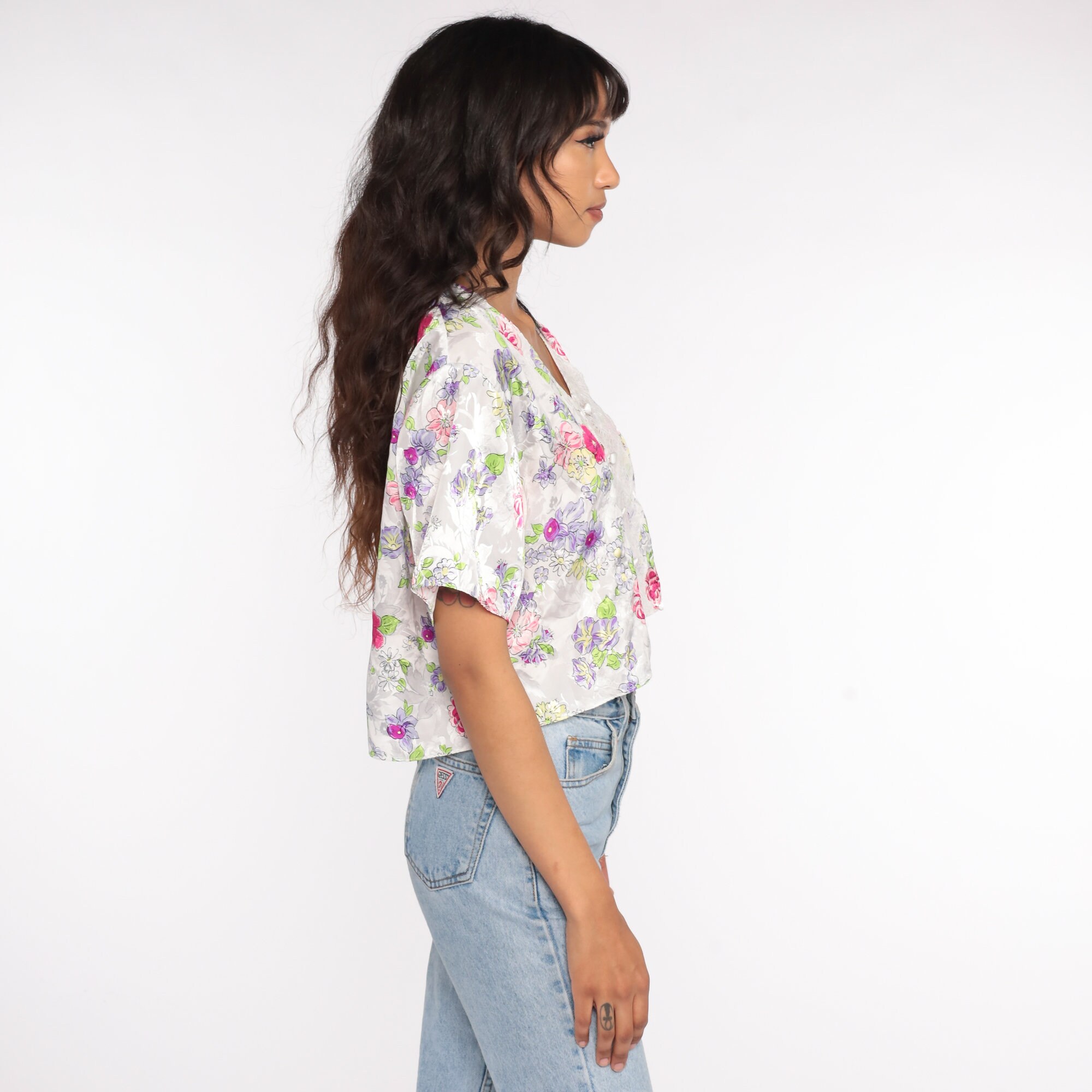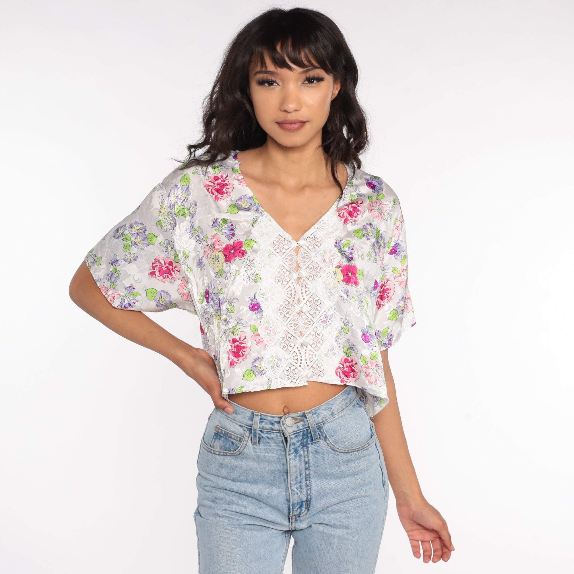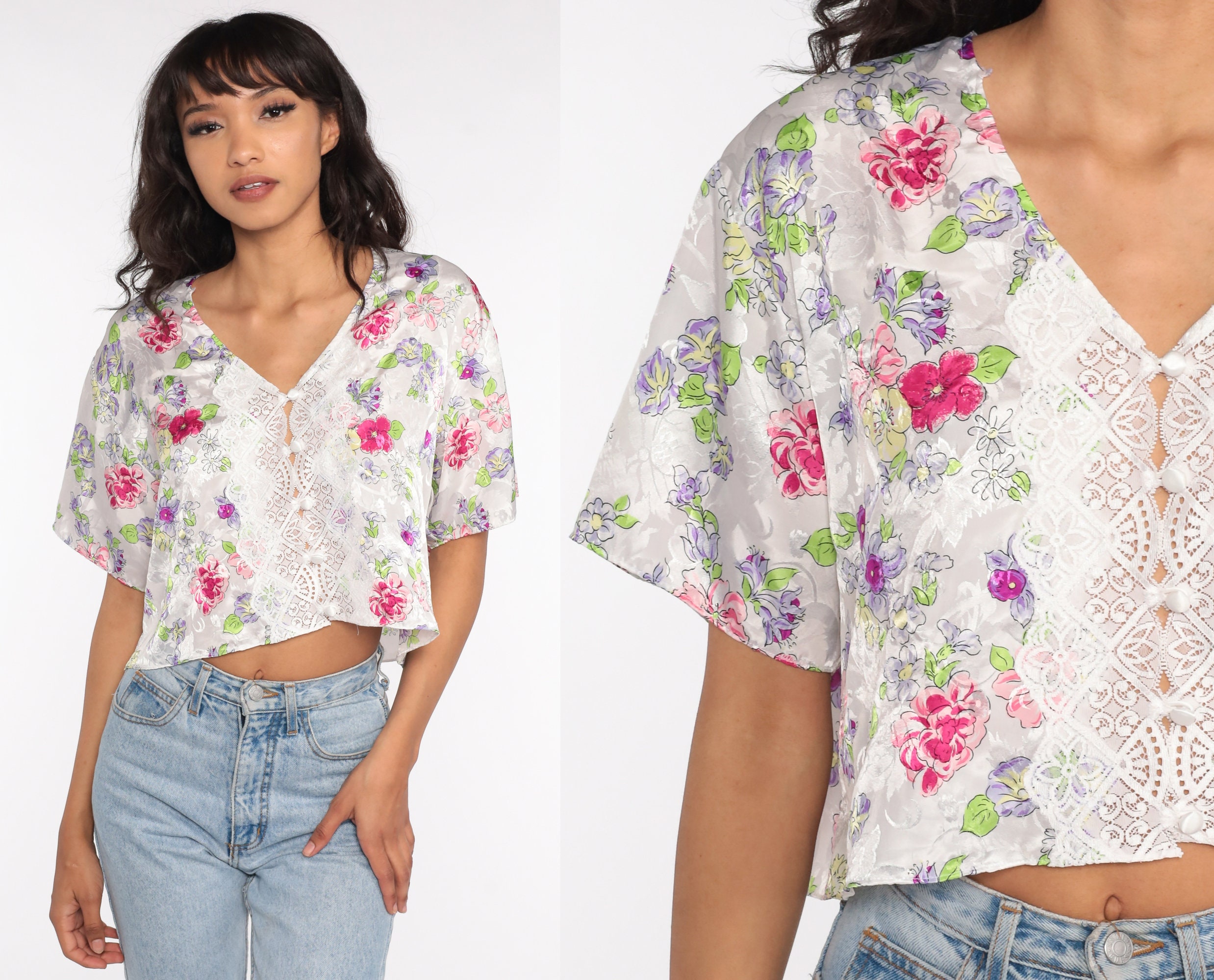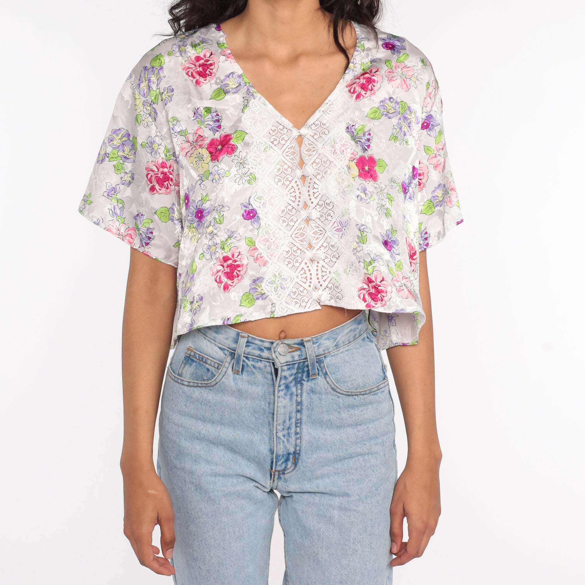 Vintage 80s 90s lingerie pajama top in a floral design with lace trim.