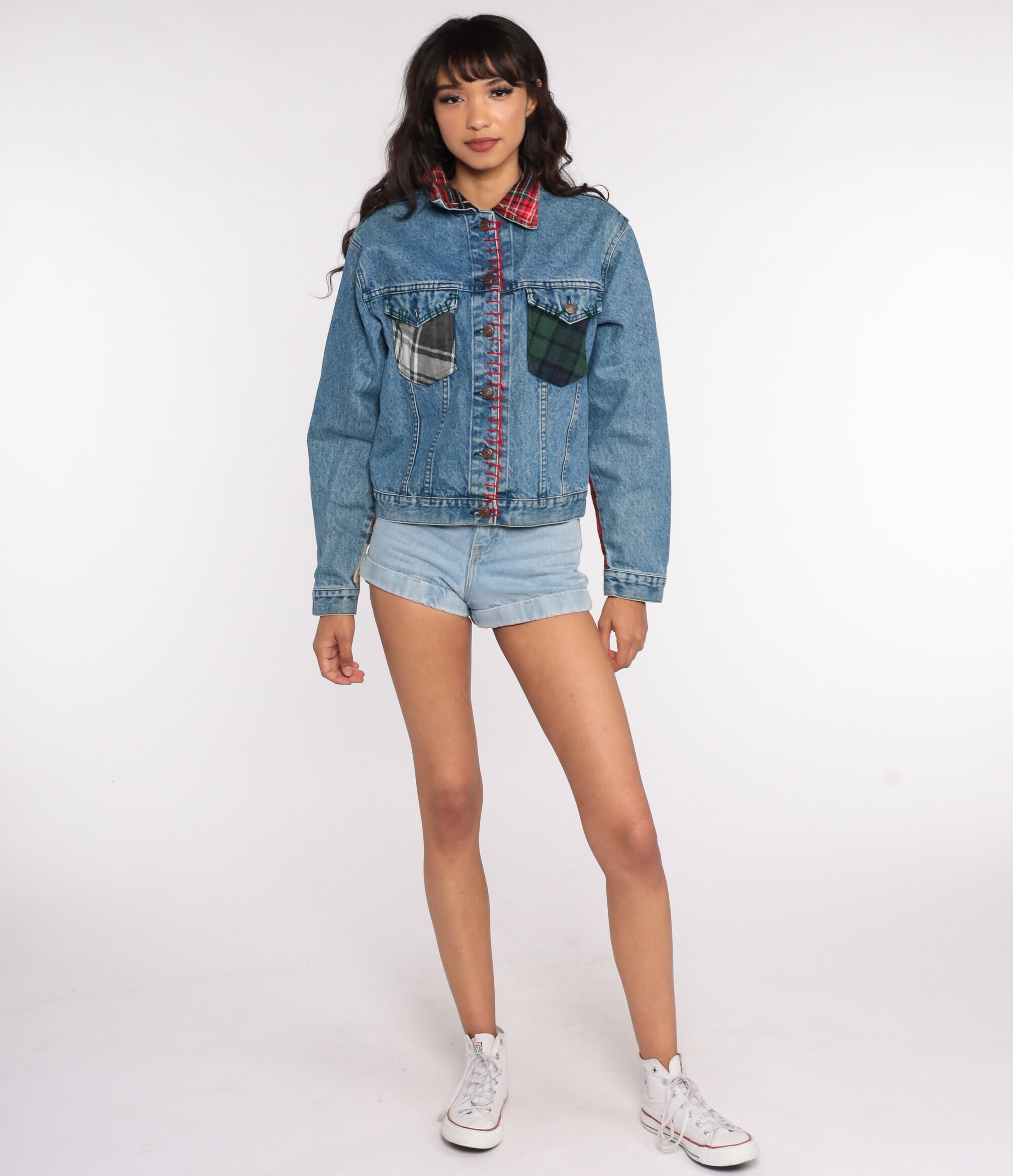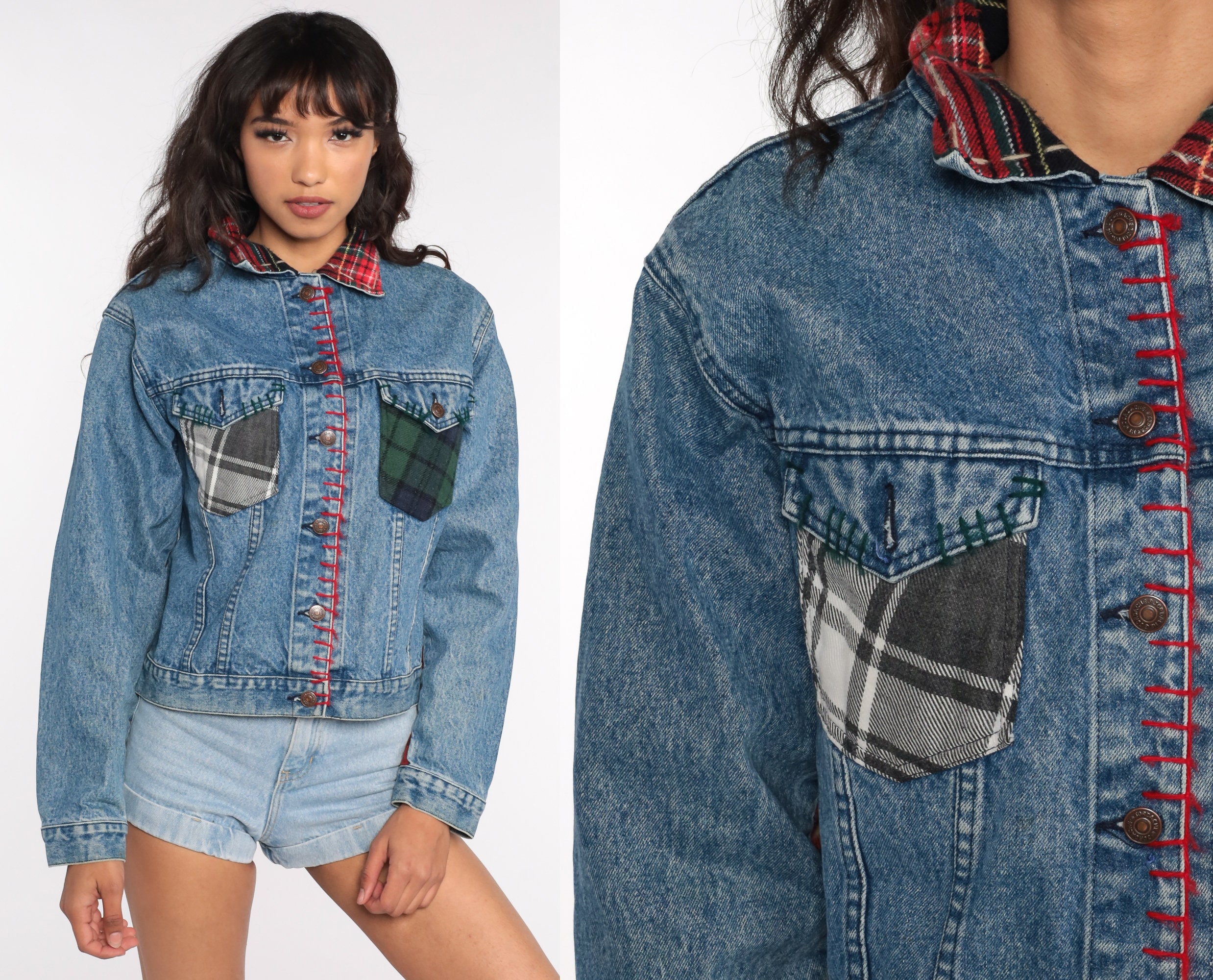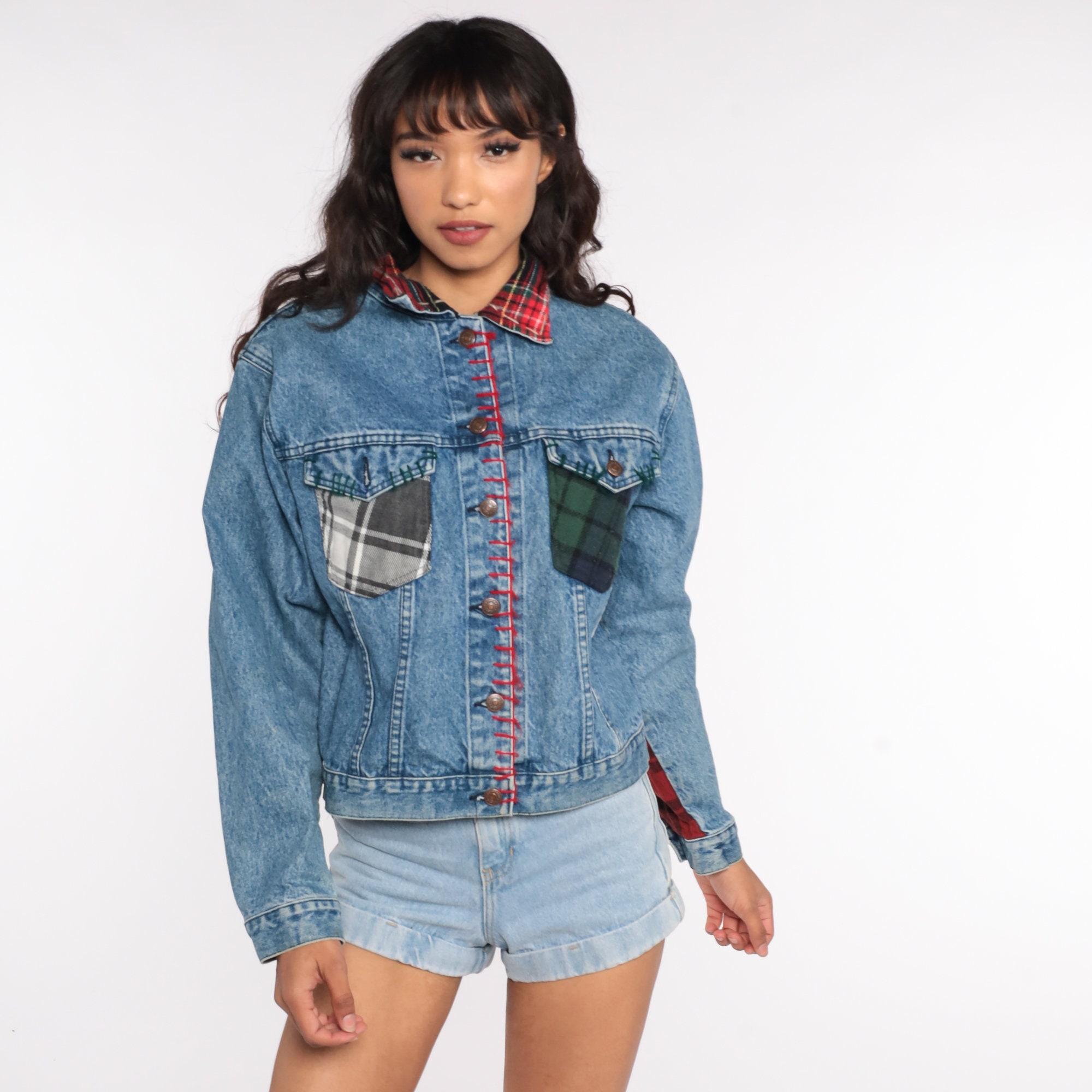 Vintage 80s jean jacket in blue denim with a patchwork plaid print.