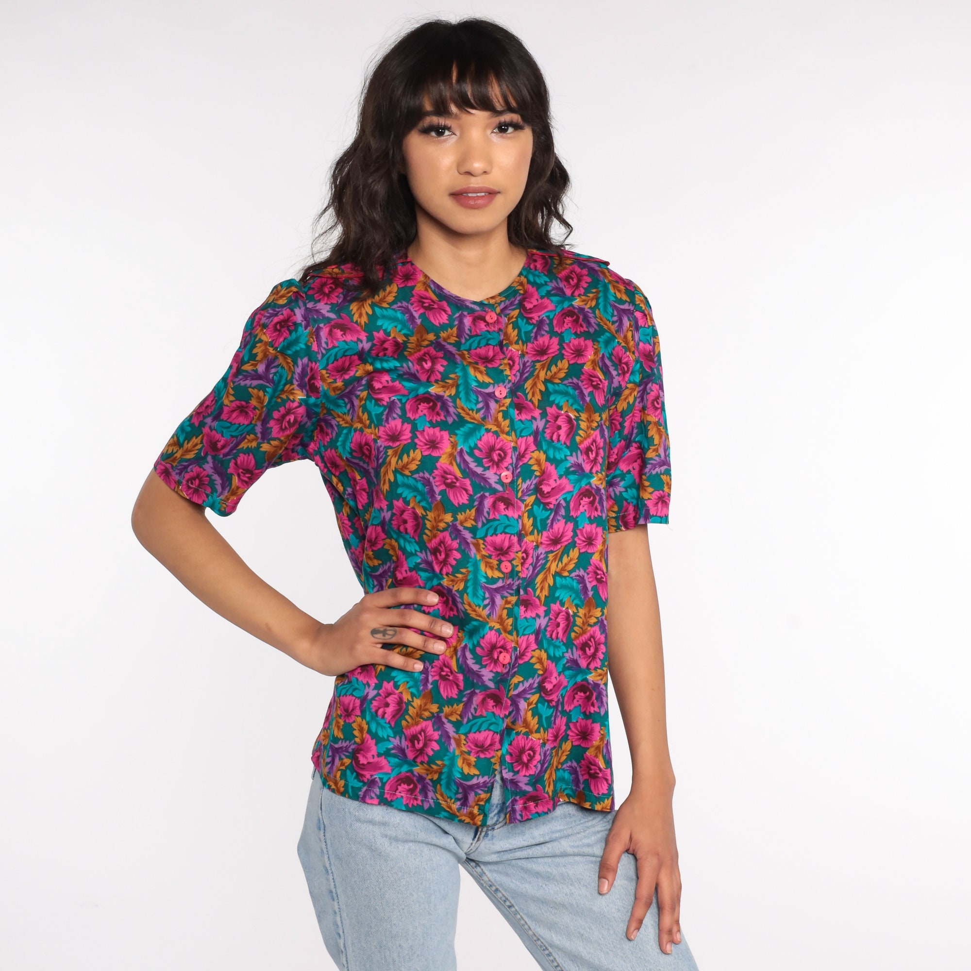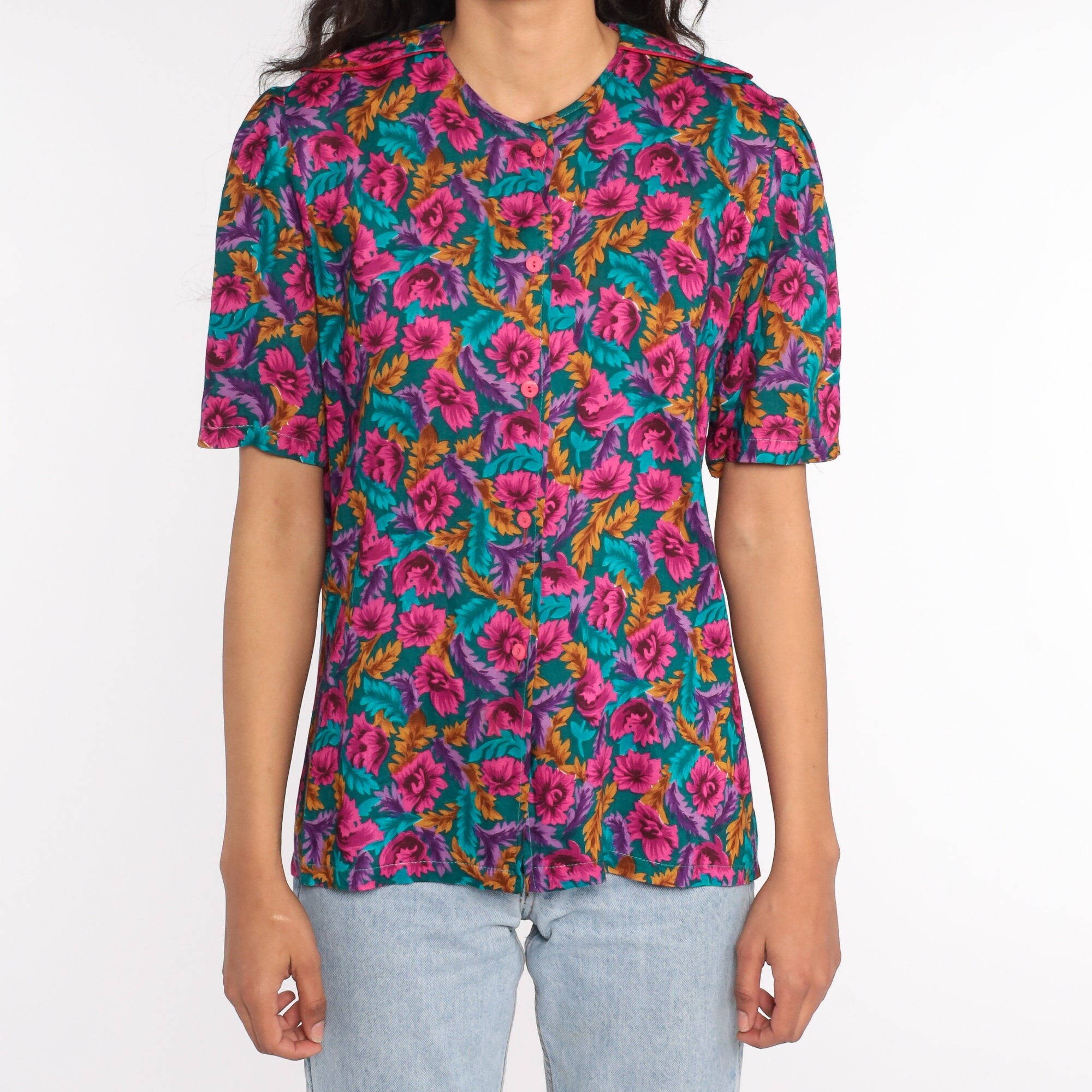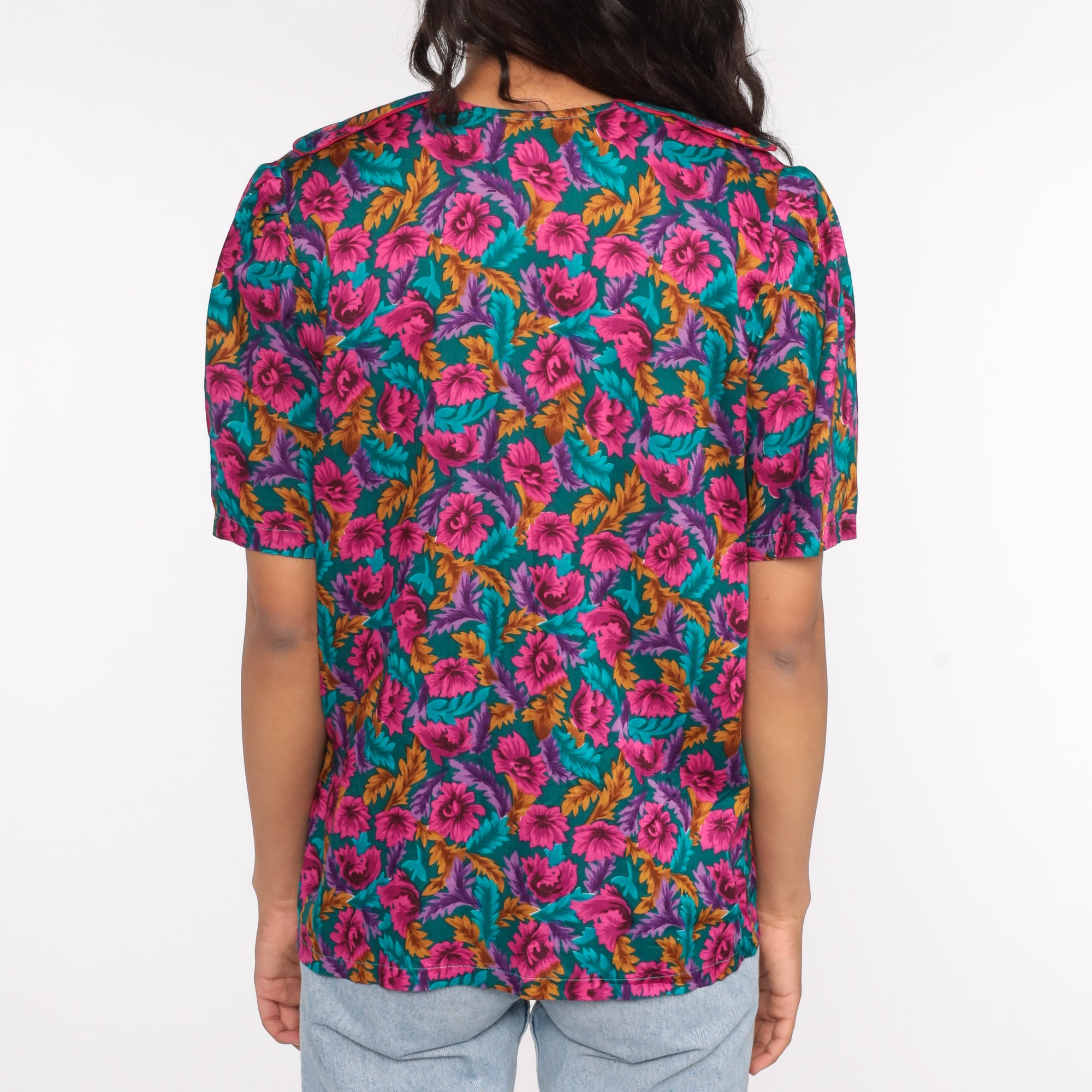 Vintage 80s blouse in a floral print with puff sleeves and buttons up the front.