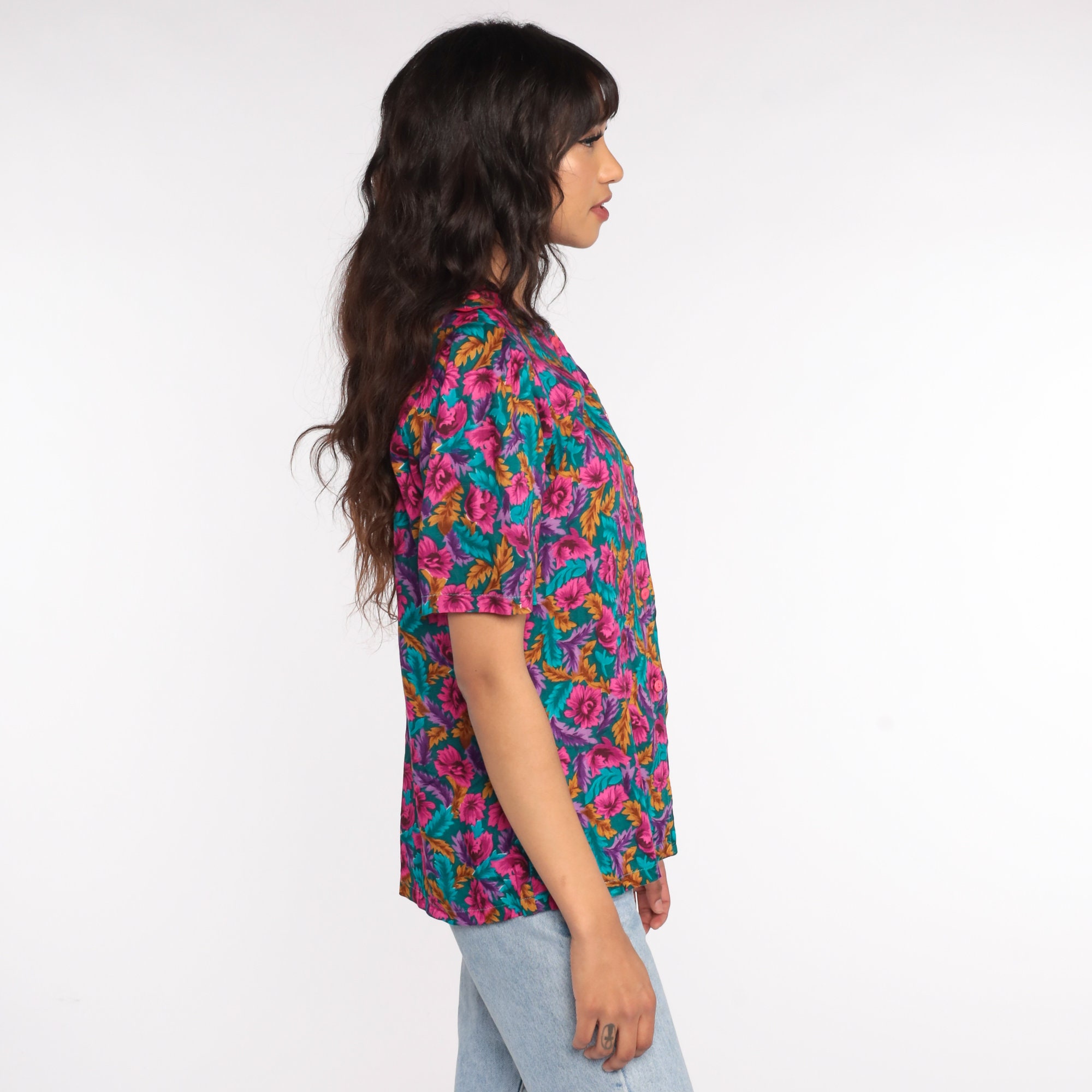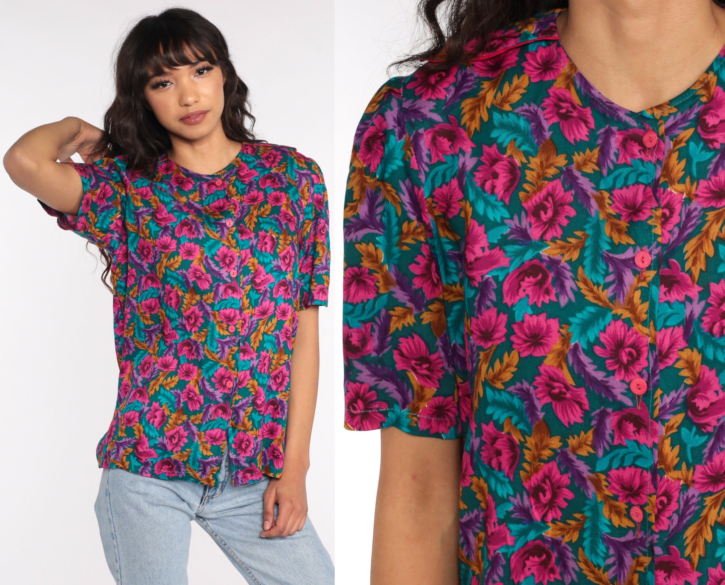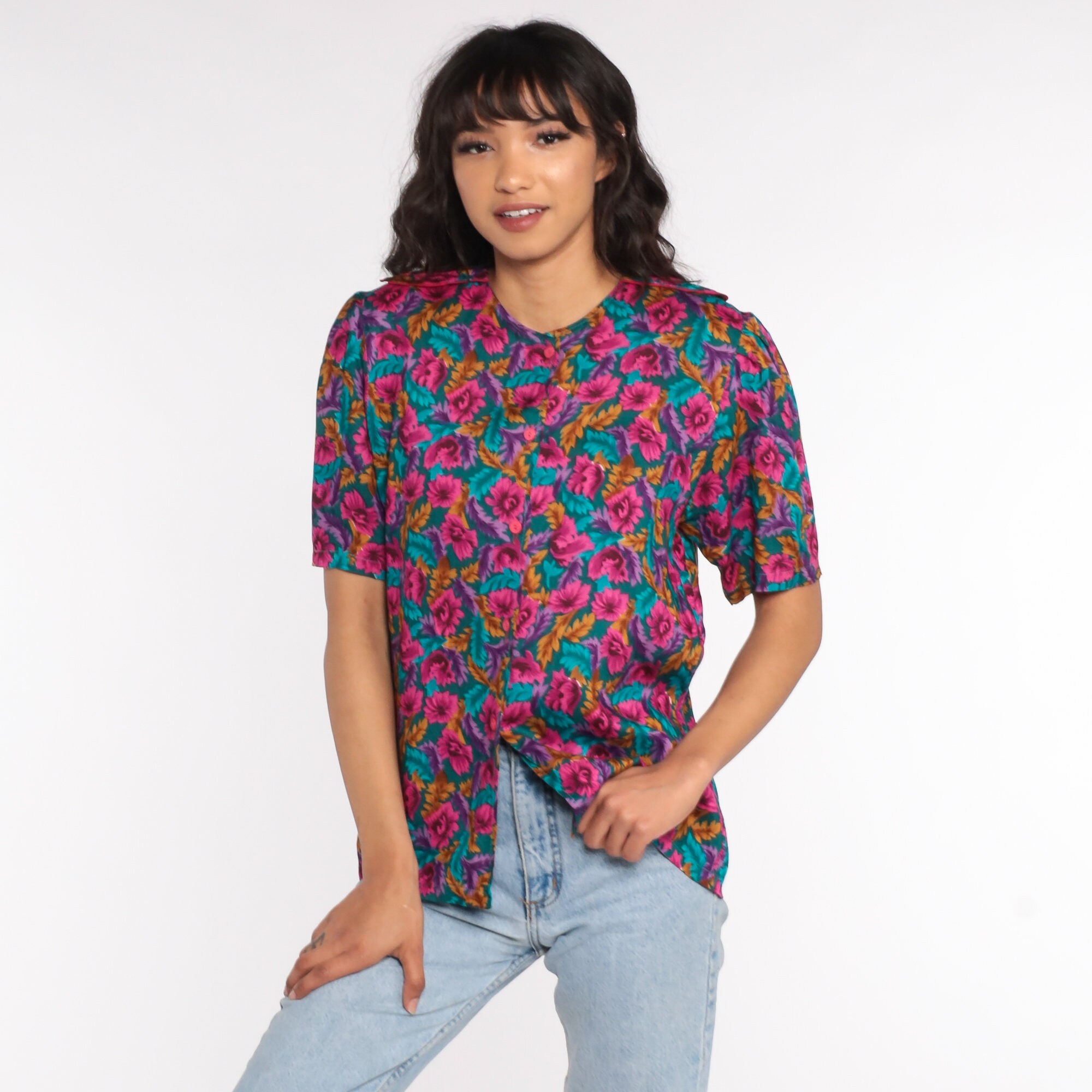 Vintage 80s blouse in a floral print with puff sleeves and buttons up the front.