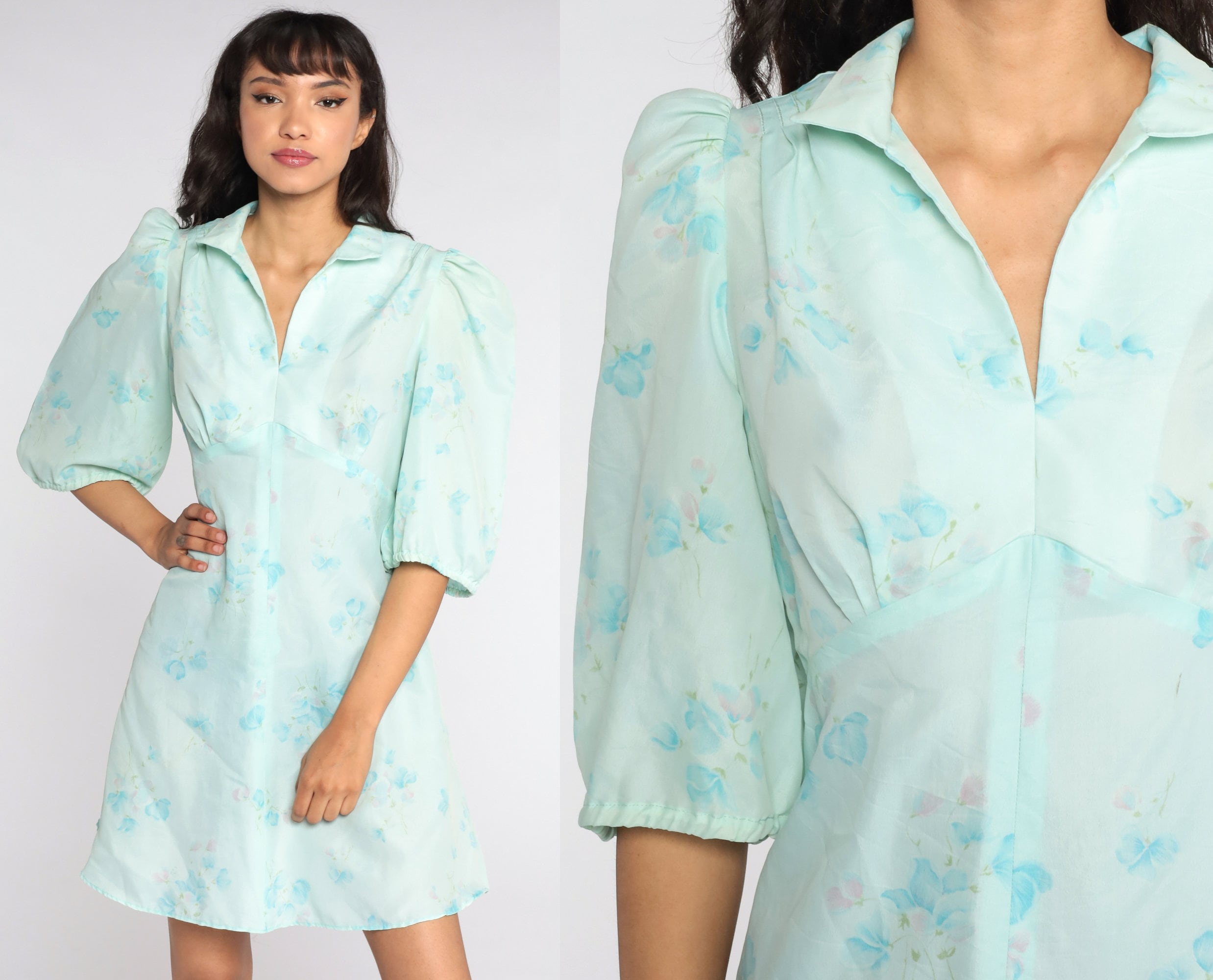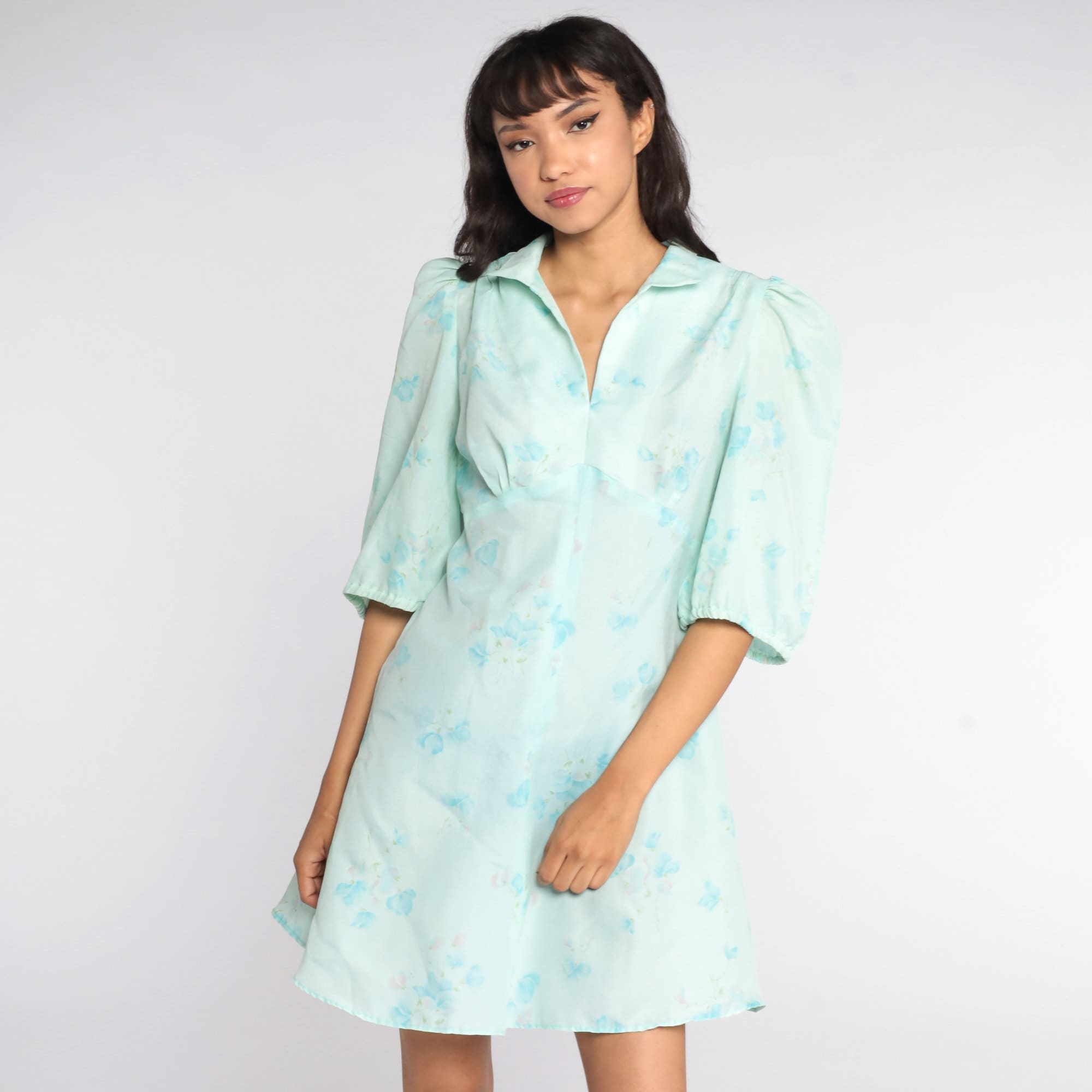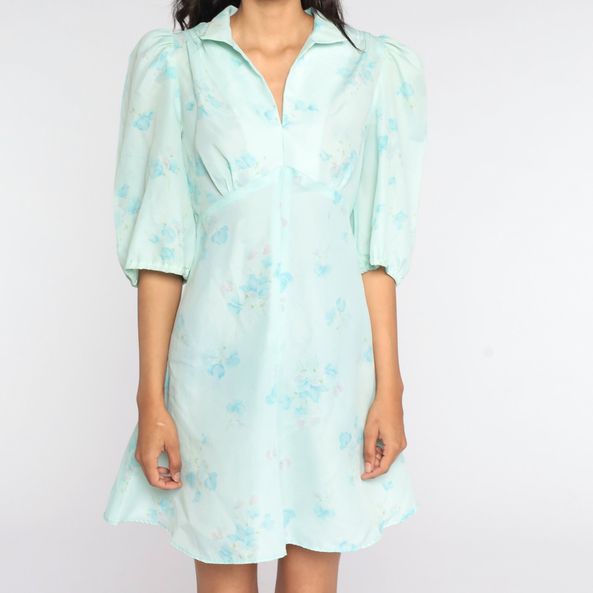 Vintage 70s dress in a floral print with puff sleeves. It has an empire waist, a v neck and a mini length skirt.