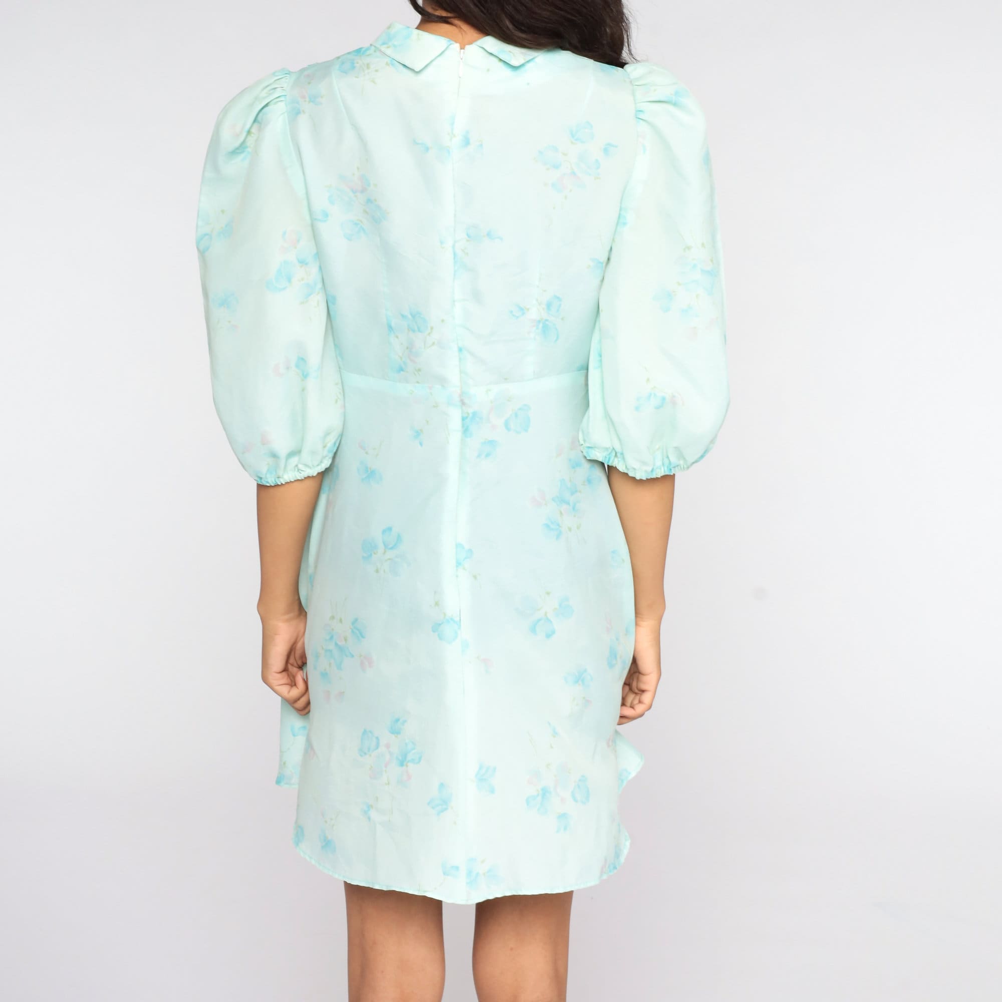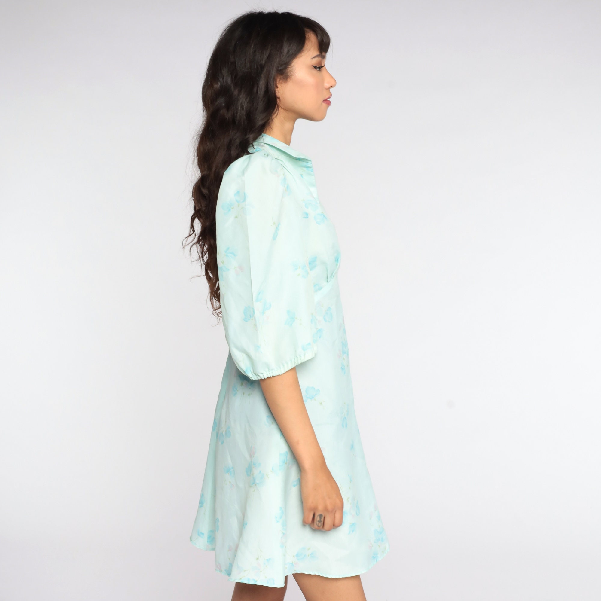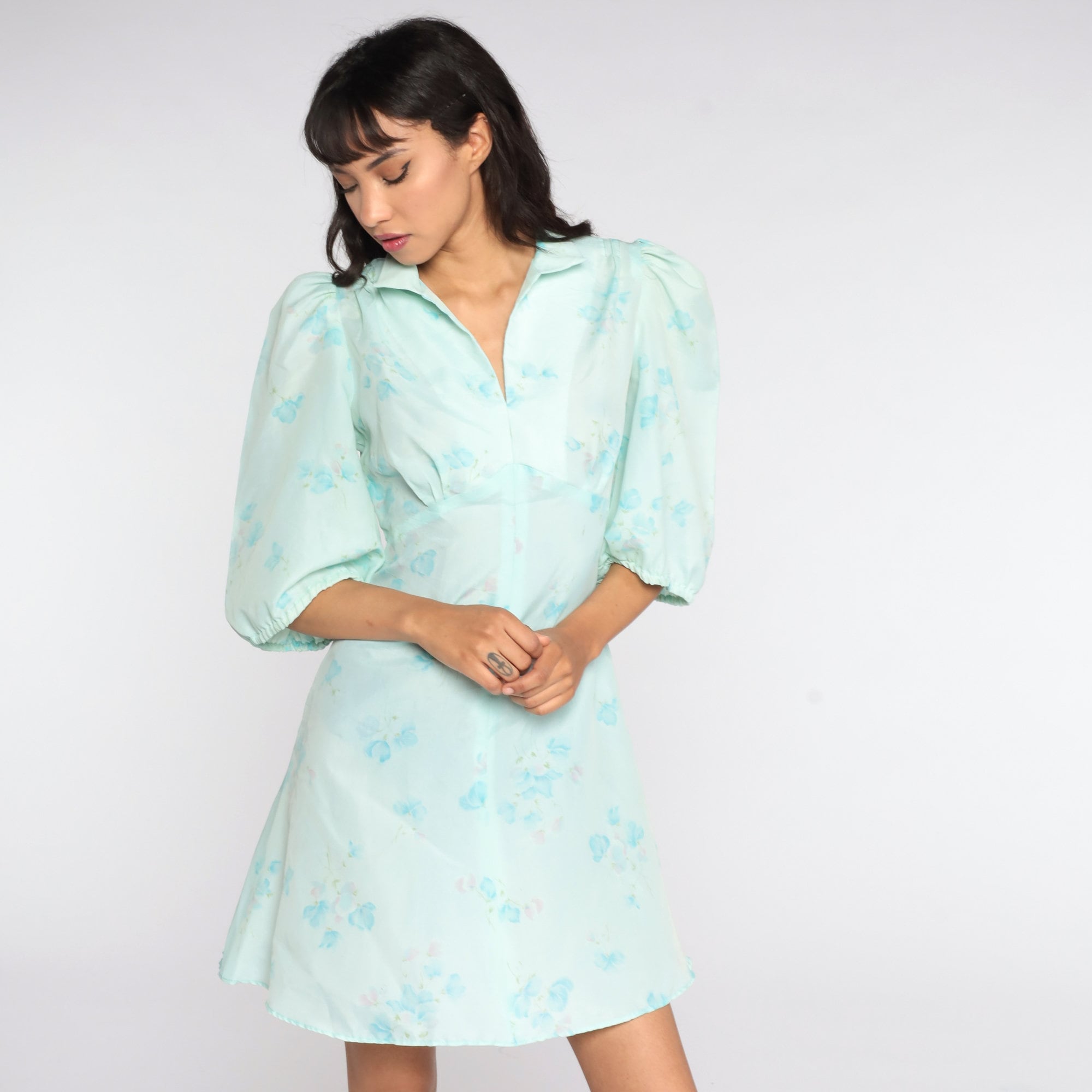 Vintage 70s dress in a floral print with puff sleeves. It has an empire waist, a v neck and a mini length skirt.