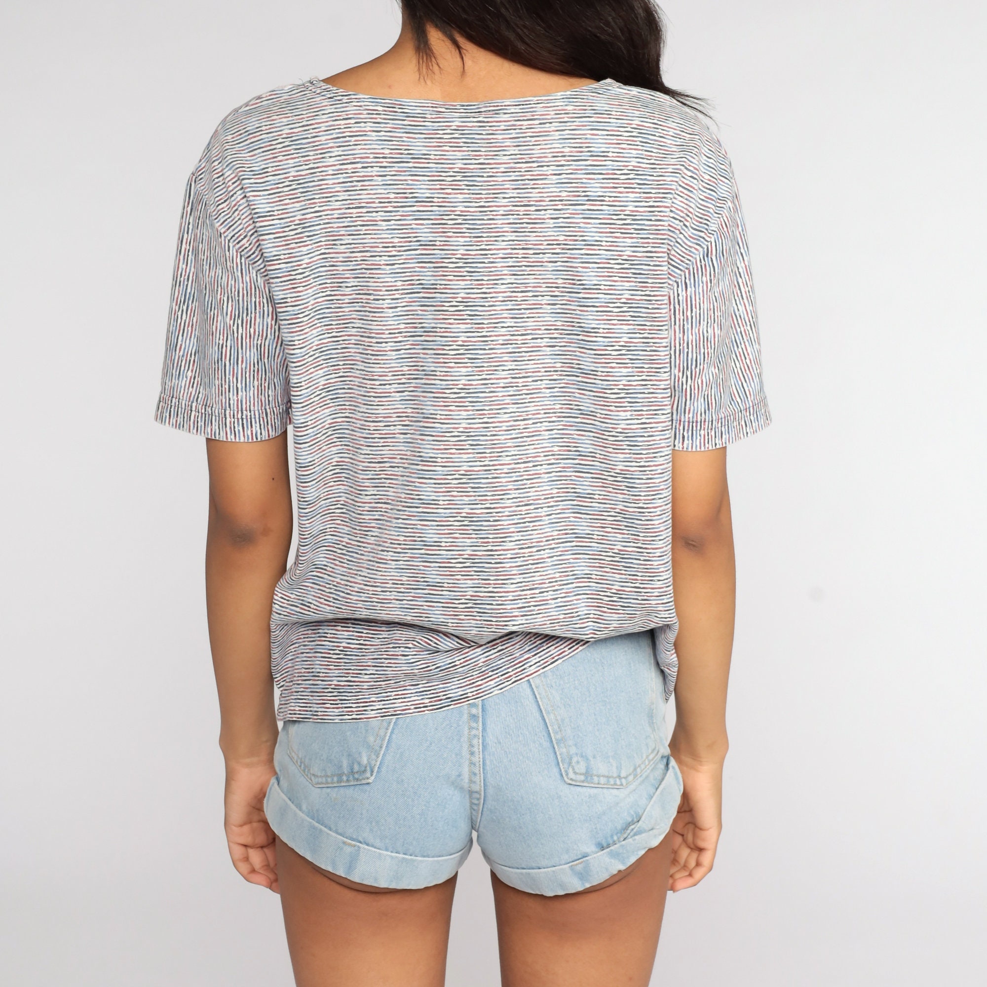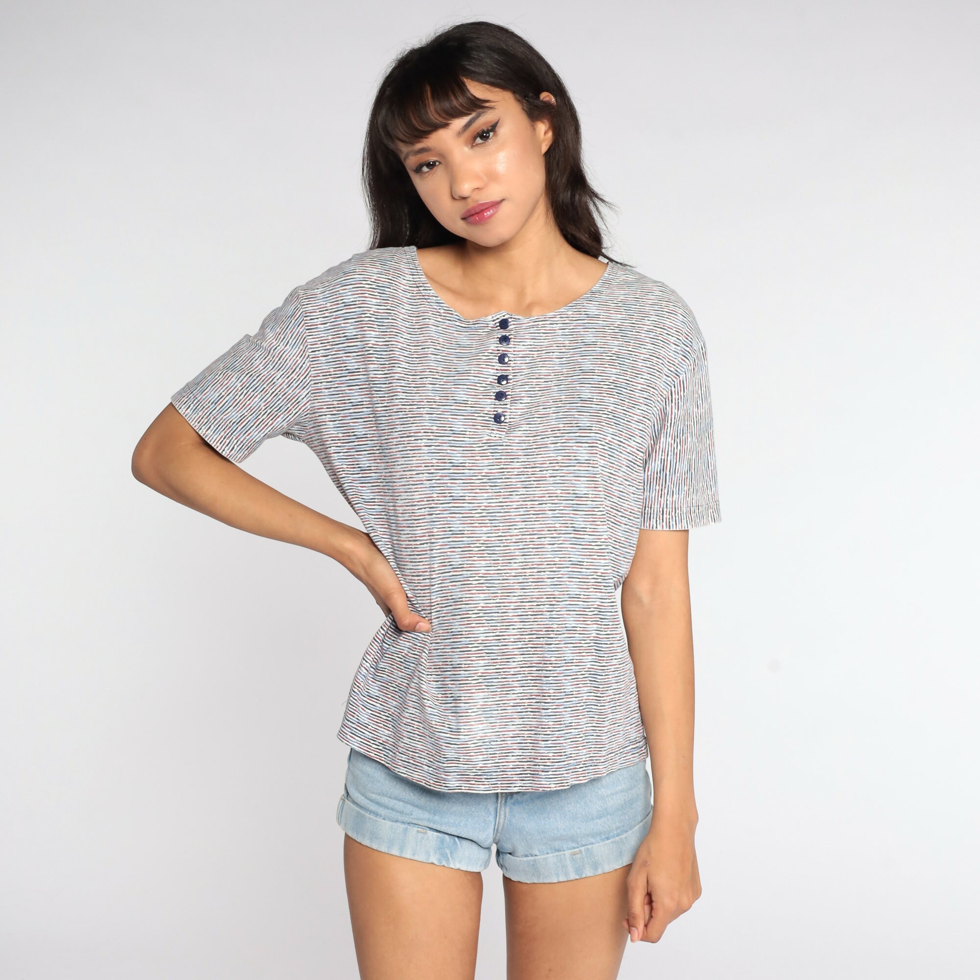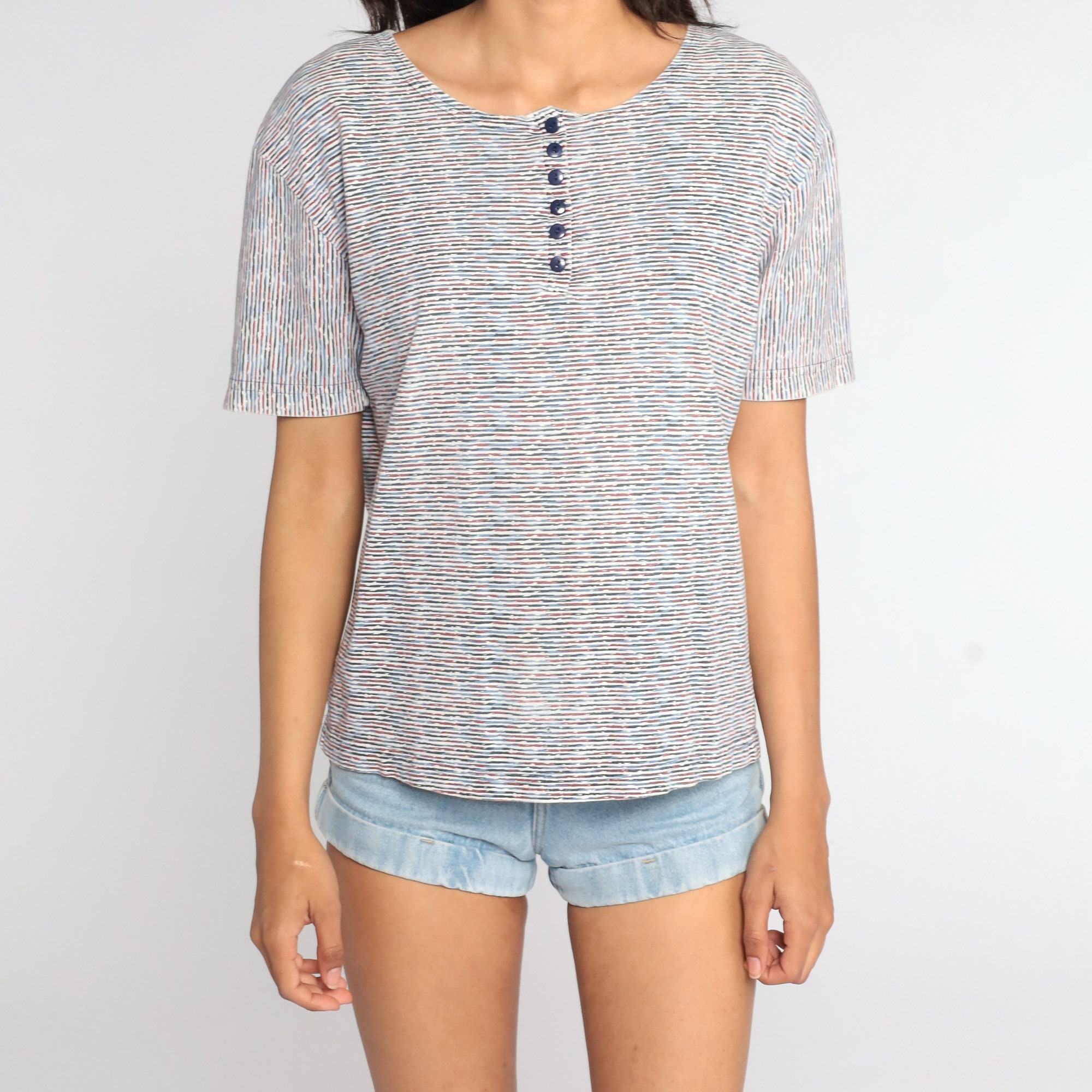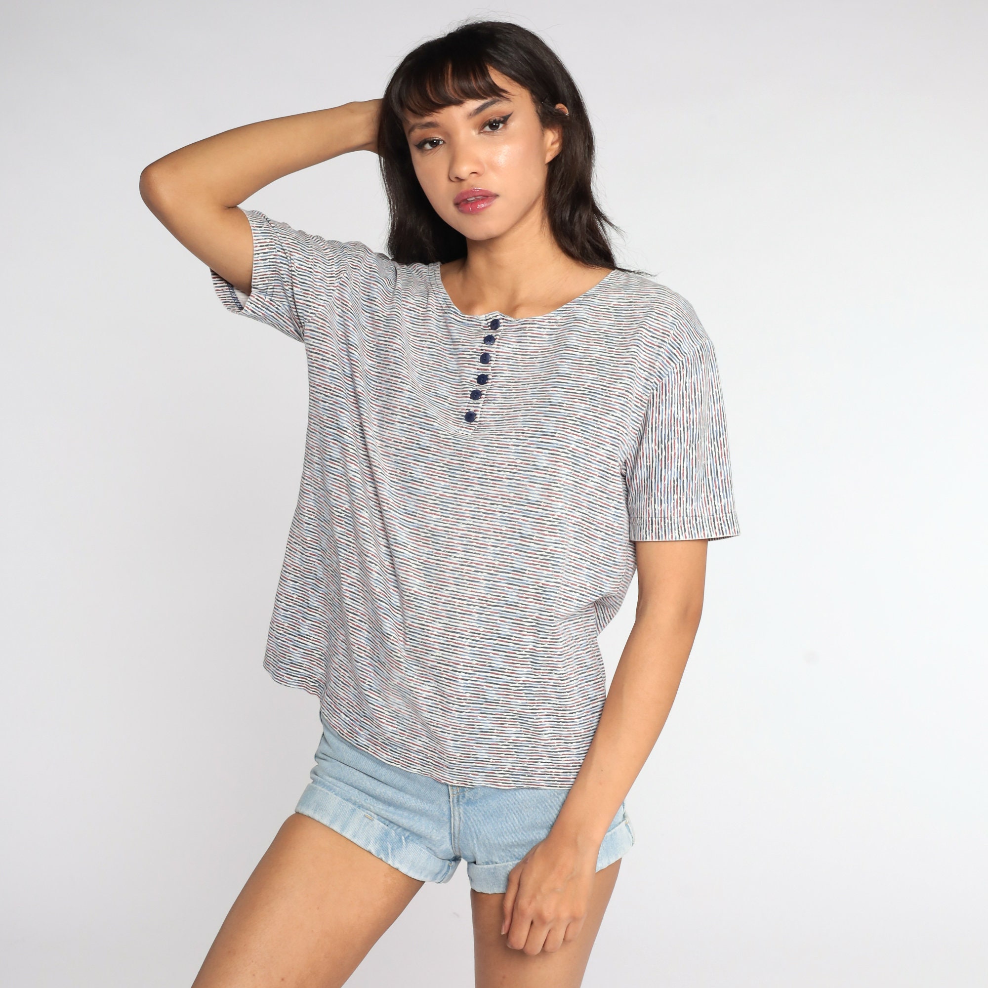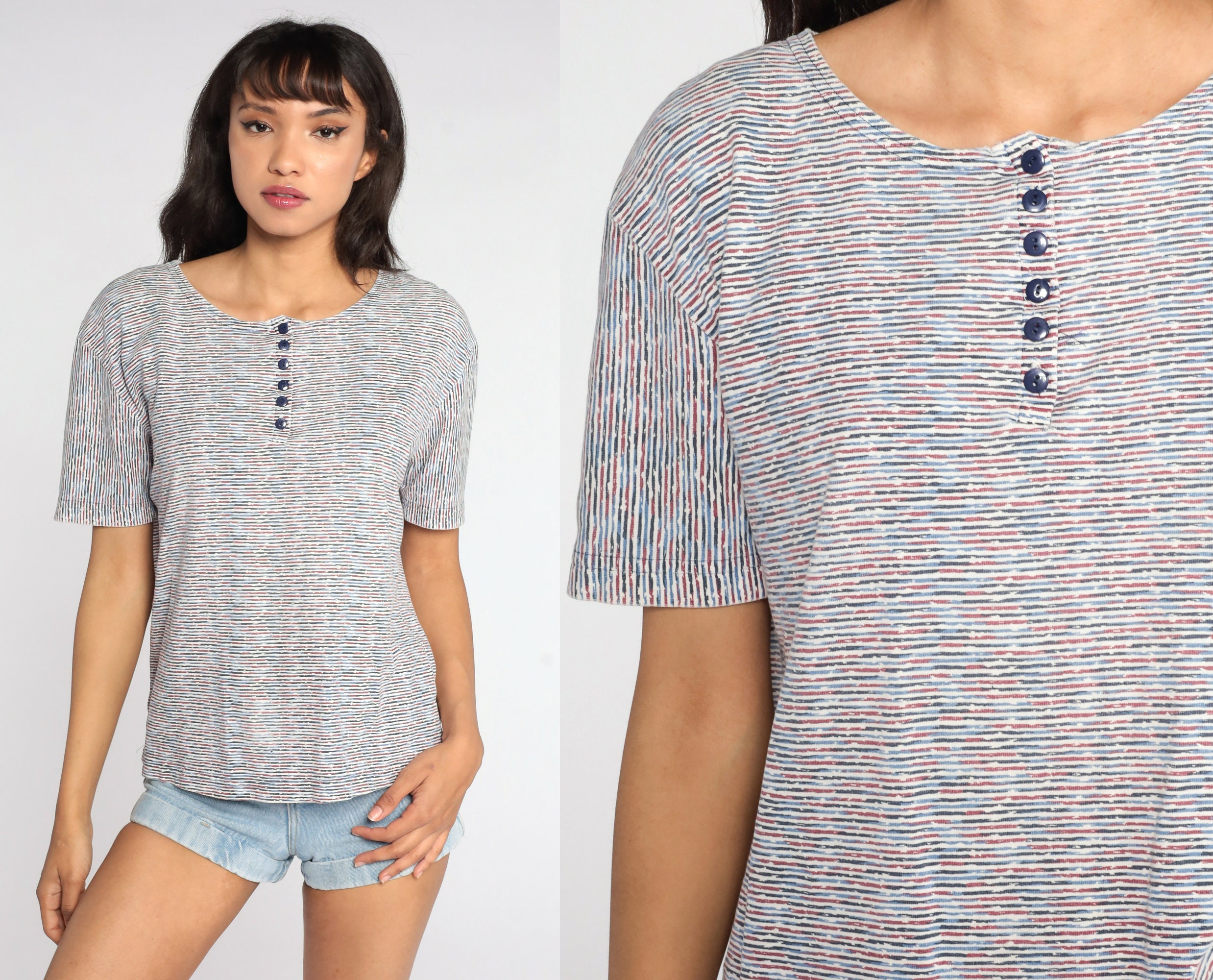 Vintage 80s shirt in stripes with buttons up the neck.