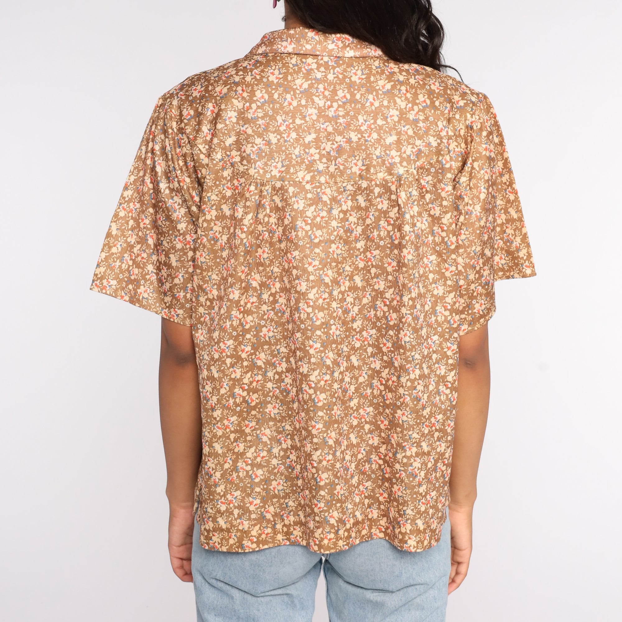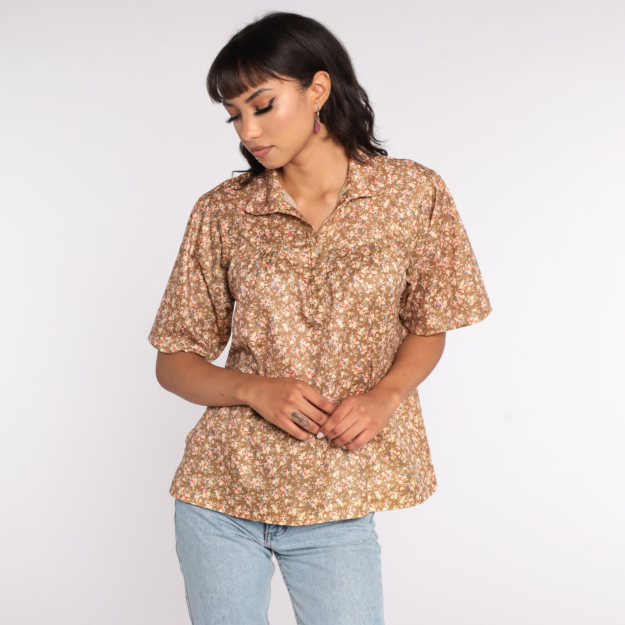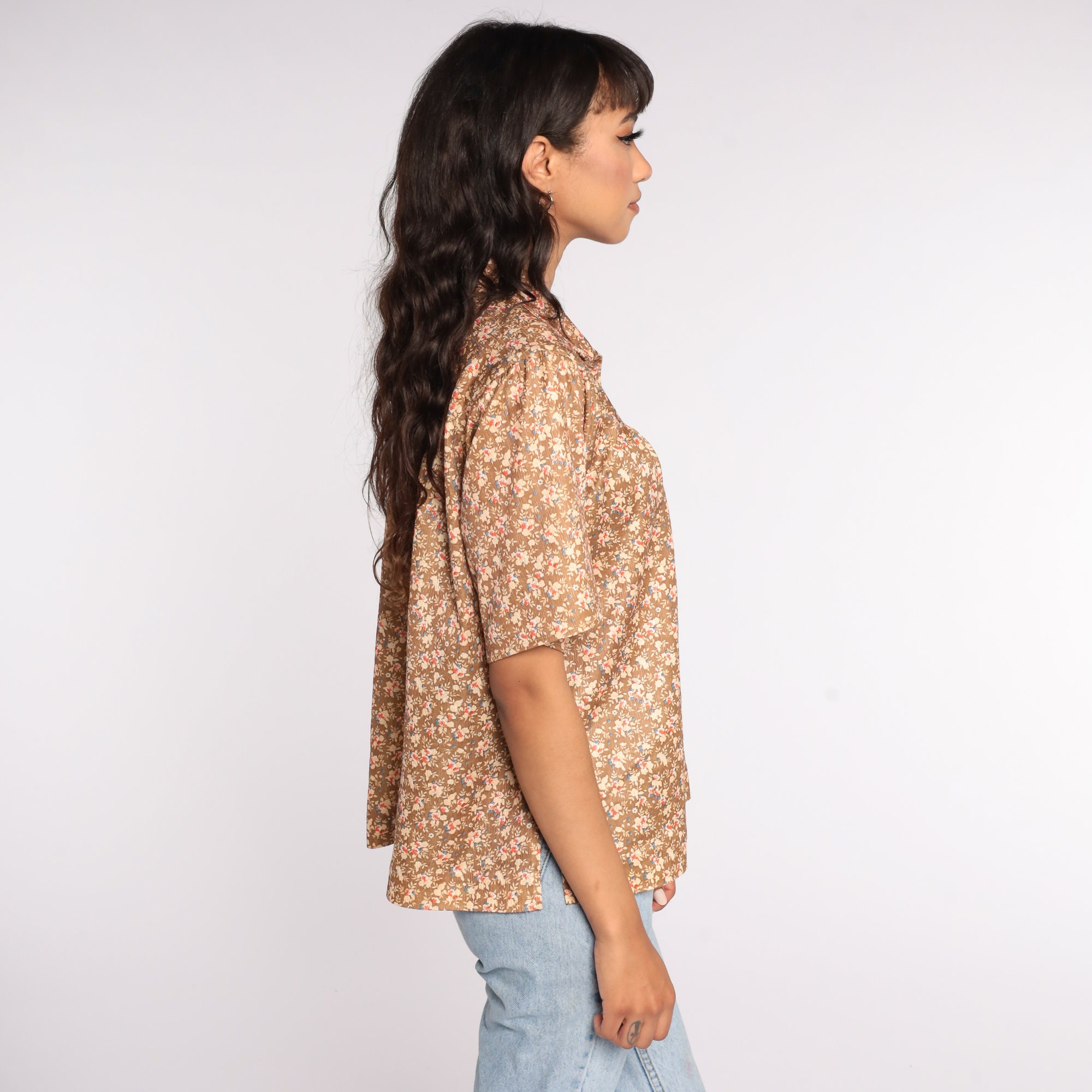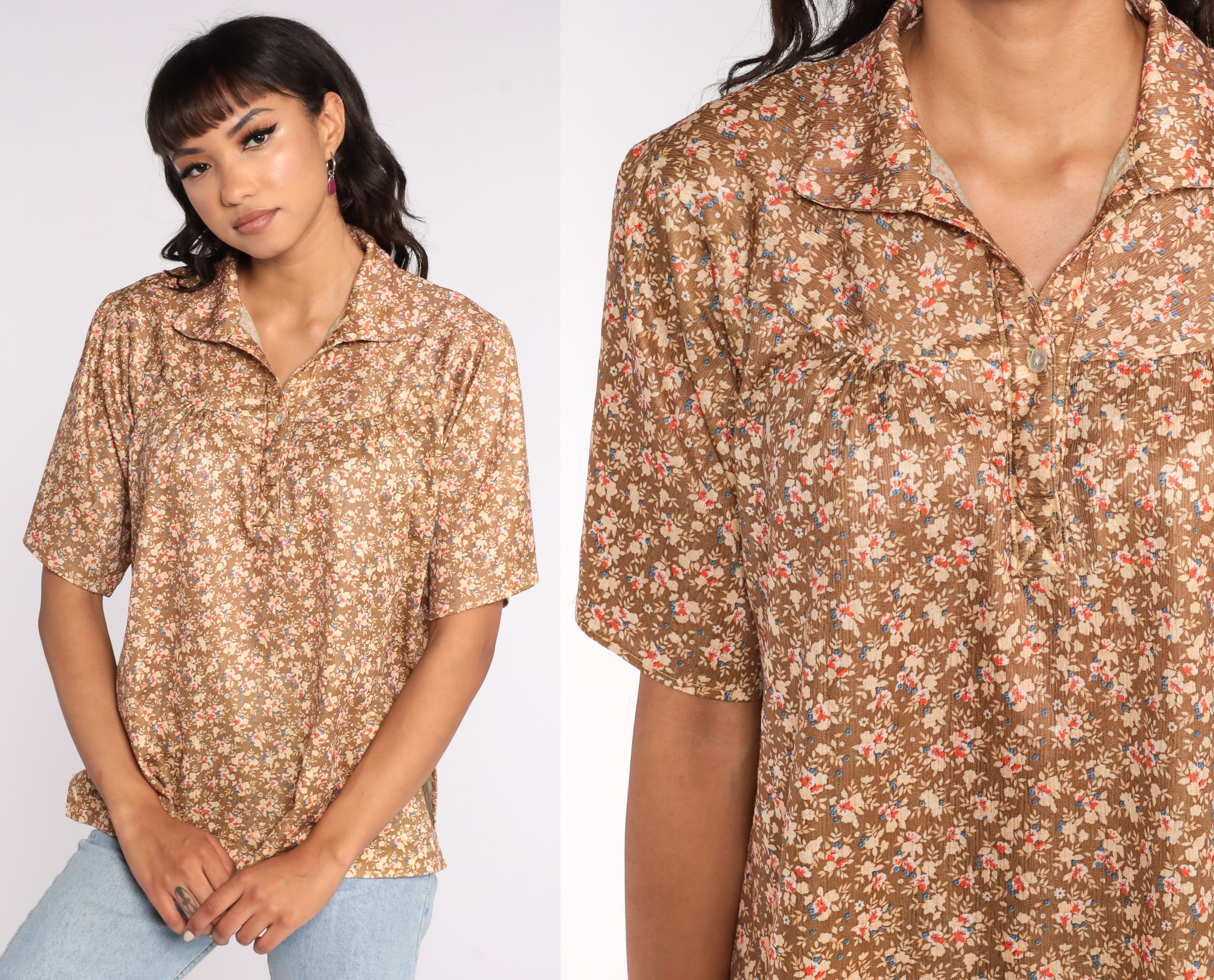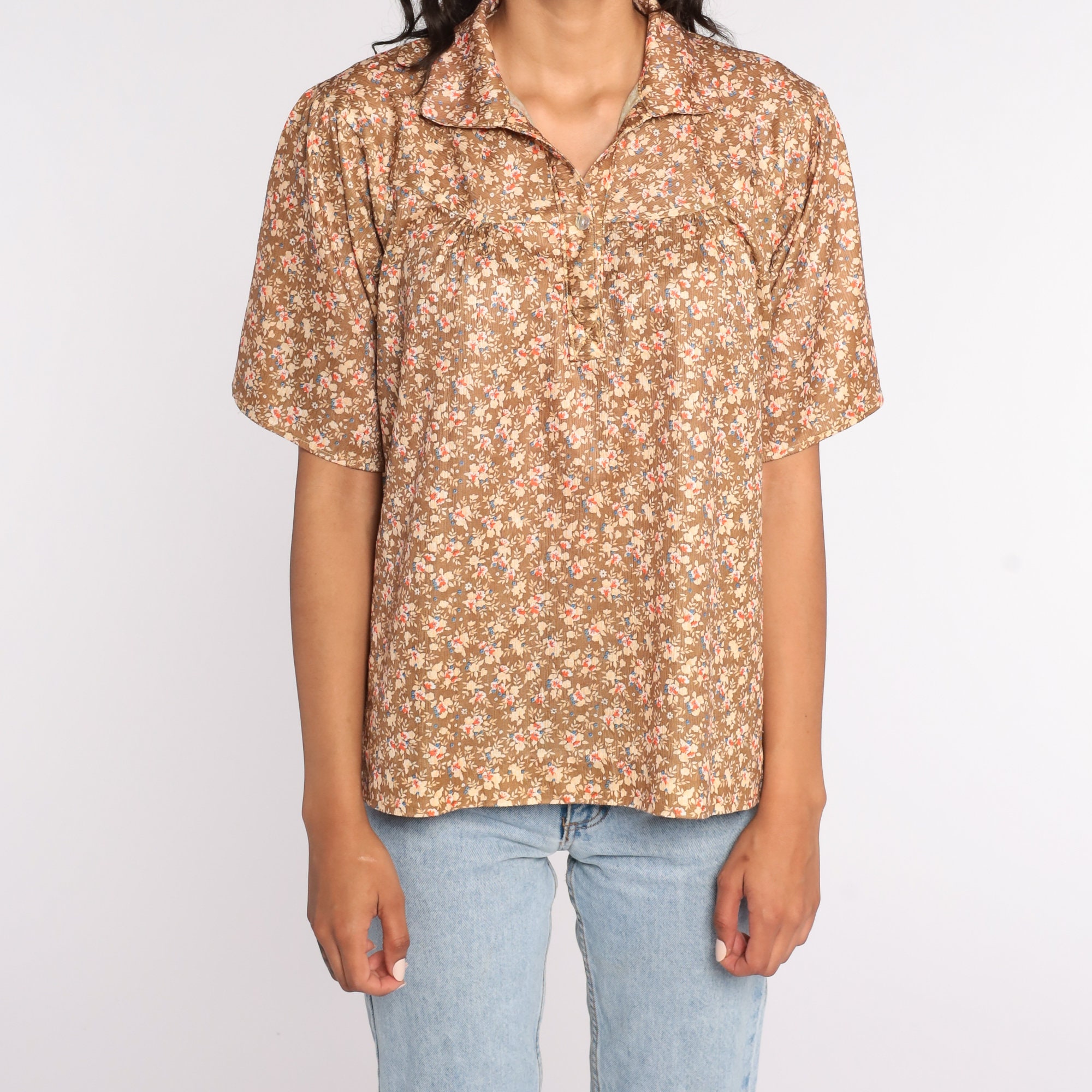 Vintage 70s blouse in brown with a floral print. Short sleeves, buttons up the front.