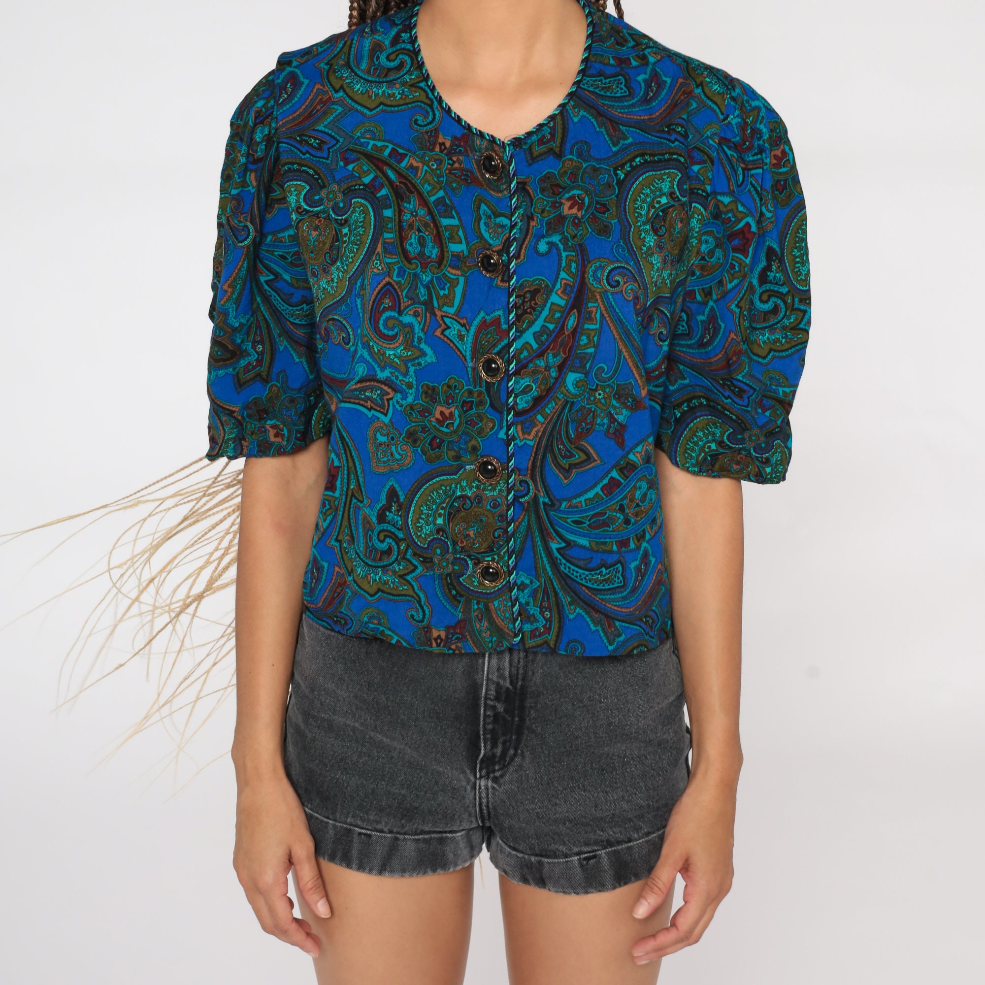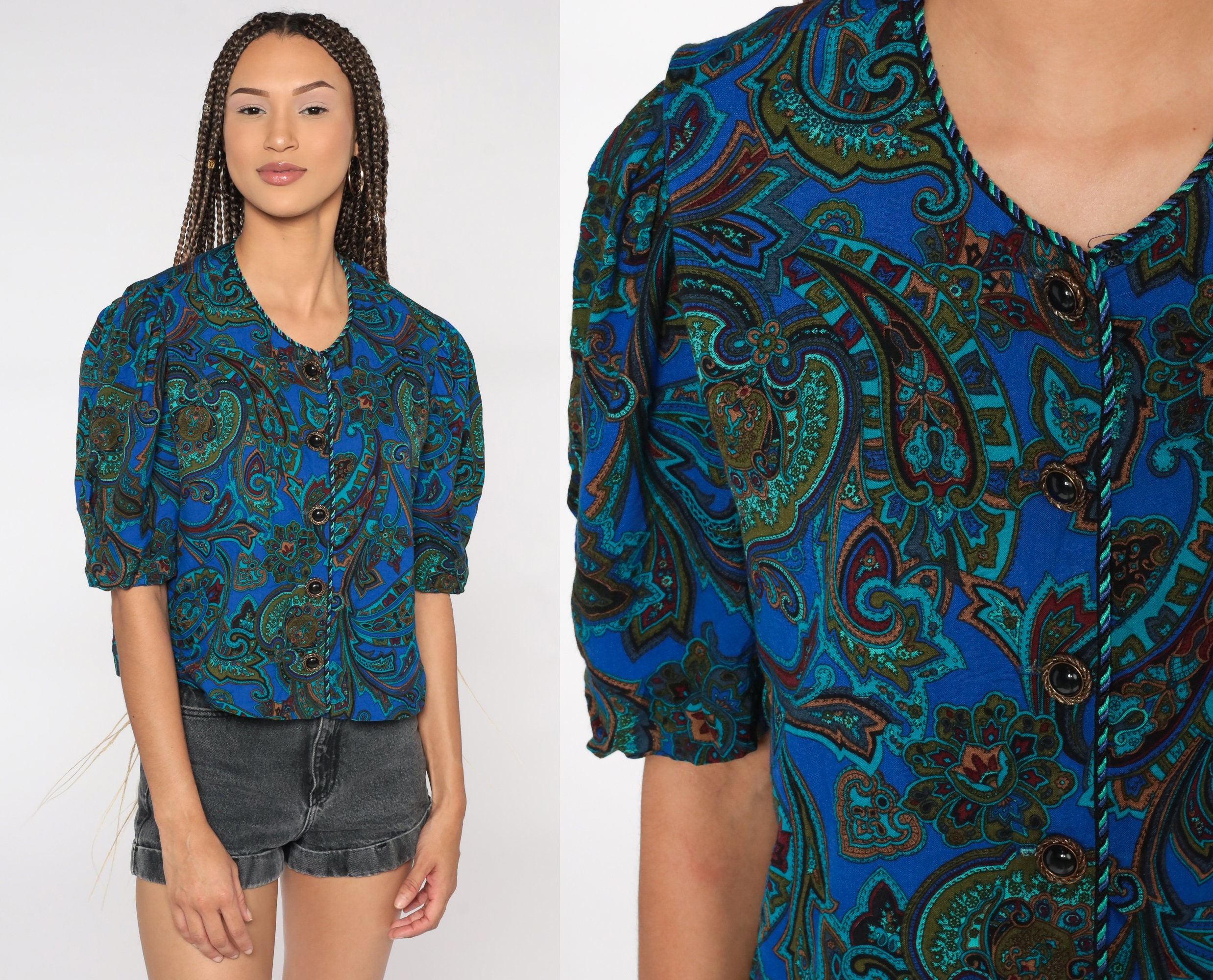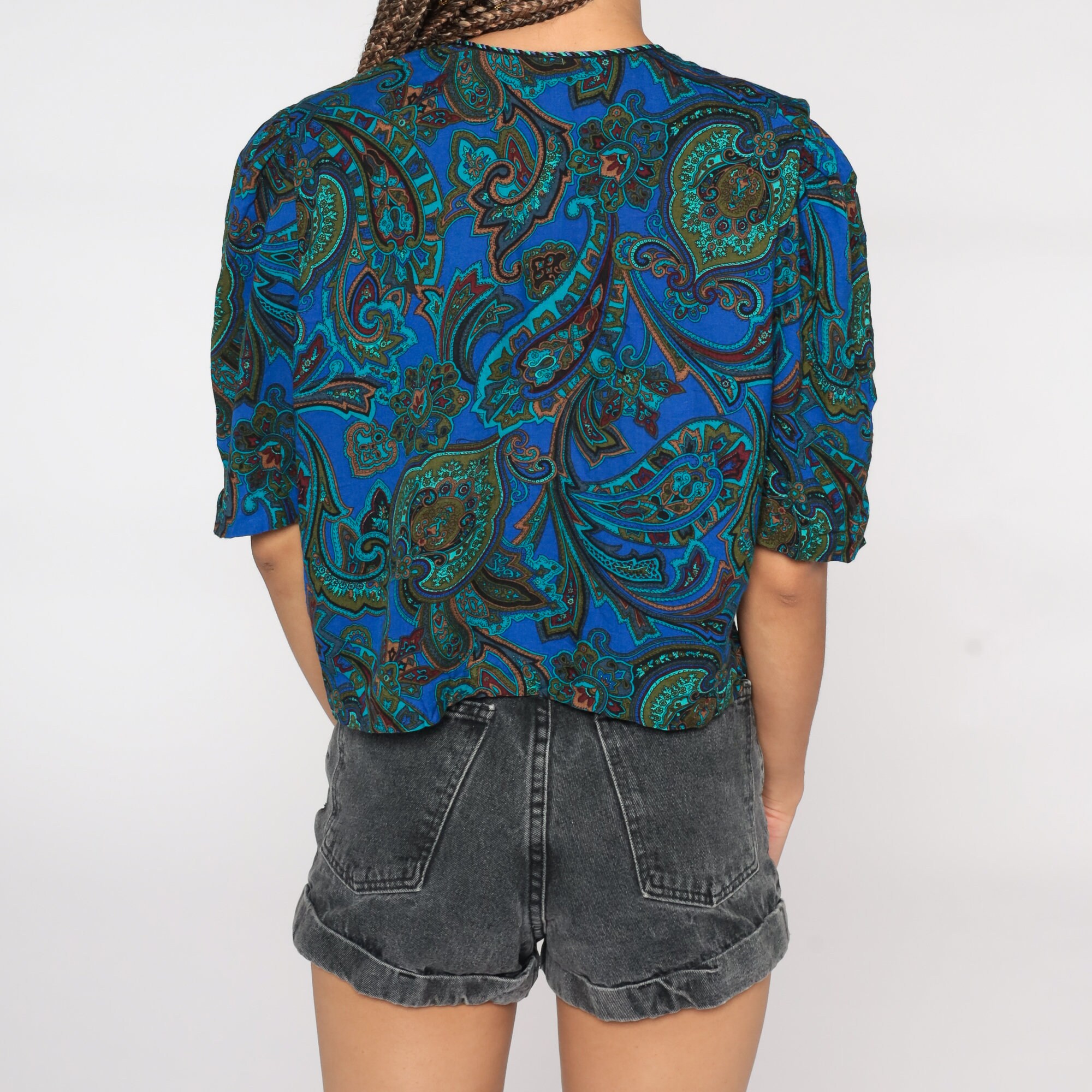 Vintage 80s shirt in a paisley print with puff sleeves.