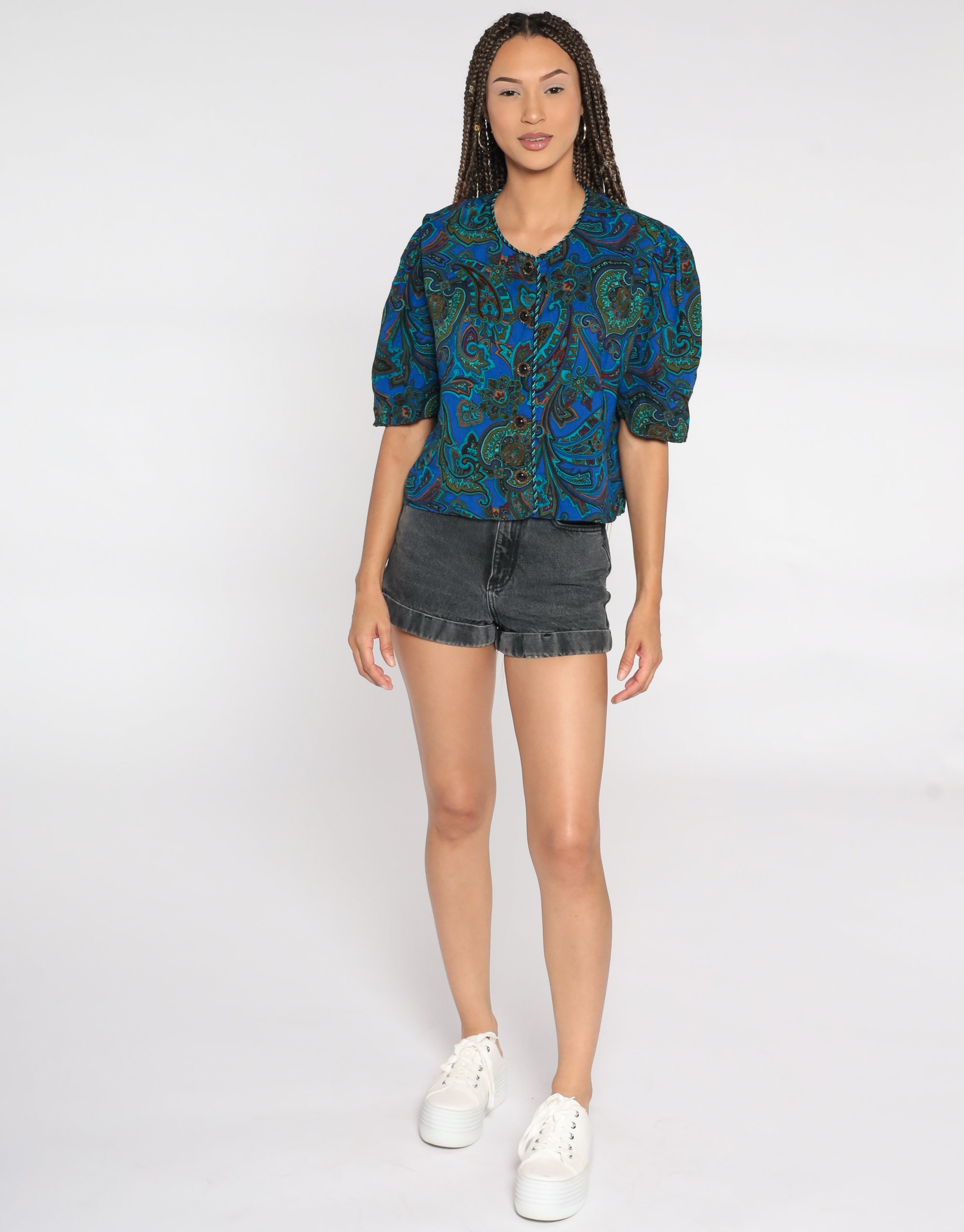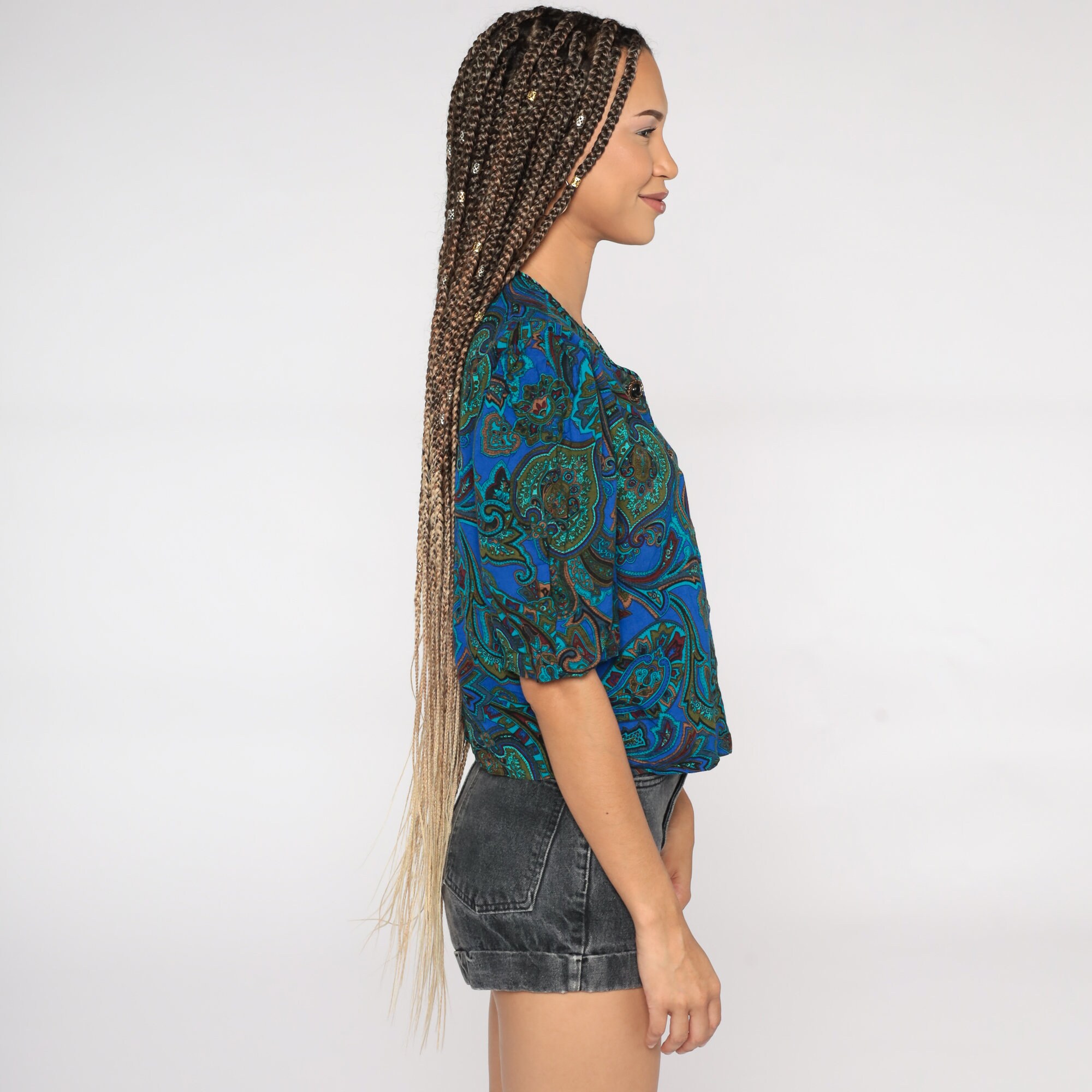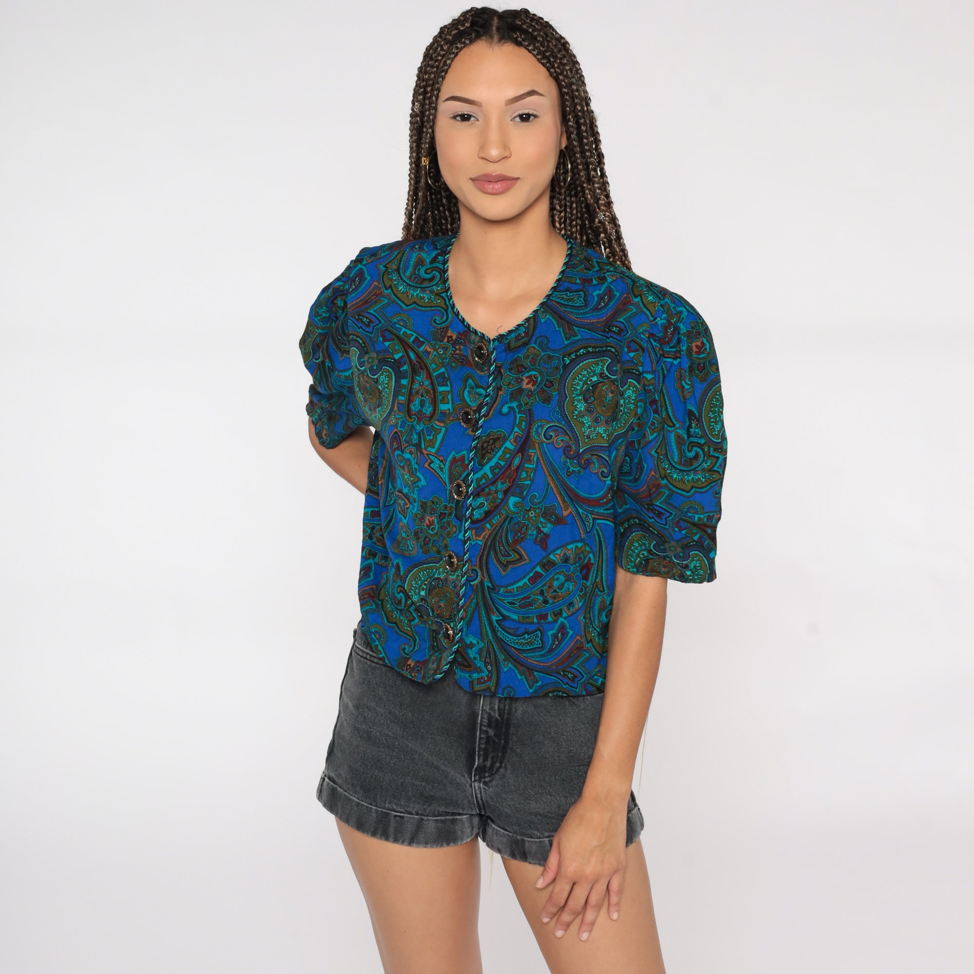 Vintage 80s shirt in a paisley print with puff sleeves.