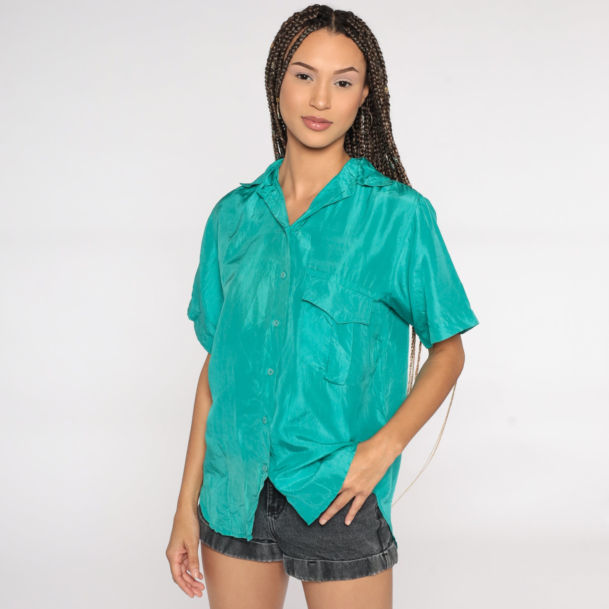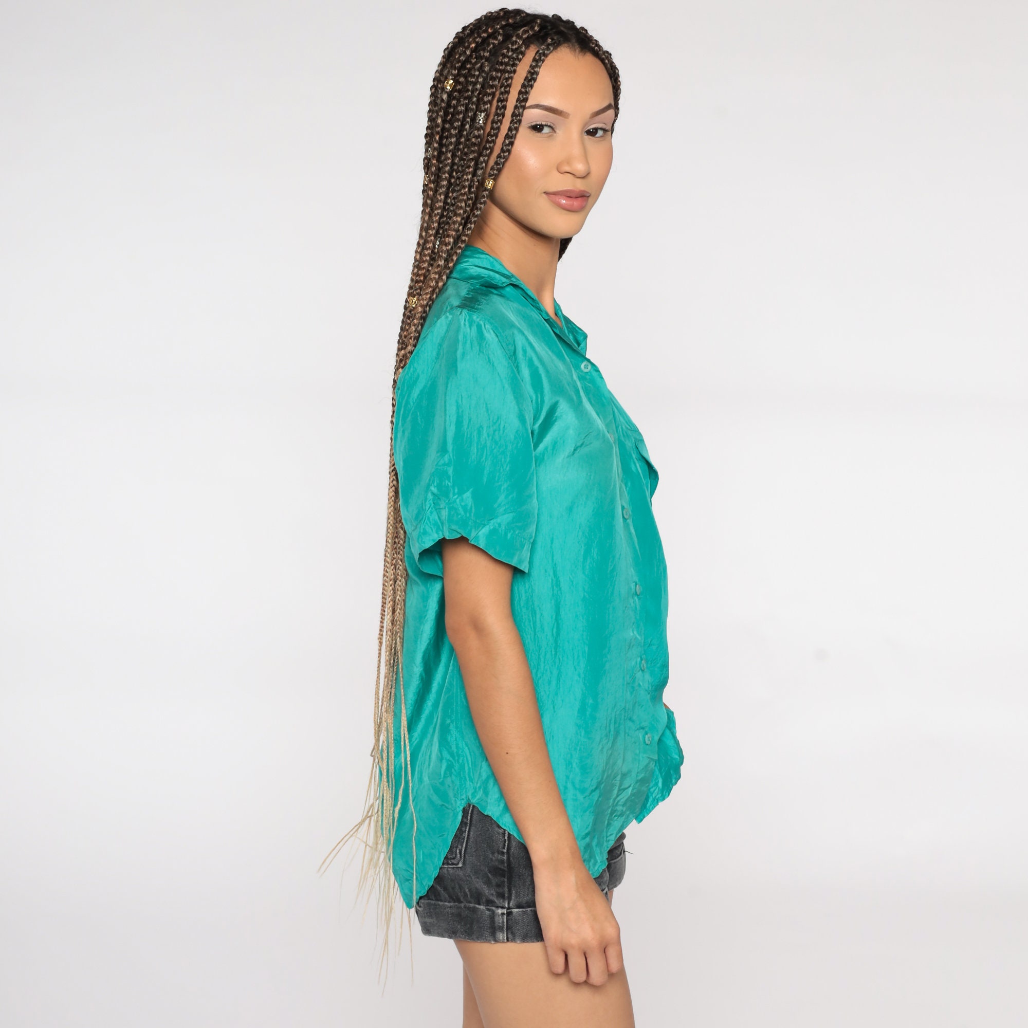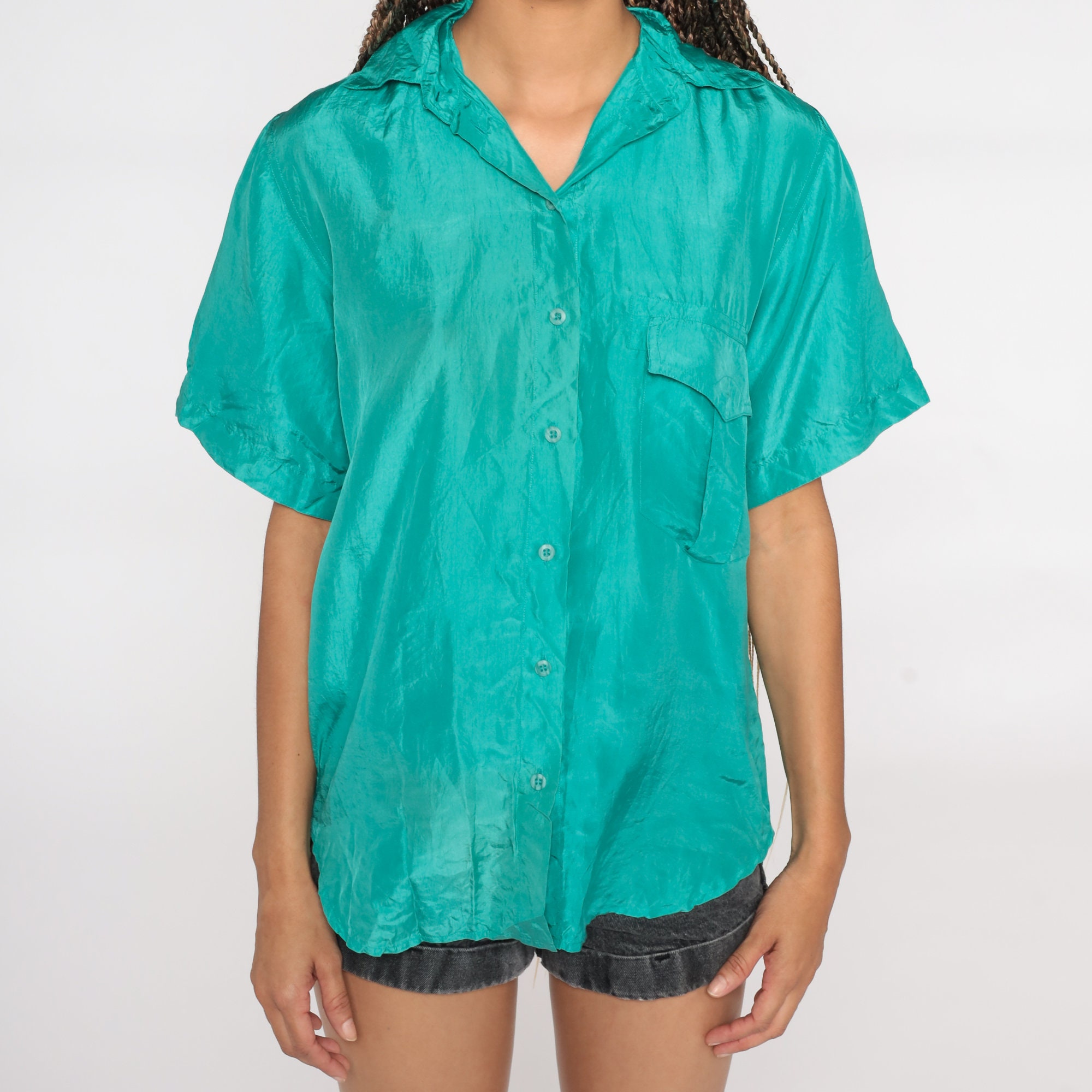 Vintage 90s shirt in turquoise silk and buttons up the front.