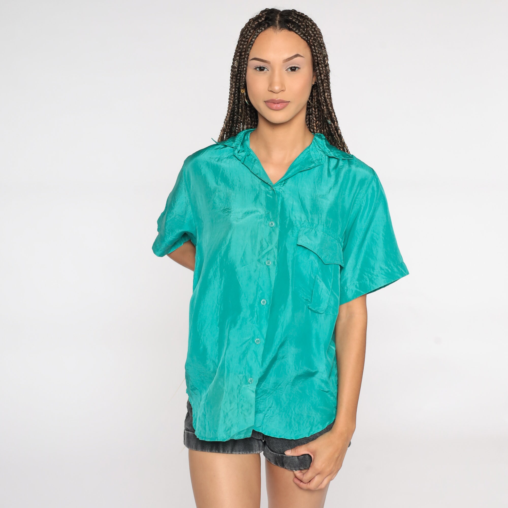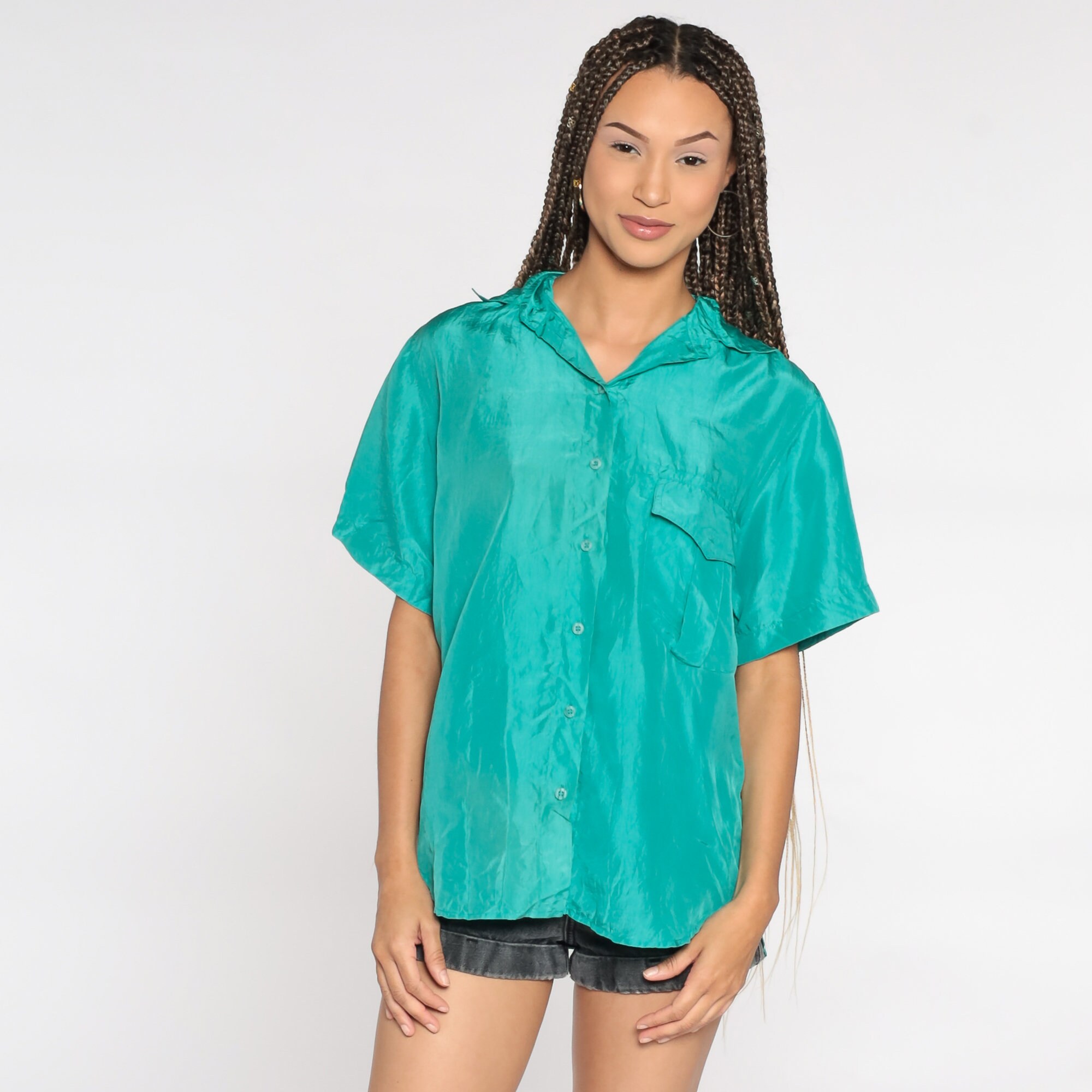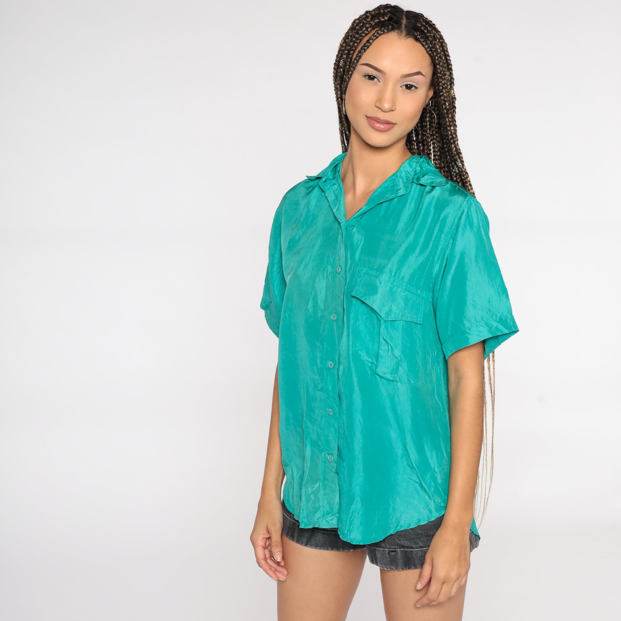 Vintage 90s shirt in turquoise silk and buttons up the front.