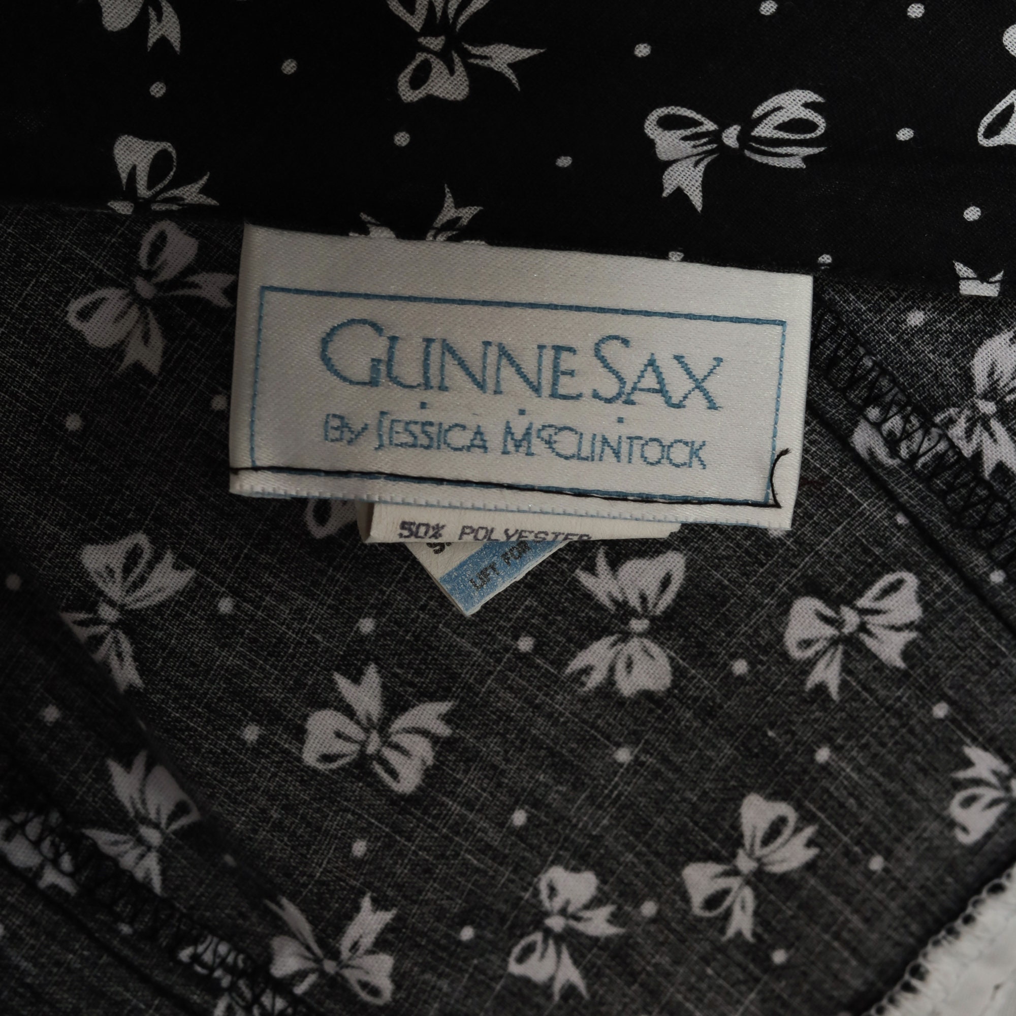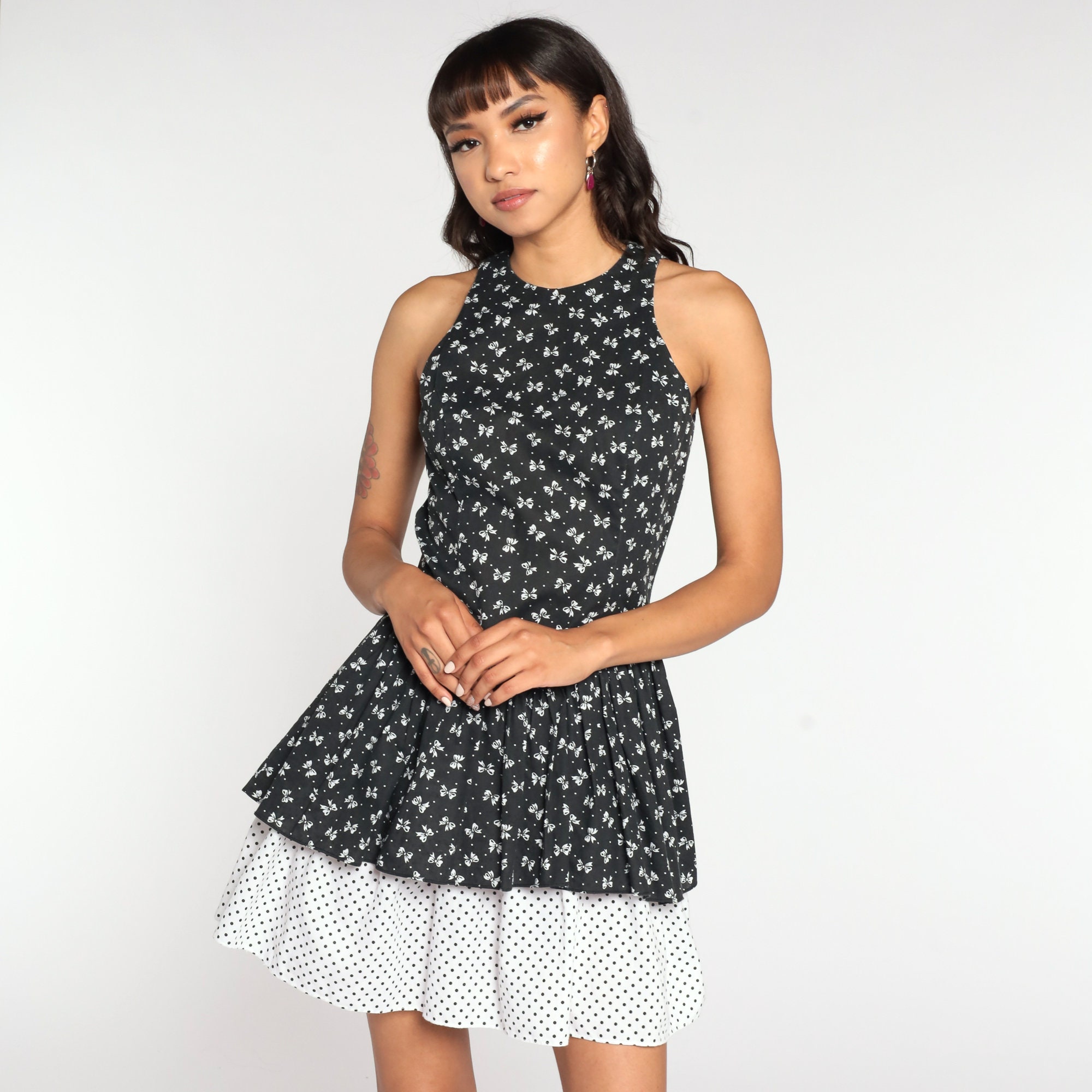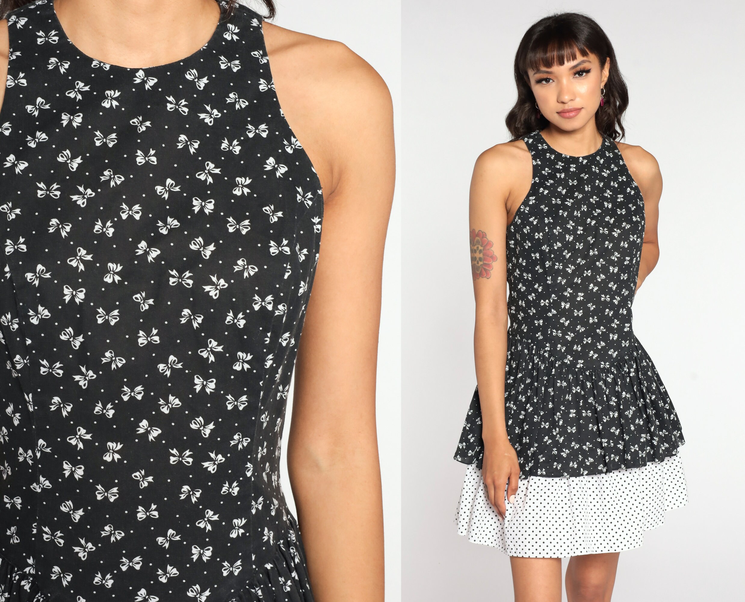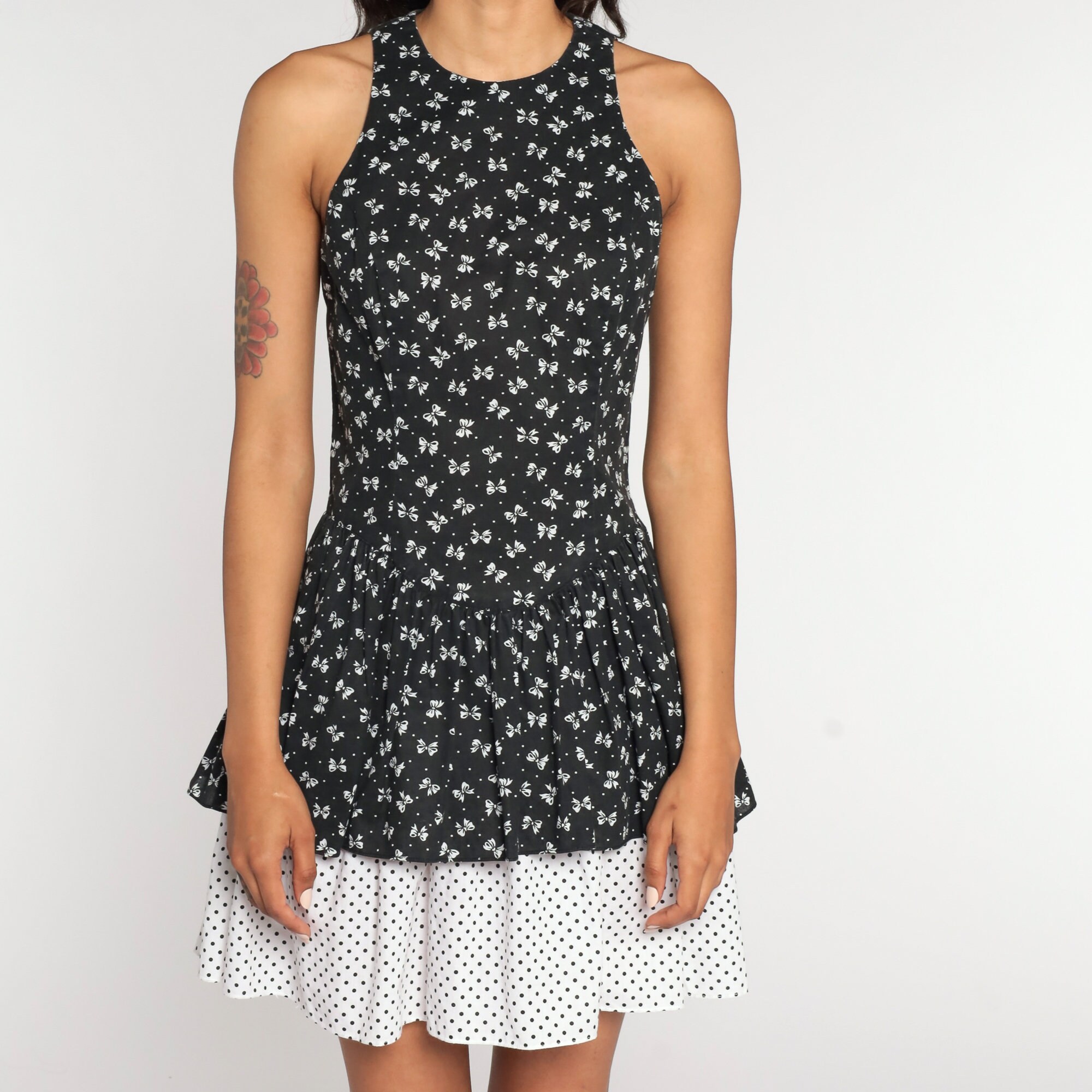 Vintage 80s dress in black and white with a bow print, a drop waist and a tiered skirt.