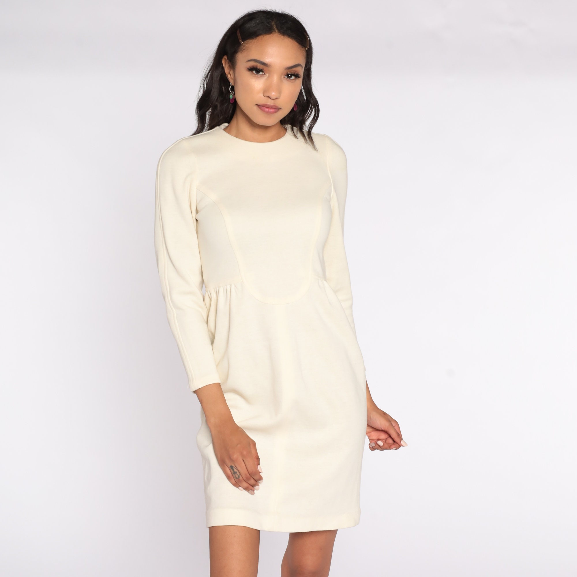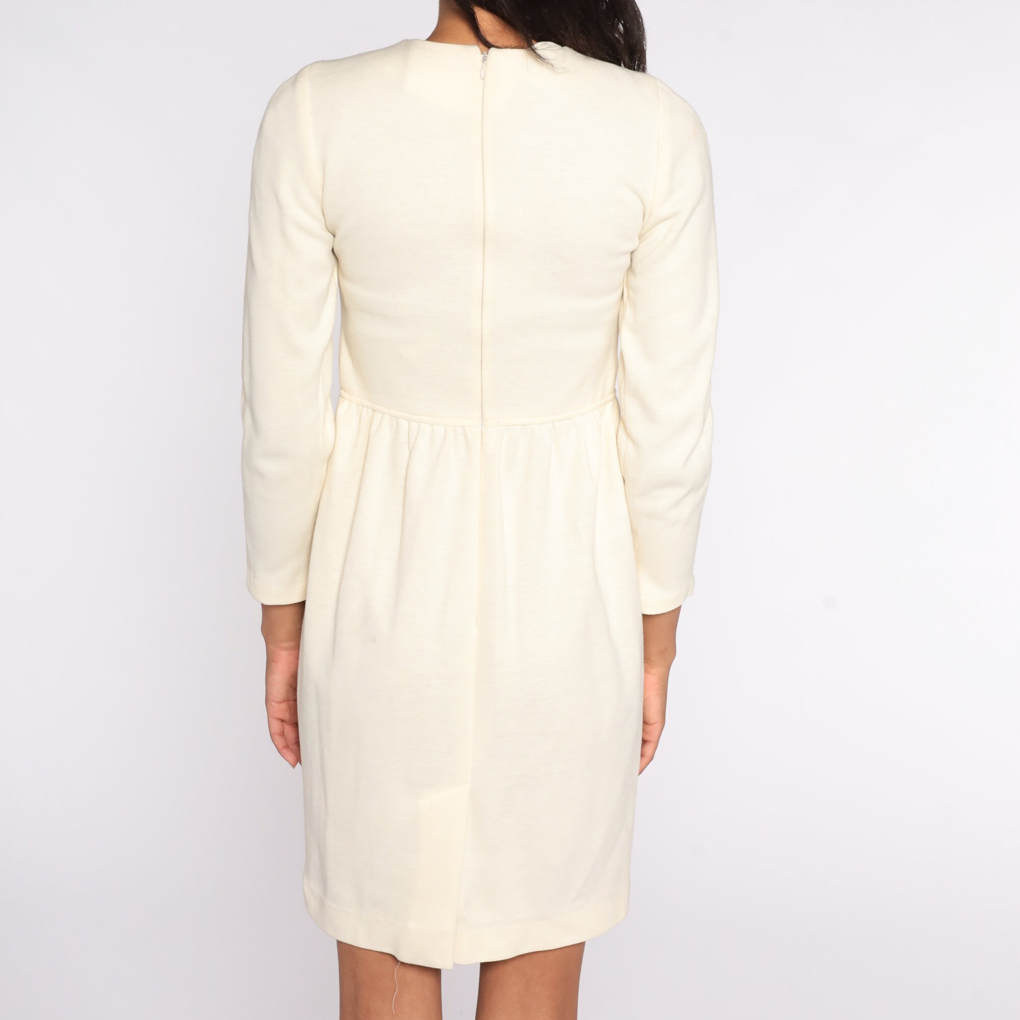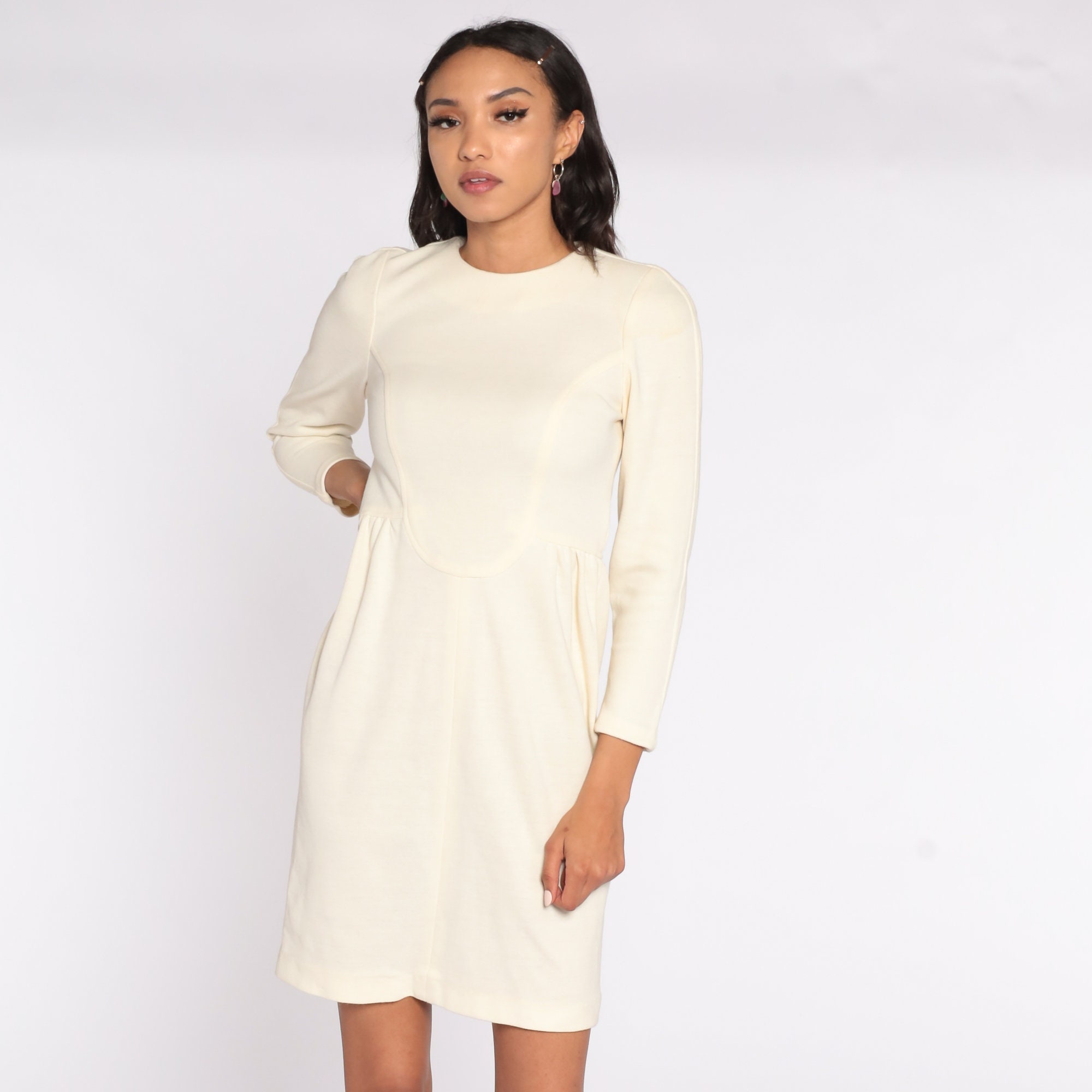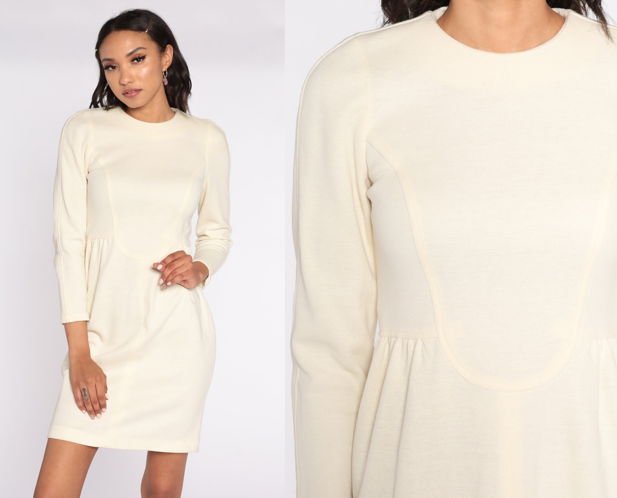 Vintage 90s dress in cream with a high waist and long sleeves. Mini length.