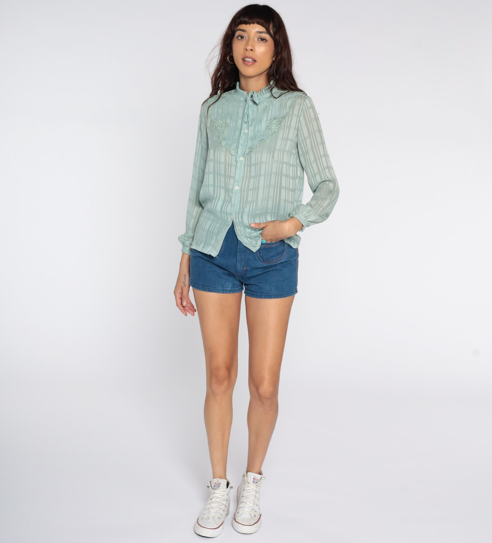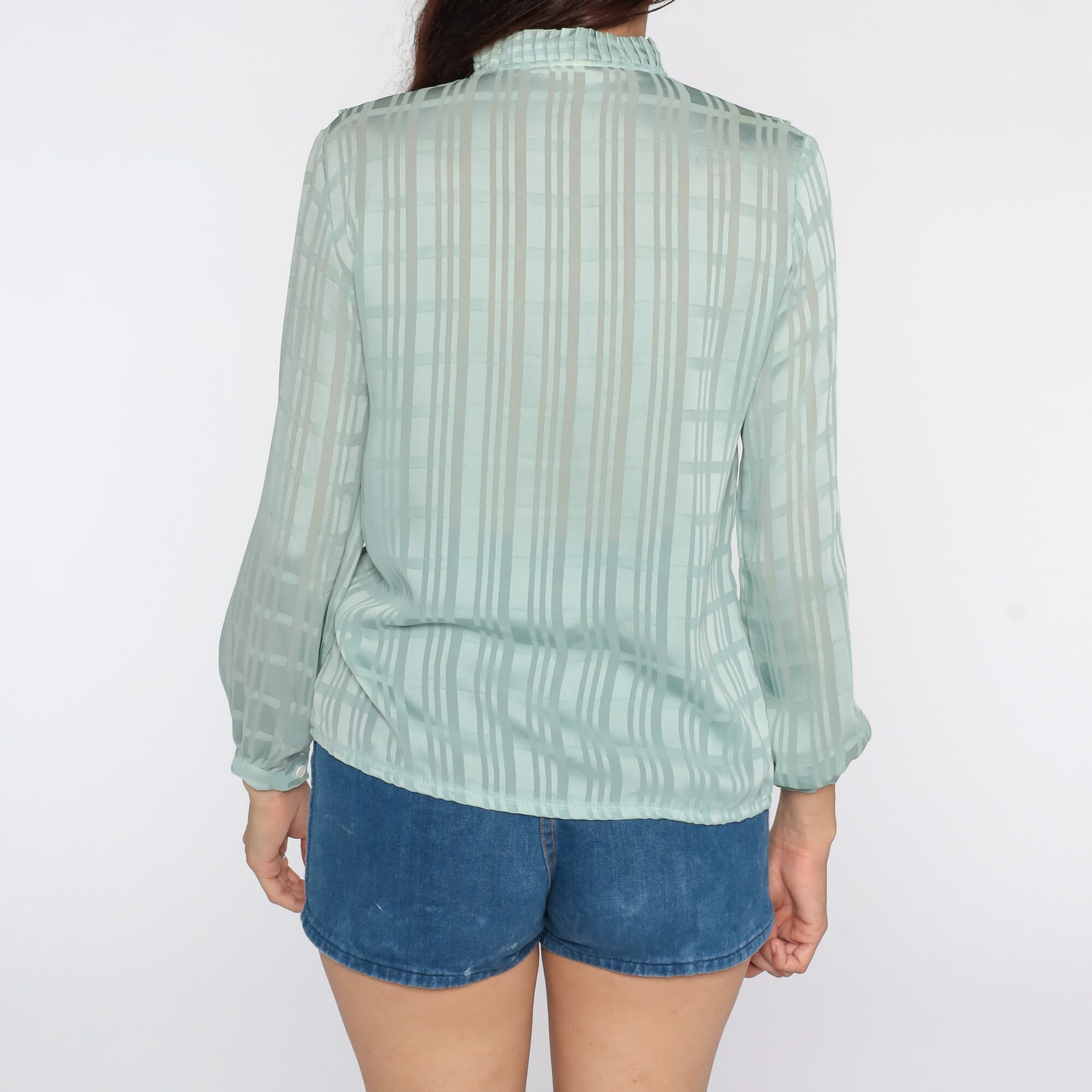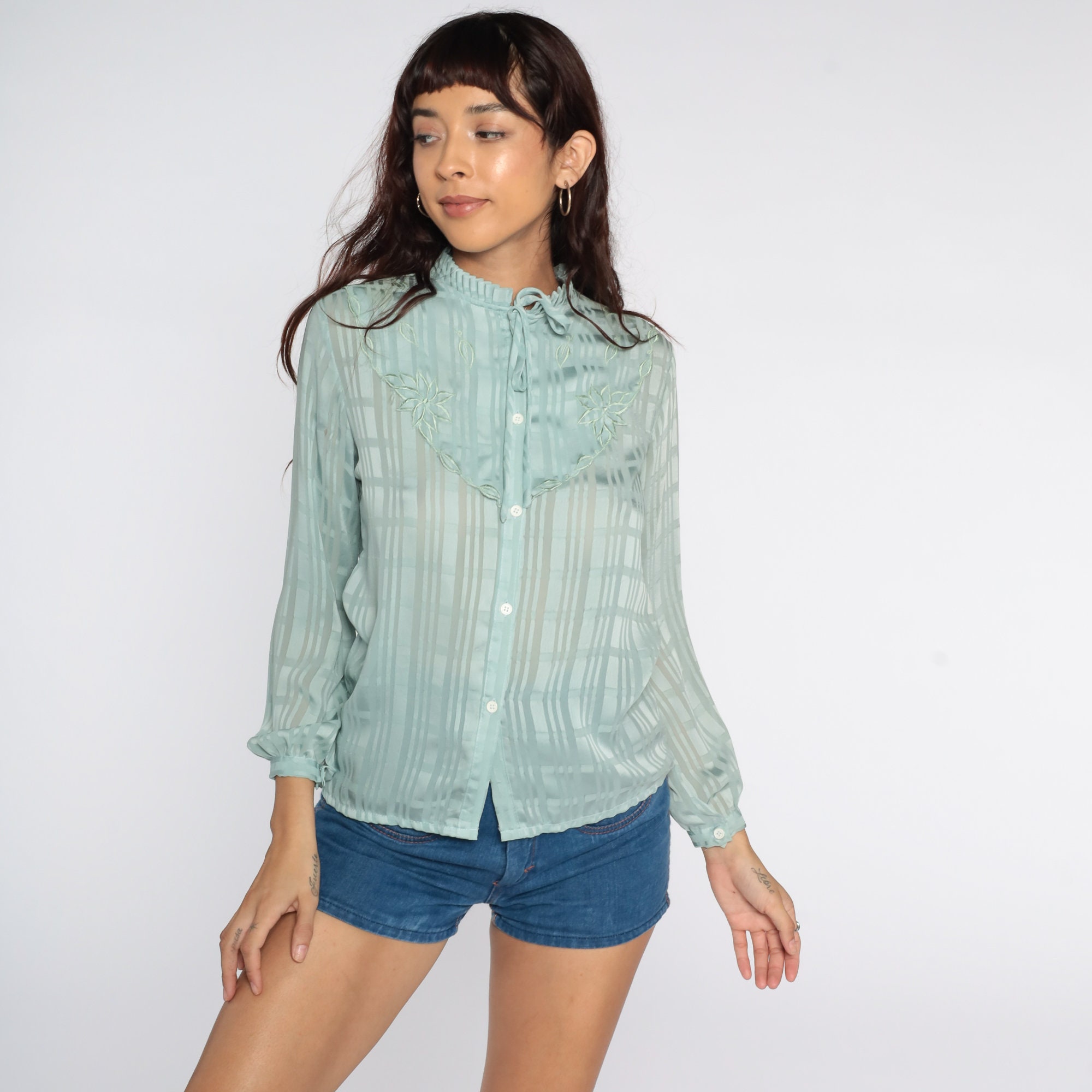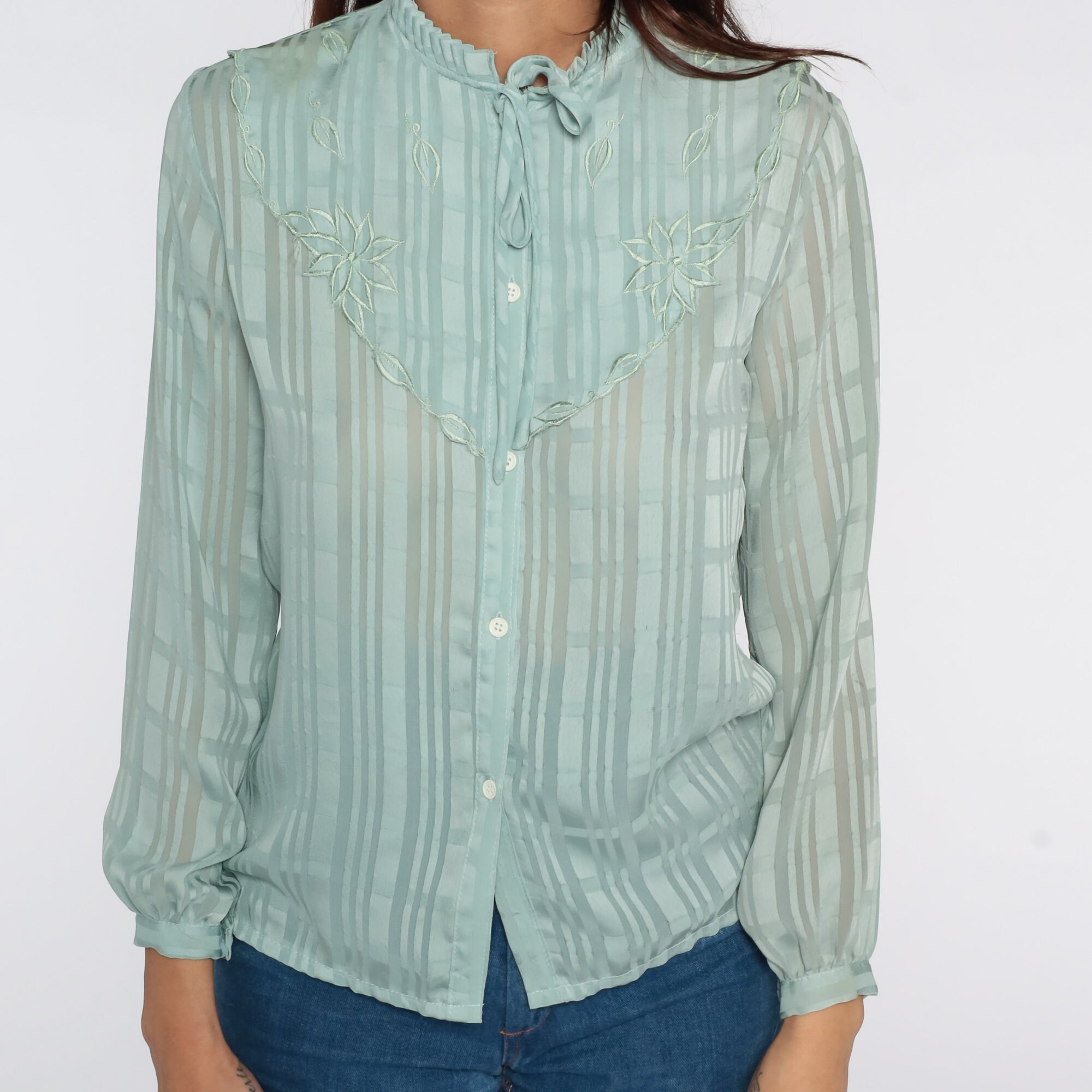 Vintage 80s blouse in semi sheer blue with a striped print, embroidered flowers and an ascot bow at the neck. Buttons up the front.