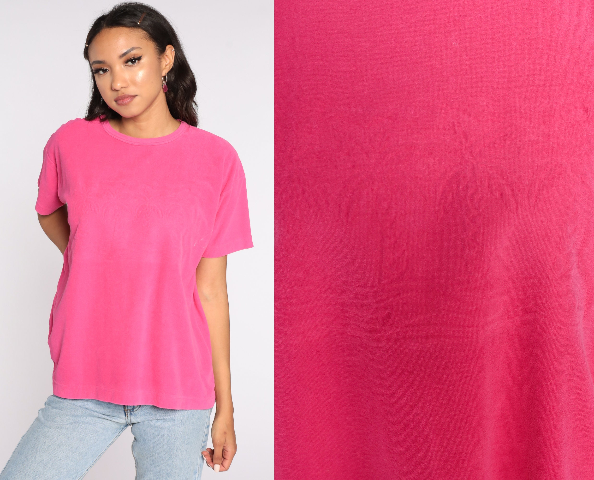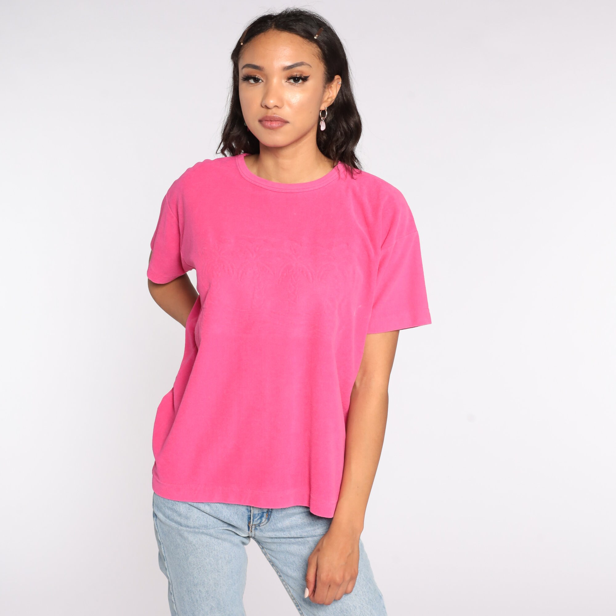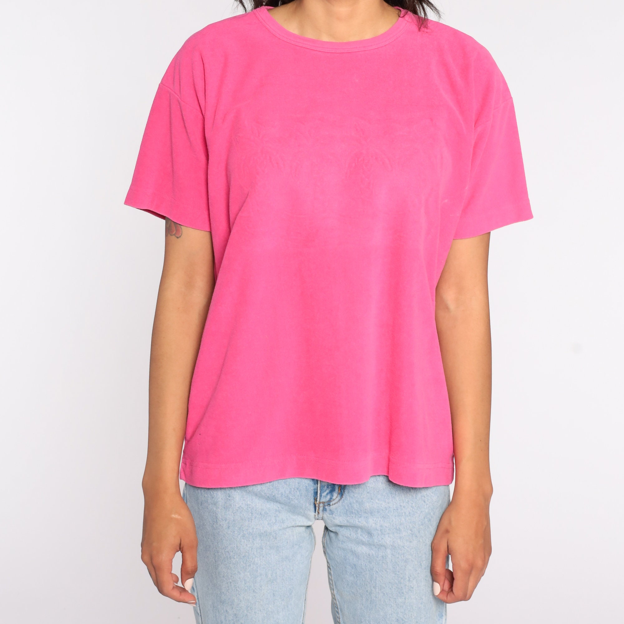Vintage 90s shirt in pink terry cloth with a subtle palm tree design on the chest.