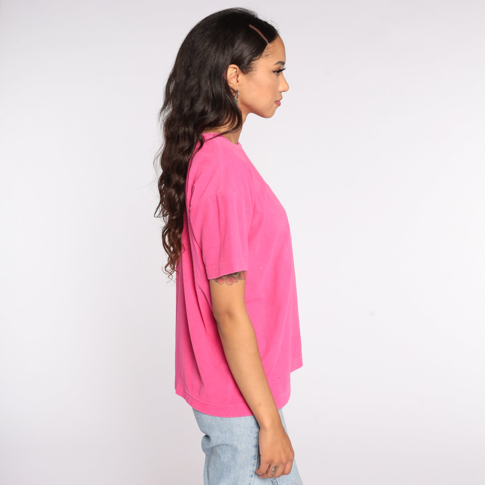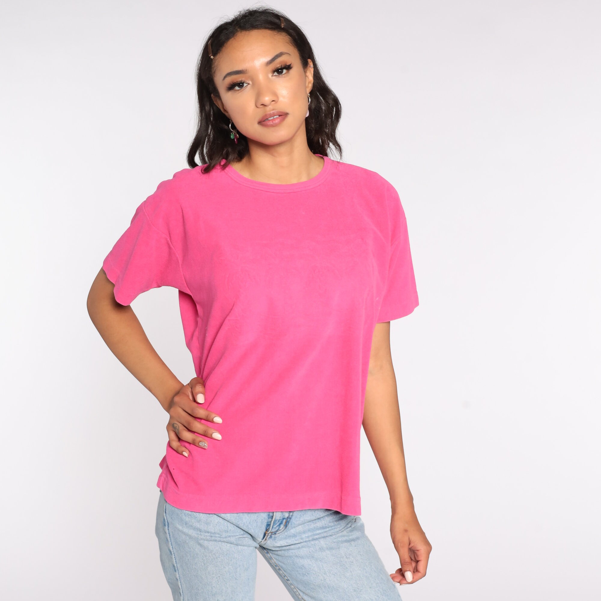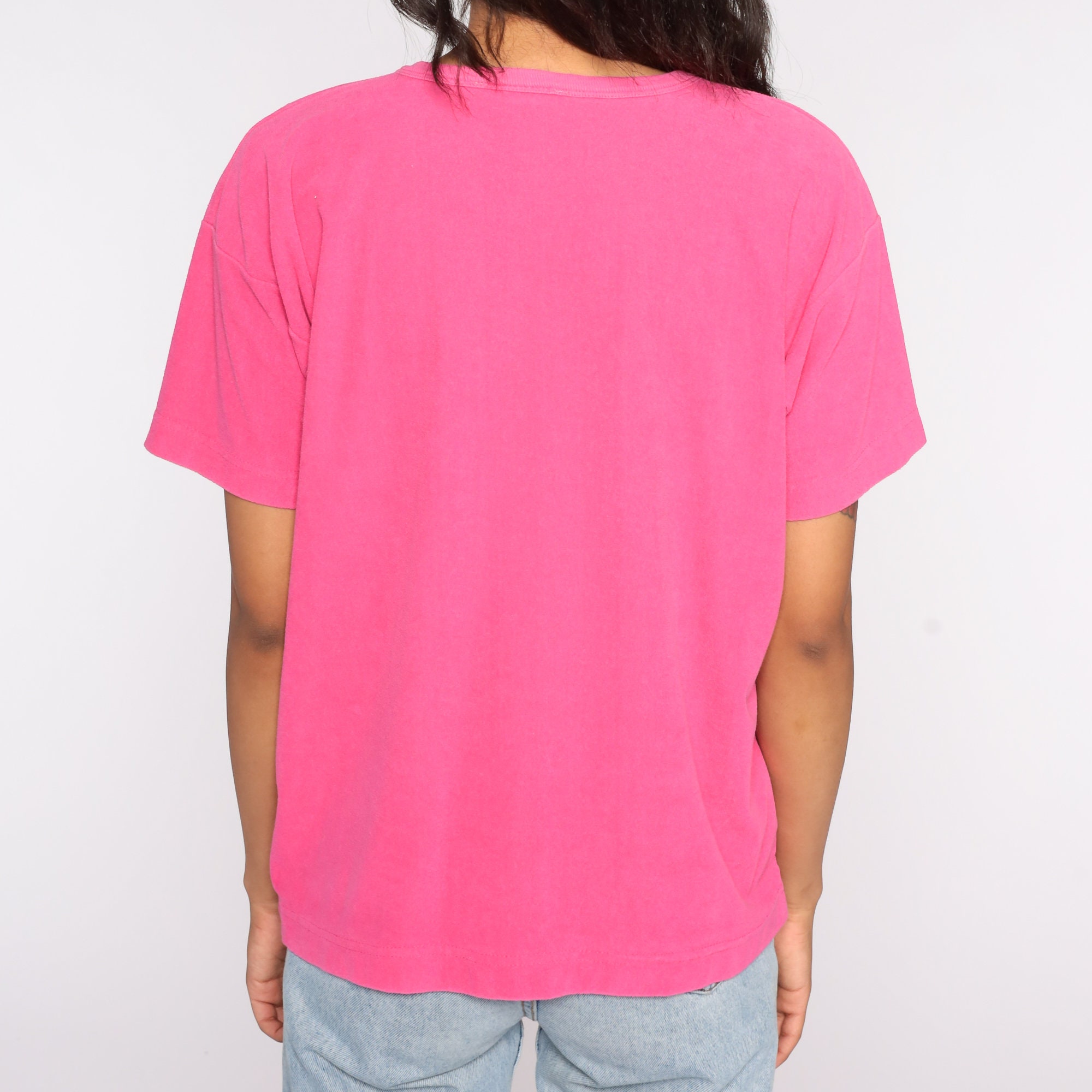 Vintage 90s shirt in pink terry cloth with a subtle palm tree design on the chest.