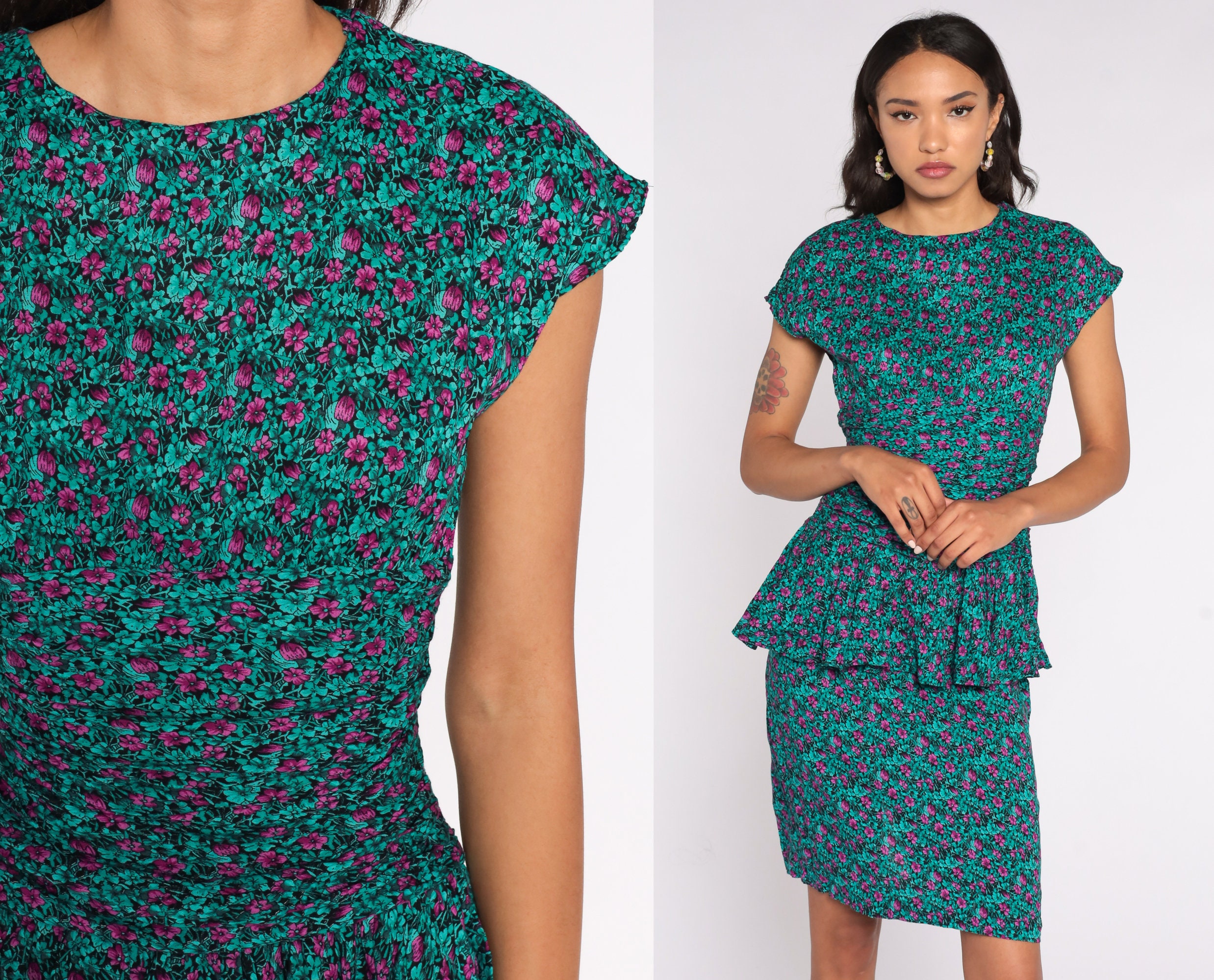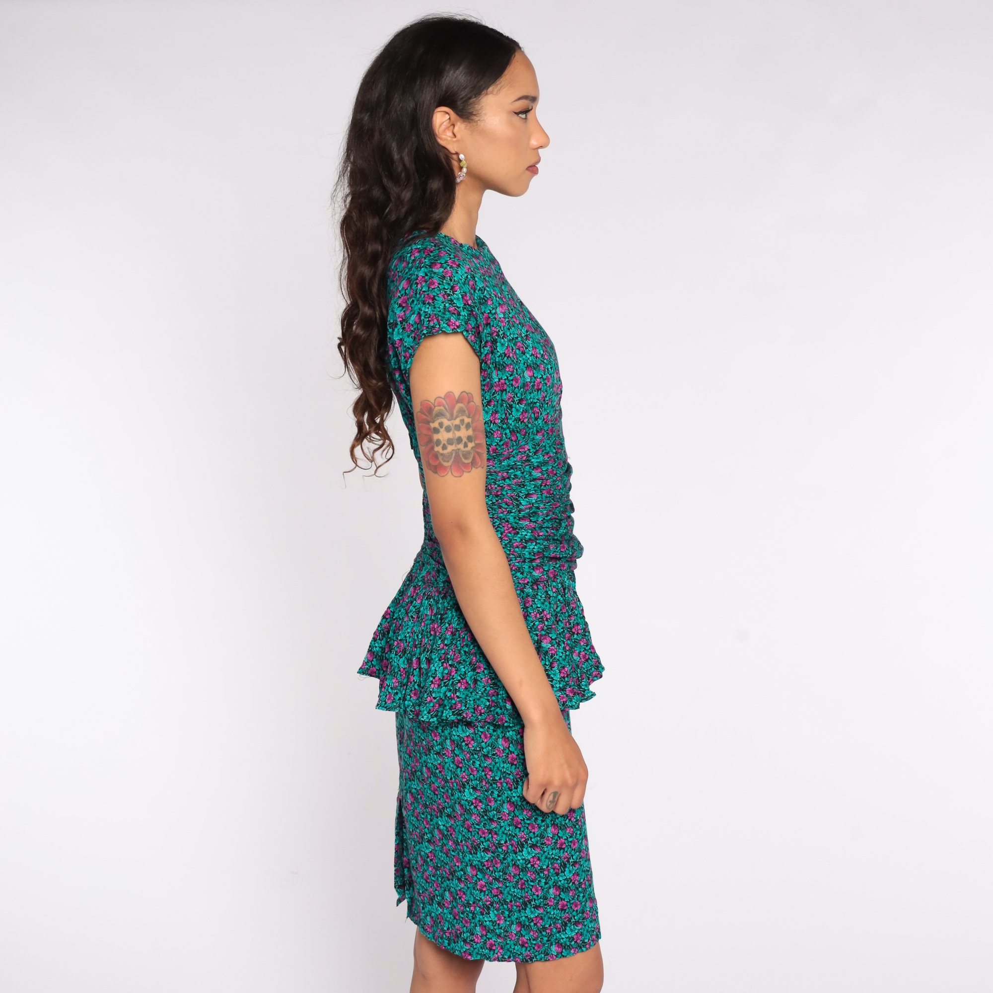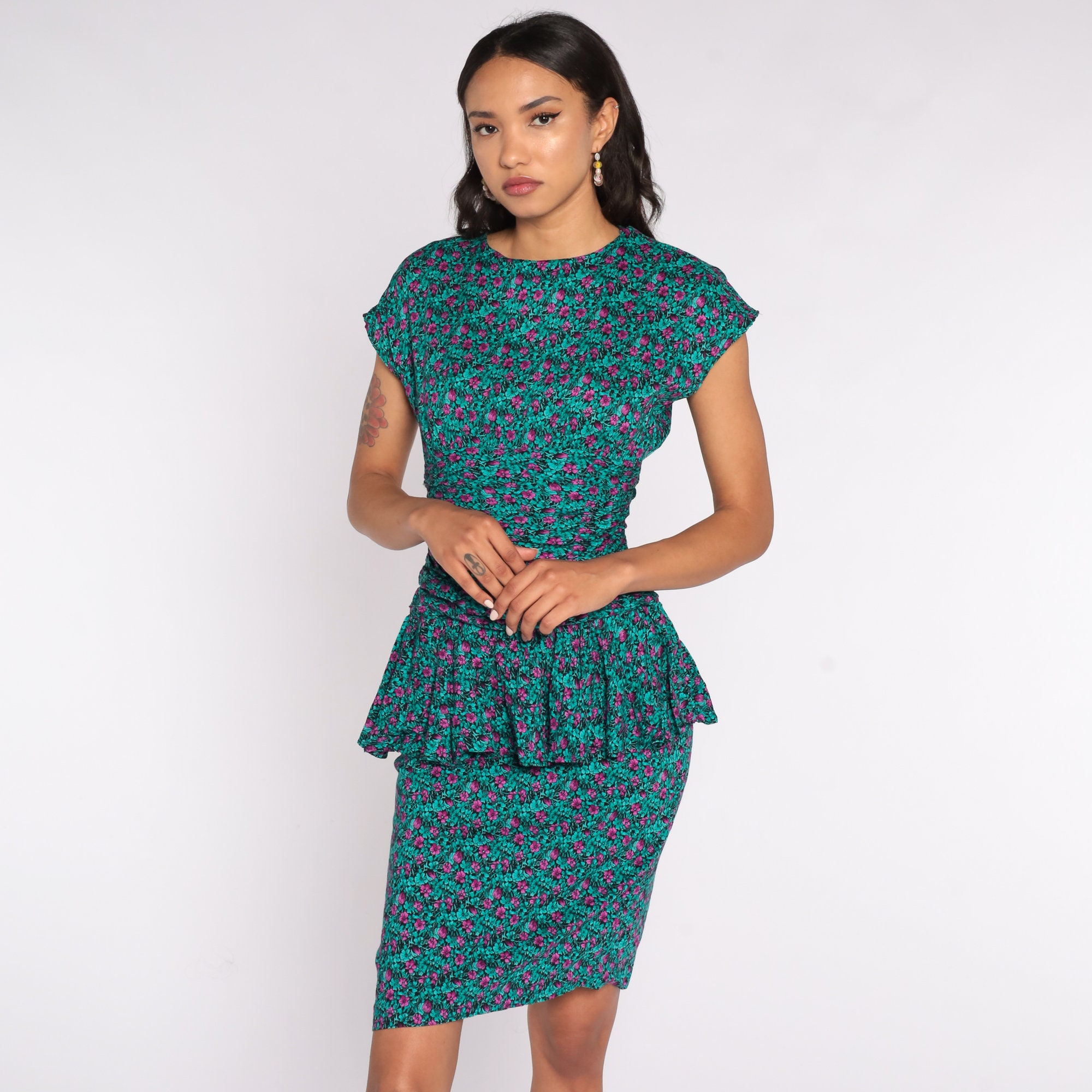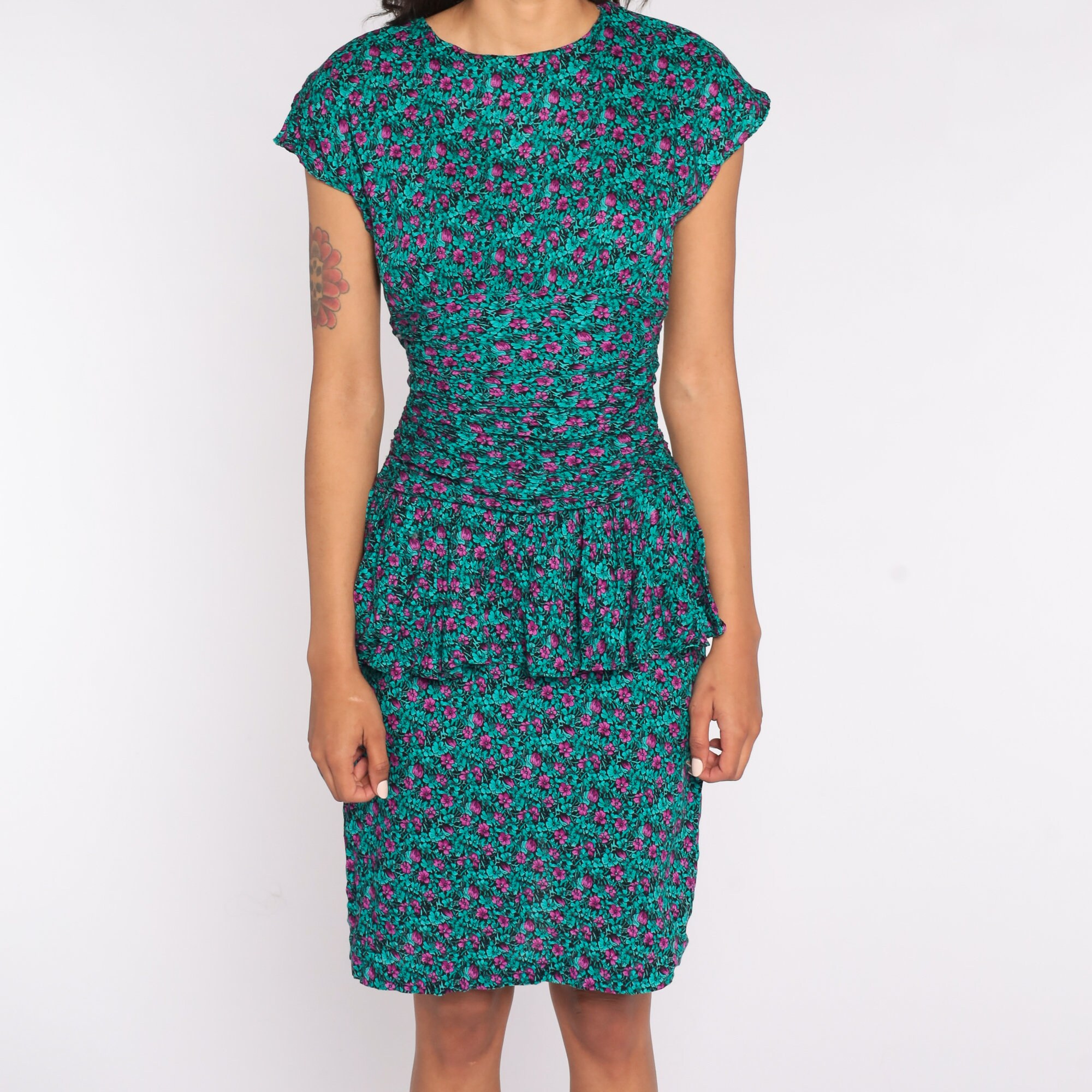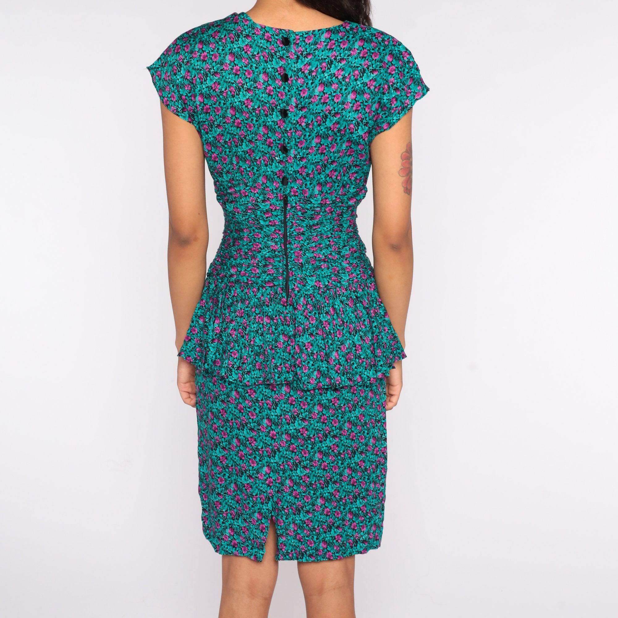 Vintage 80s dress in a turquoise floral print with cap sleeves and a wiggle peplum skirt.