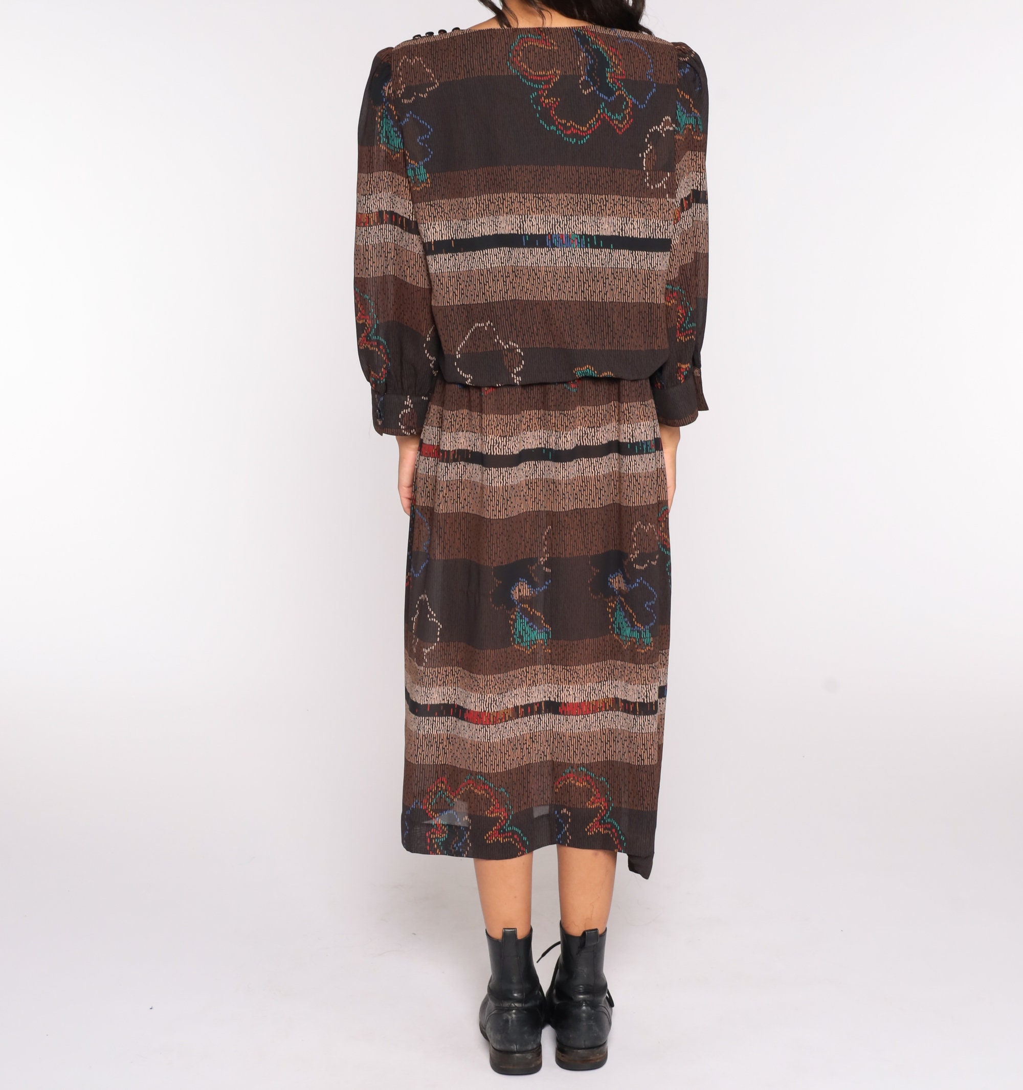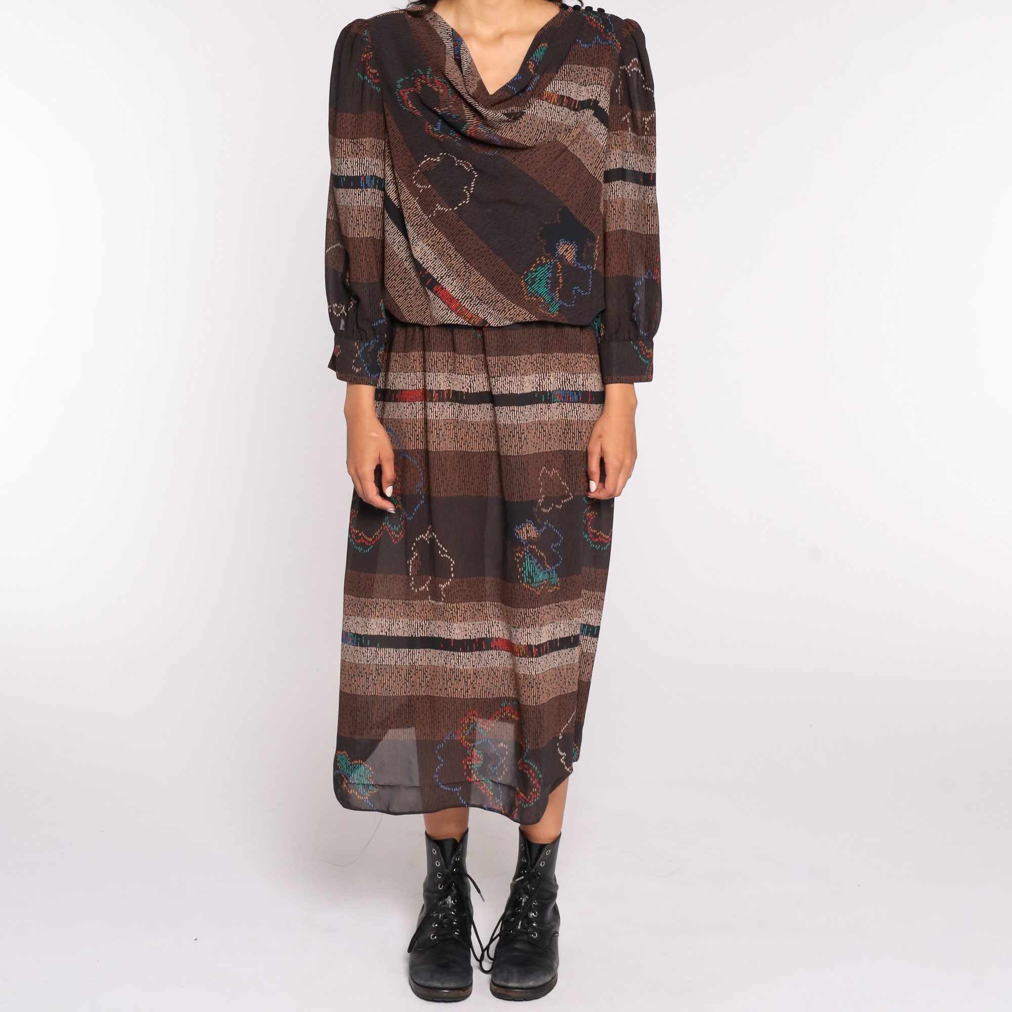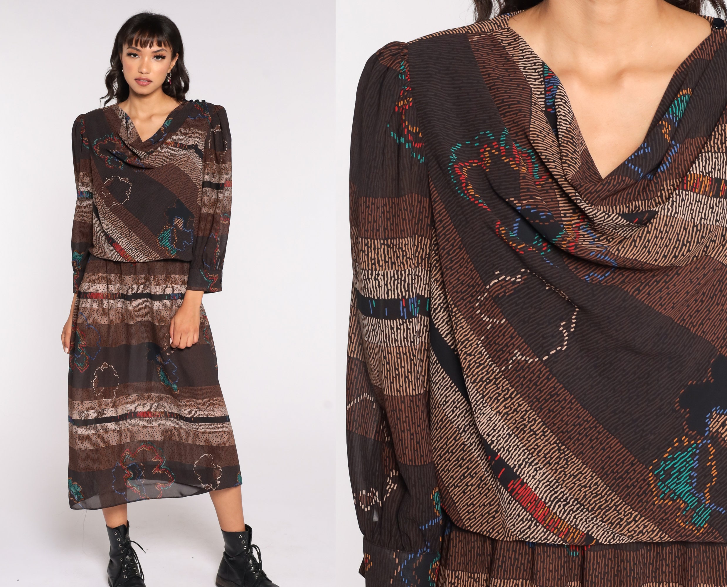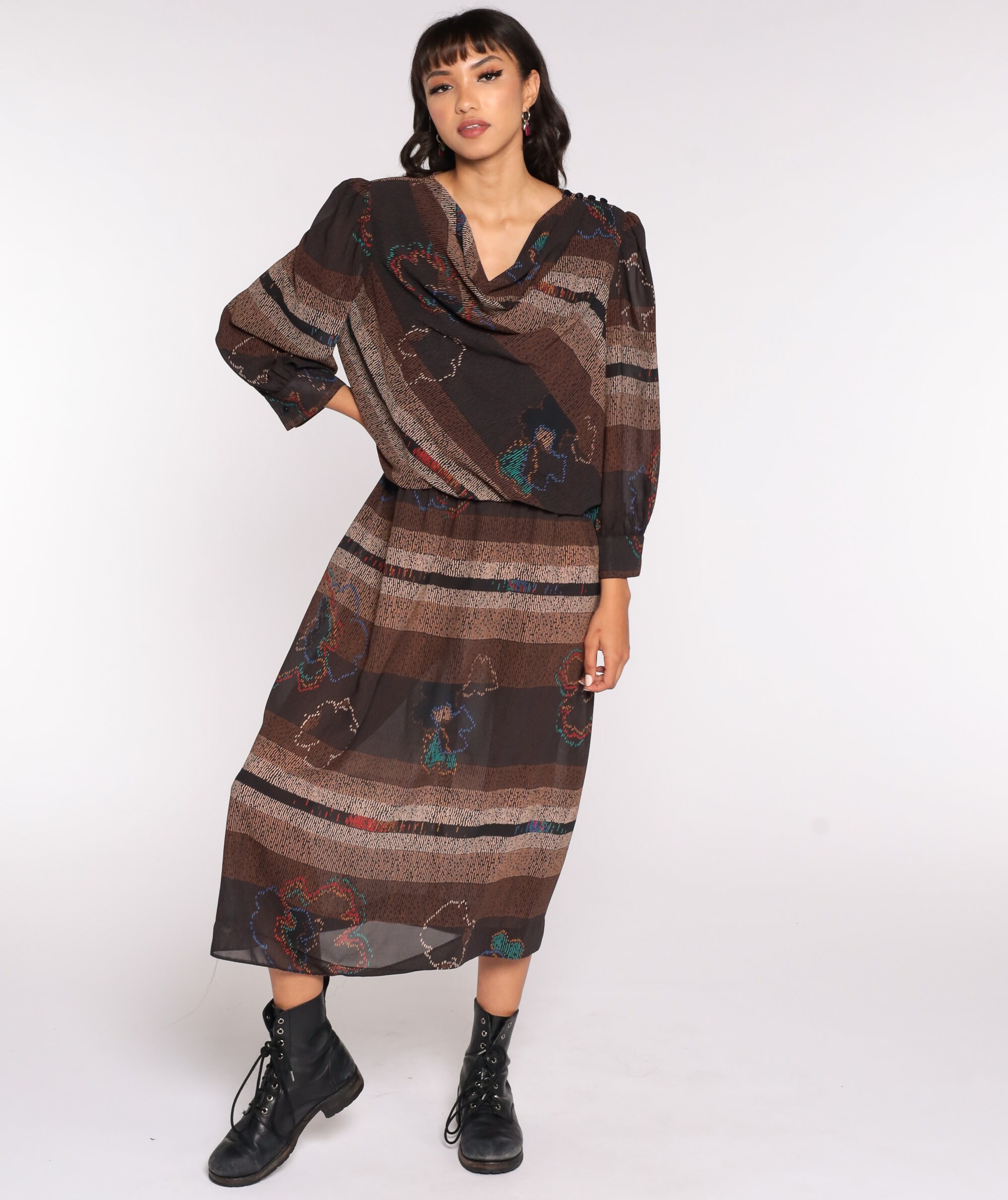 Vintage 80s dress with brown stripes, a cowl neck and puff sleeves.