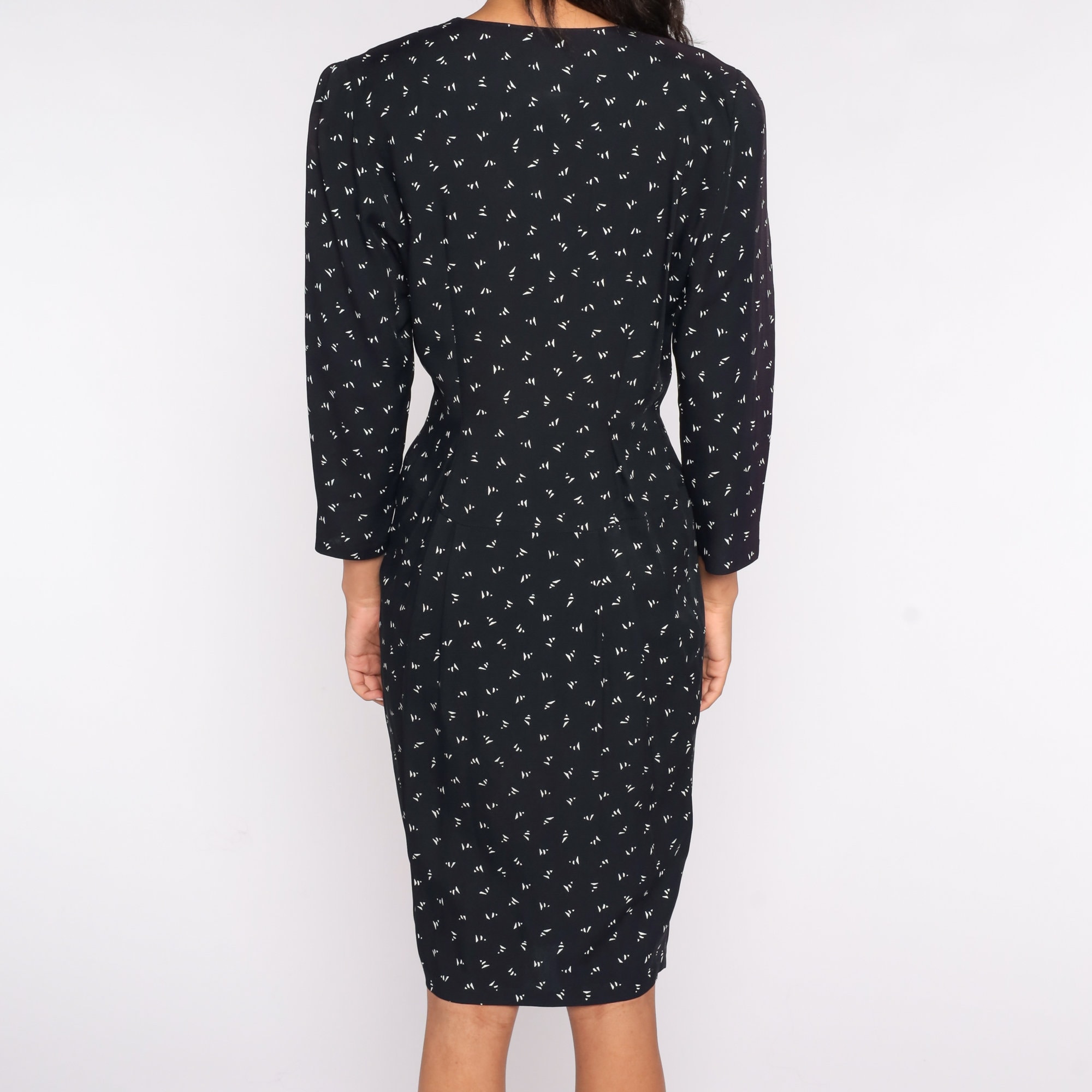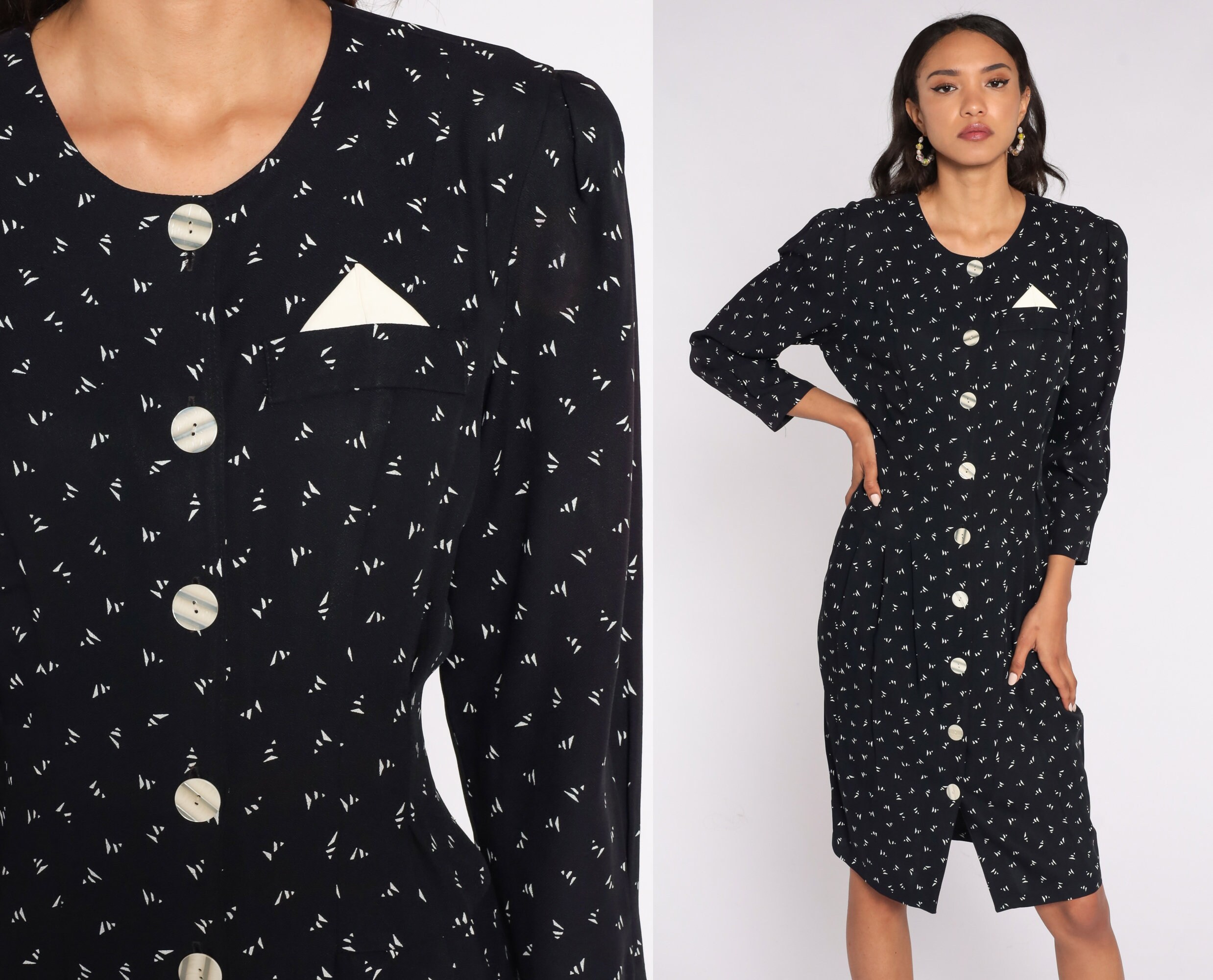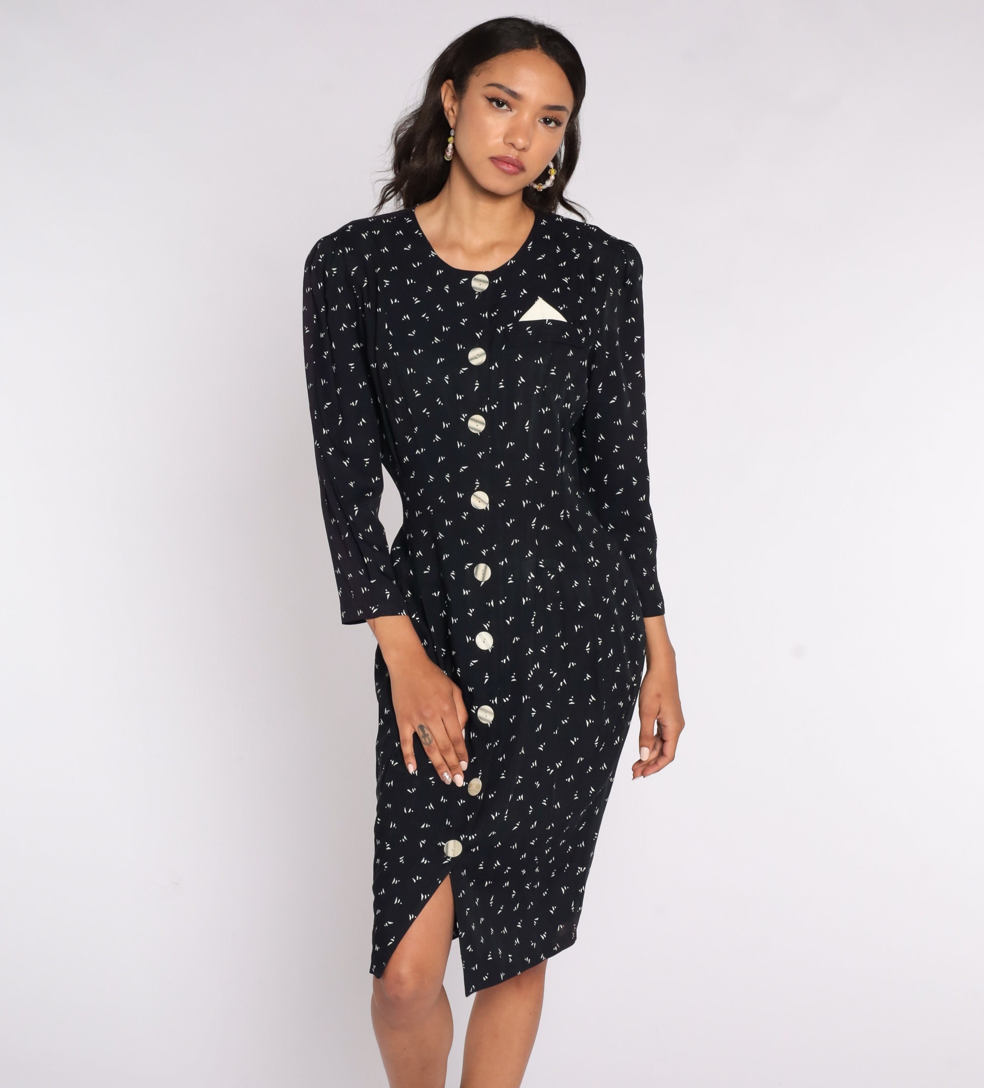 Vintage 80s dress in black with a confetti print, puff sleeves and buttons up the front.