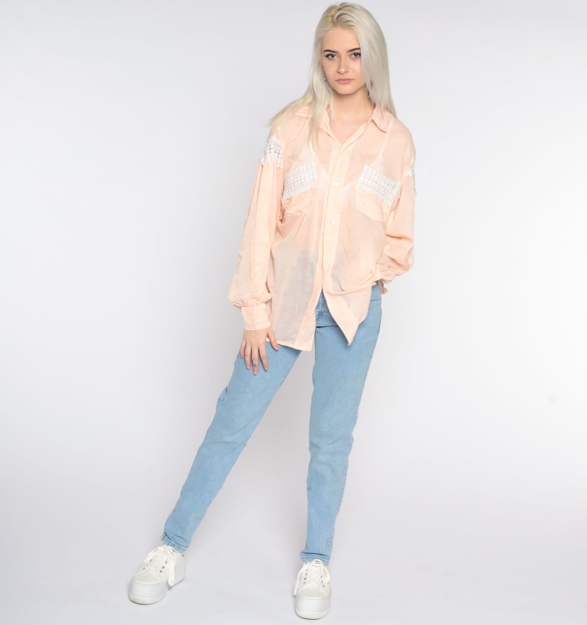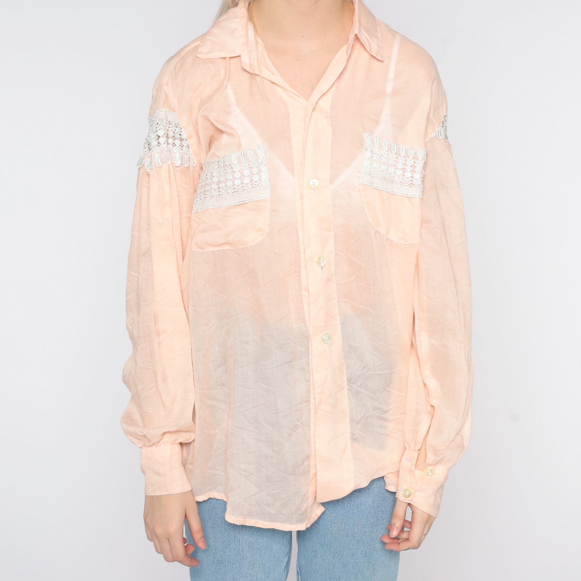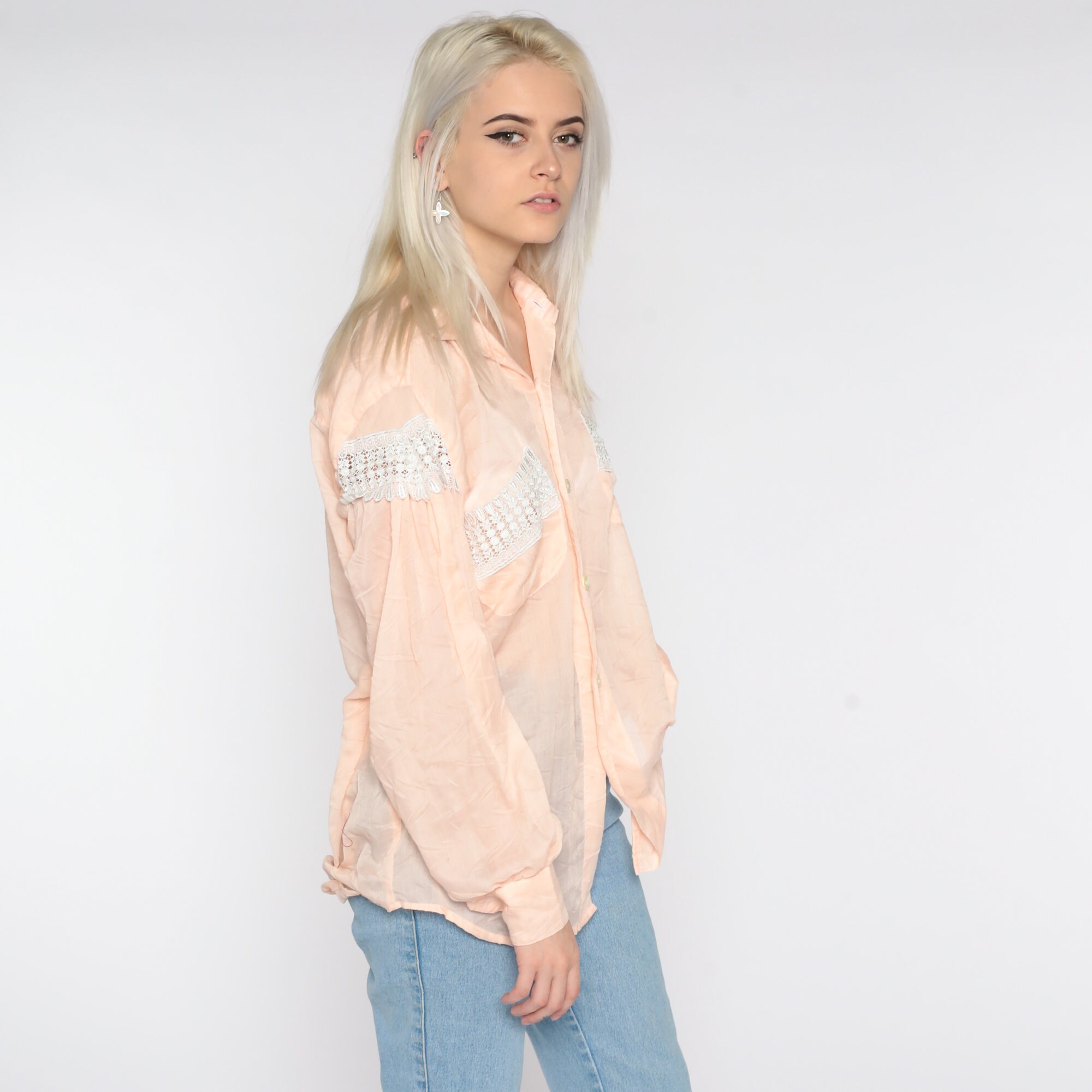 Vintage 90s blouse in sheer peachy pink with crochet lace trim. Buttons up the front with a collar and long sleeves.