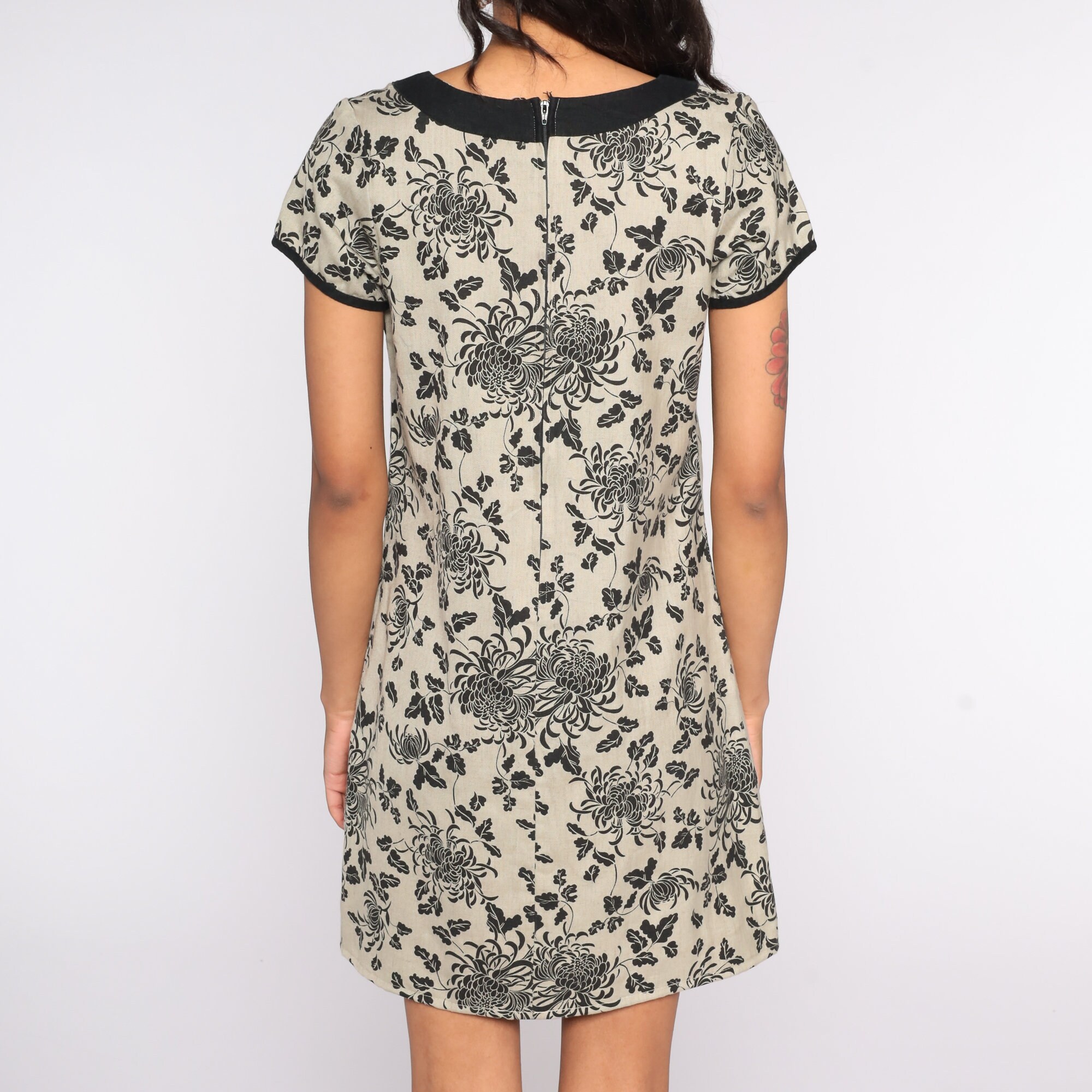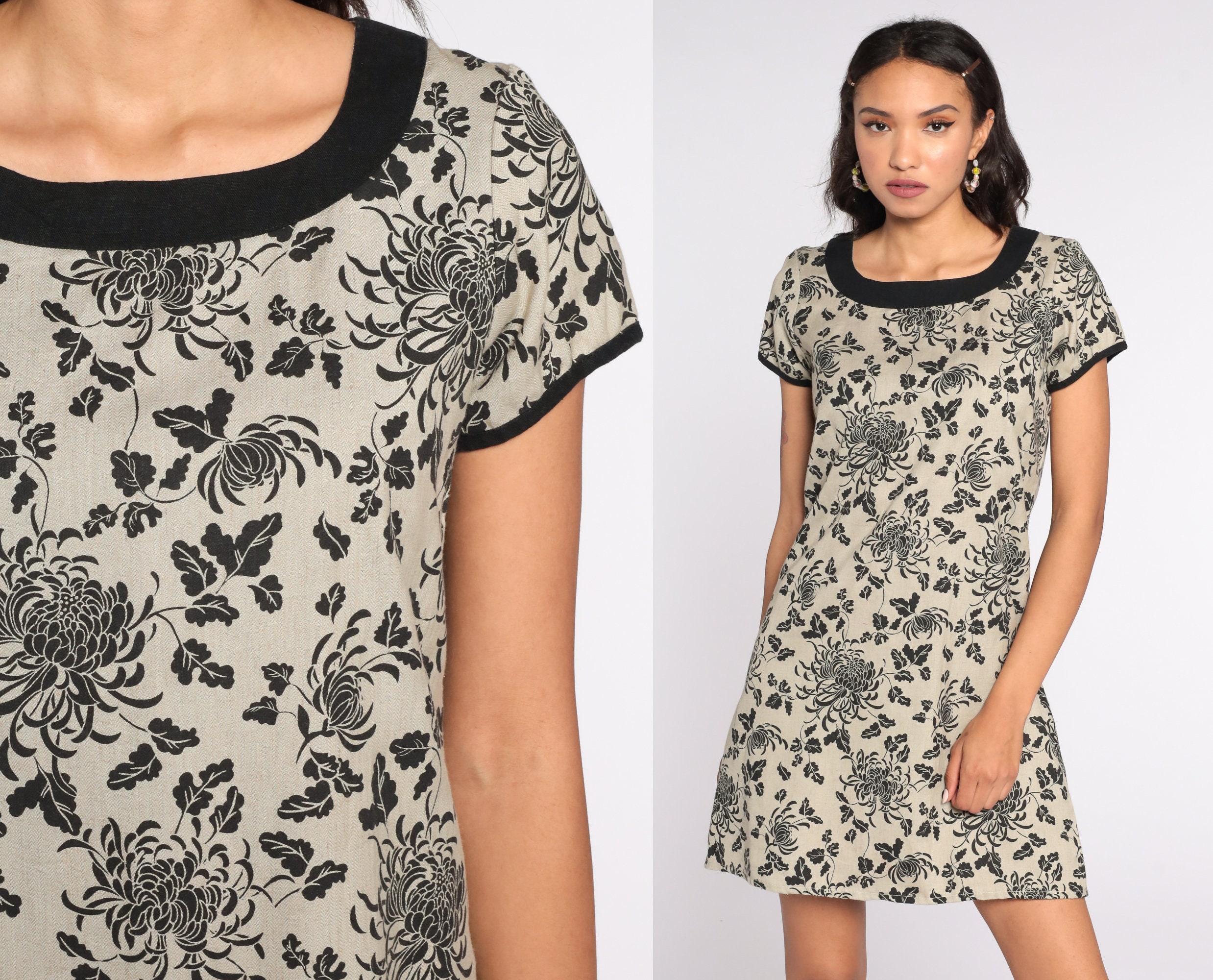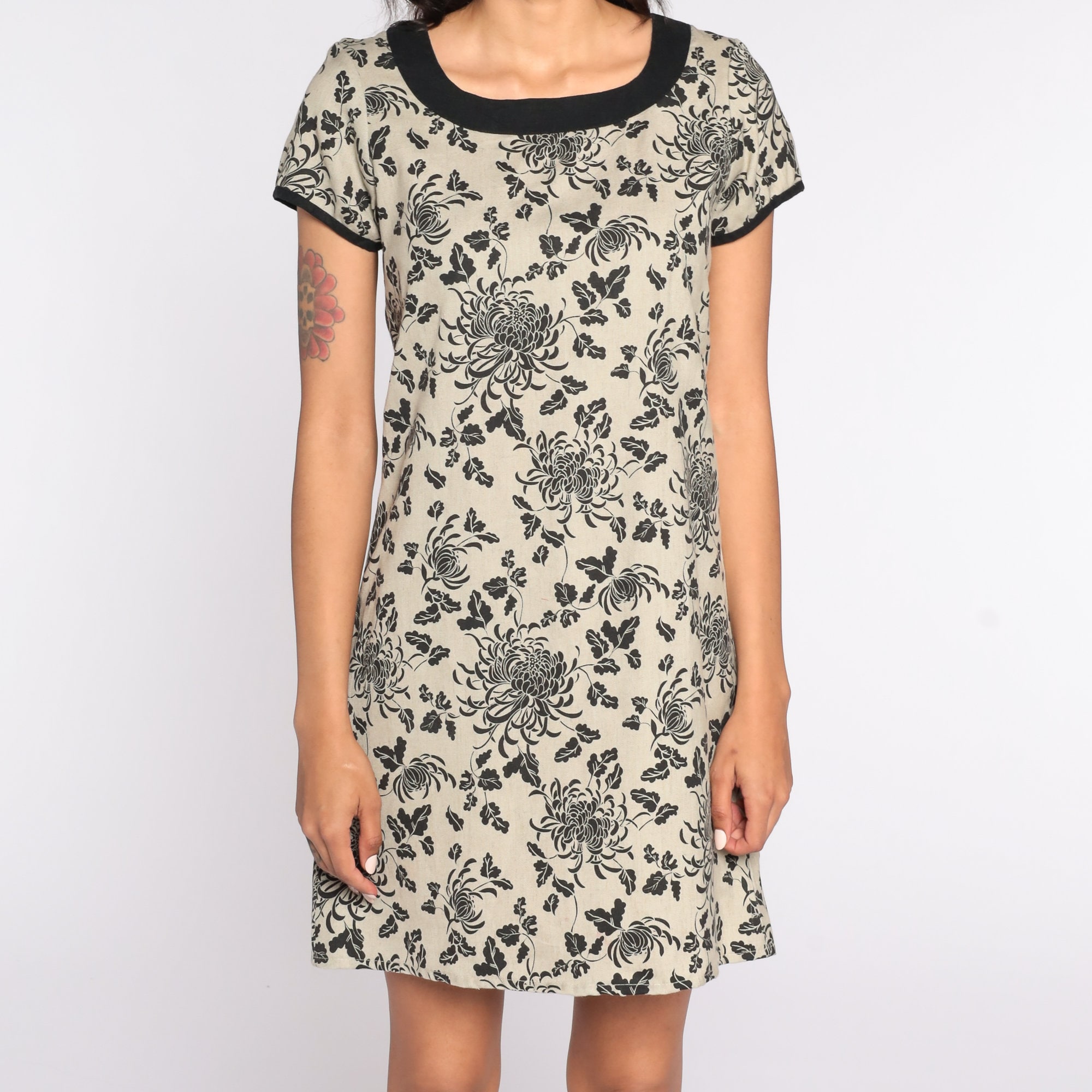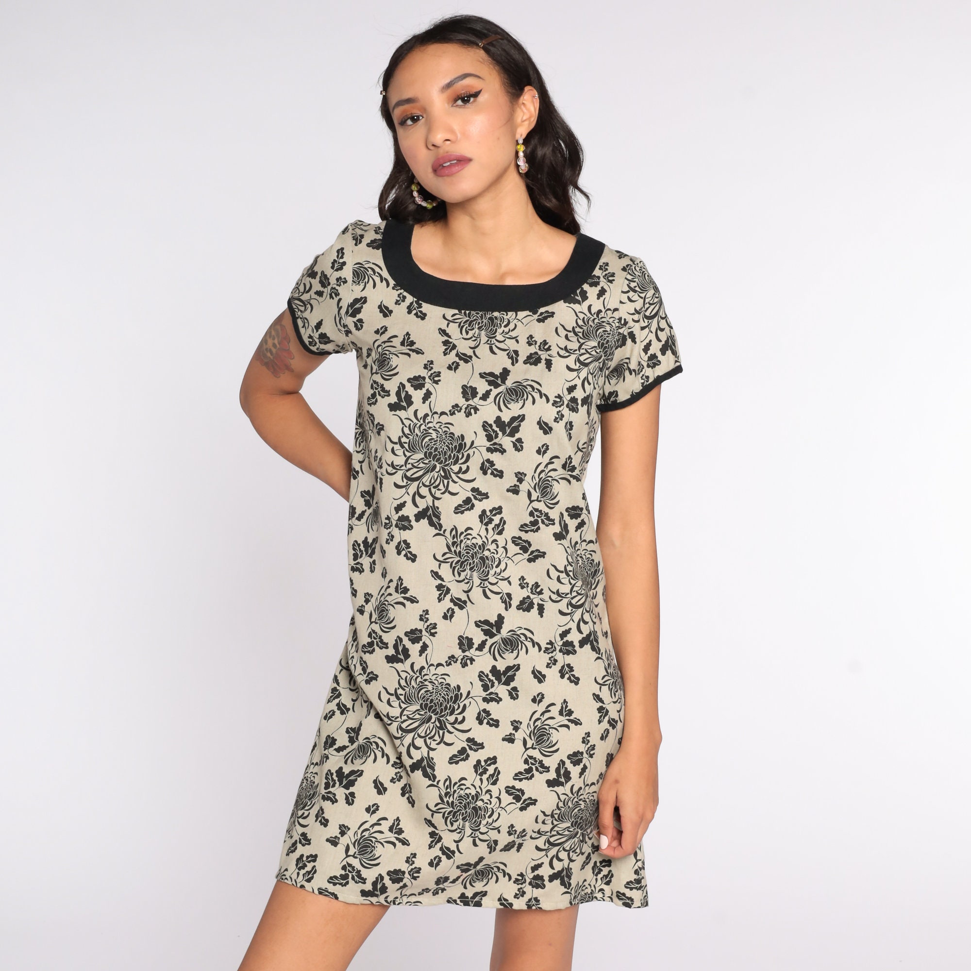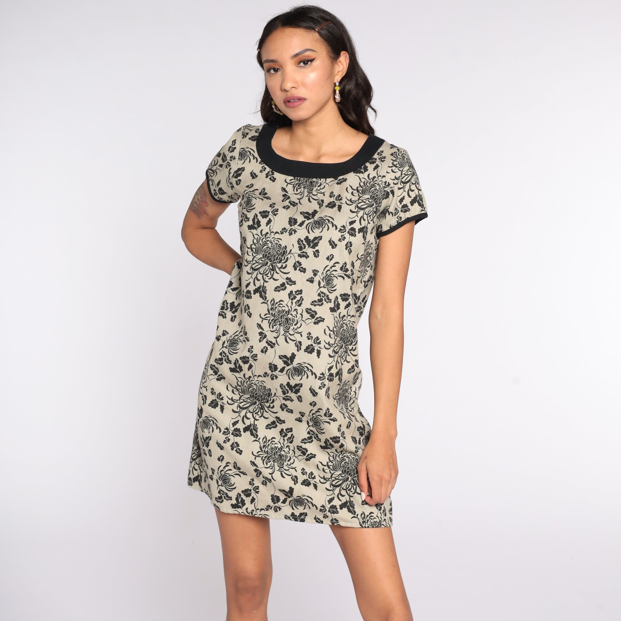 Vintage 90s mini dress in tan with a floral print. Shift cut with short sleeves.