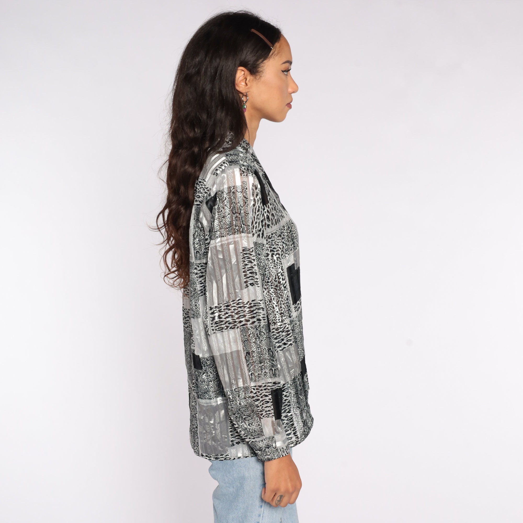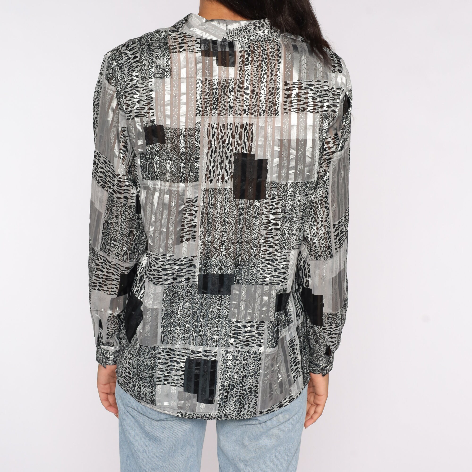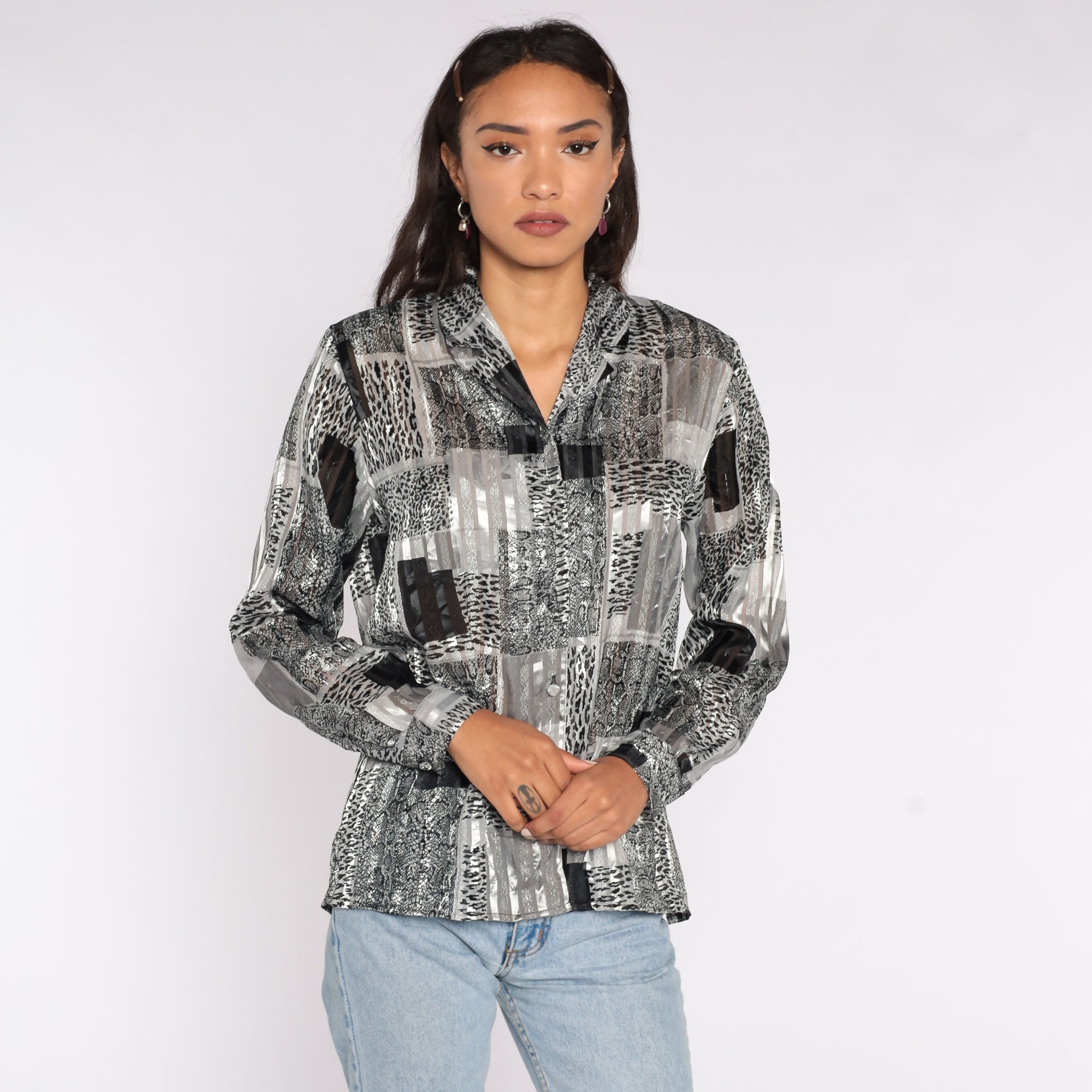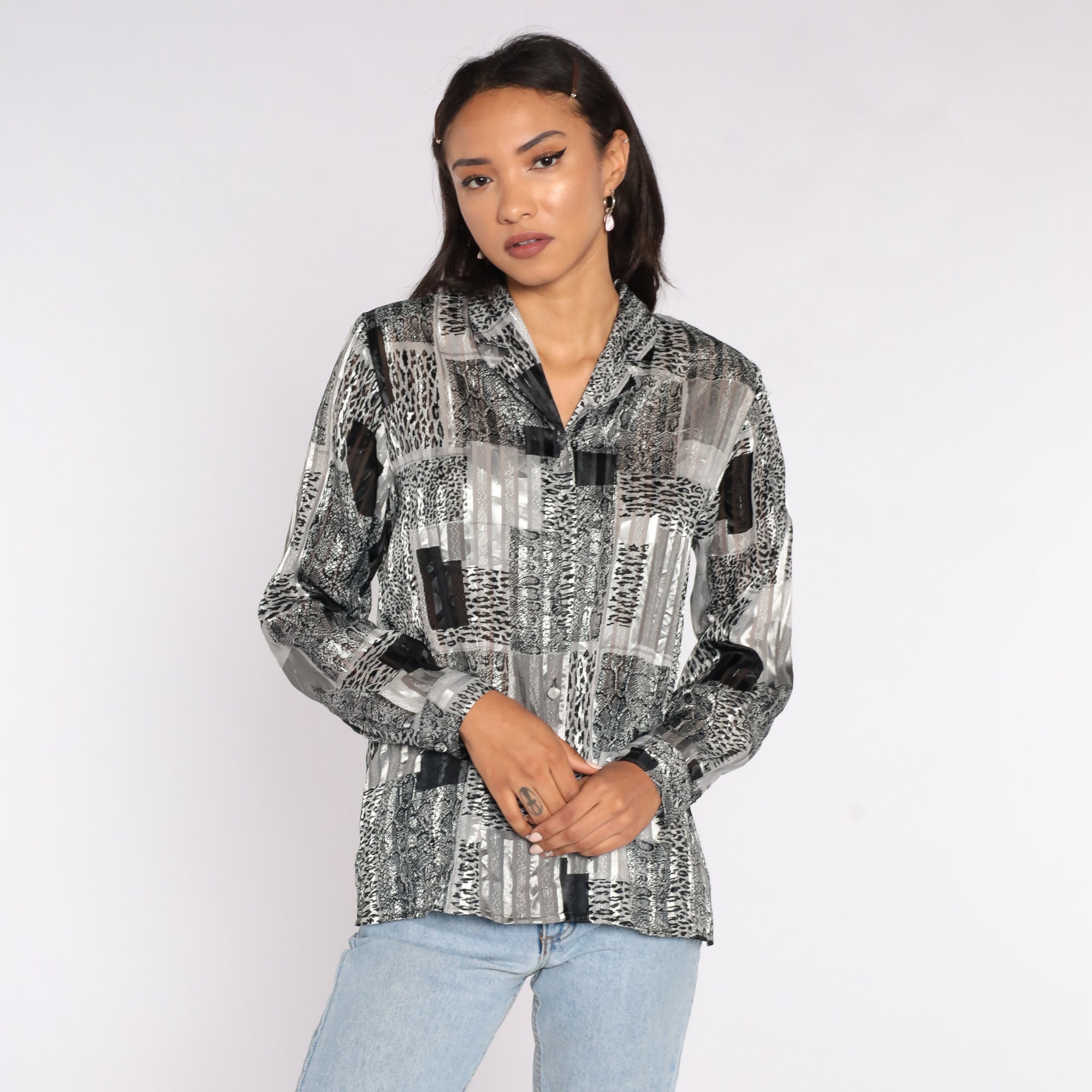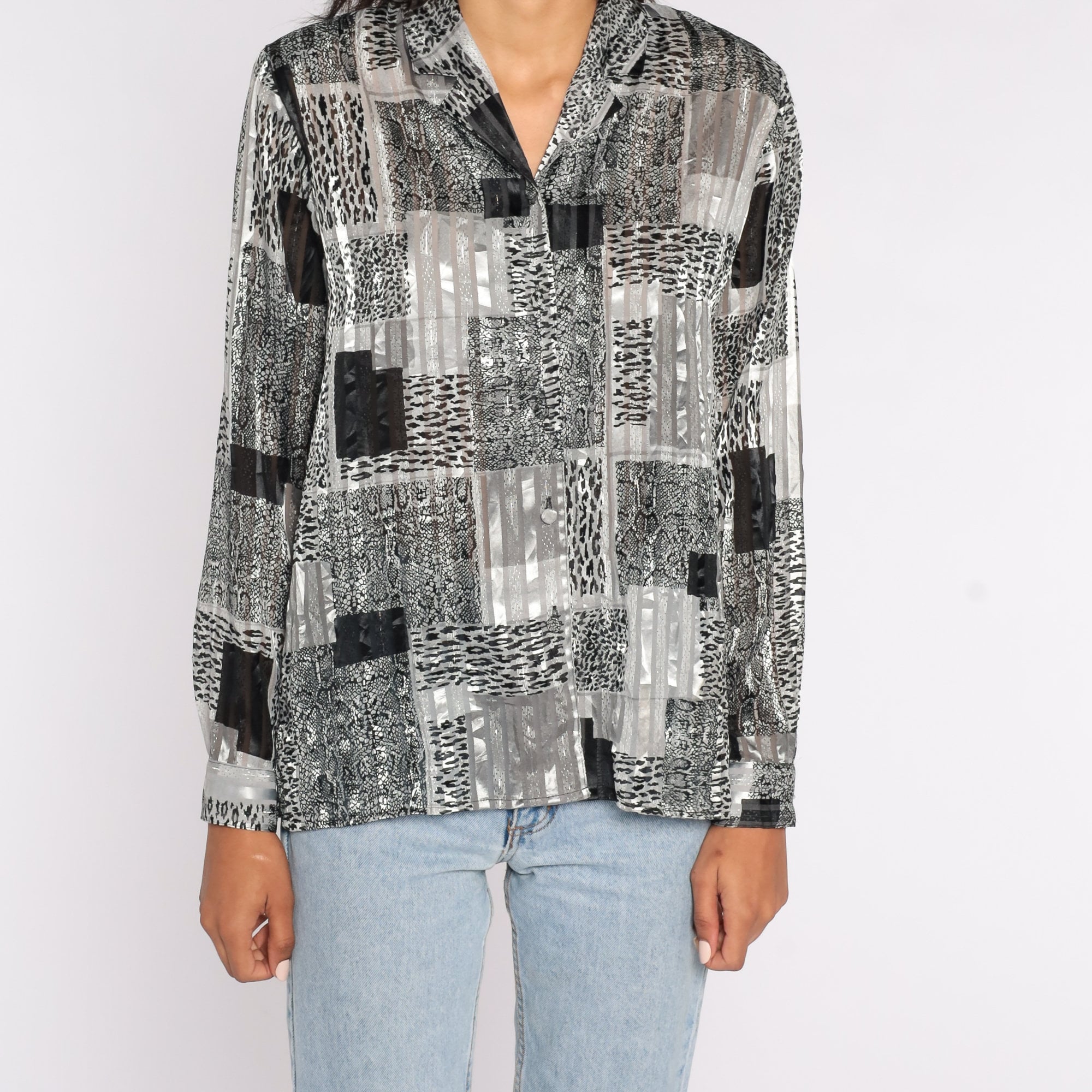 Vintage 90s blouse in a leopard print and Semi-Sheer stripes.