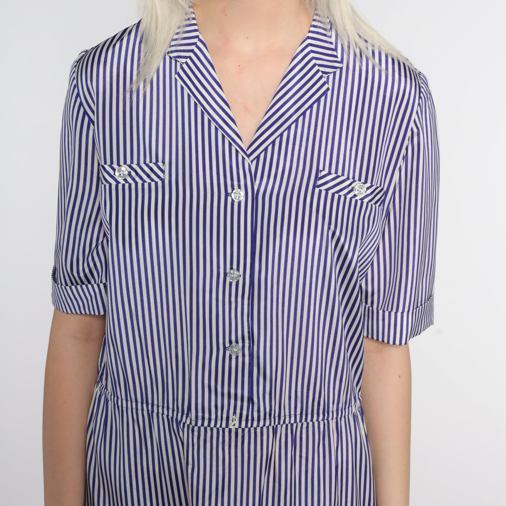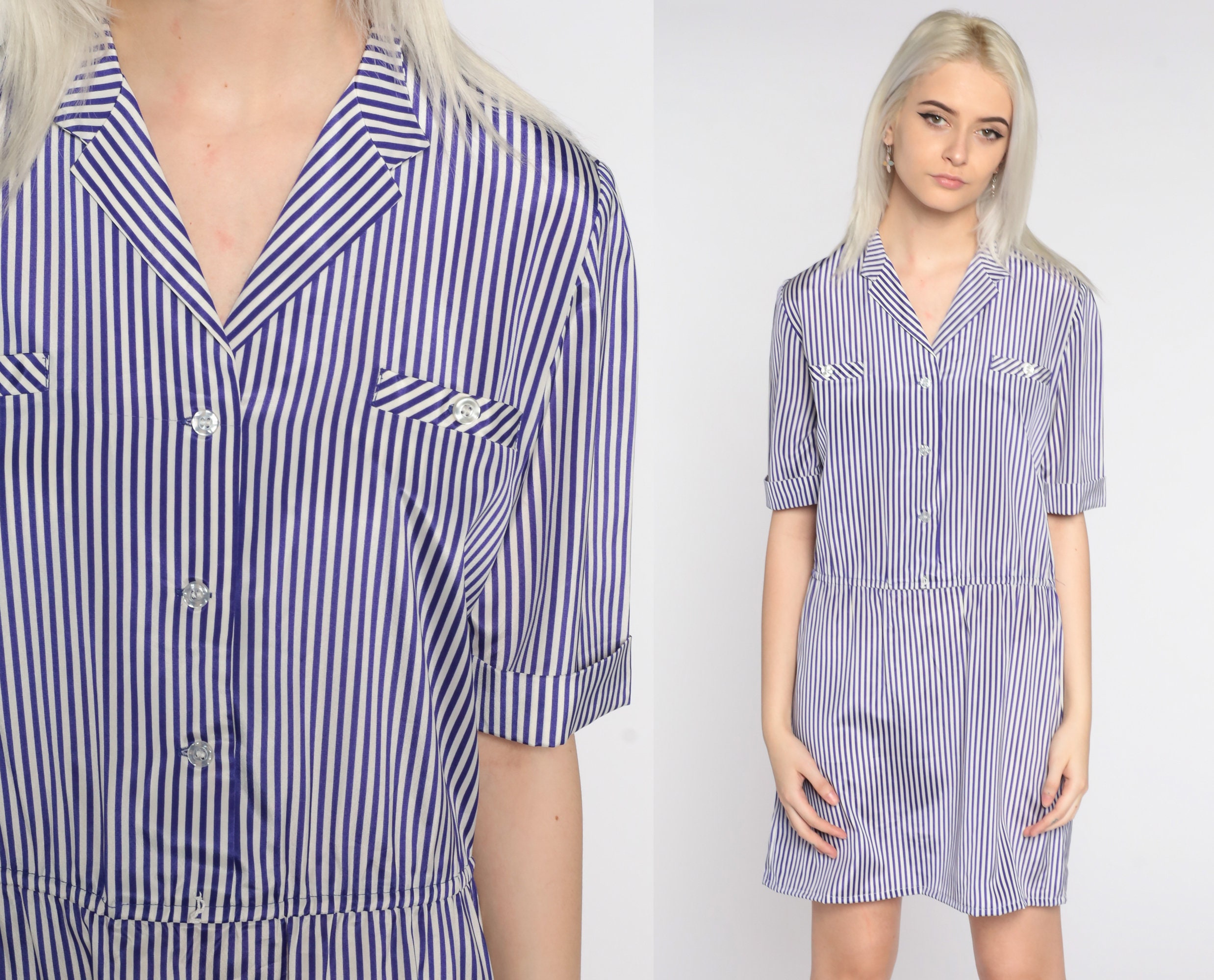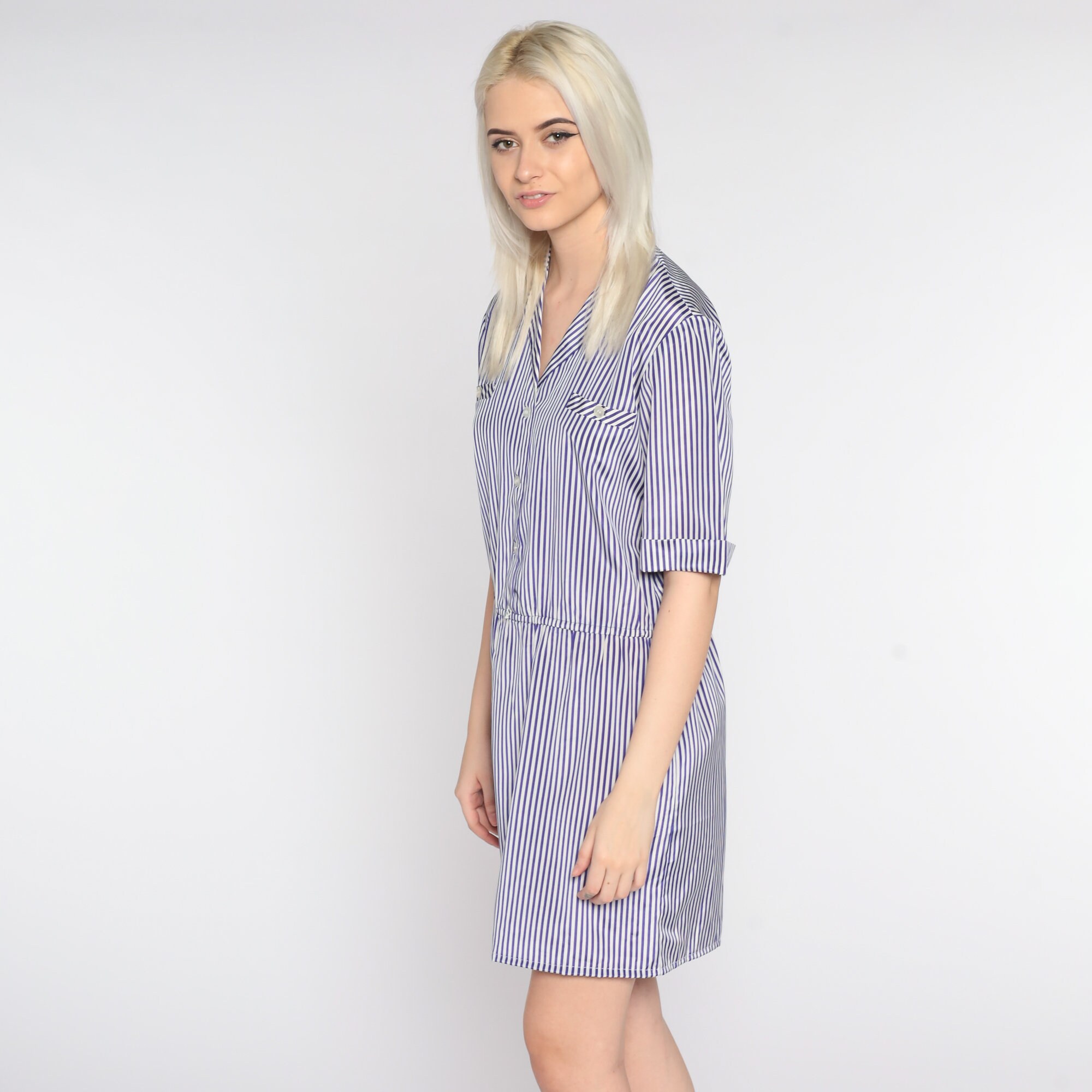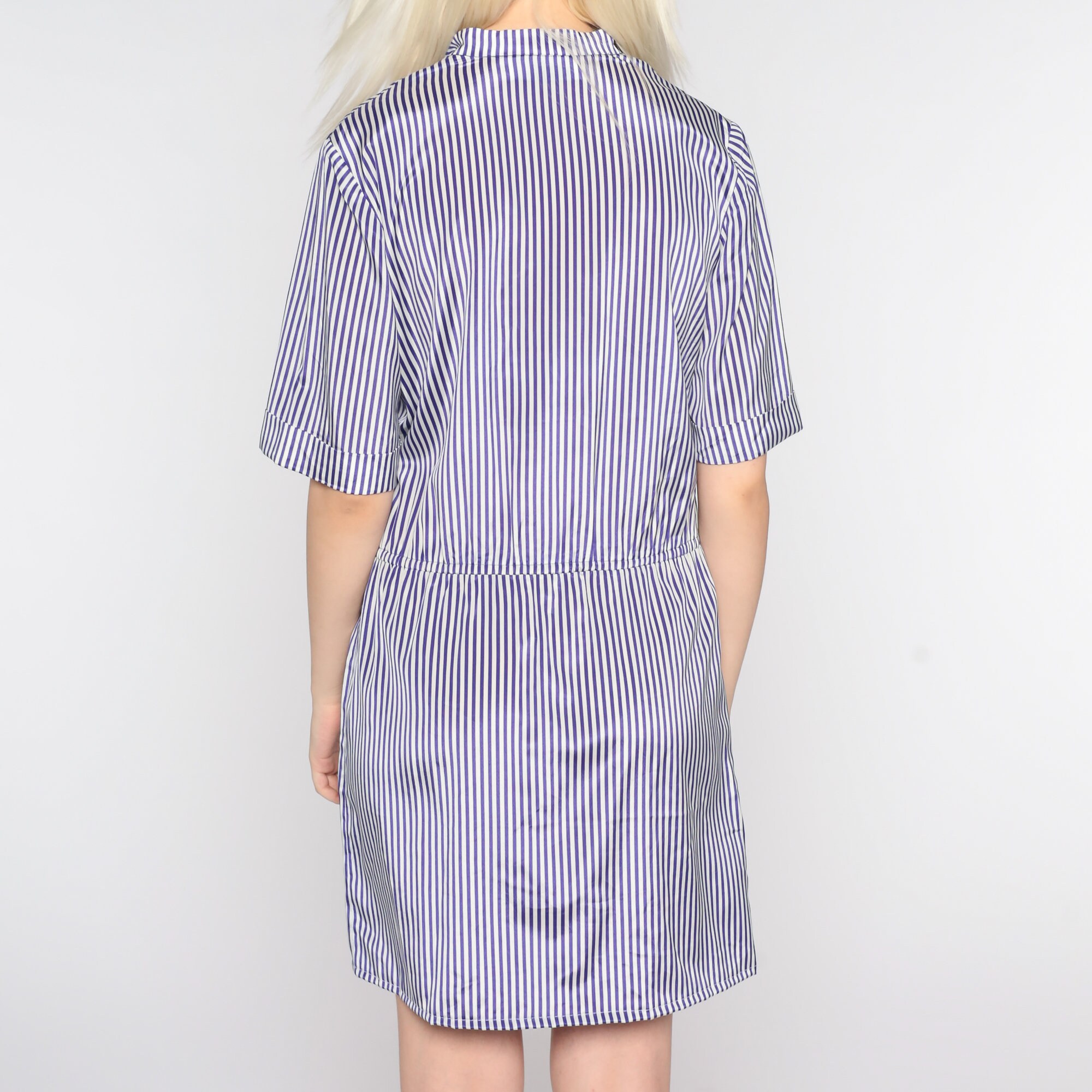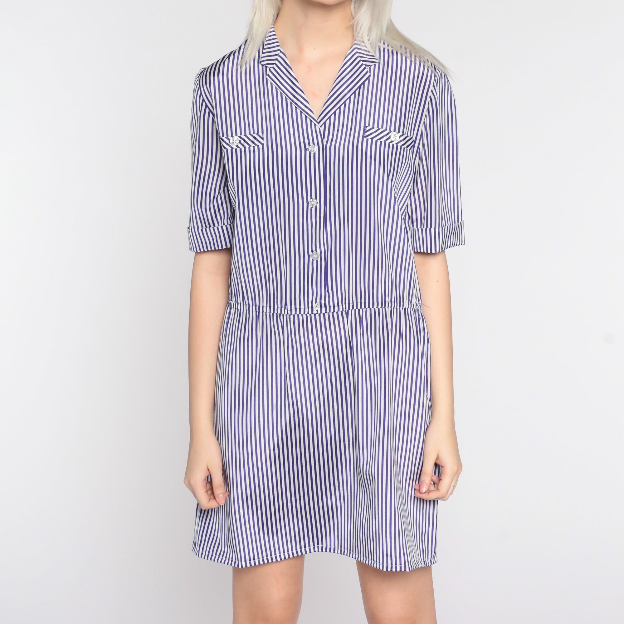 Vintage 80s dress with purple and white stripes and short sleeves. Mini length.