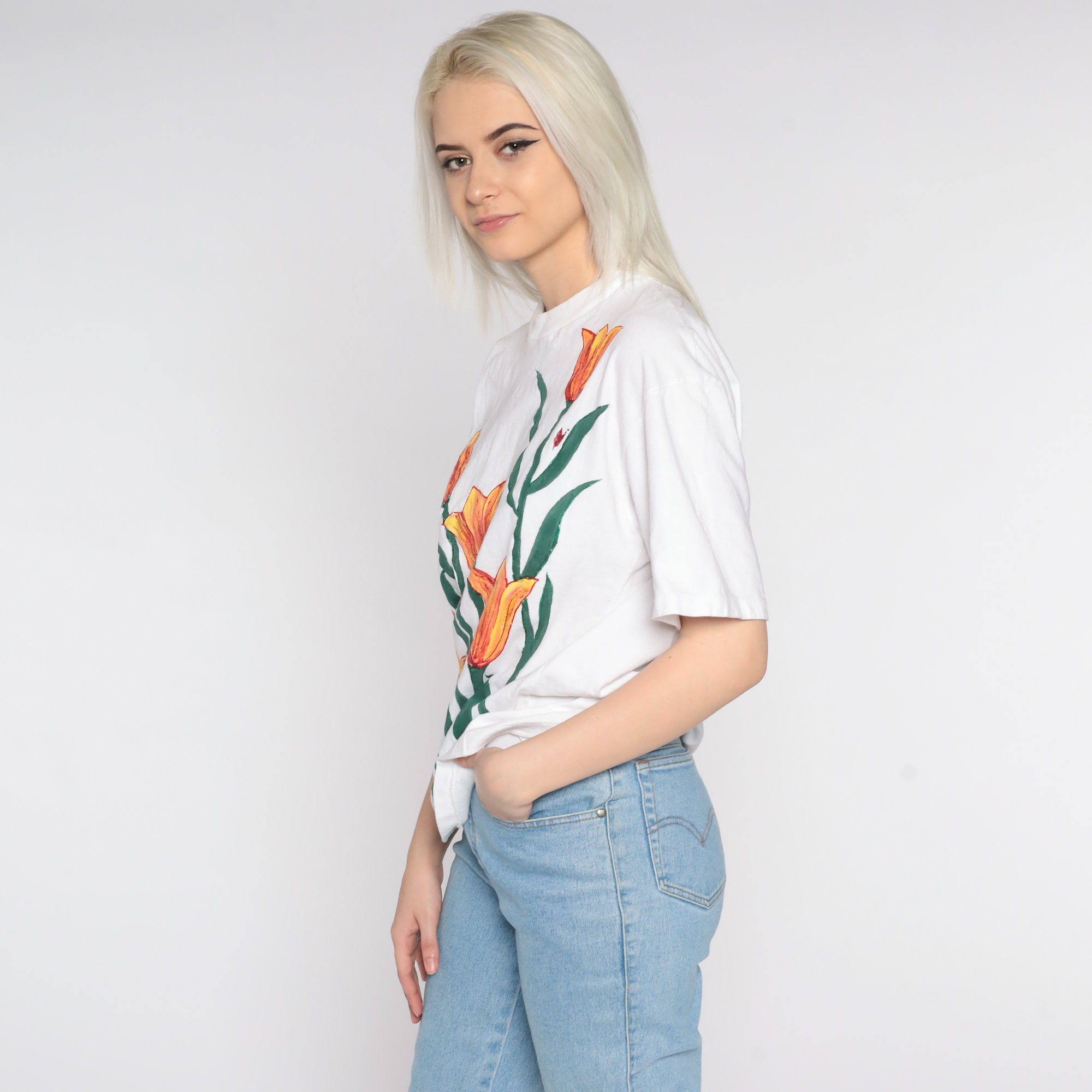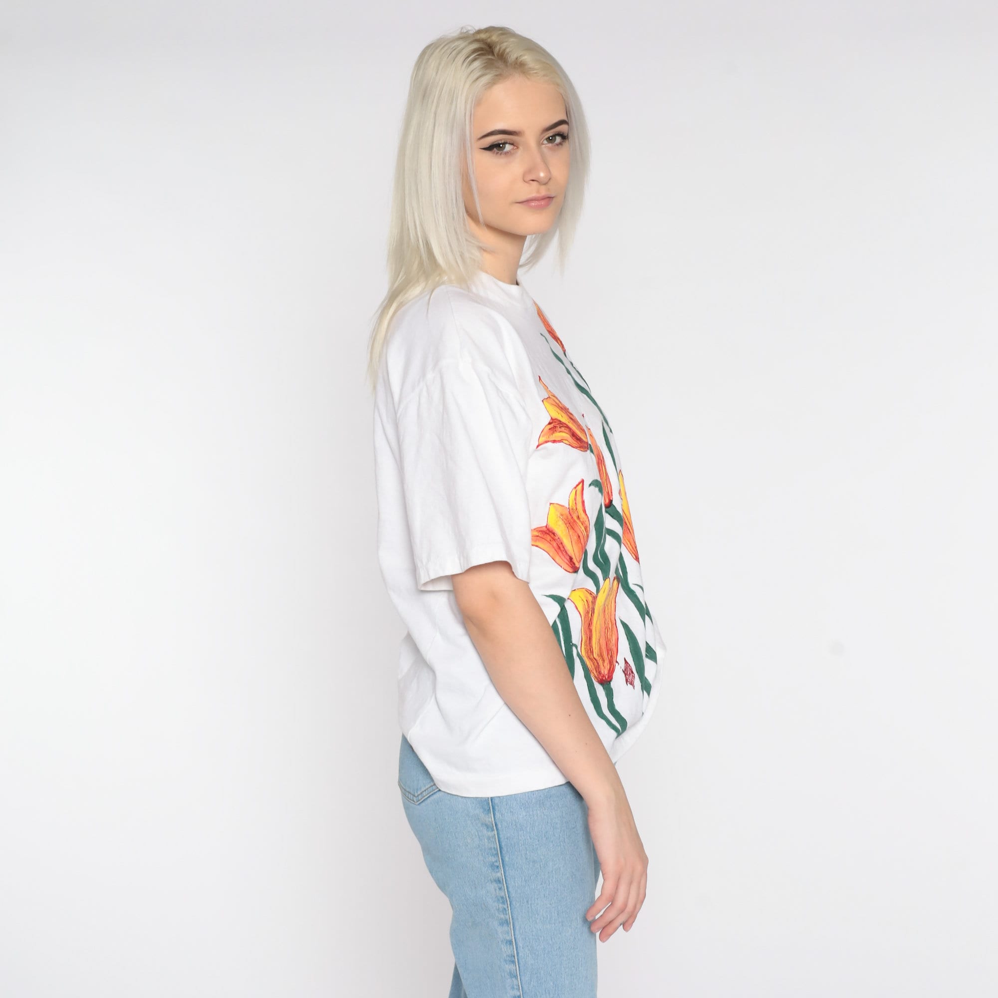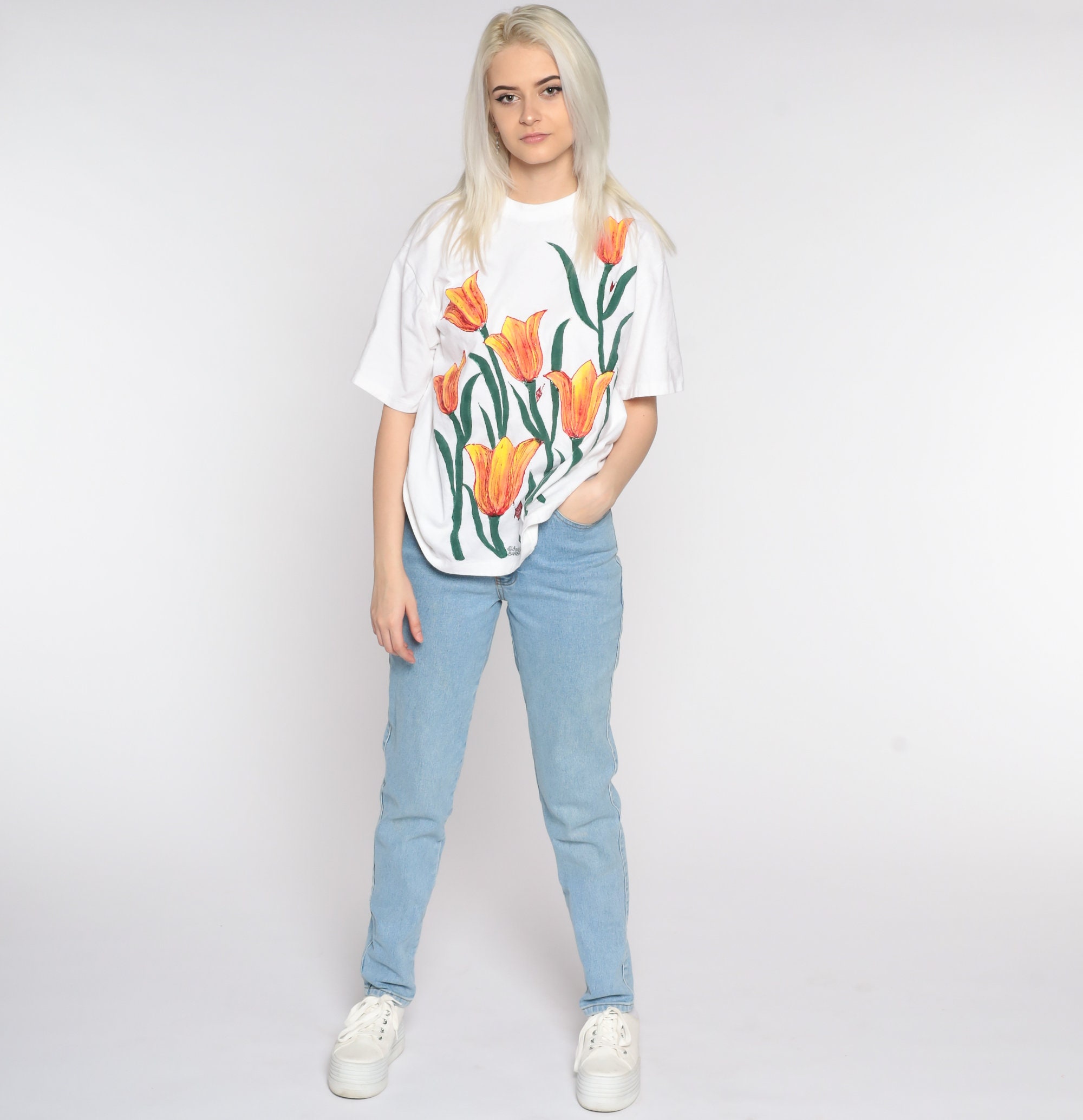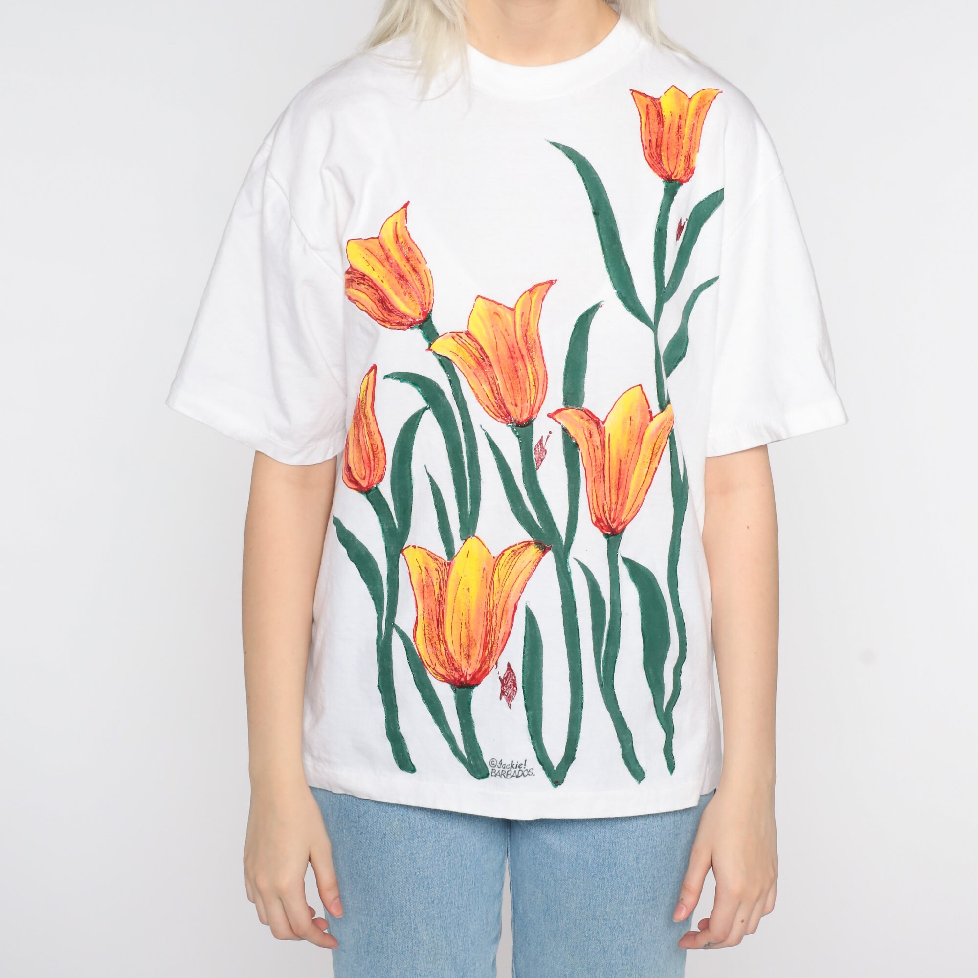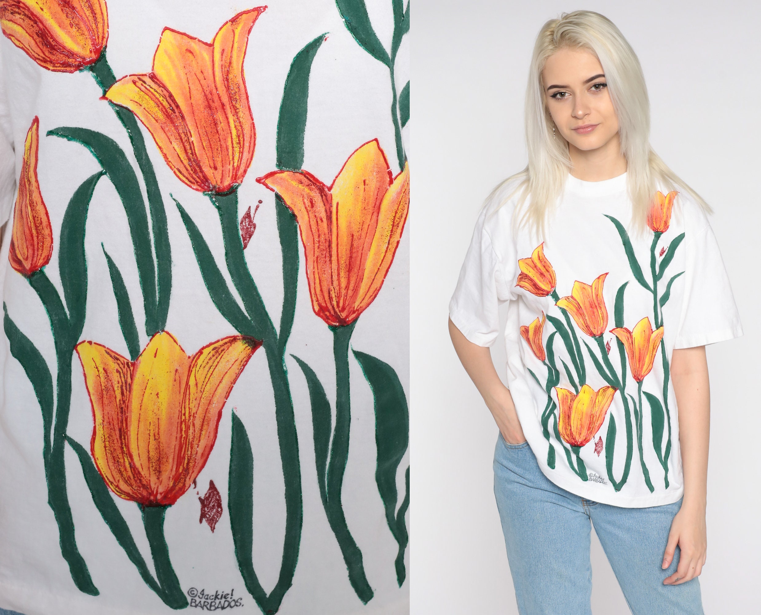 Vintage 80s t shirt with a hand painted floral print and Jackie! Barbados written on the front.