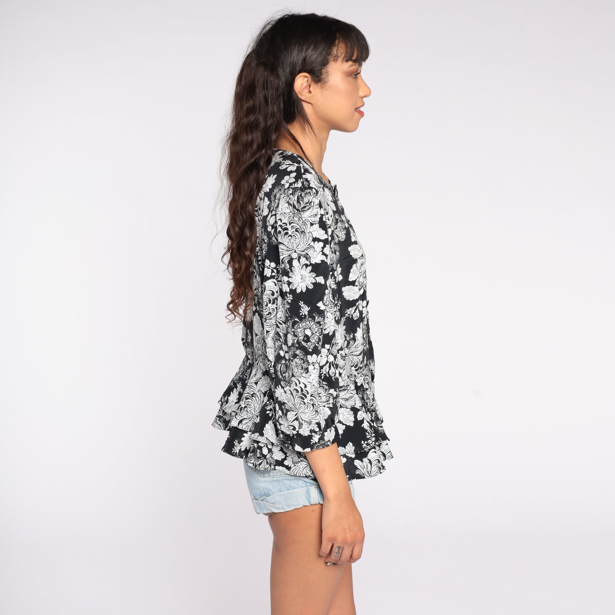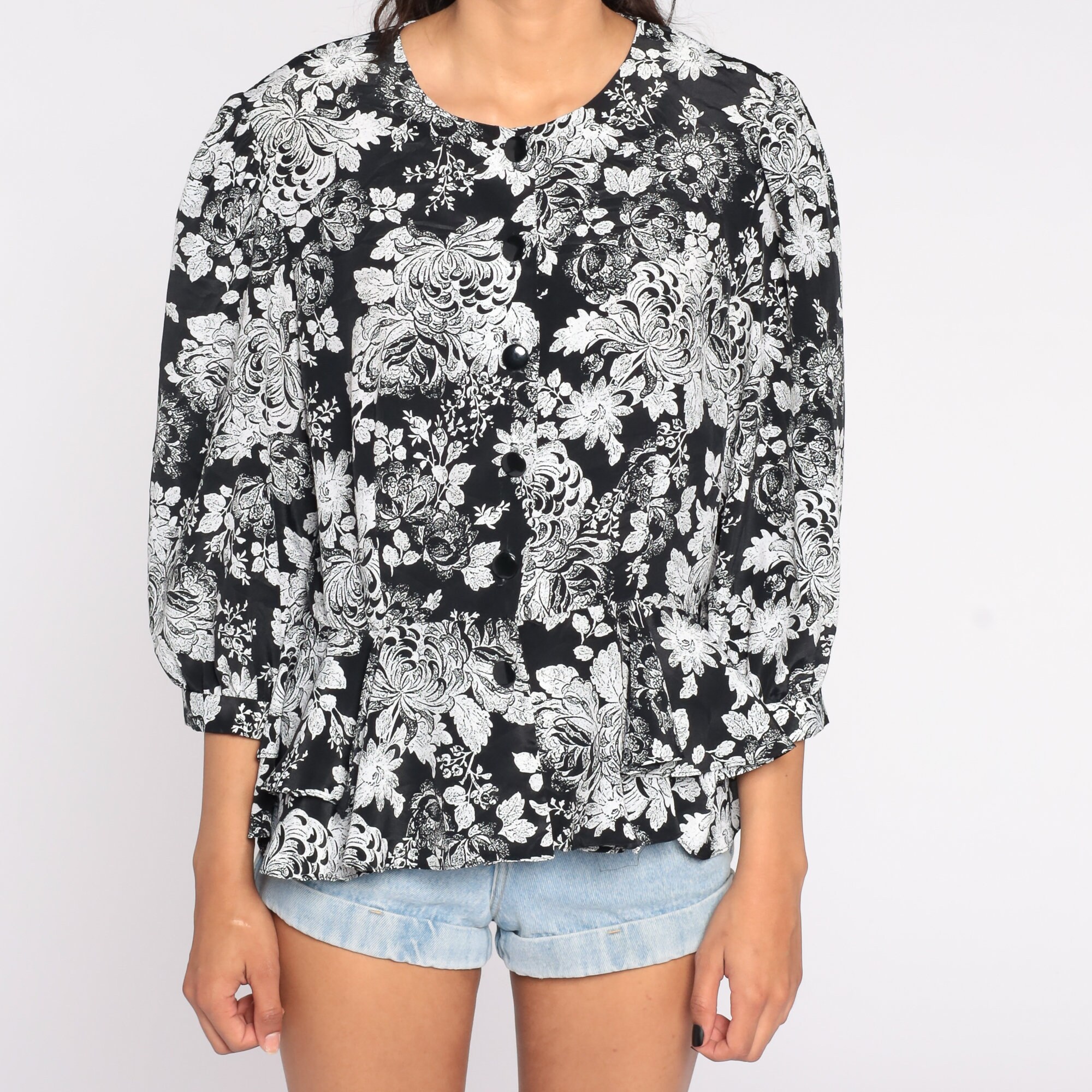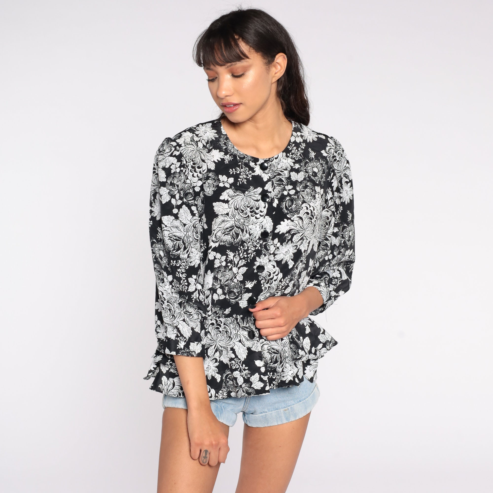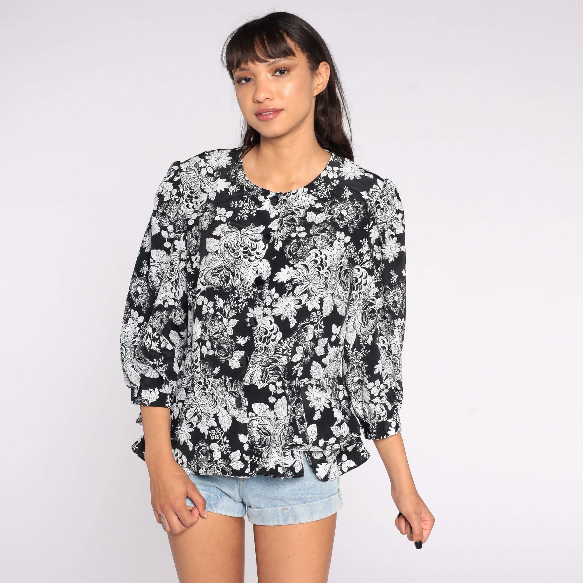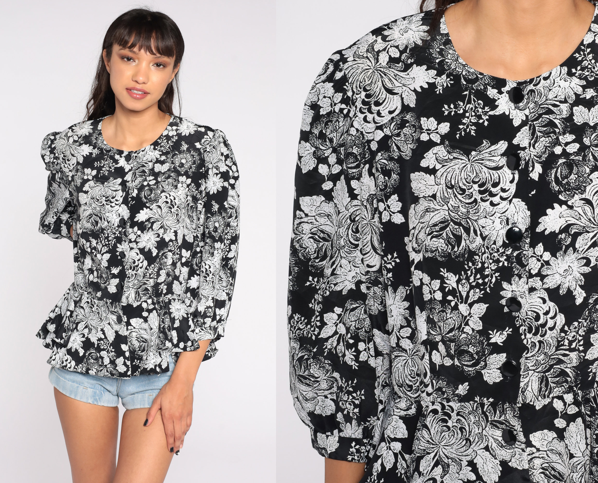 Vintage 80s 90s button up shirt with a floral print and a peplum hem.