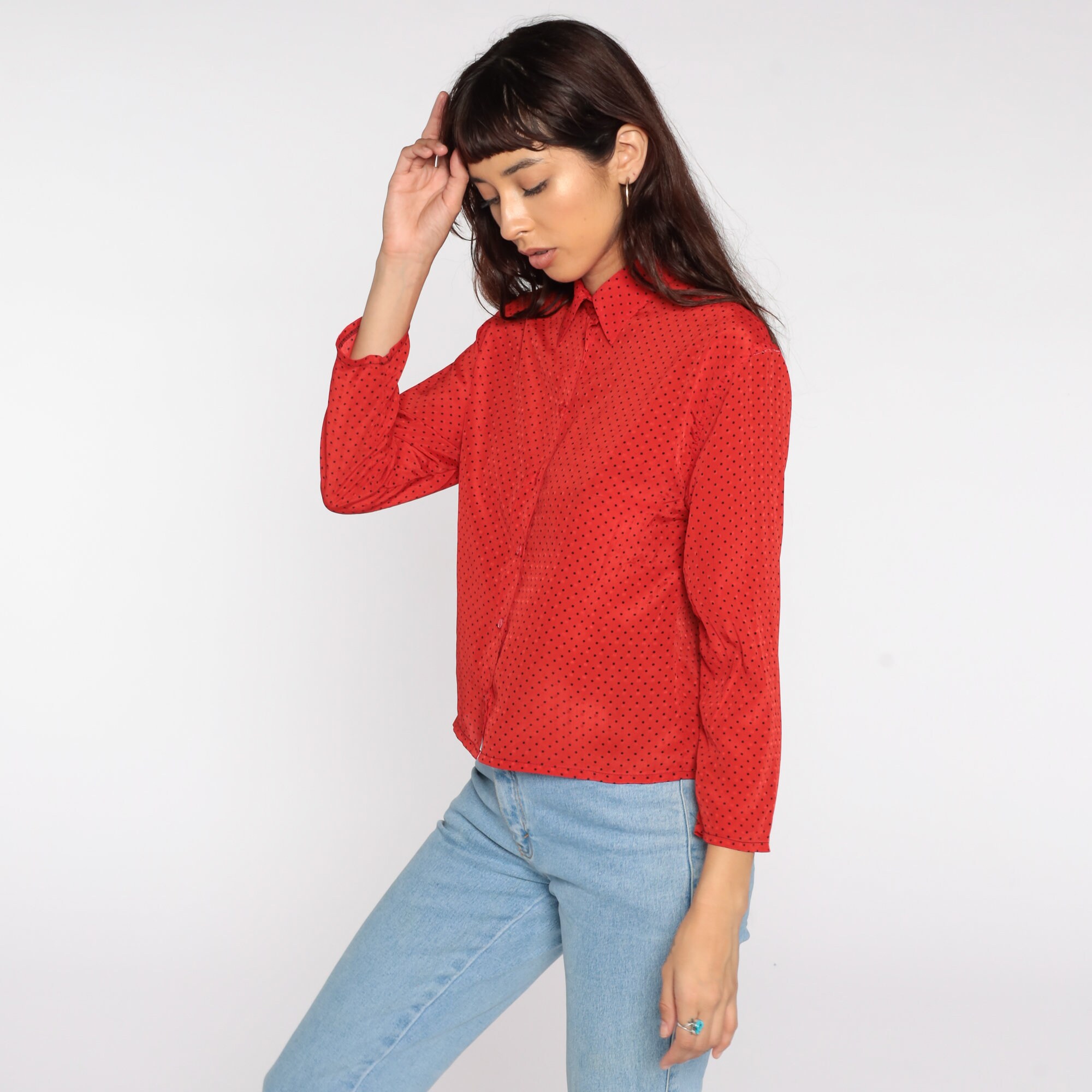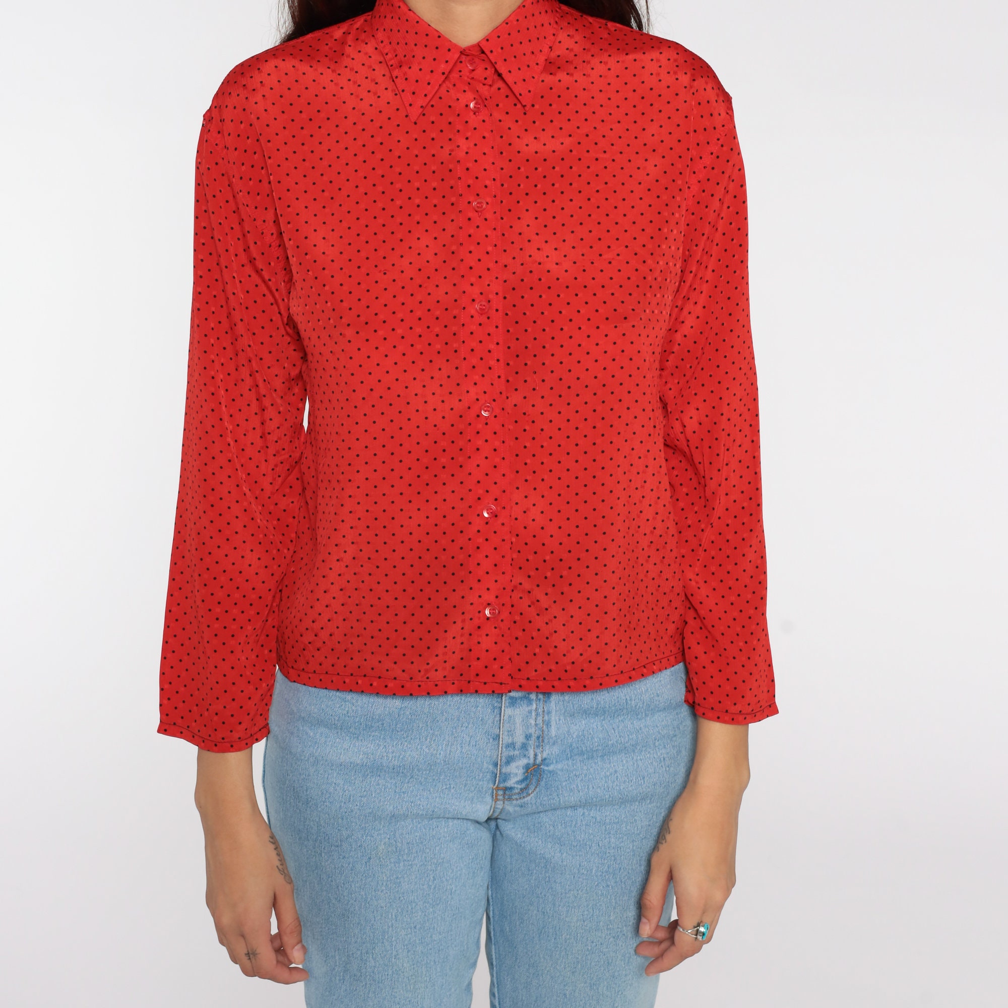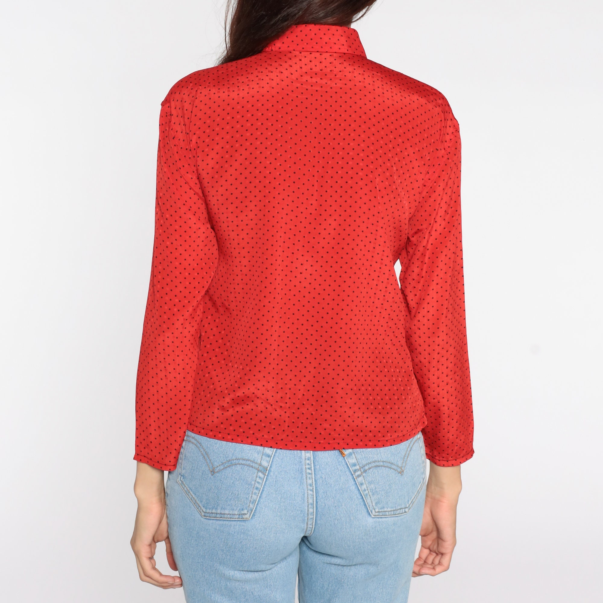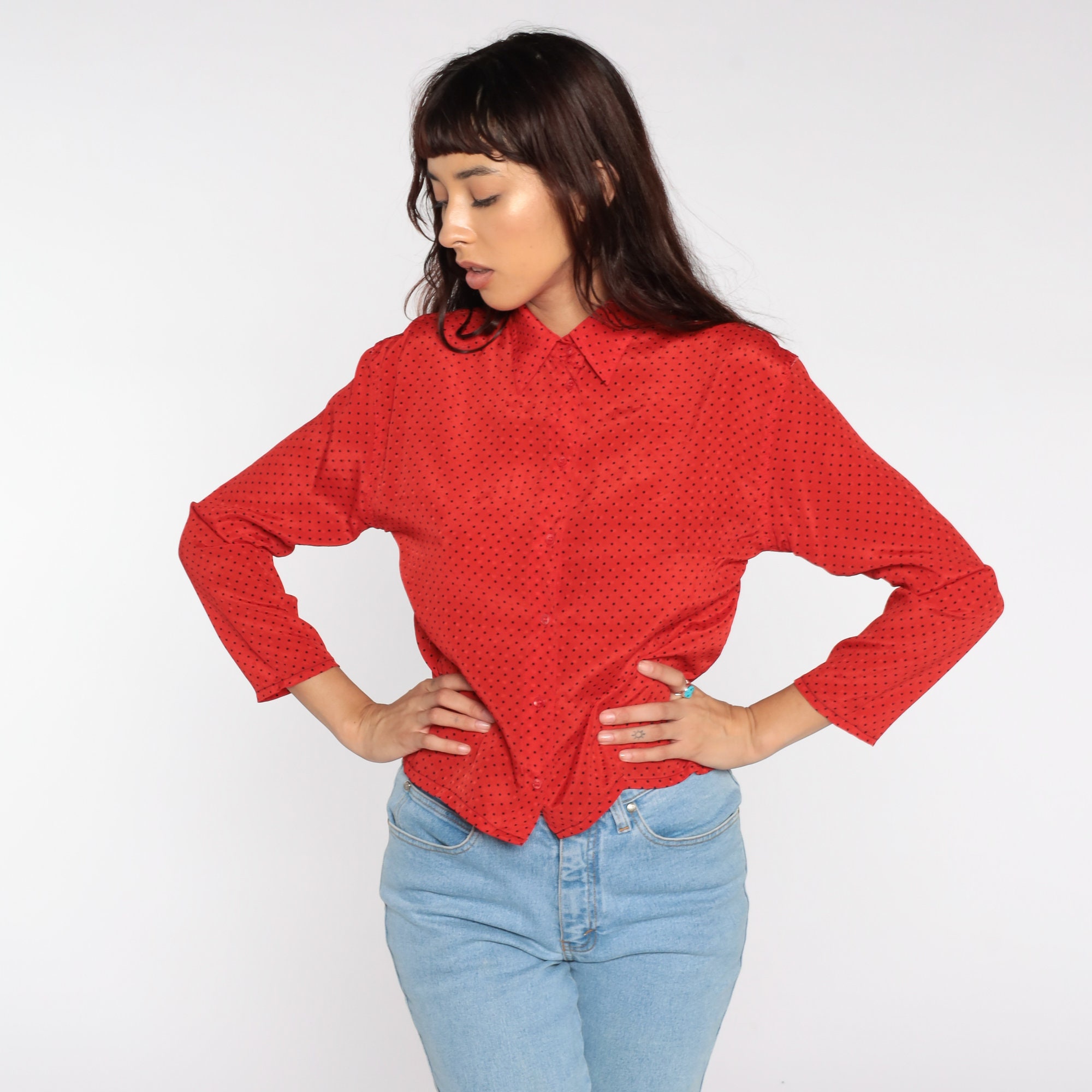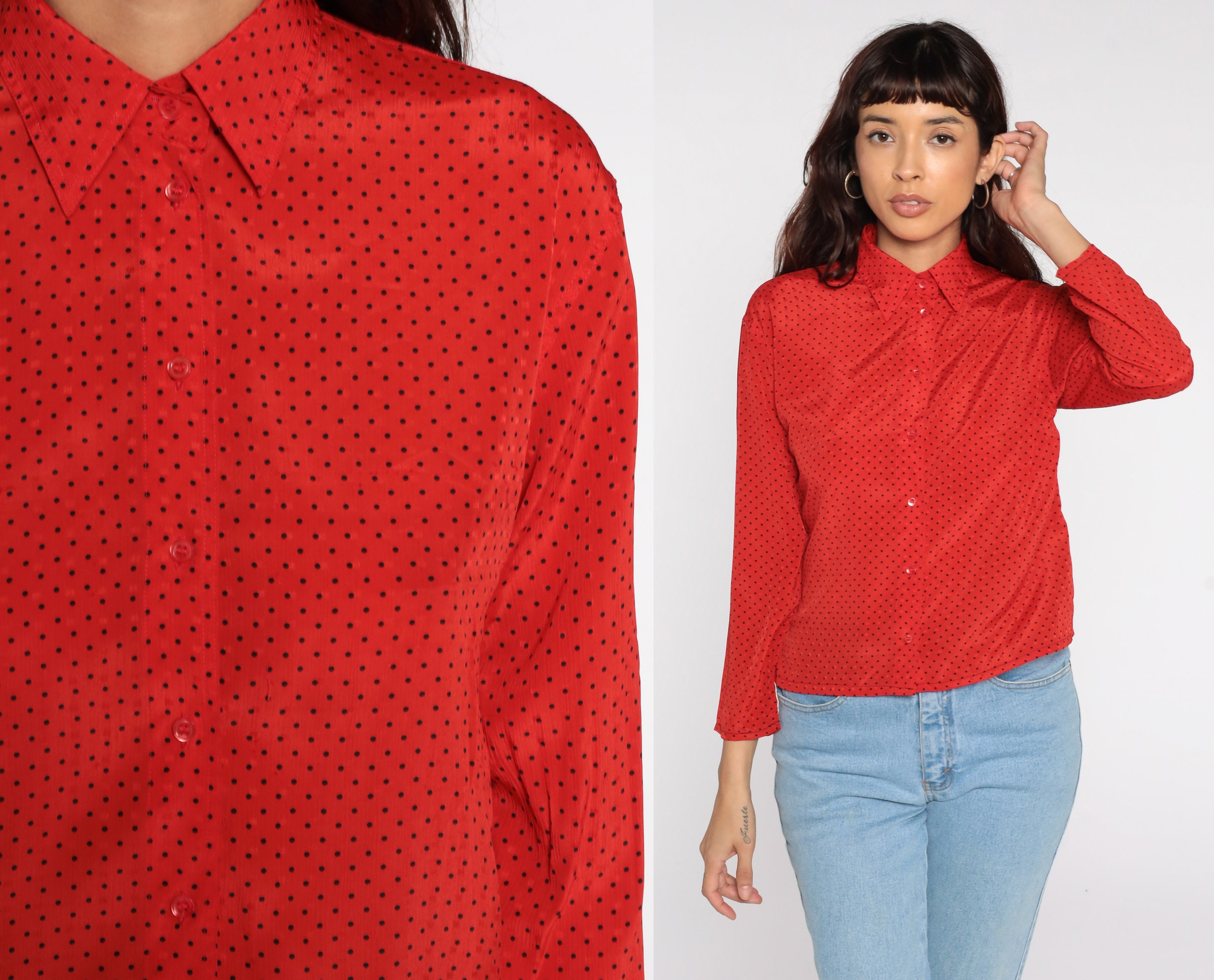 Vintage 80s 90s shirt in red with a polka dot print. Buttons up the front with long sleeves.