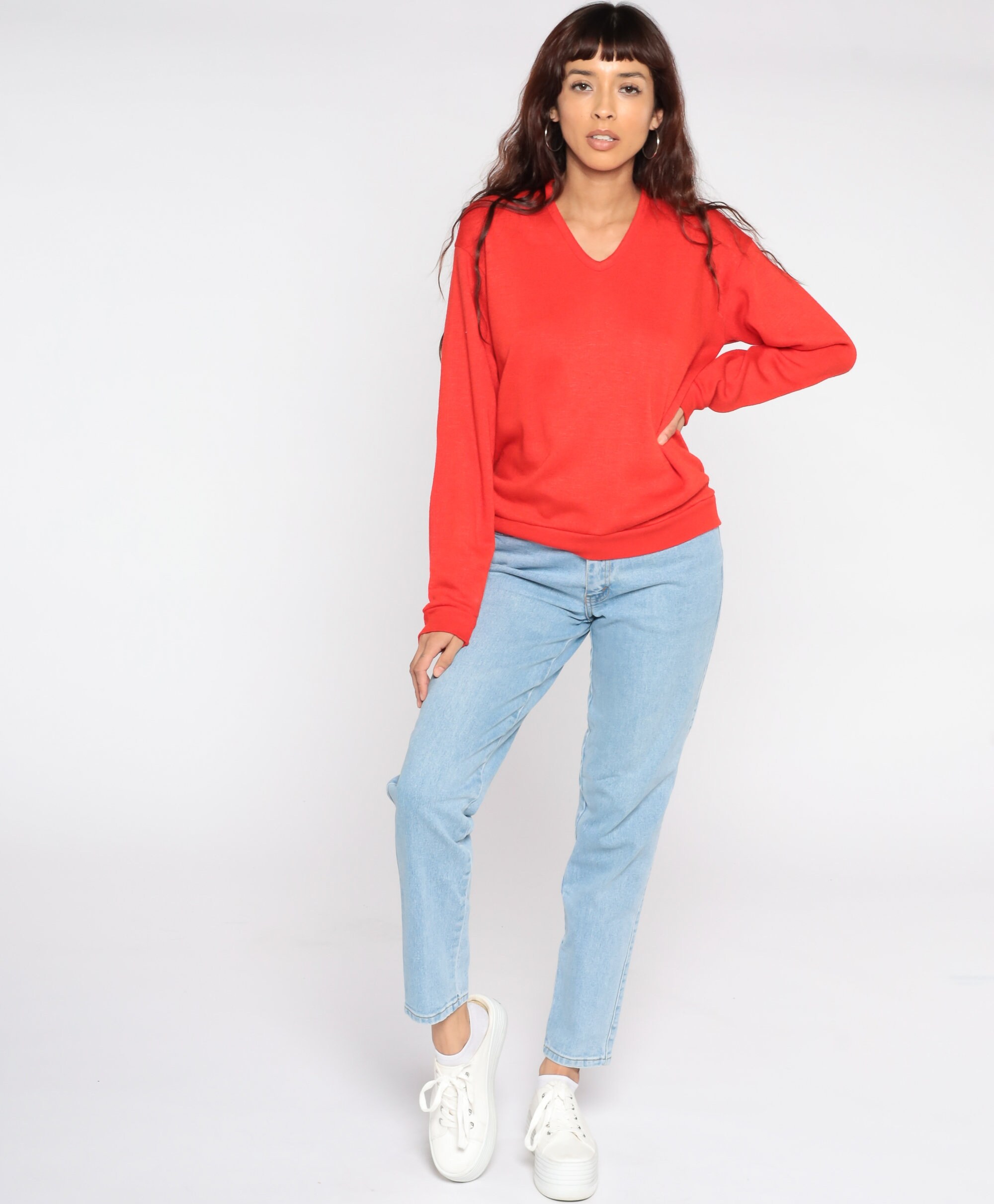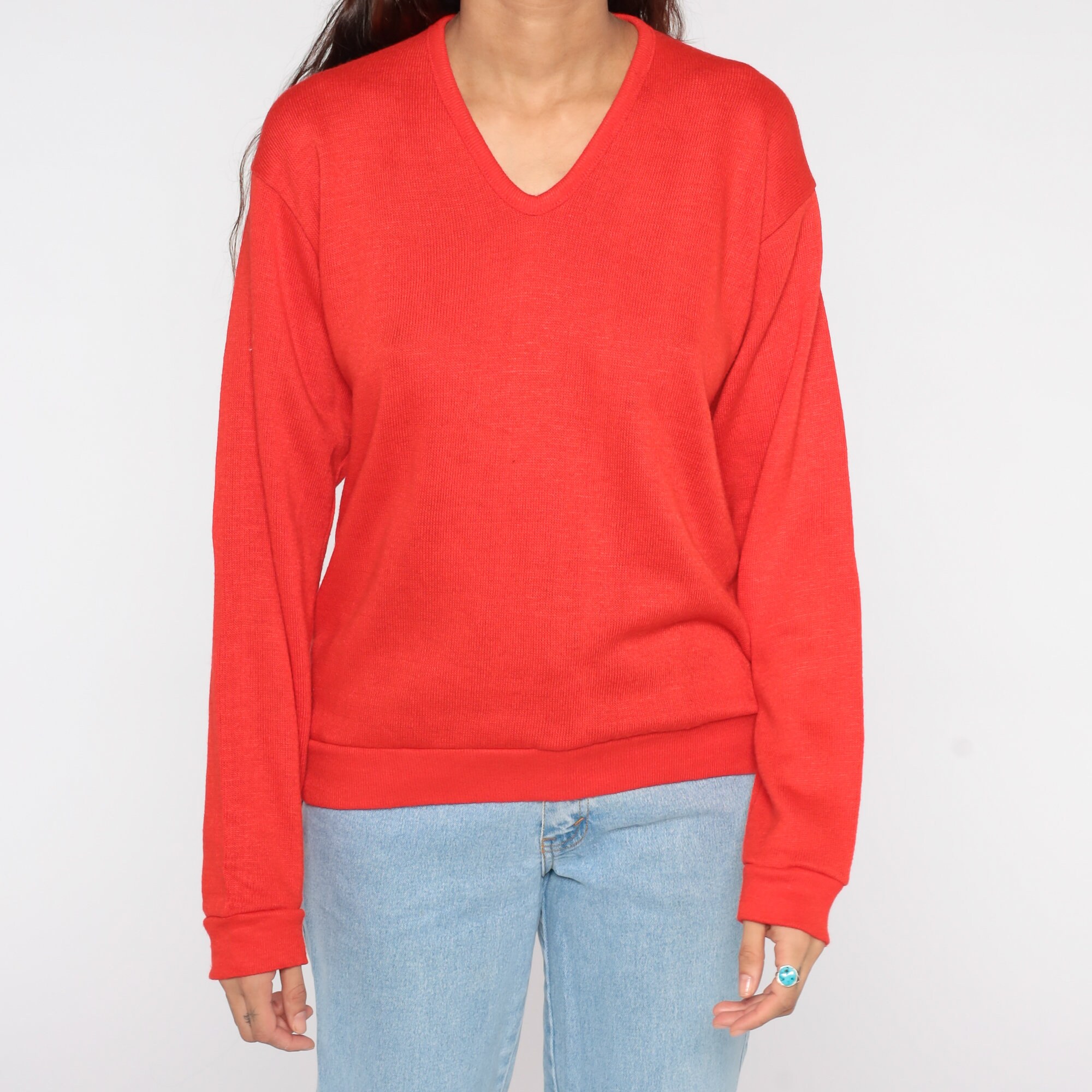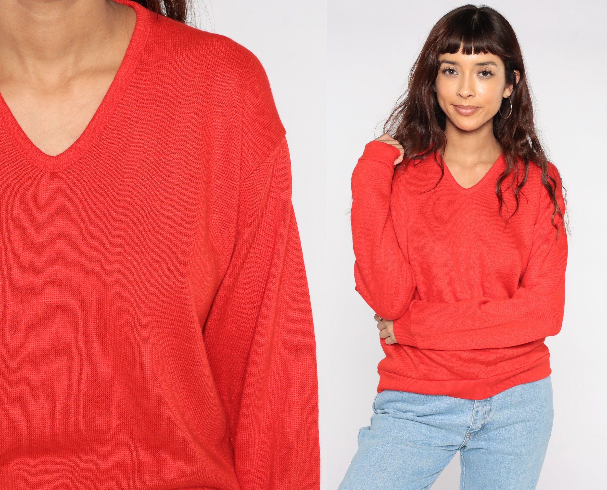 Vintage 80s sweater in red knit with a v neck. Slouchy fit.