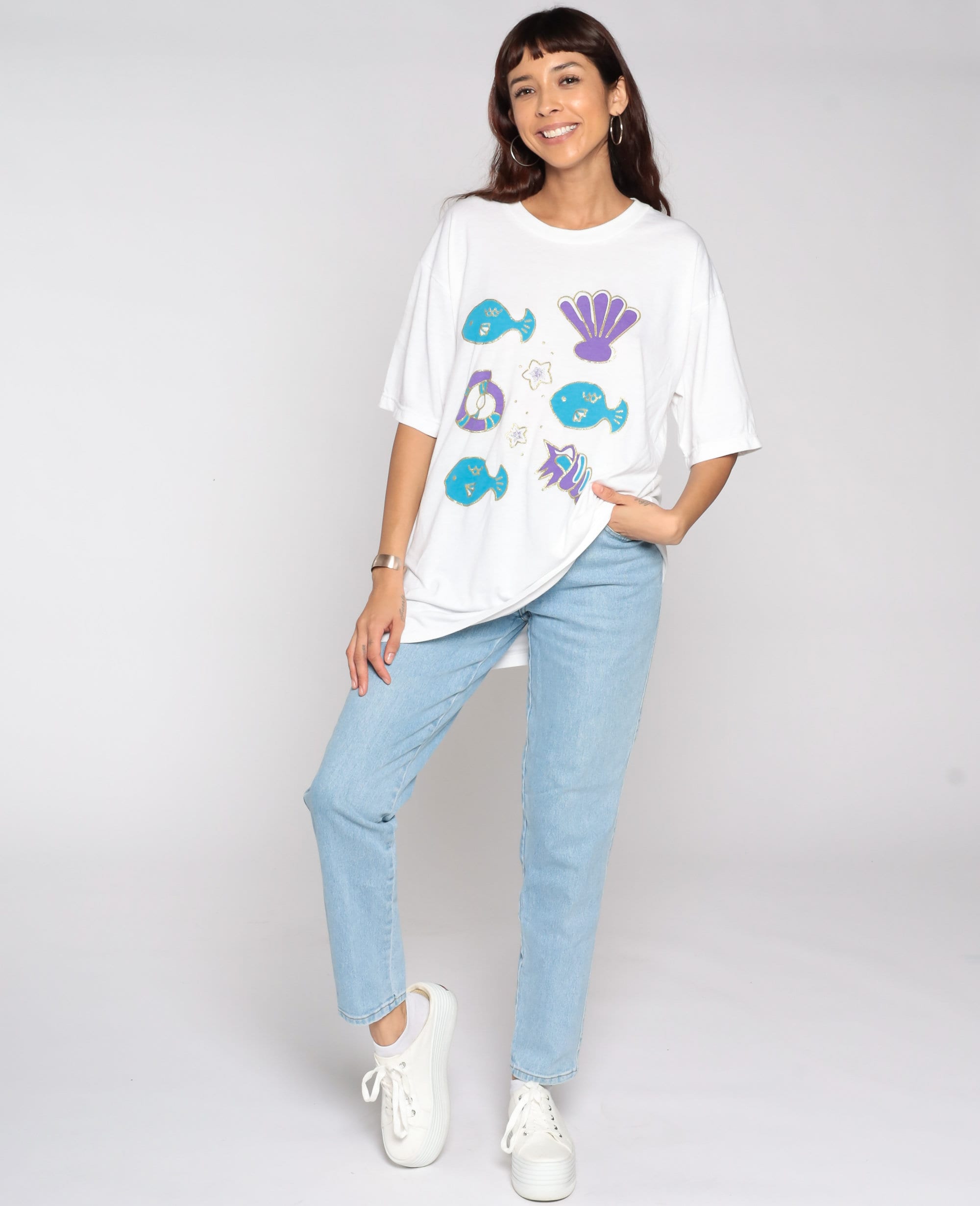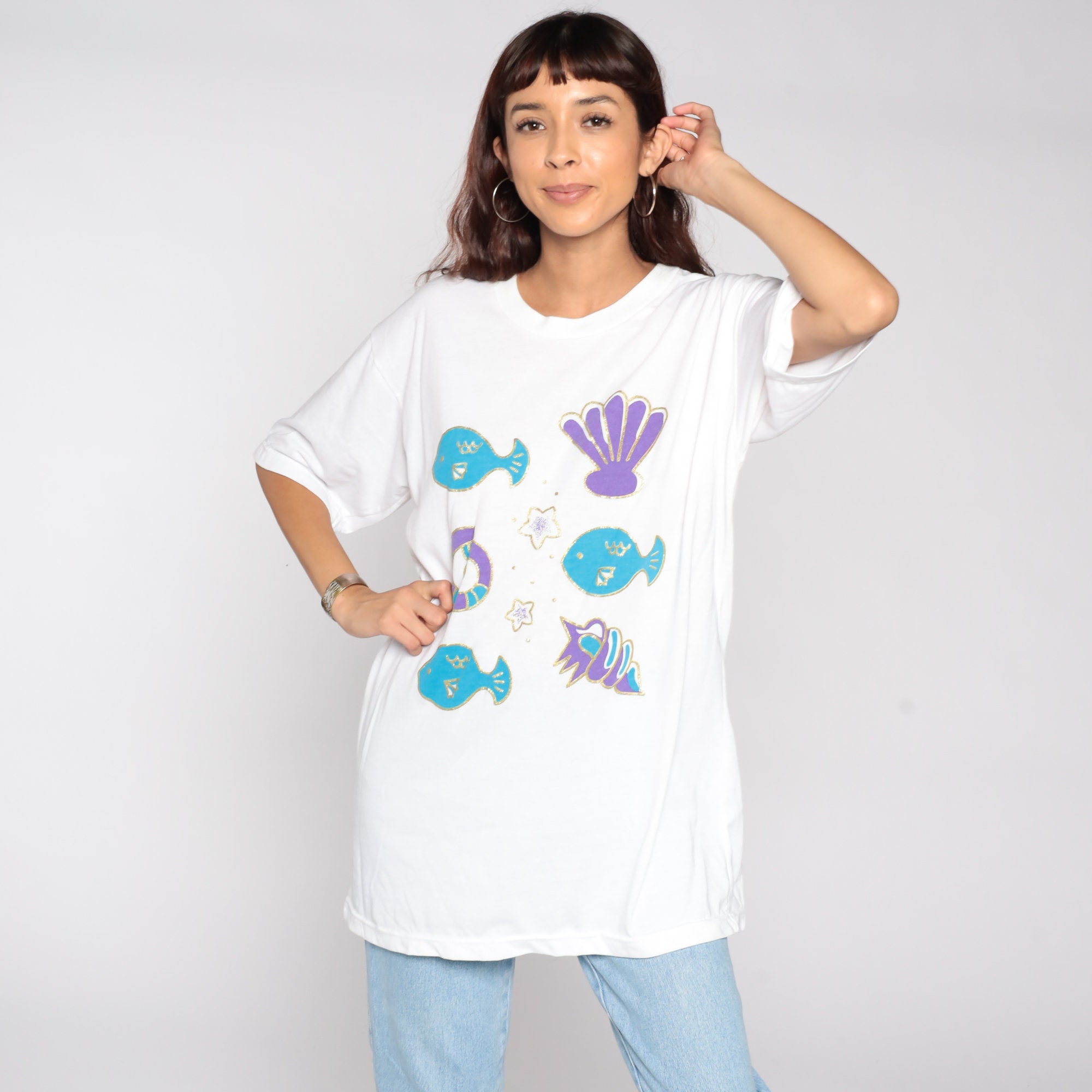 Vintage 80s 90s t shirt with a fish print and seashells.