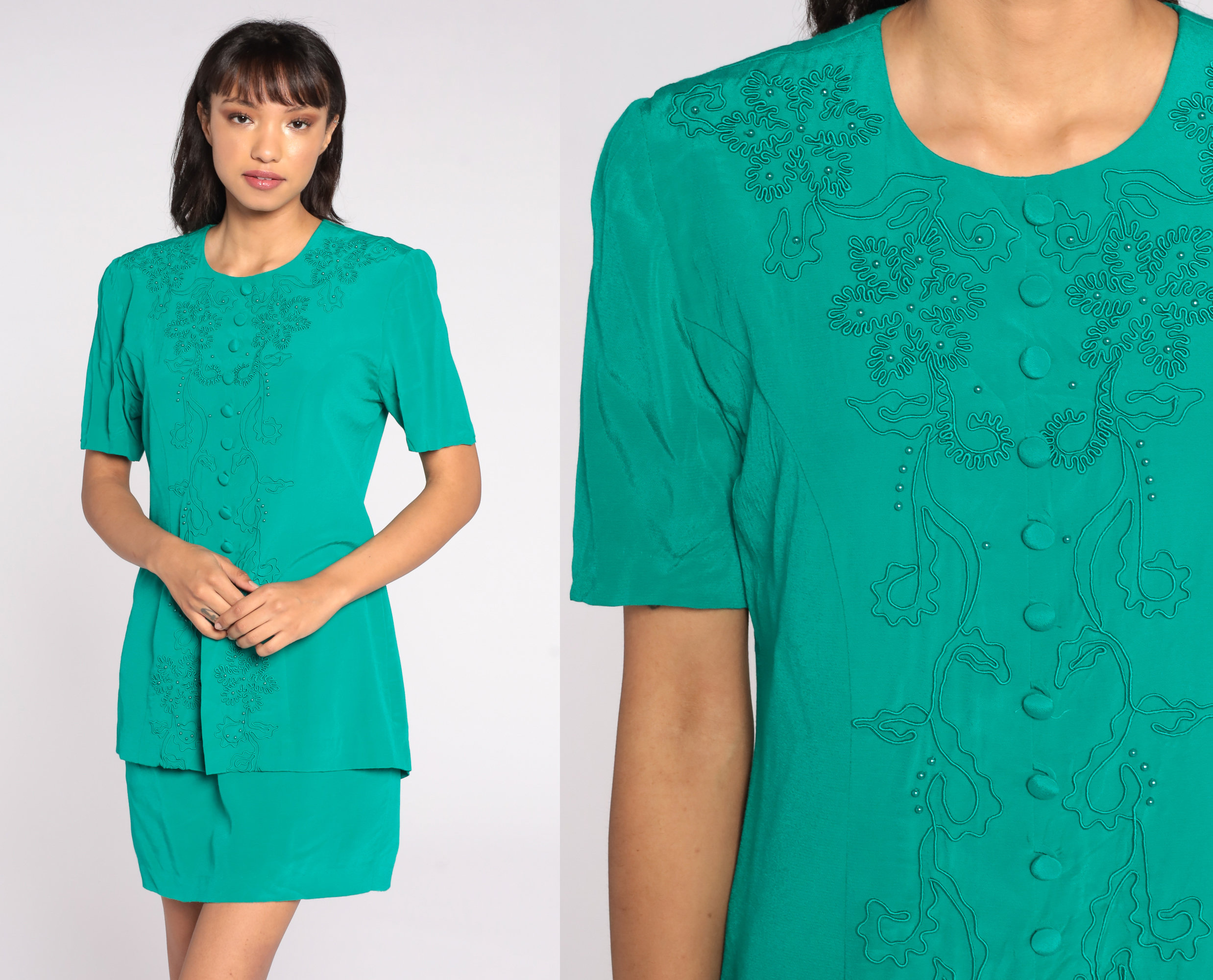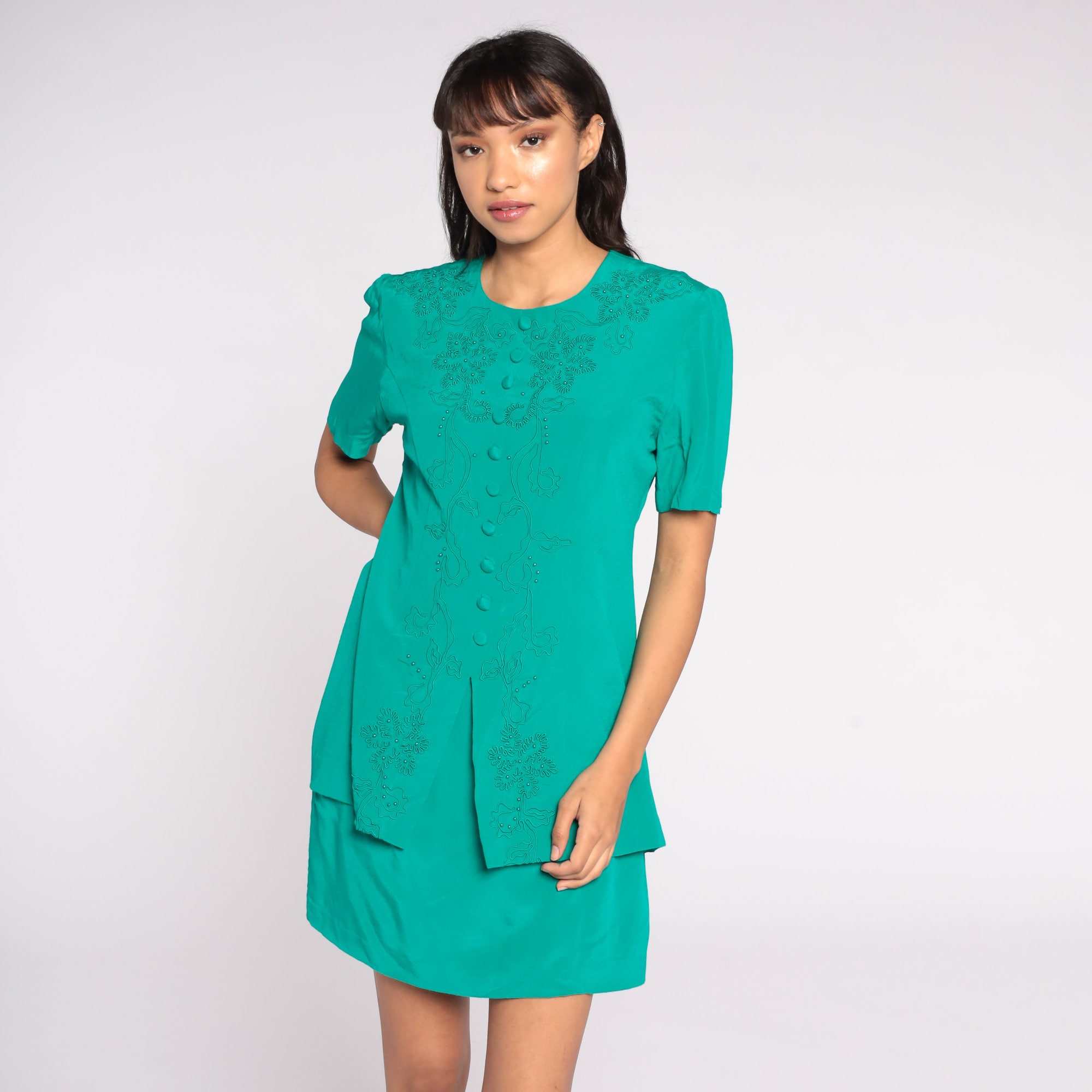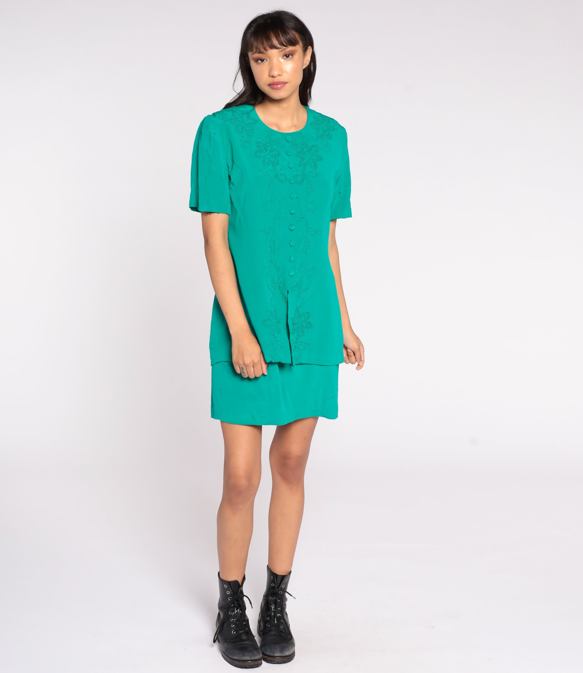 Vintage 90s dress in green with a floral soutache design and beading. It has a sheath cut with buttons down the front and short sleeves. Mini length.