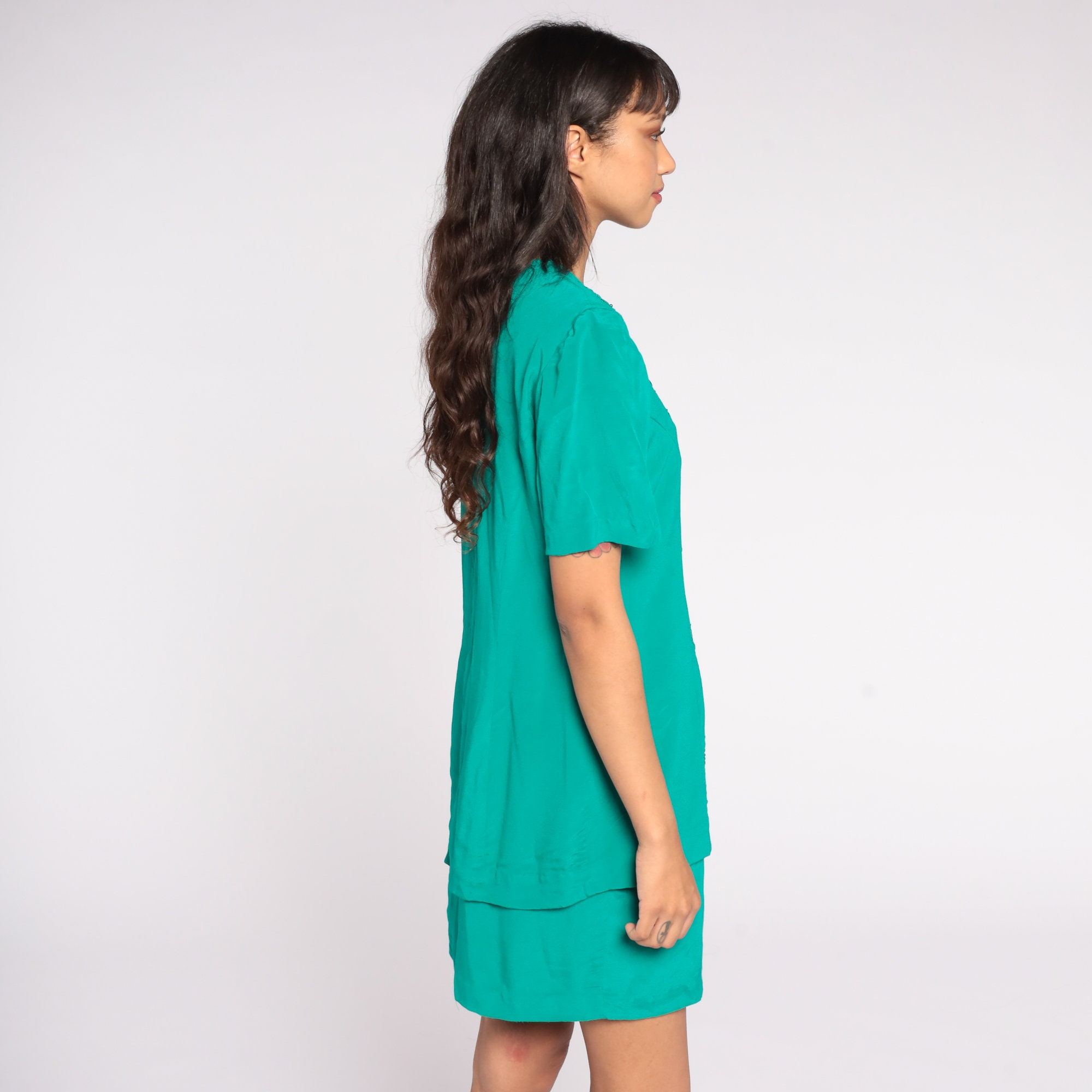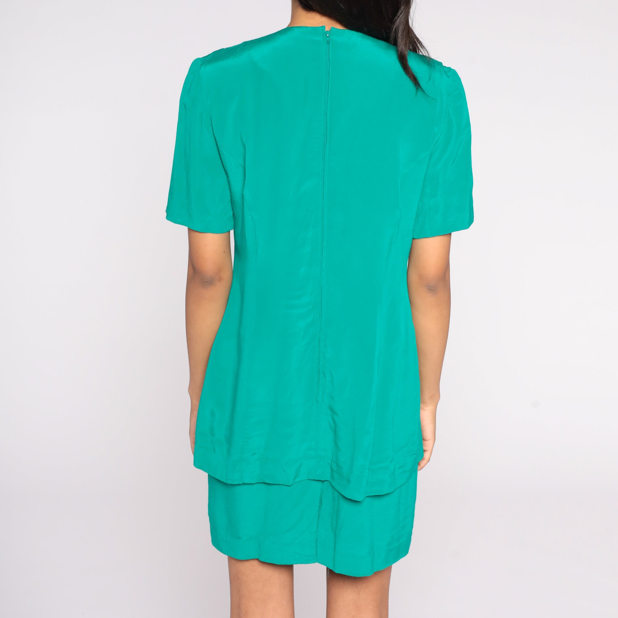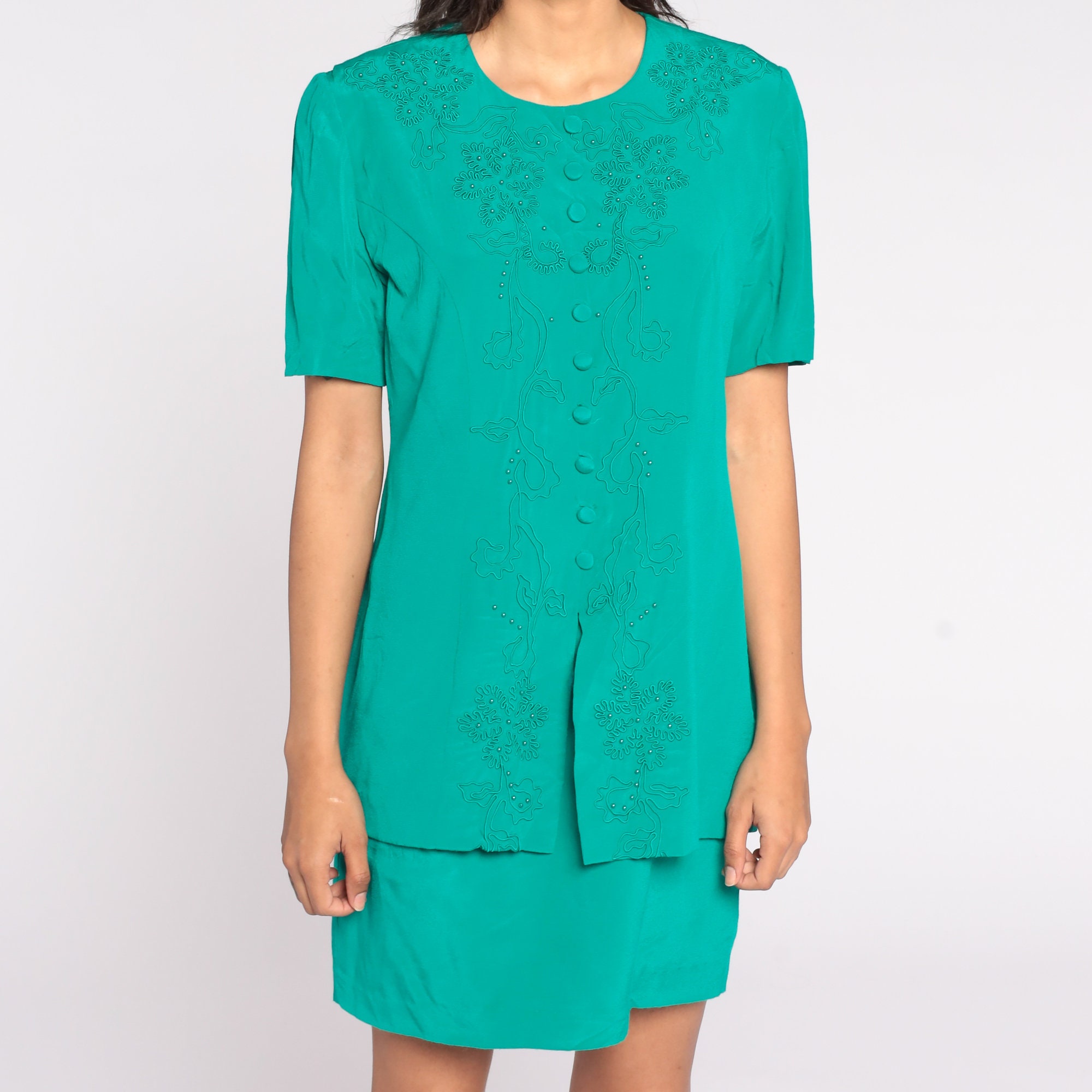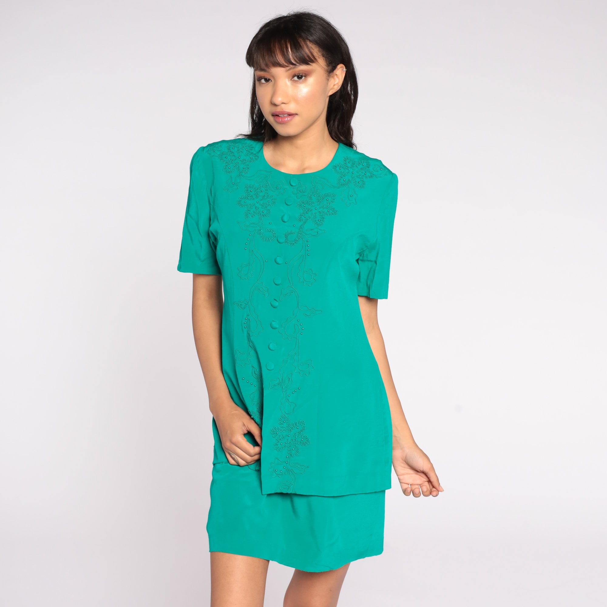Vintage 90s dress in green with a floral soutache design and beading. It has a sheath cut with buttons down the front and short sleeves. Mini length.