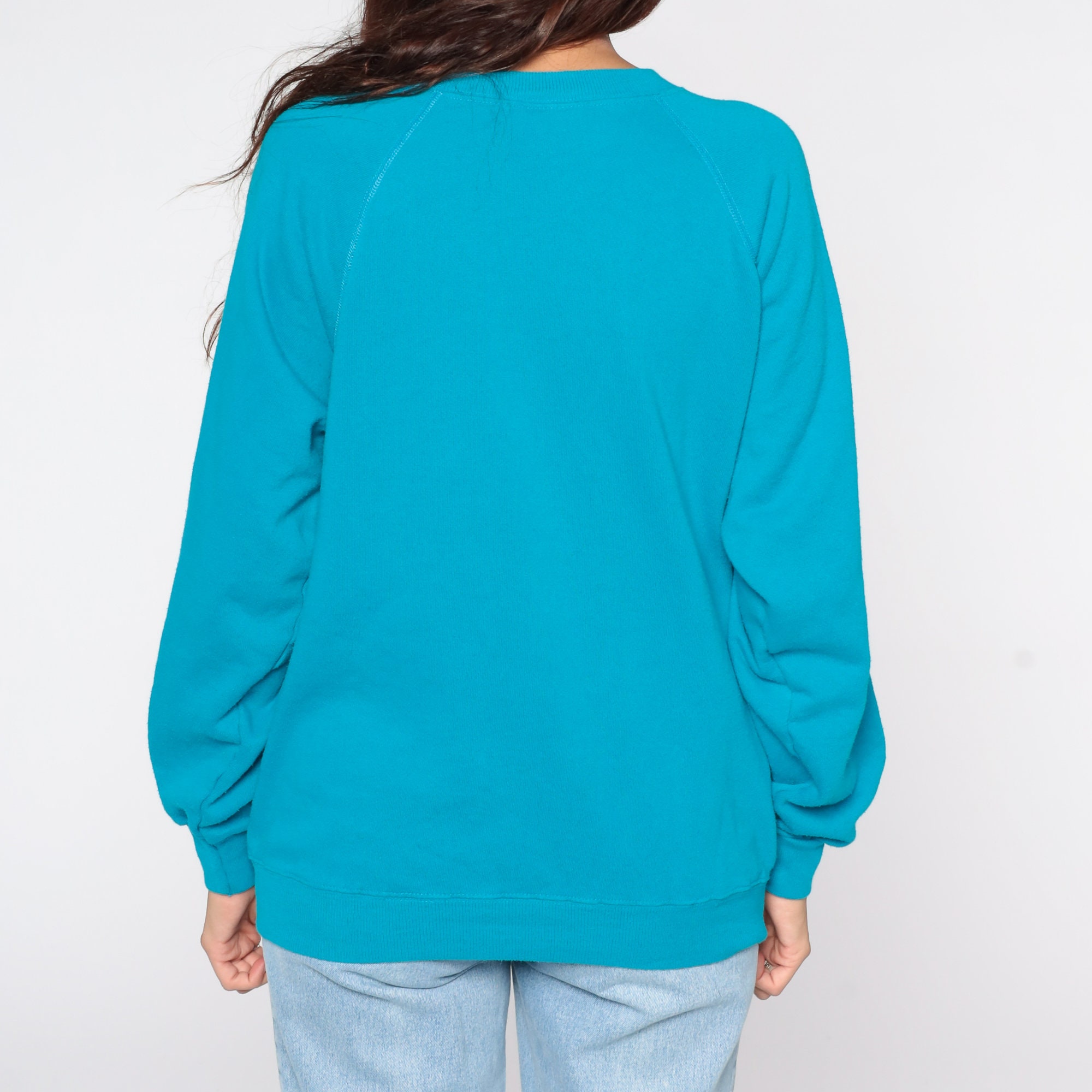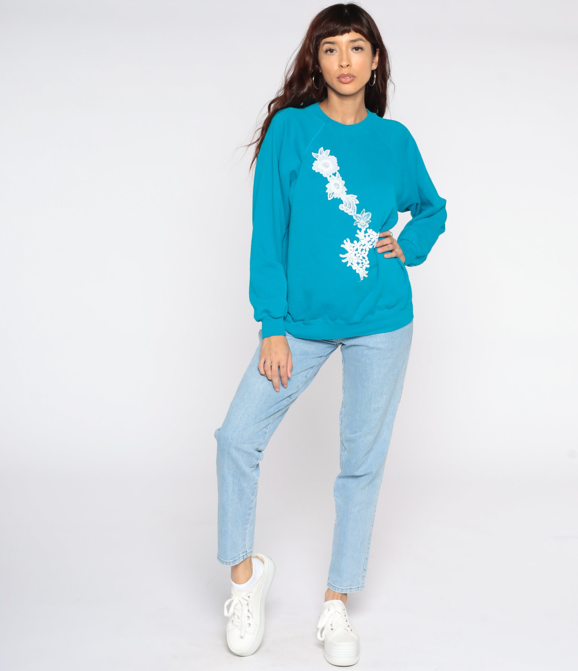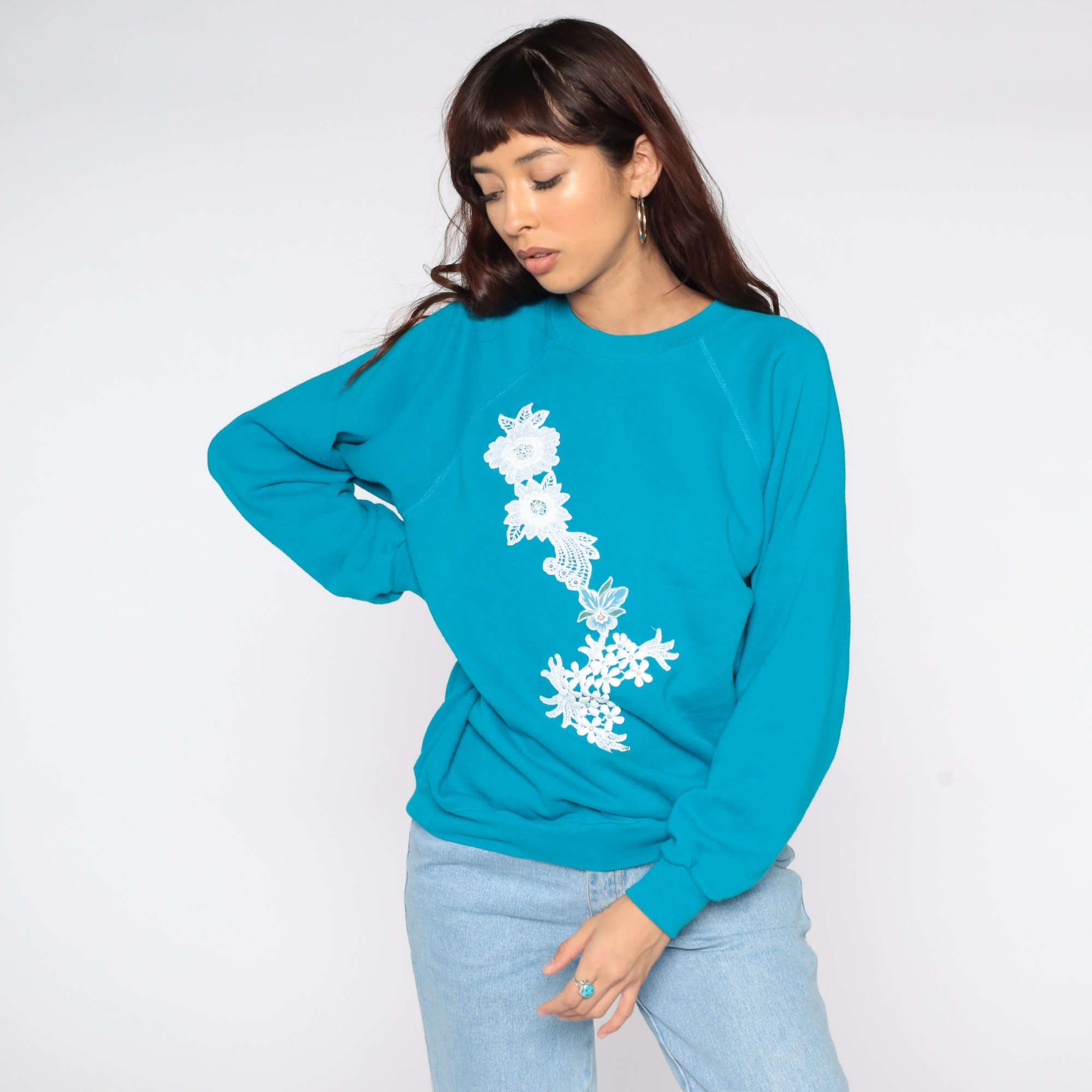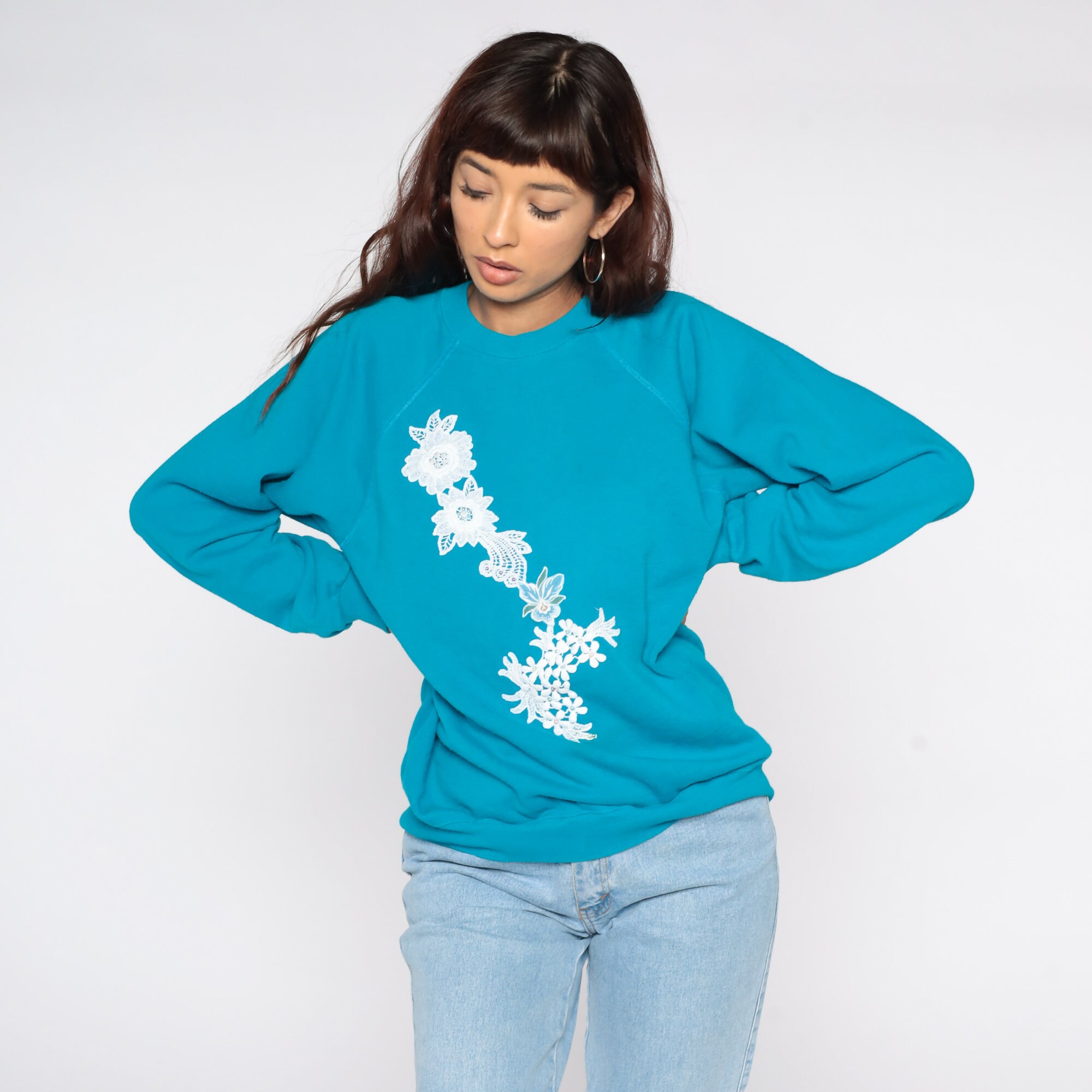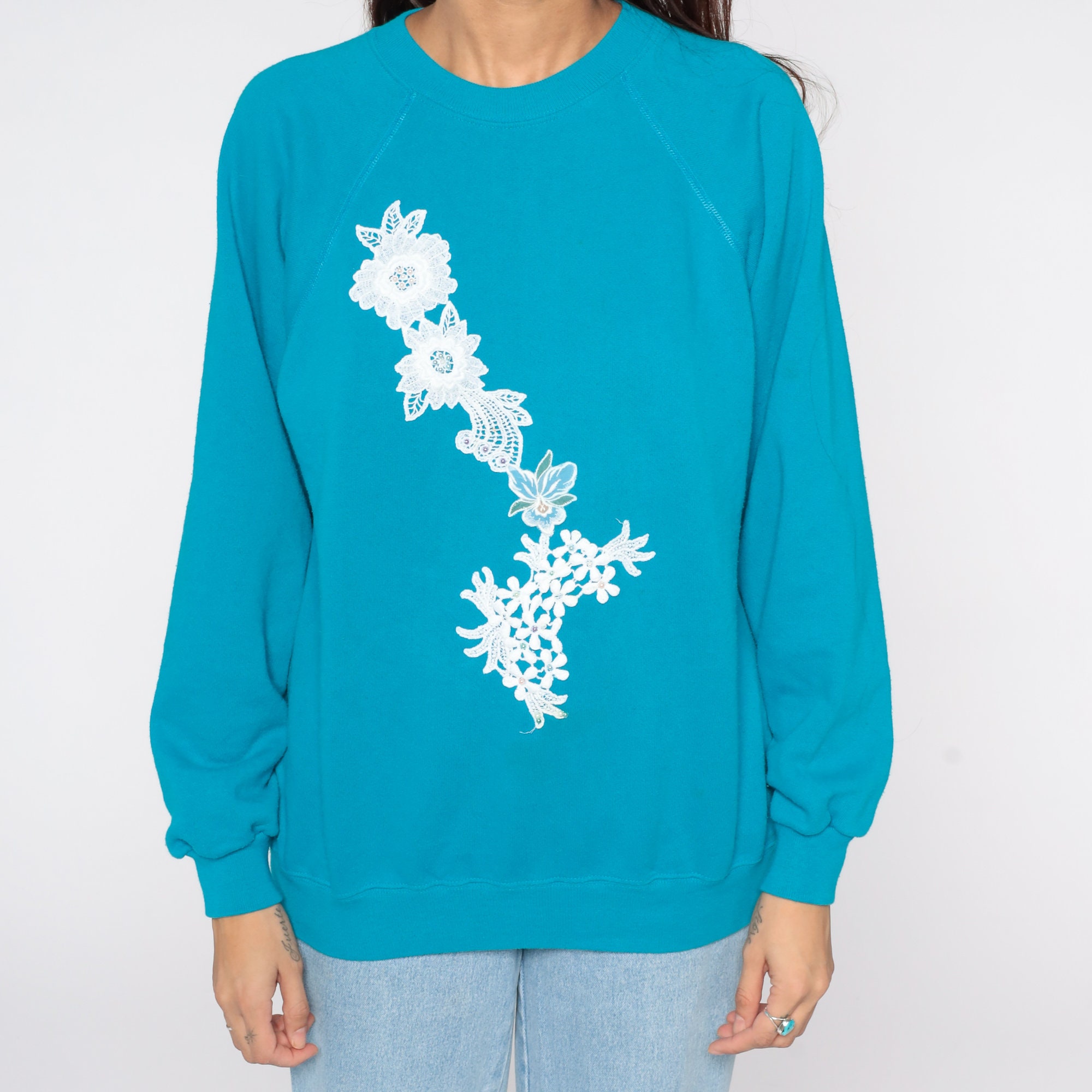 Vintage 80s sweatshirt in blue with a floral lace applique and beading. Slouchy fit with raglan sleeves.