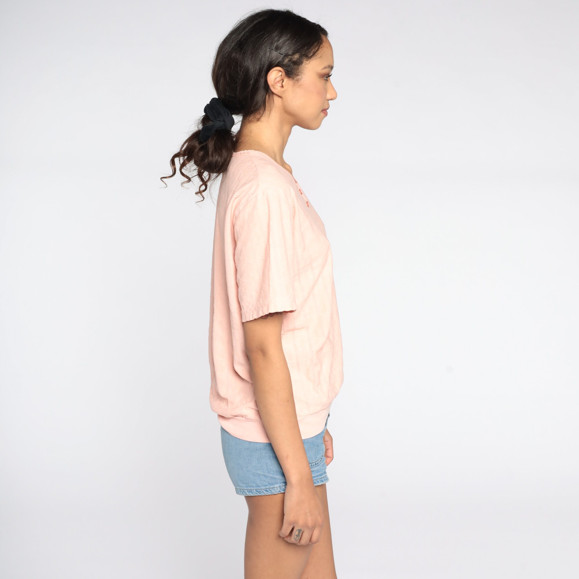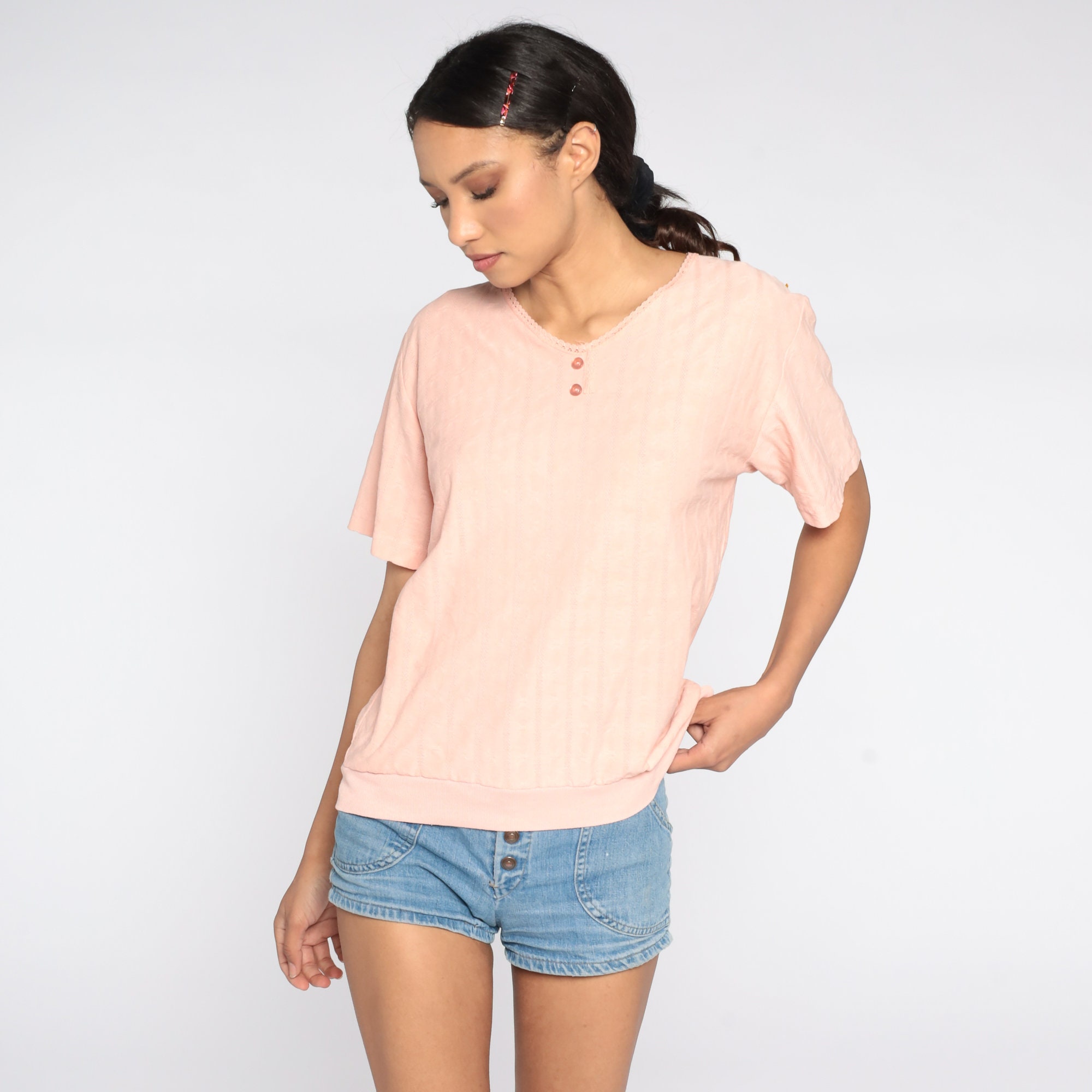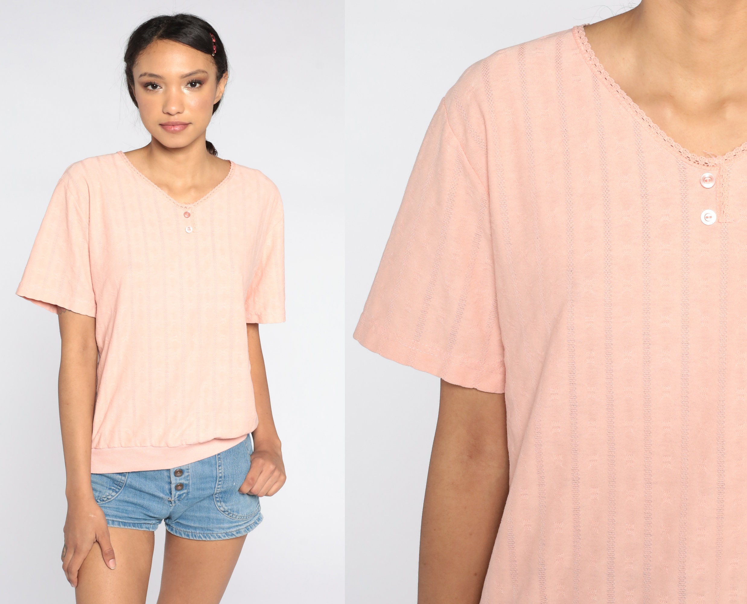 Vintage 80s shirt in peach with a slouchy fit.