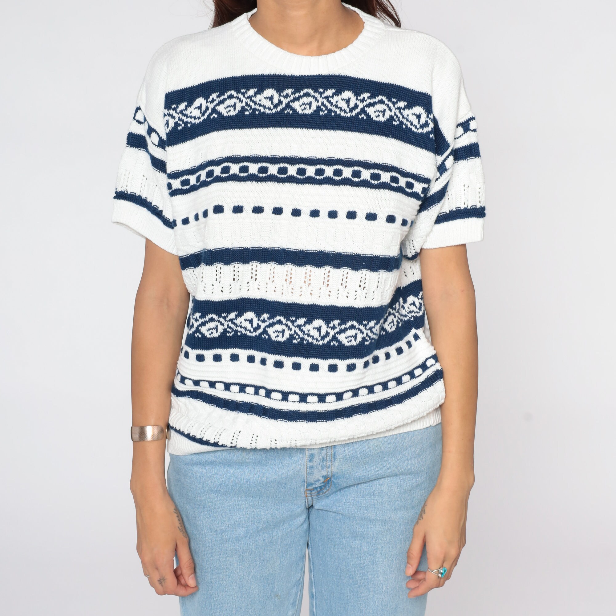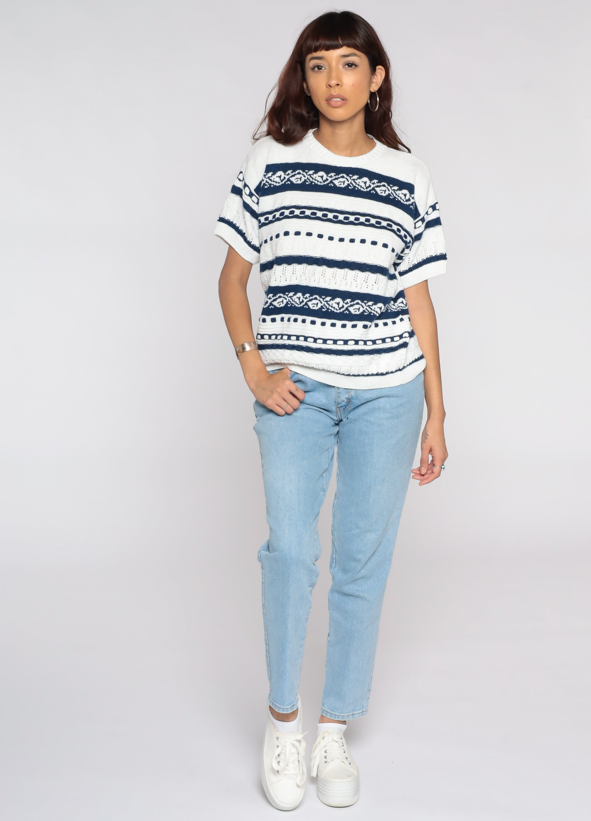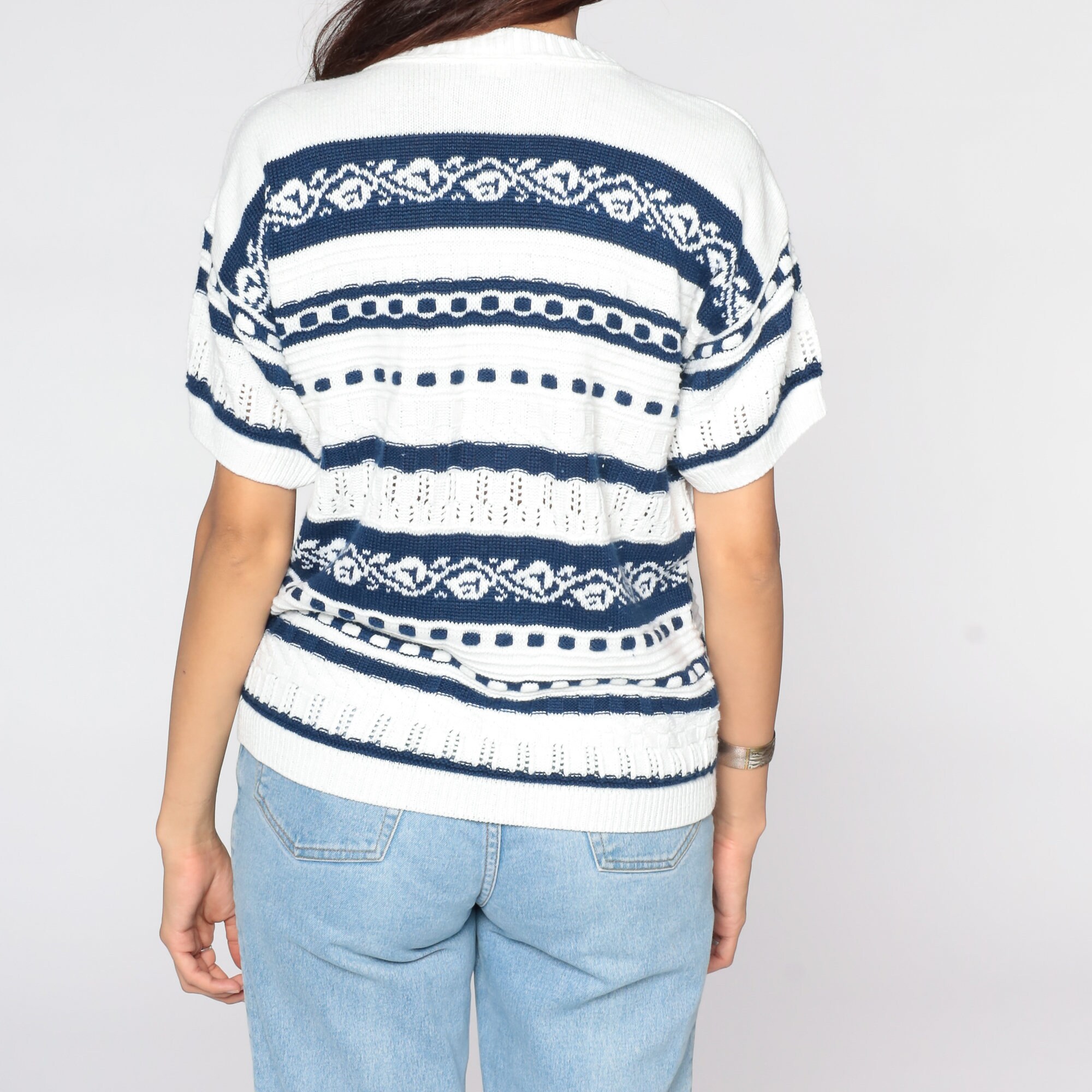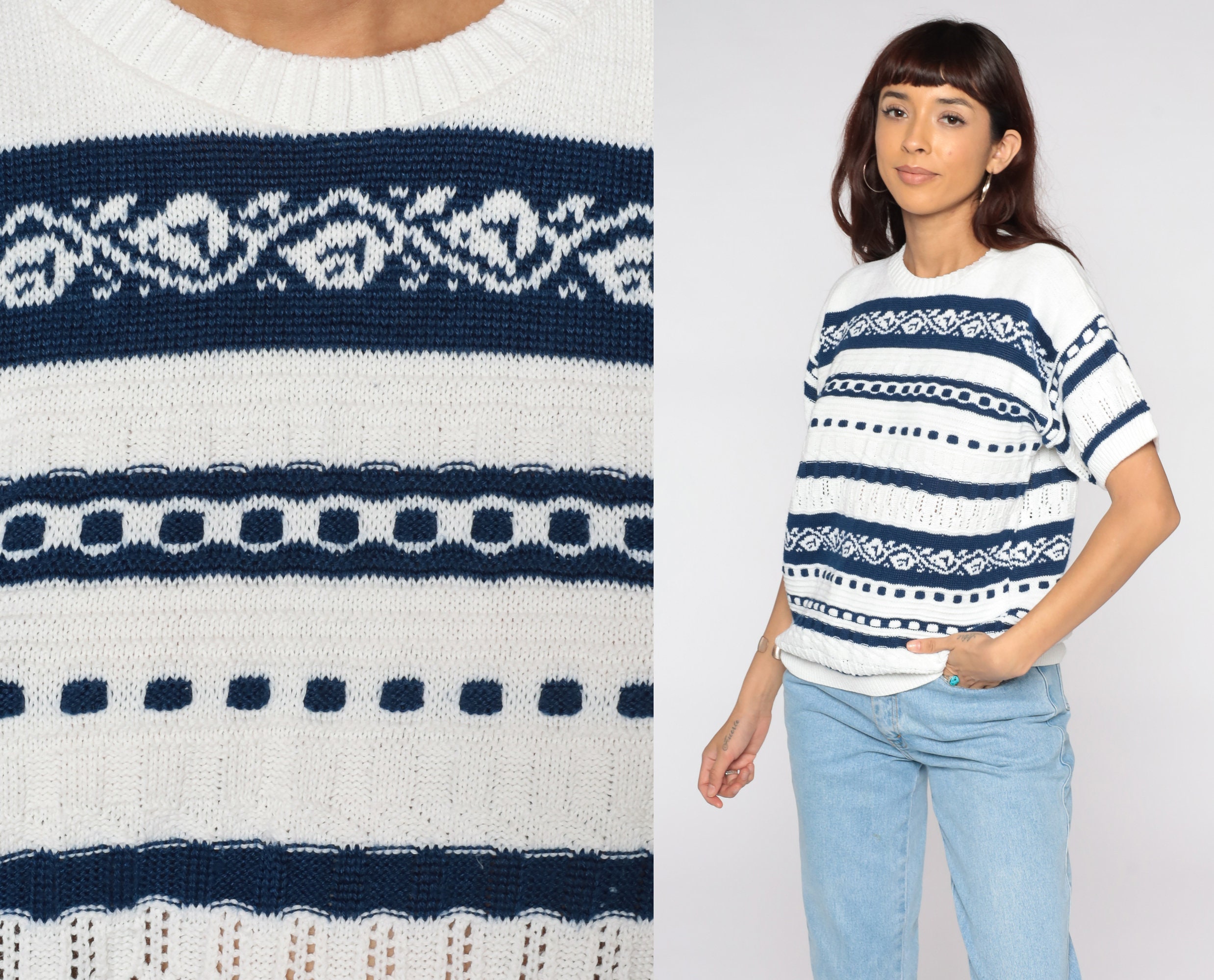 Vintage 80s 90s sweater top in white knit with a leaf design and short sleeves.