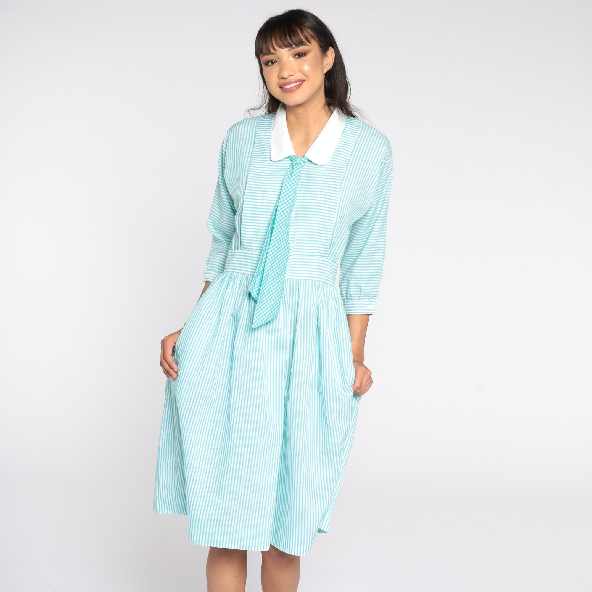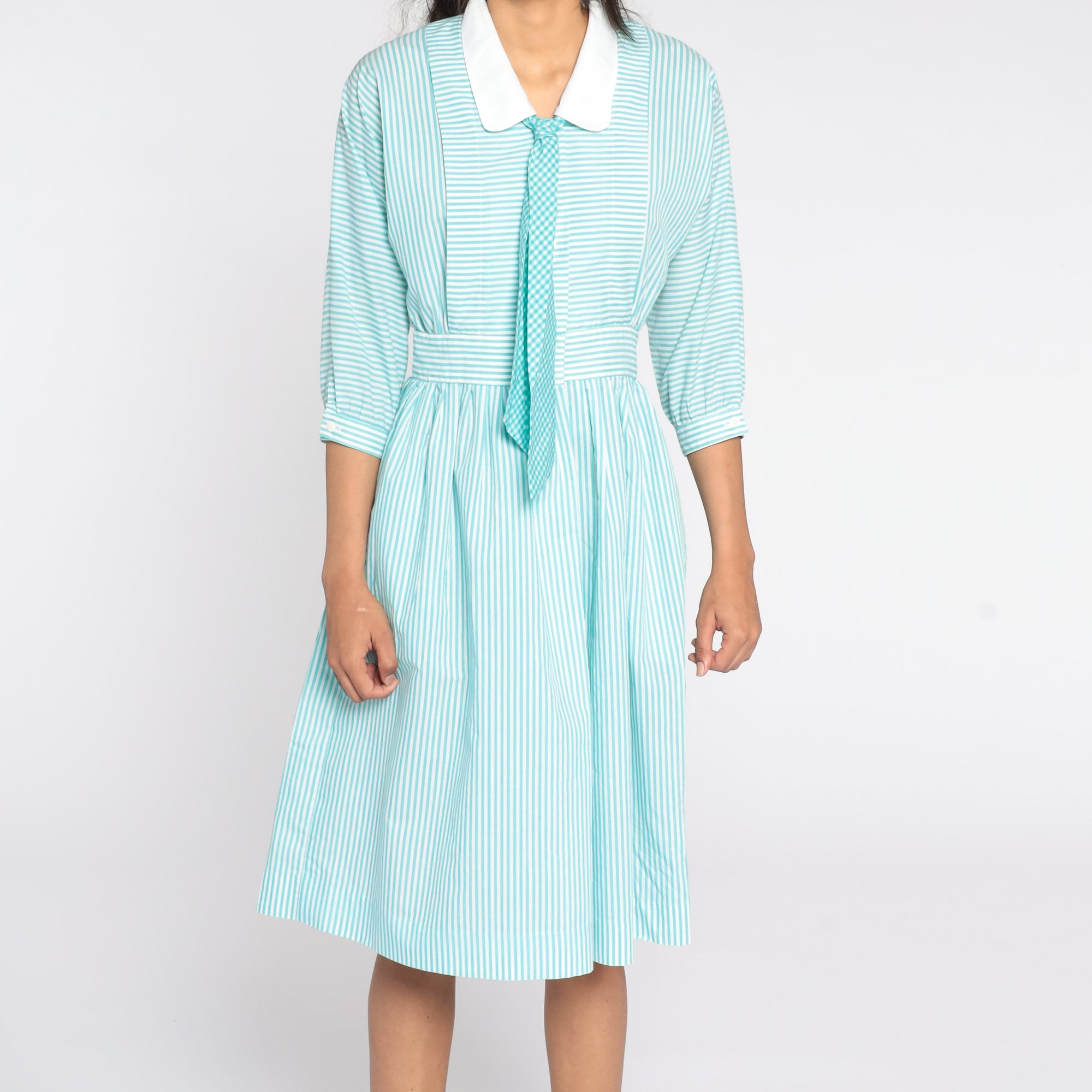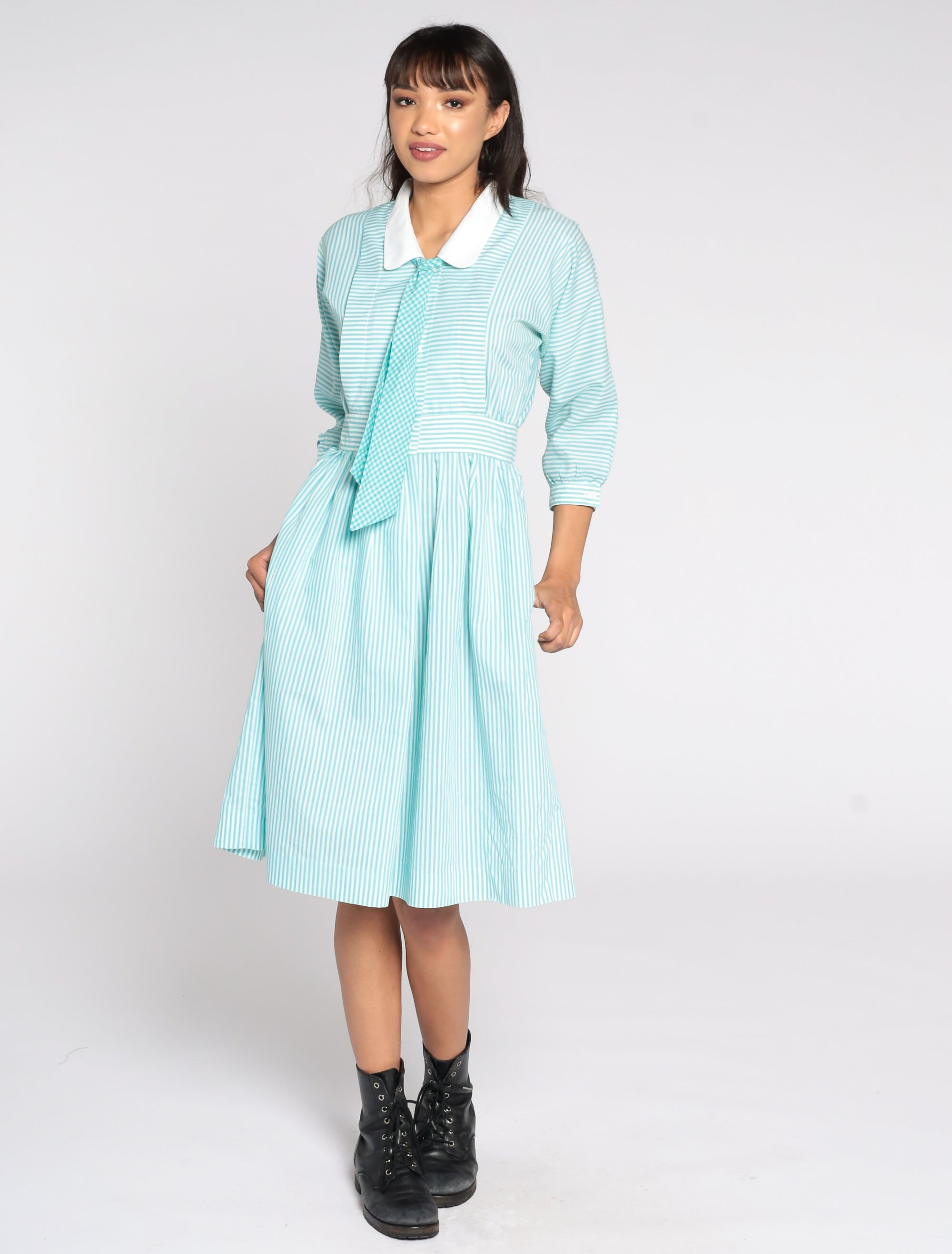 Vintage 80s dress in blue and white stripes with an ascot necktie and a high waist. Midi length.