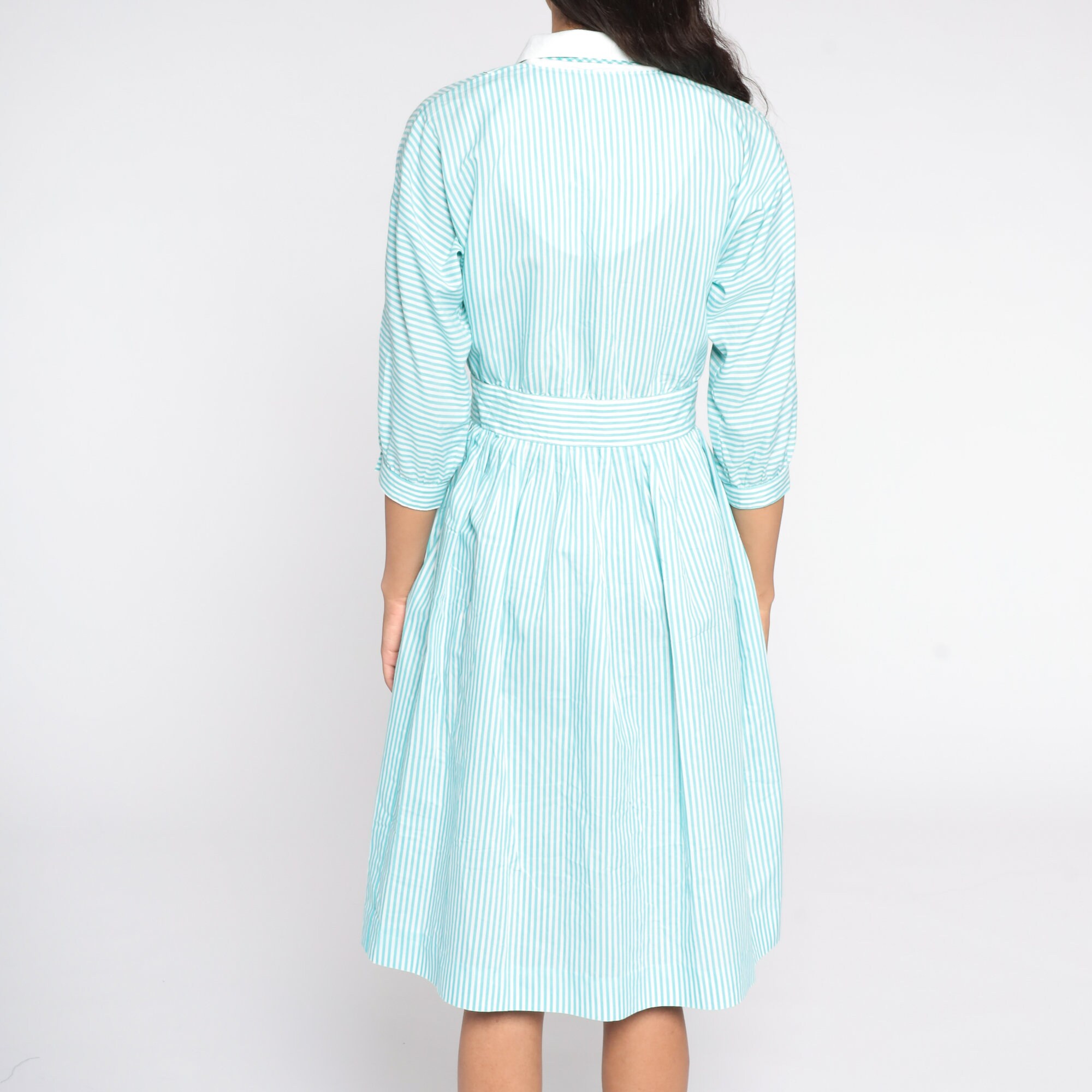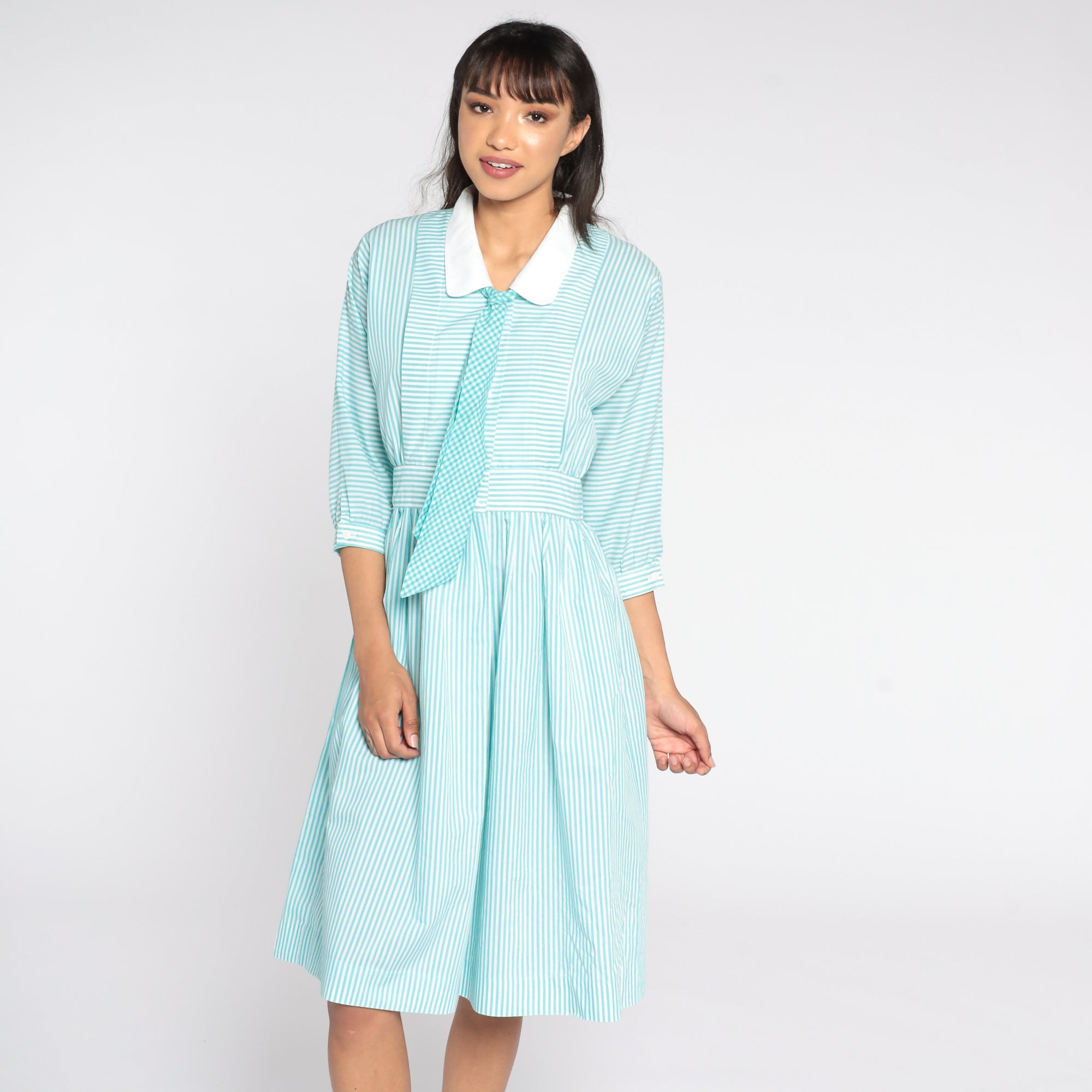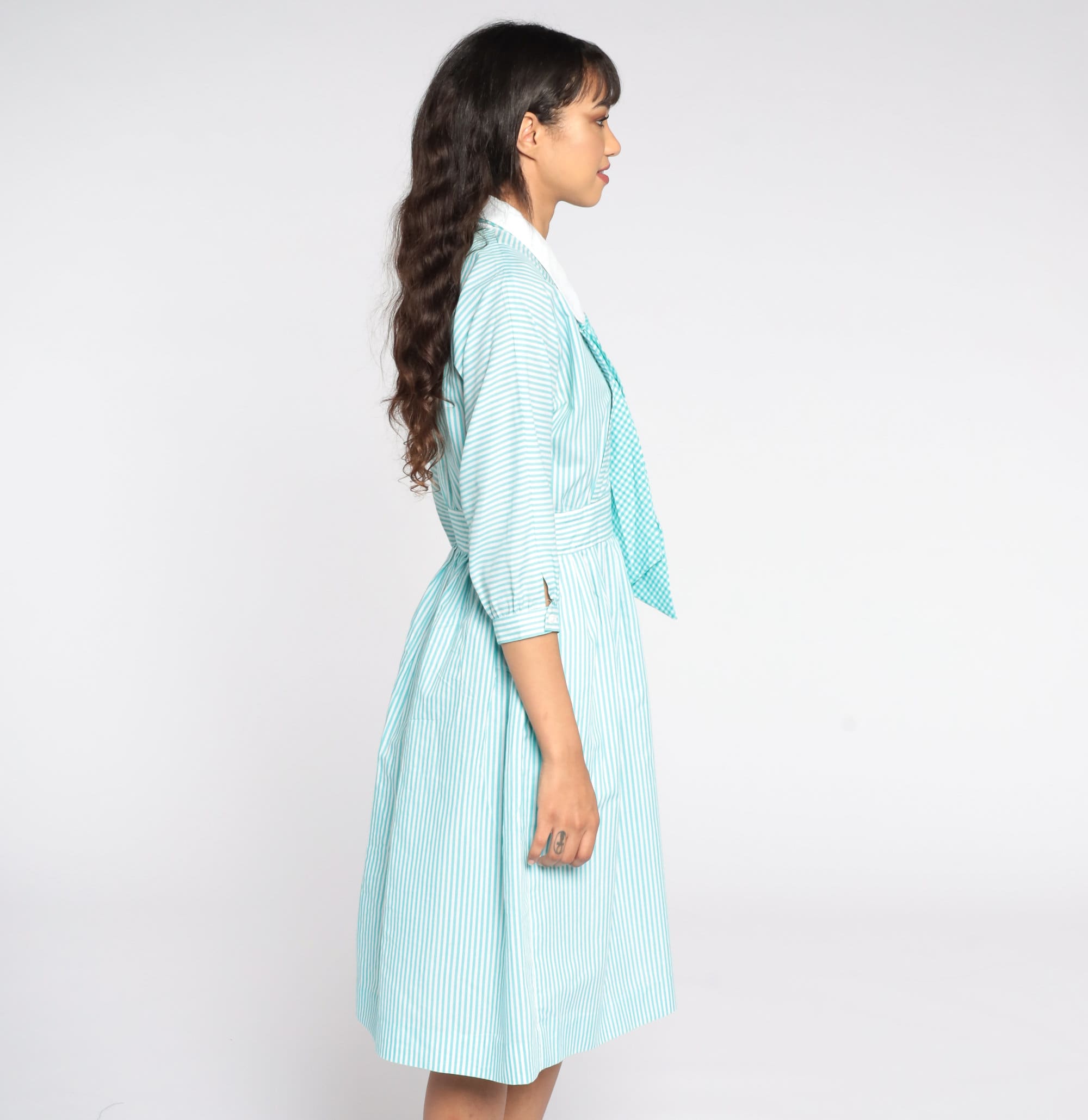 Vintage 80s dress in blue and white stripes with an ascot necktie and a high waist. Midi length.