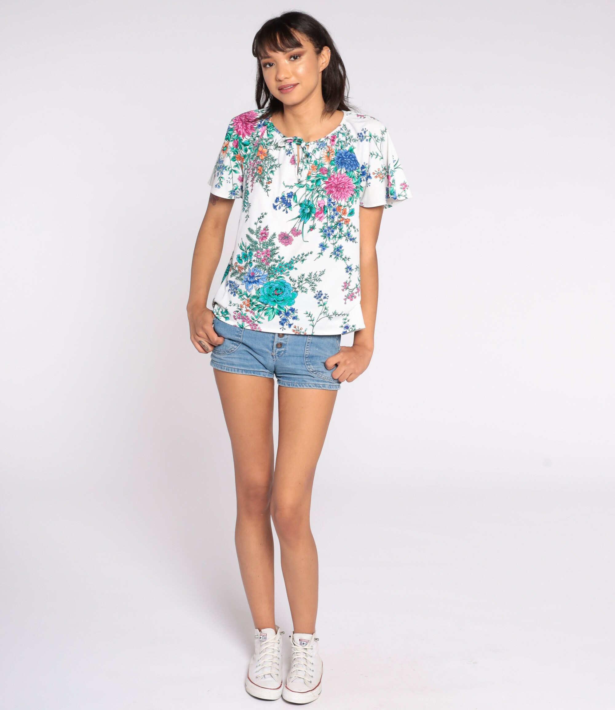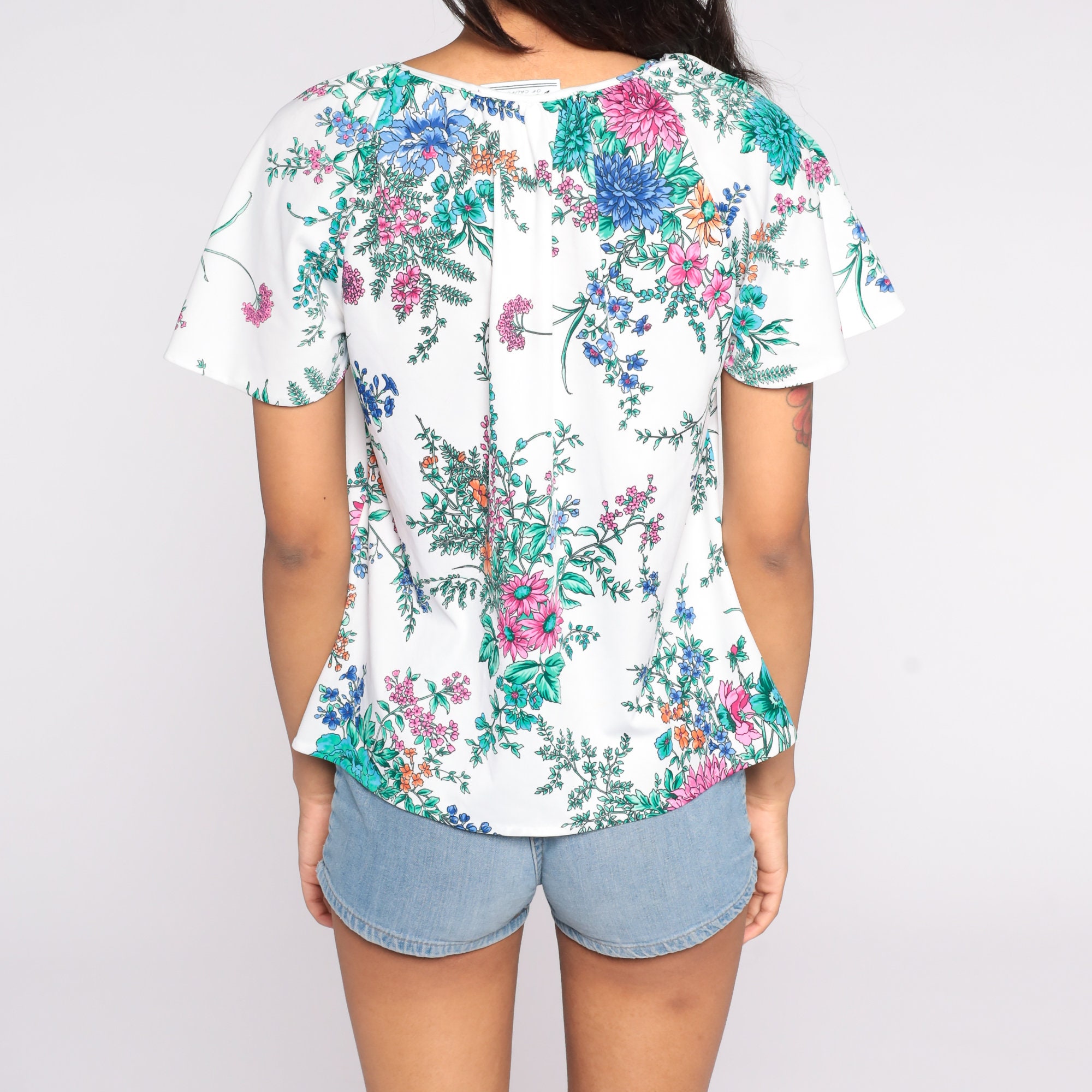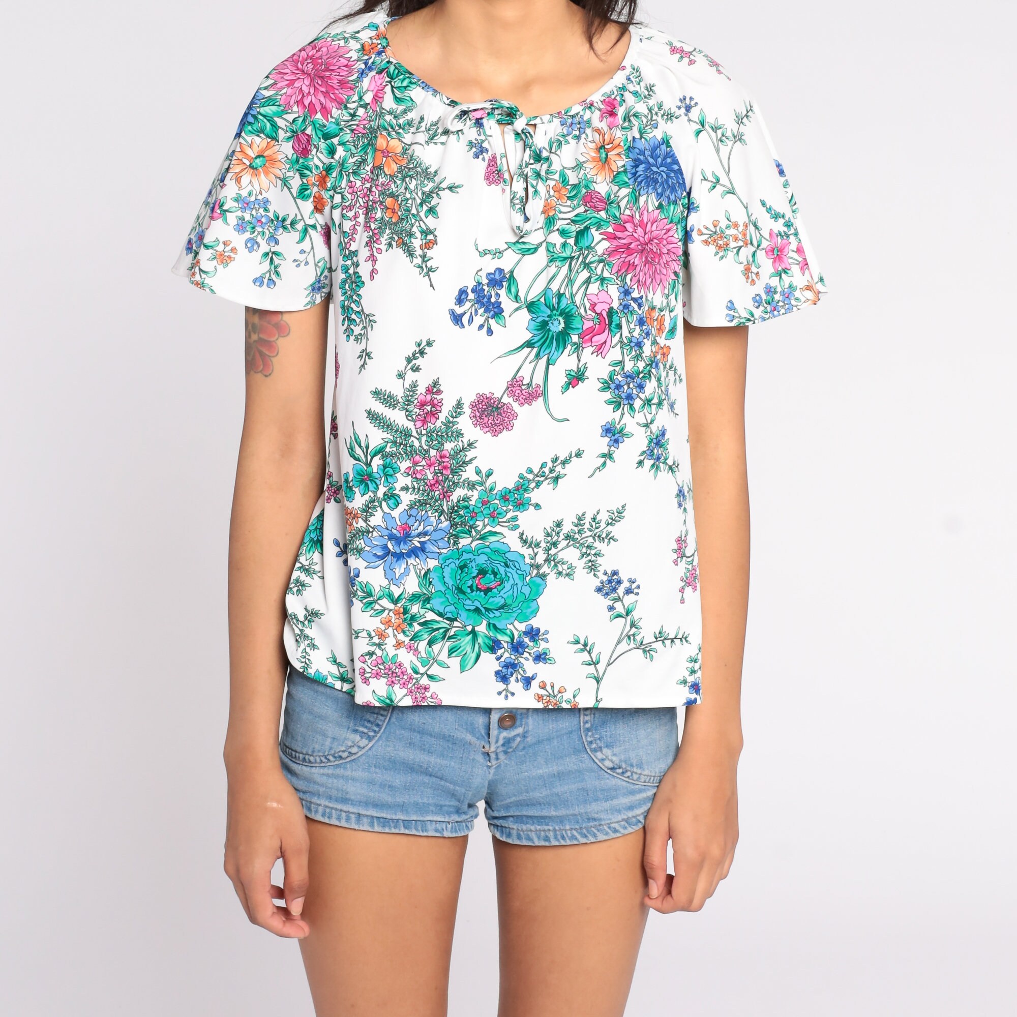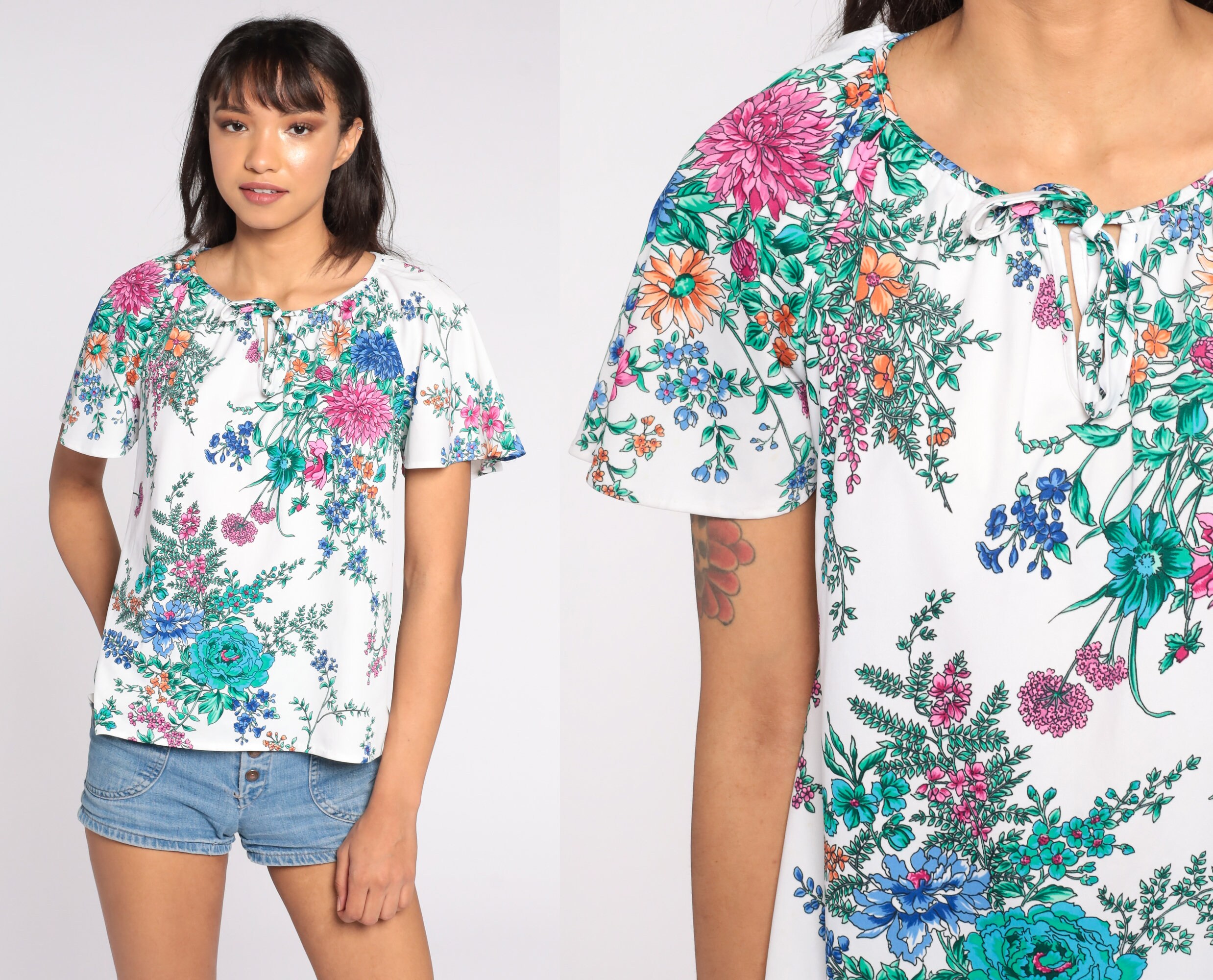 Vintage 70s top in a floral print with a keyhole at the neck and a loose fit.