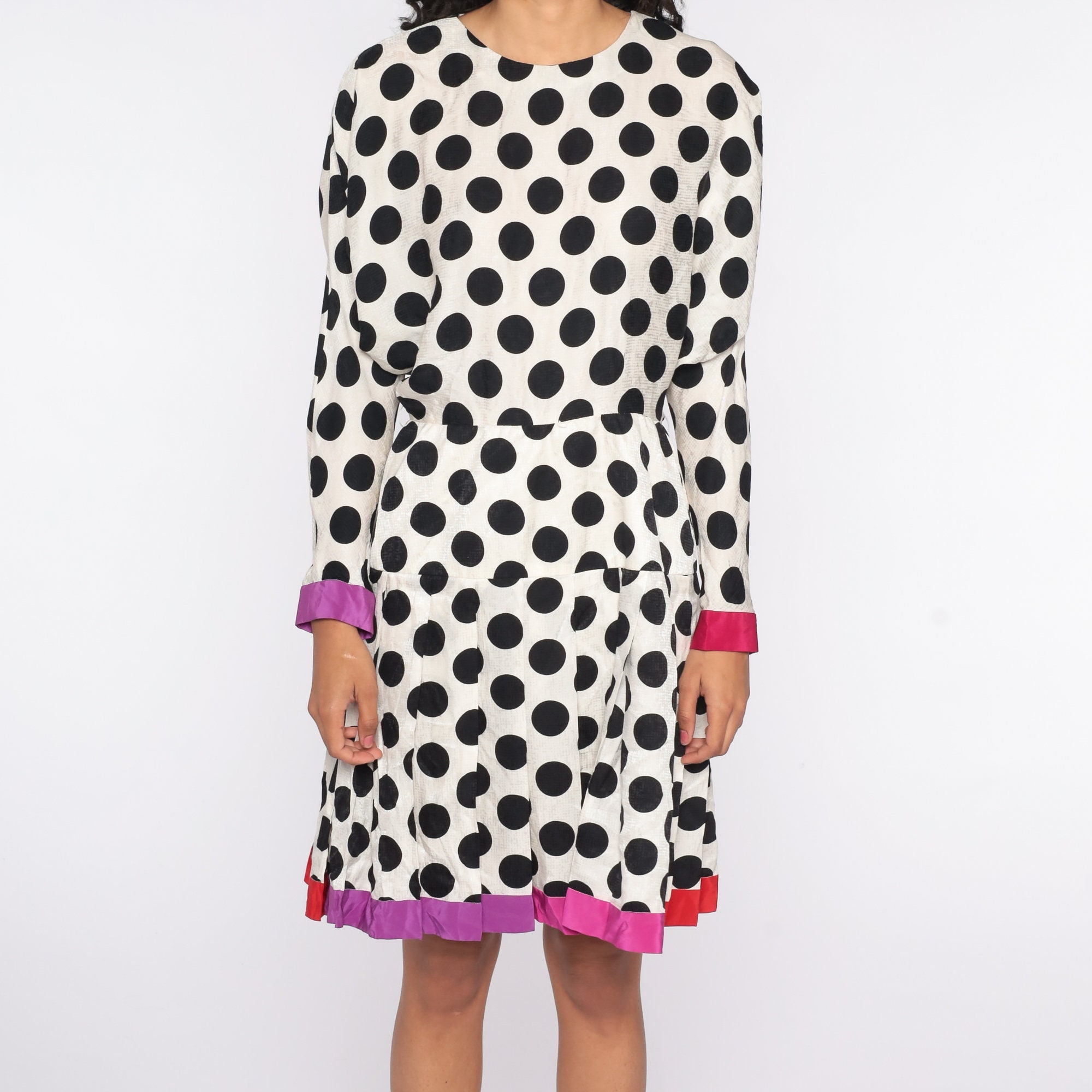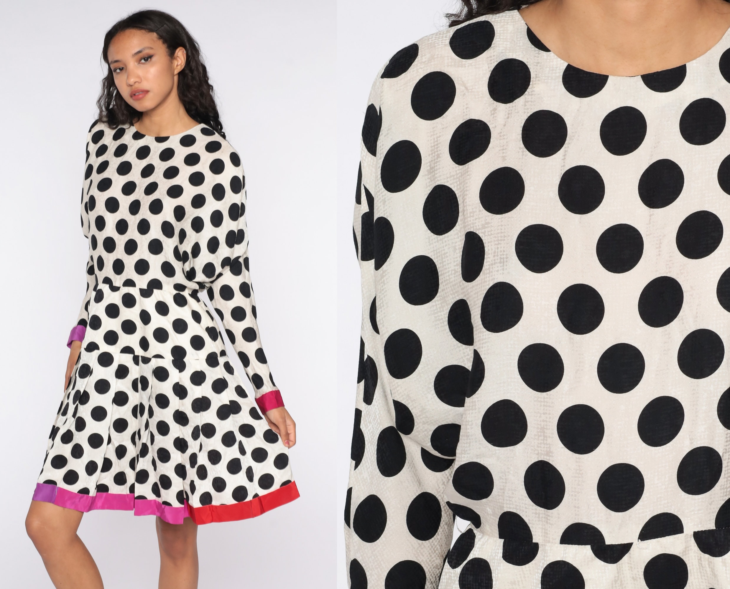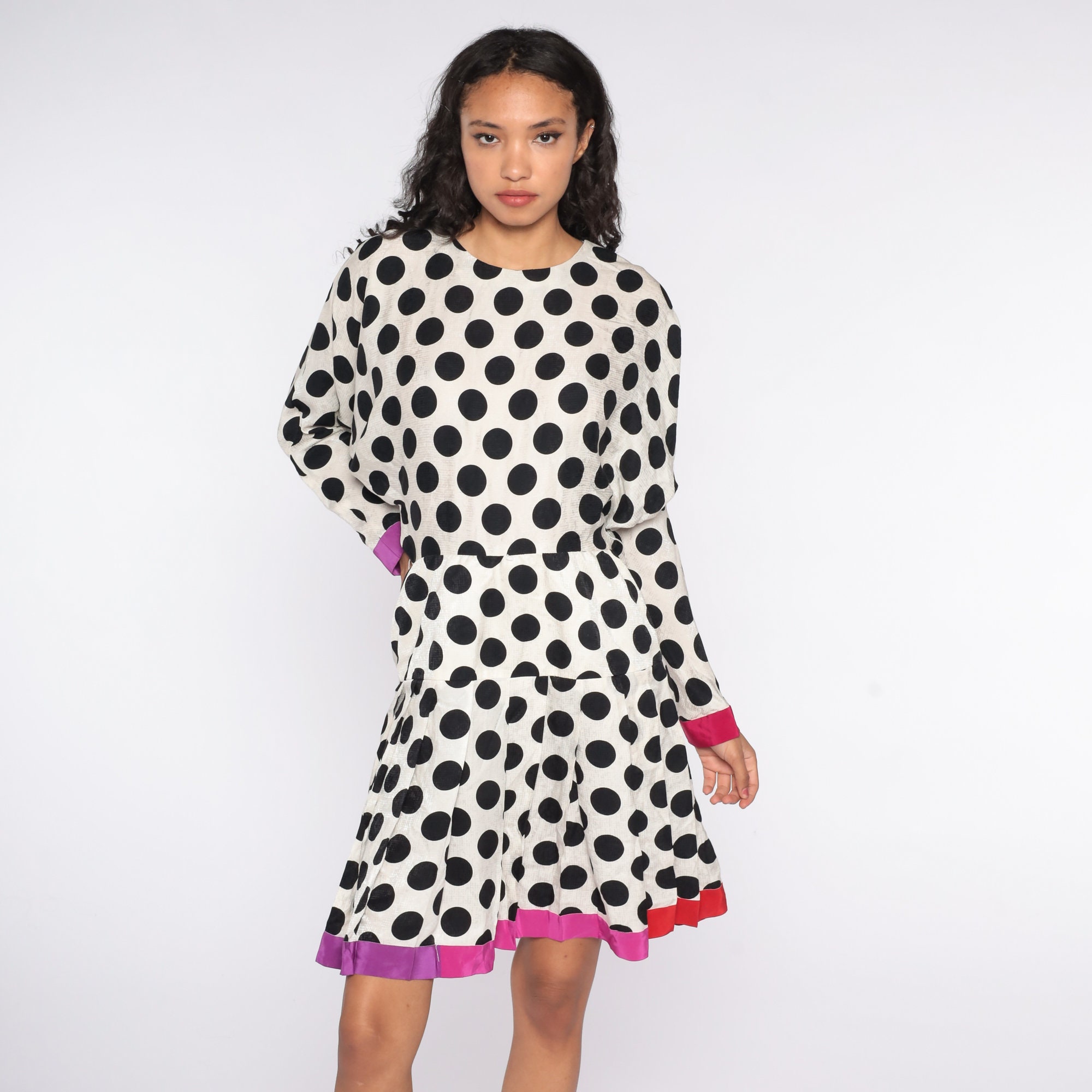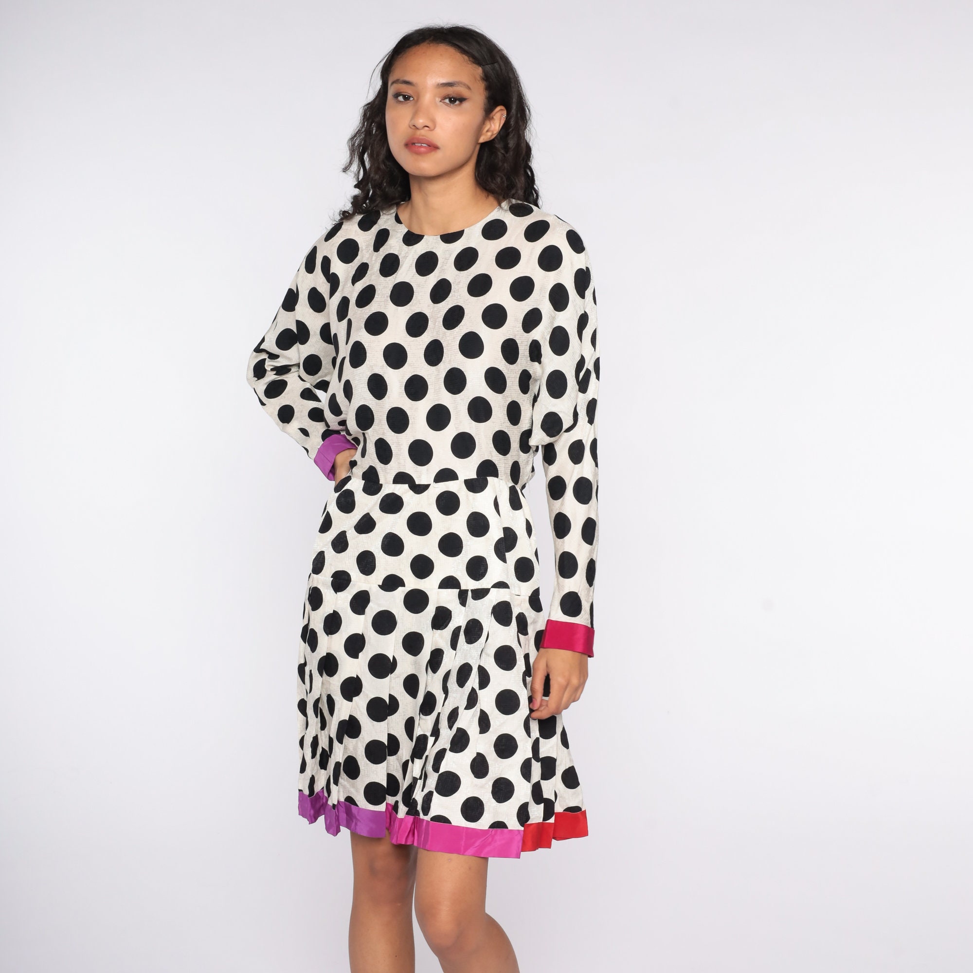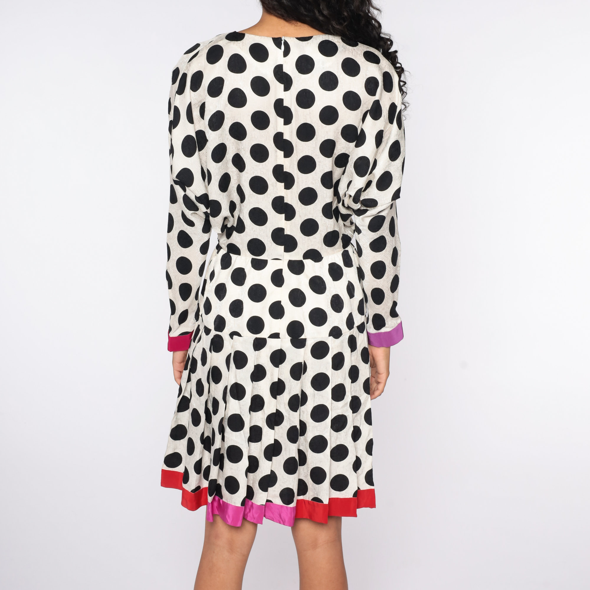 Vintage 90s dress in polka dots with dolman sleeves. It has a low waist and pleated midi skirt.